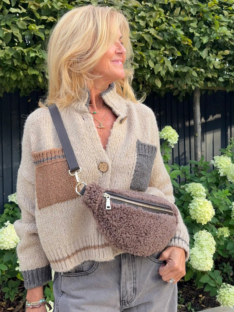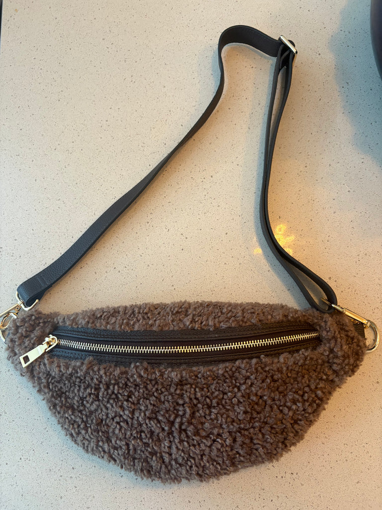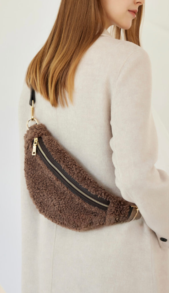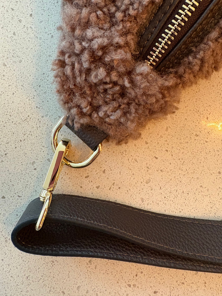 A mid sized cross body bag, genuine leather and faux sharling with gold hardware. A useful and stylish casual accessory. In two colours, dark taupe and chocolate.