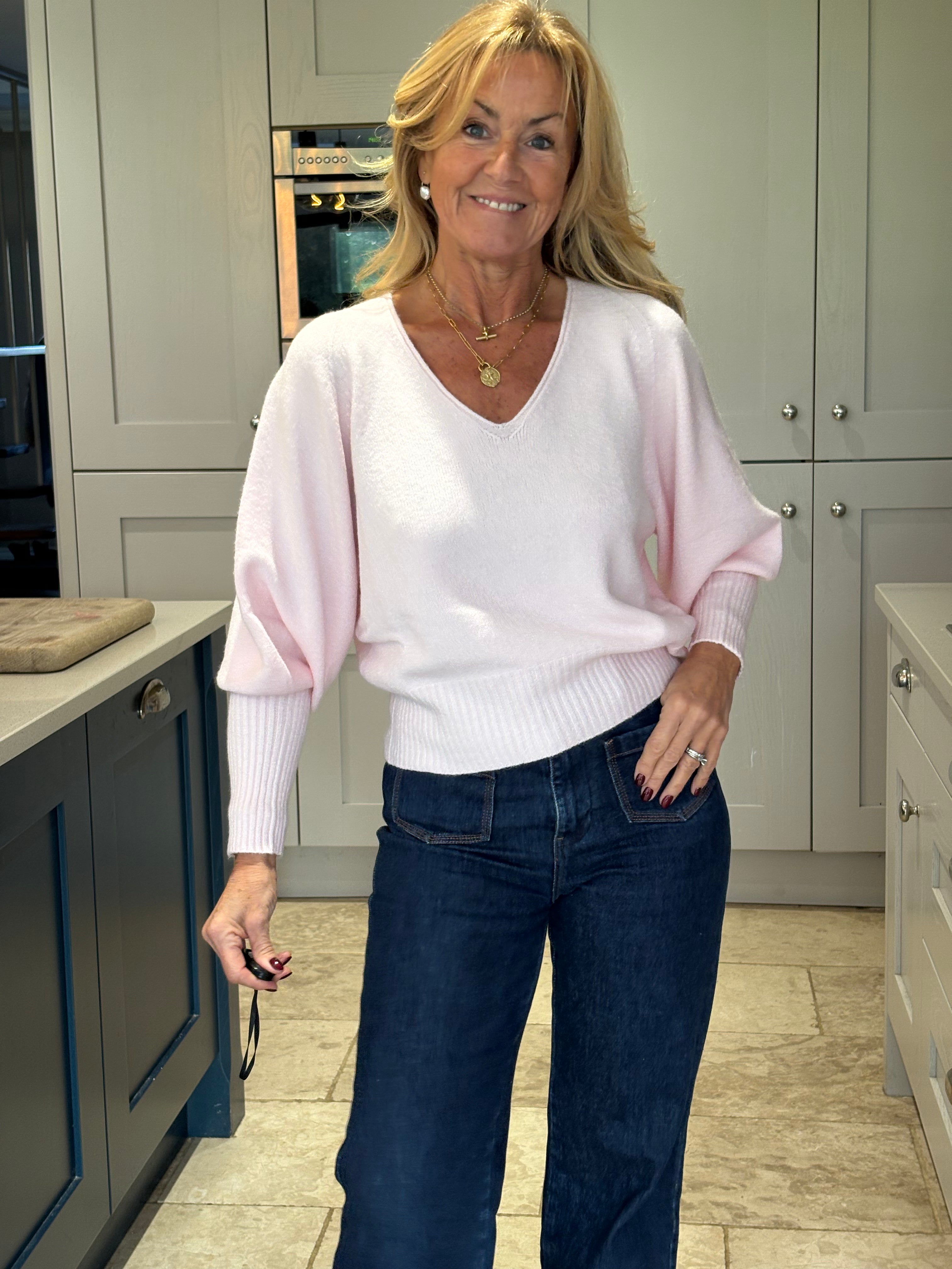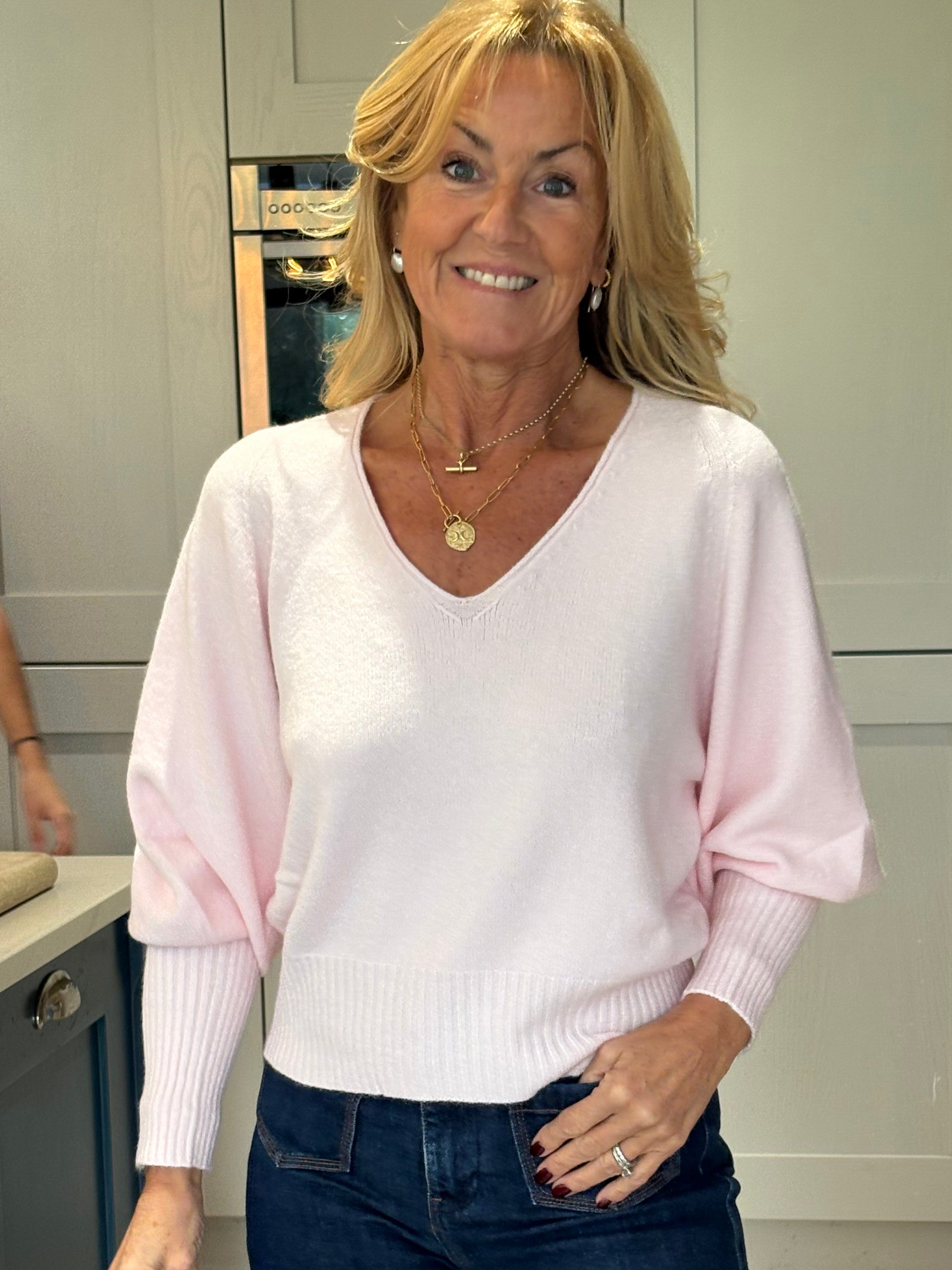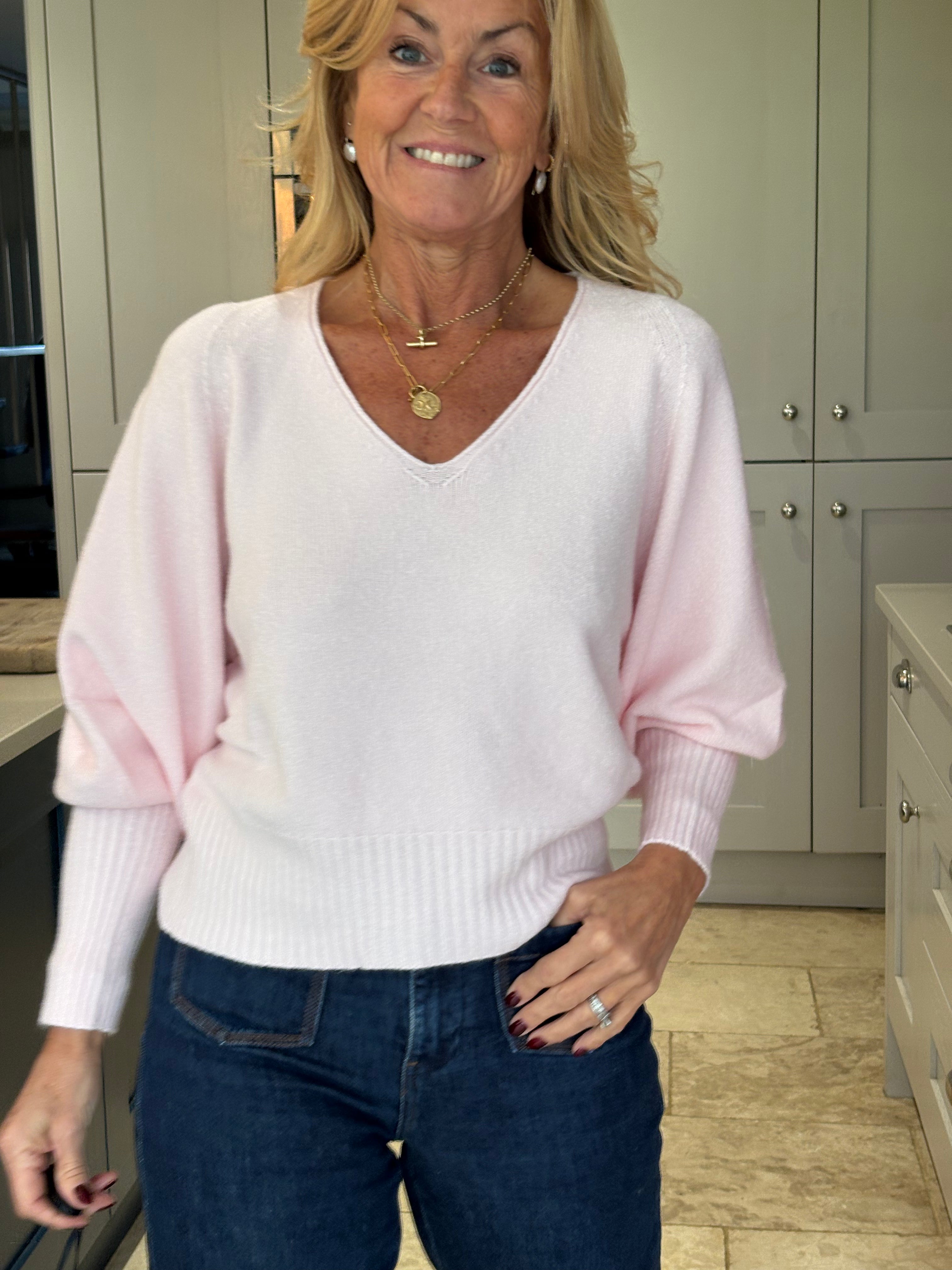 A gorgeous soft and elegant V neck jumper with luxurious puffed sleeves and a long fitted cuff. Falls to just above the hips in a blousy fit. Easy to wear tucked in or out.