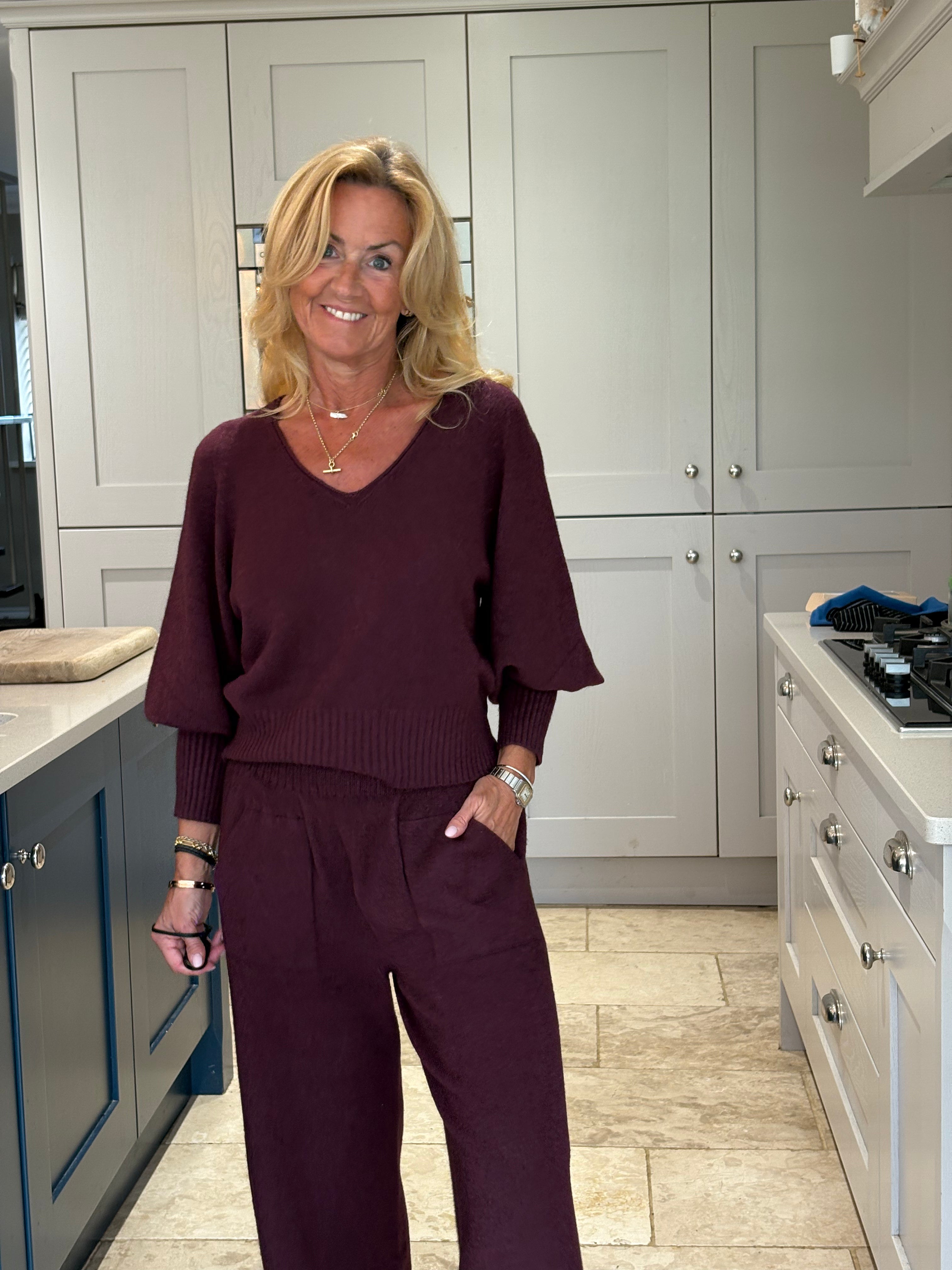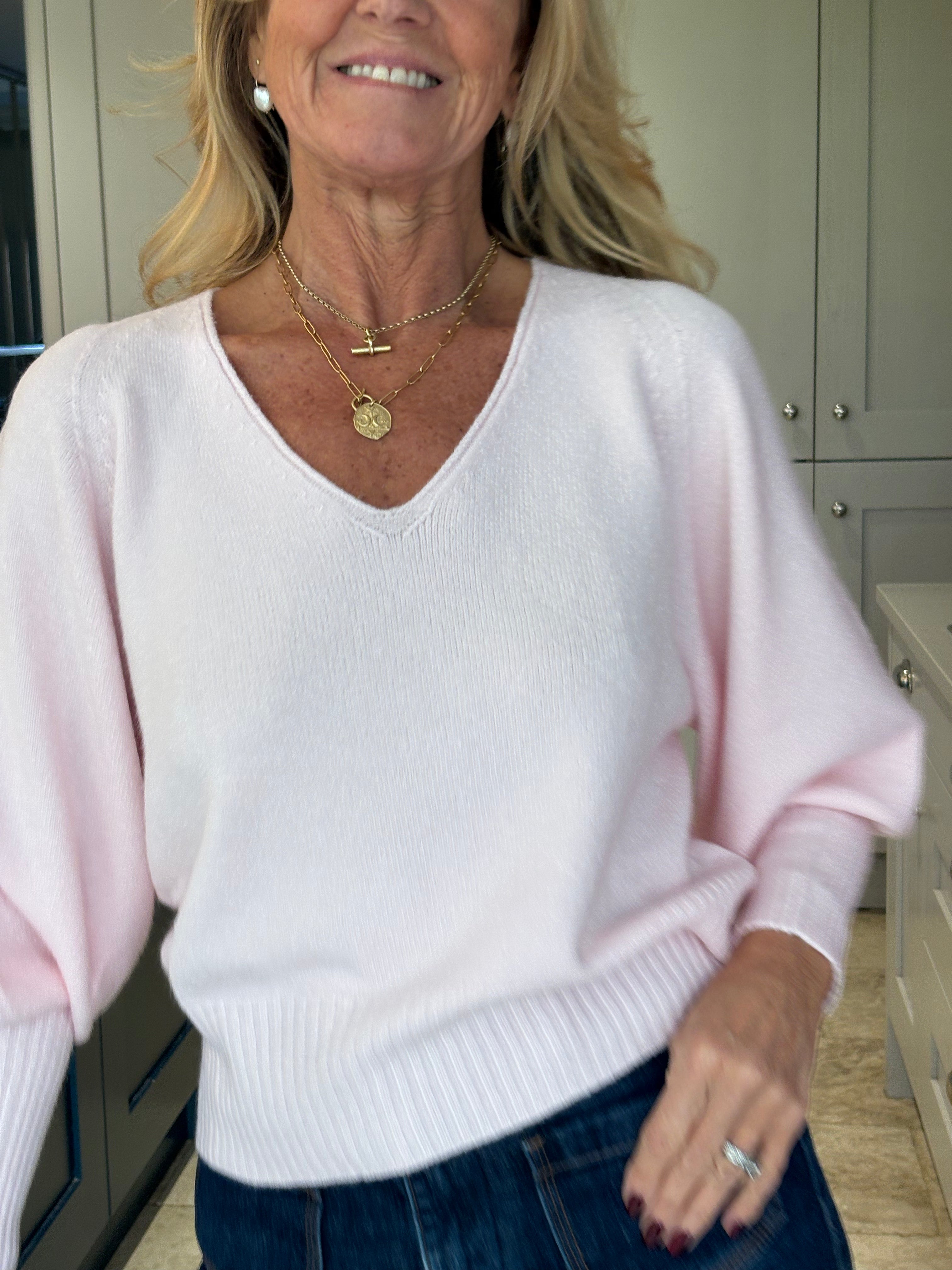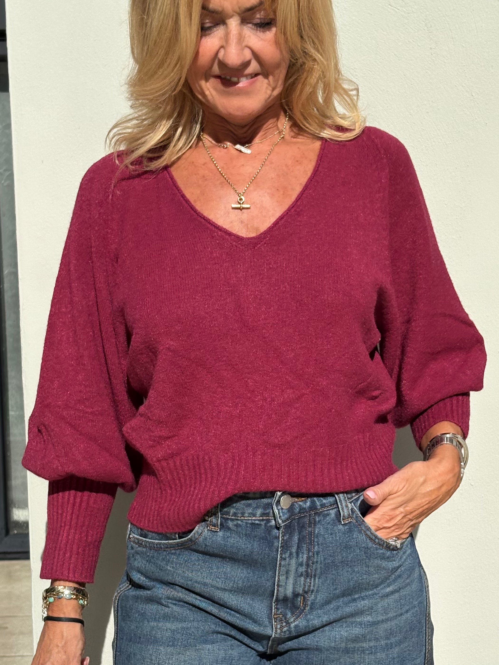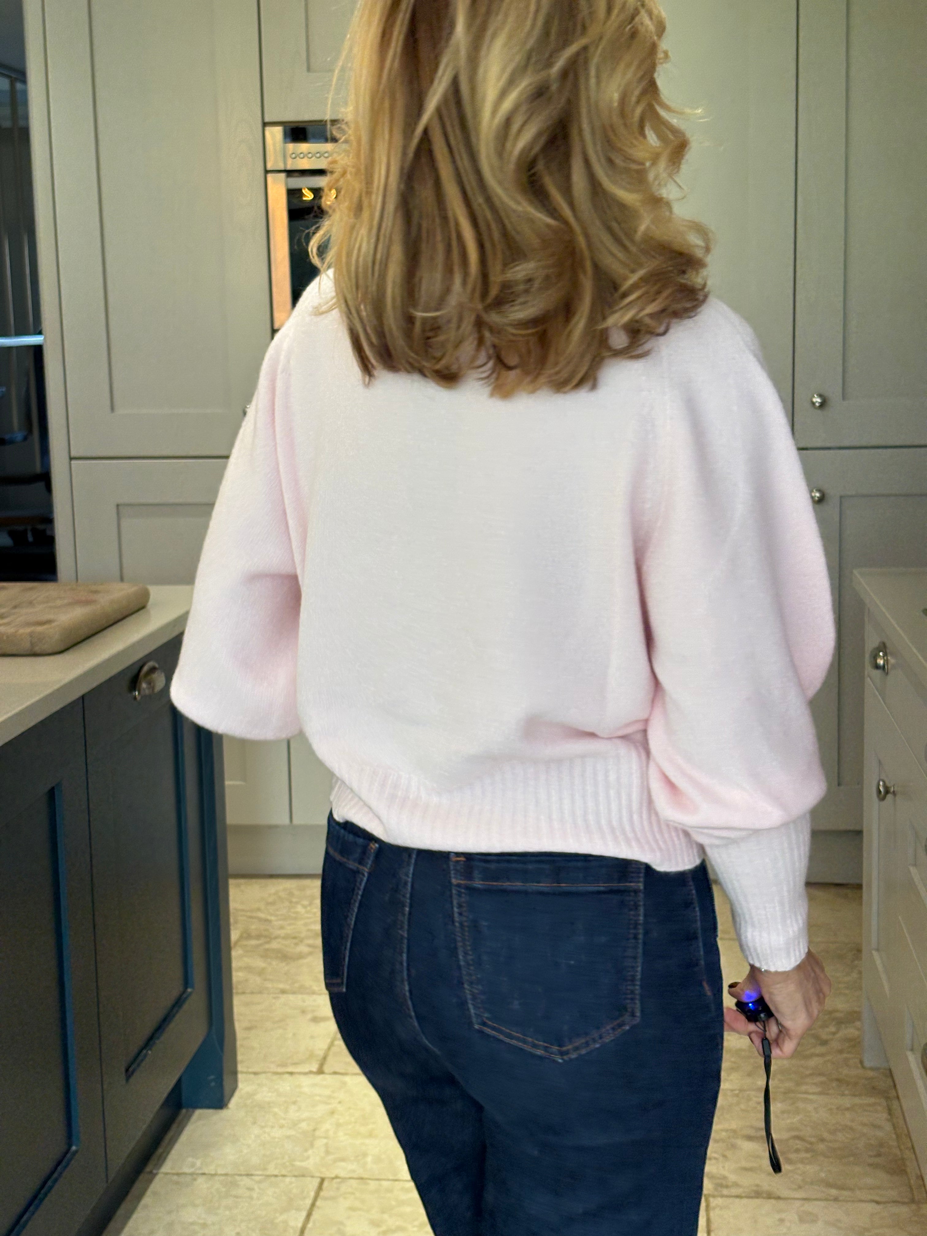 A gorgeous soft and elegant V neck jumper with luxurious puffed sleeves and a long fitted cuff. Falls to just above the hips in a blousy fit. Easy to wear tucked in or out.
