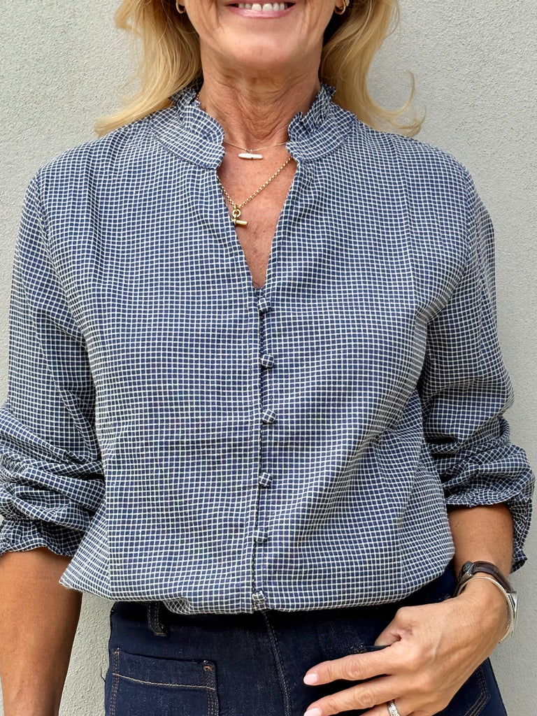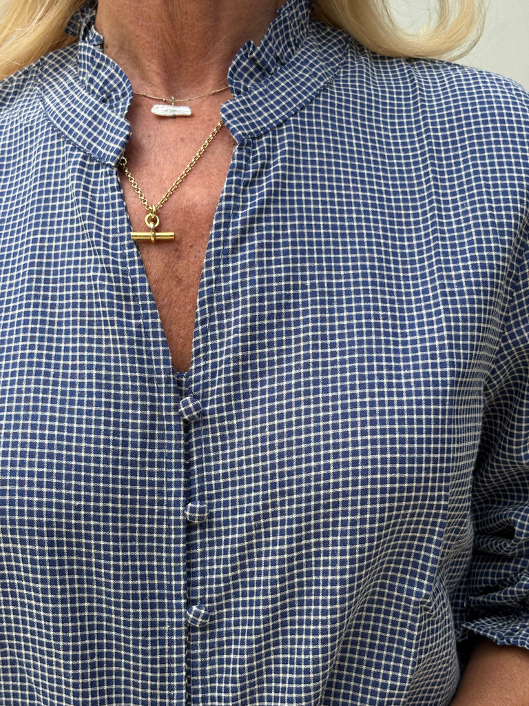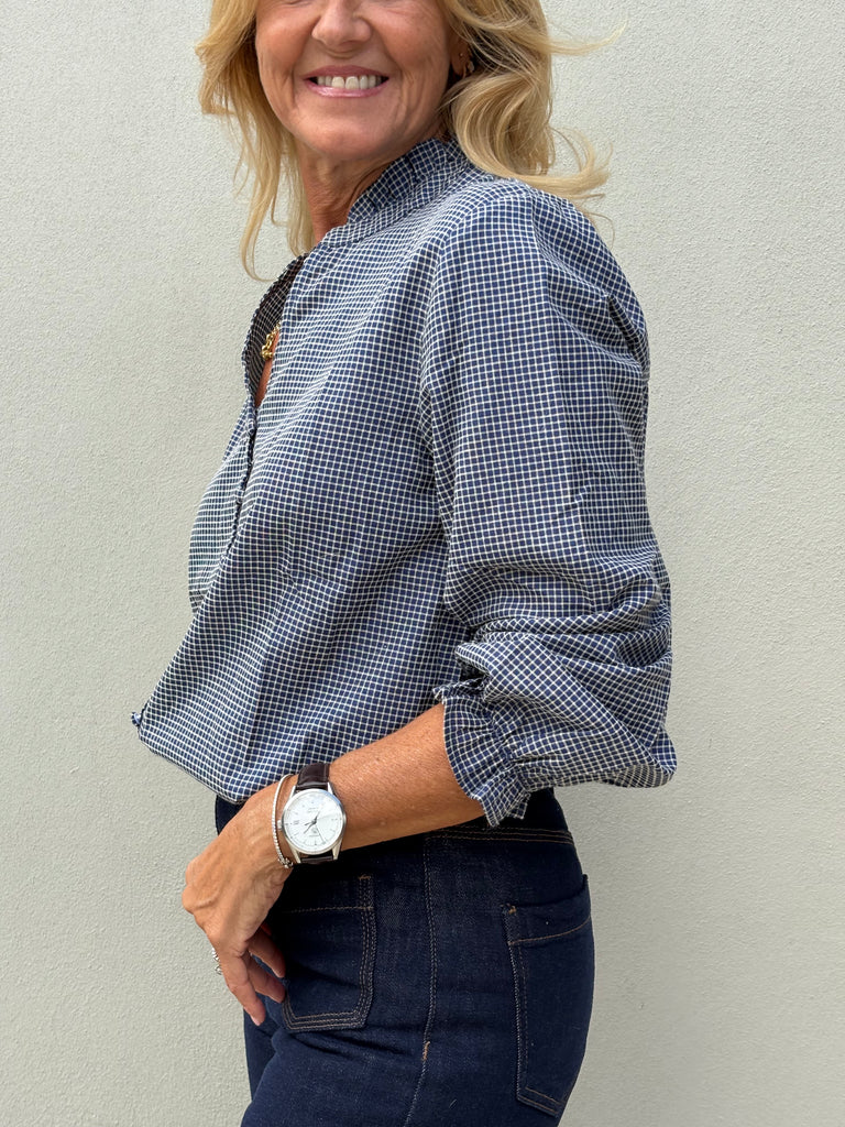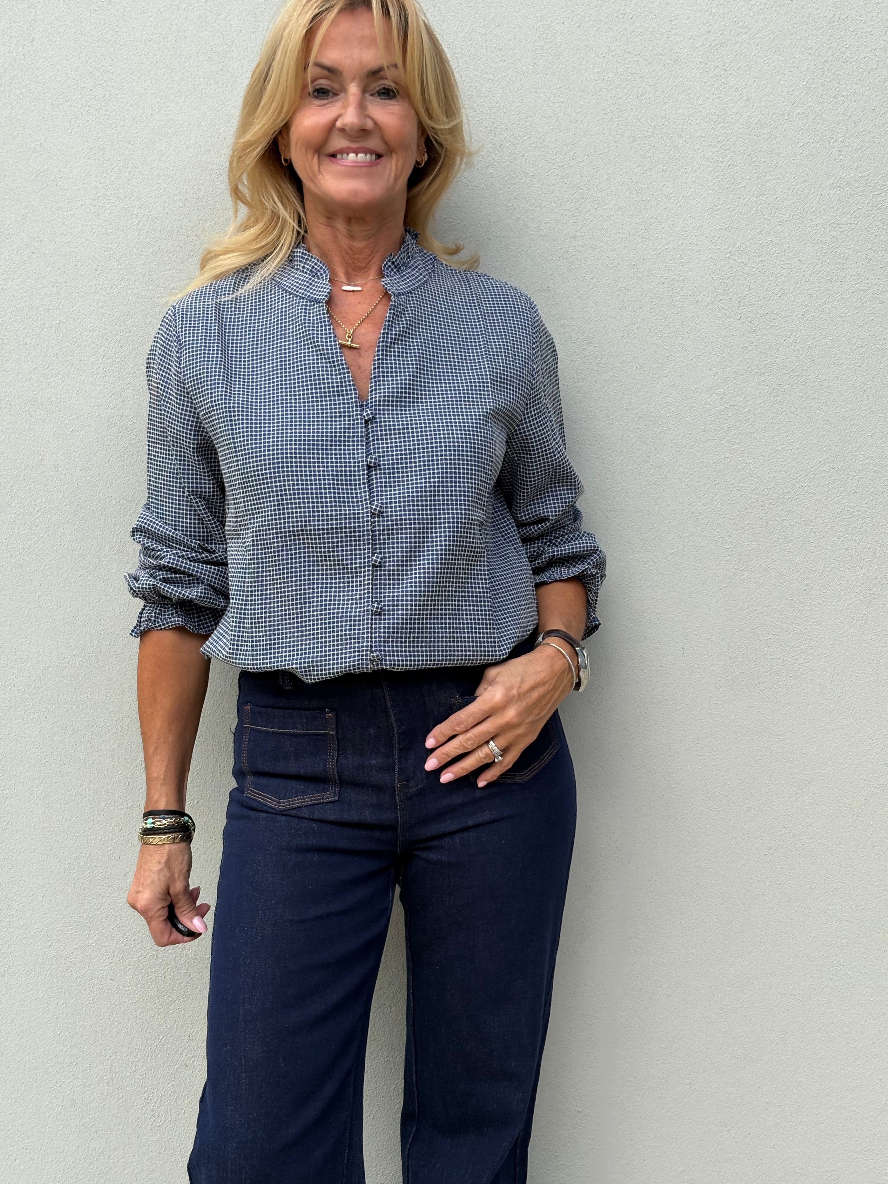 A timeless update on the classic check, this navy blue and white cotton shirt is cut in a relaxed, classic fit. The stand-up frill collar and flattering V-neckline add a touch of femininity, while the button-down front keeps the look sharp and versatile. Finished with elasticated frill cuffs for subtle volume and ease, this piece blends effortless charm with everyday wearability.