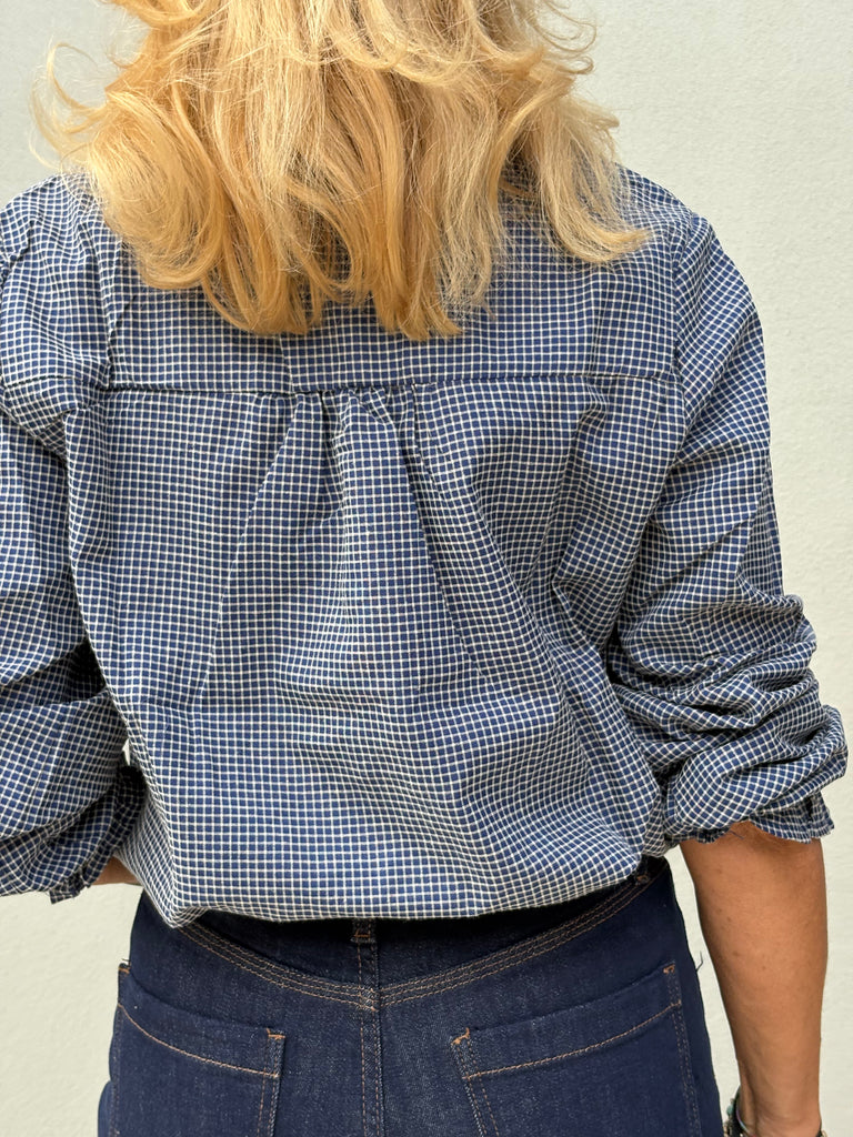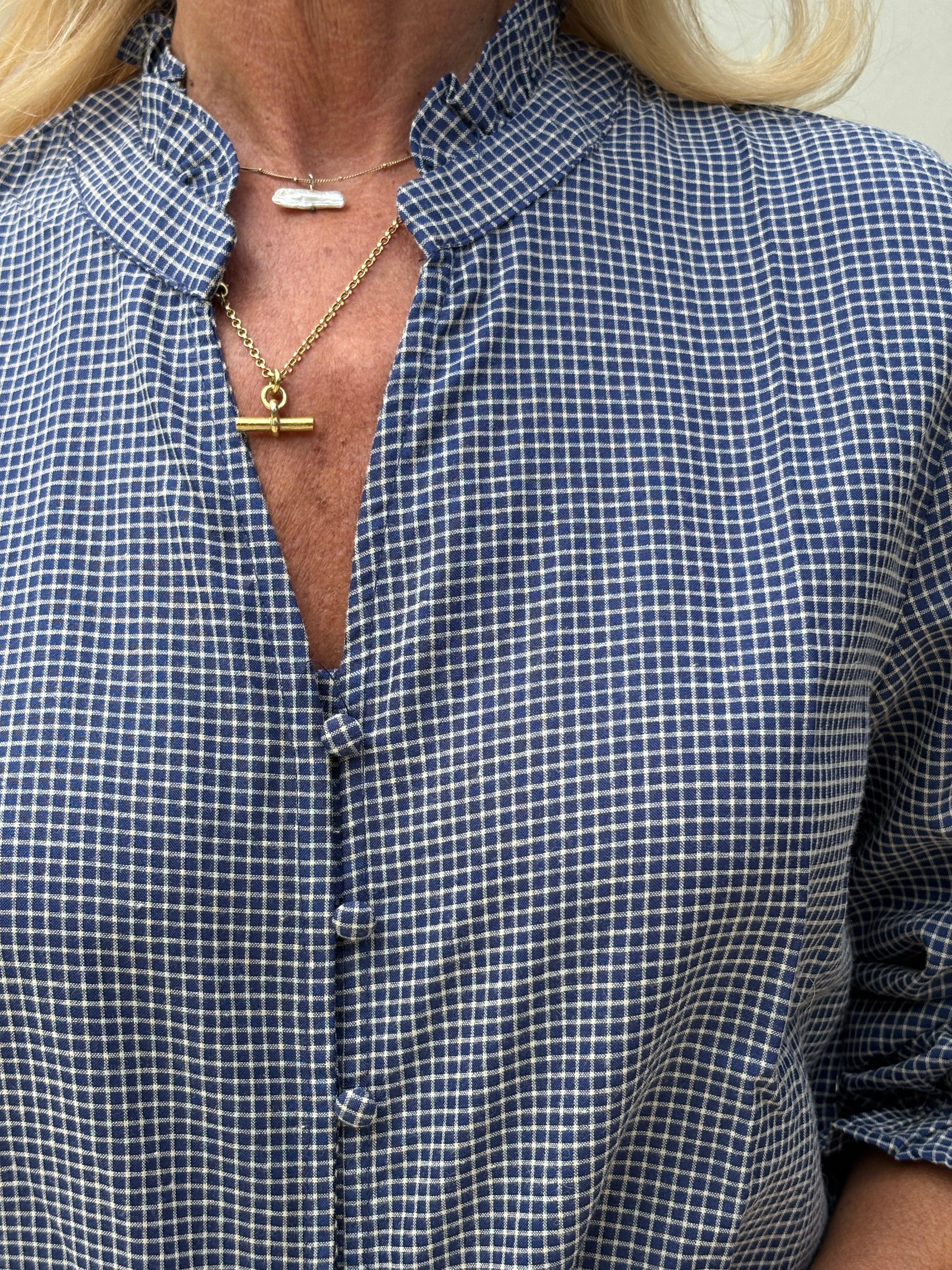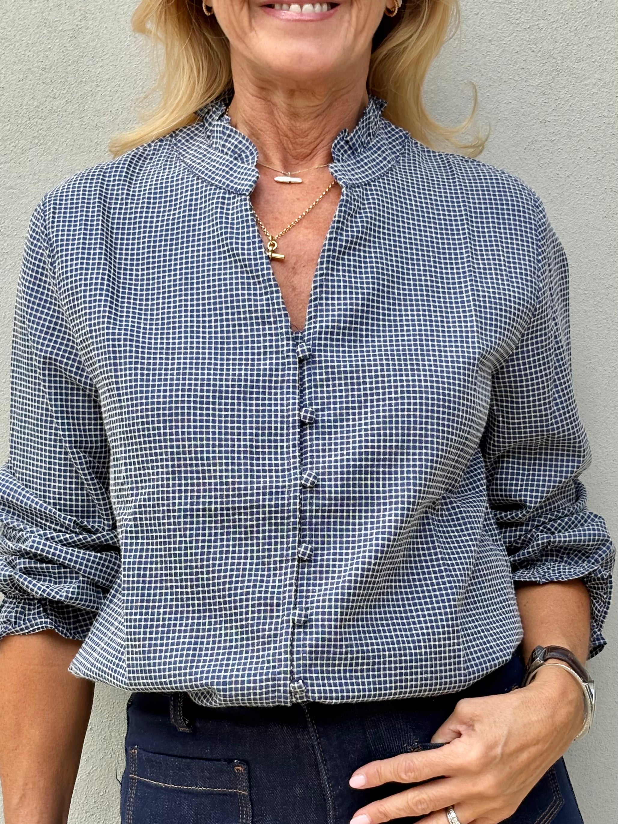 A timeless update on the classic check, this navy blue and white cotton shirt is cut in a relaxed, classic fit. The stand-up frill collar and flattering V-neckline add a touch of femininity, while the button-down front keeps the look sharp and versatile. Finished with elasticated frill cuffs for subtle volume and ease, this piece blends effortless charm with everyday wearability.