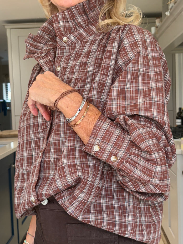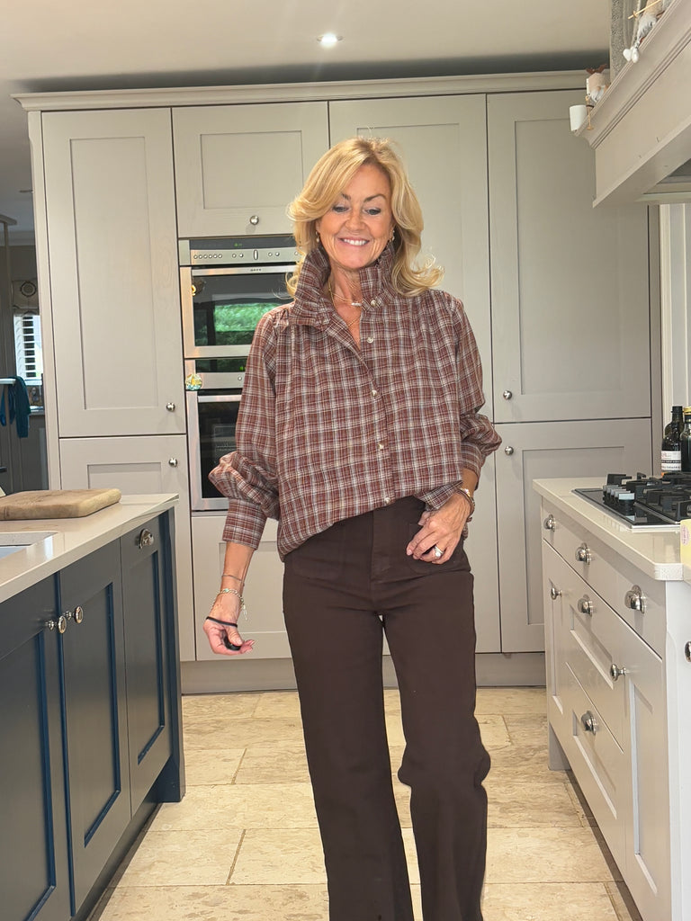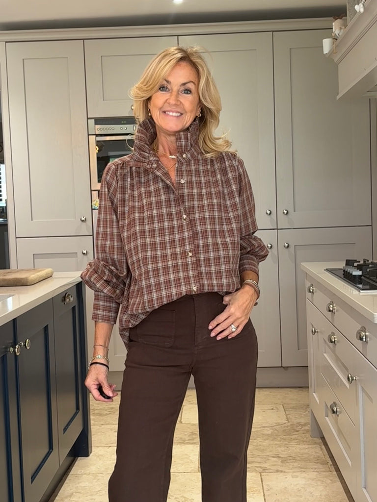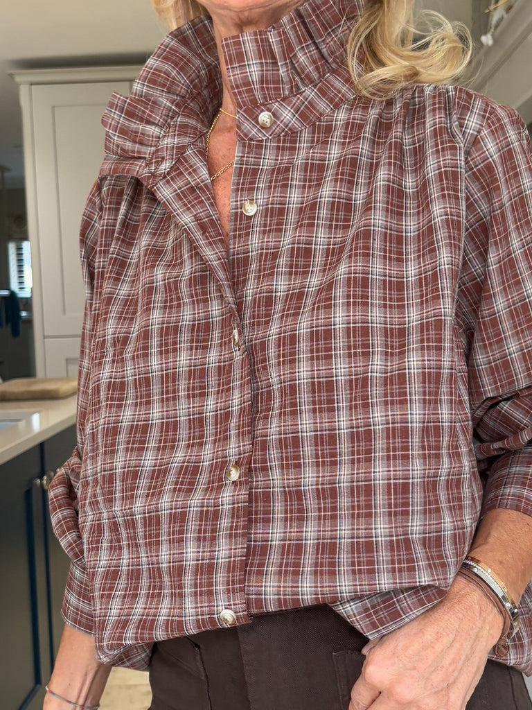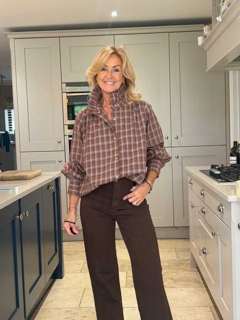 A beautiful brown and tan checked blouse with timeless English country charm. Designed with a striking stand-up frill collar and a classic button-down front, it features subtly puffed sleeves finished with wide cuffs for an elegant silhouette. Stunning, classic, and effortlessly sophisticated — a true wardrobe favourite.