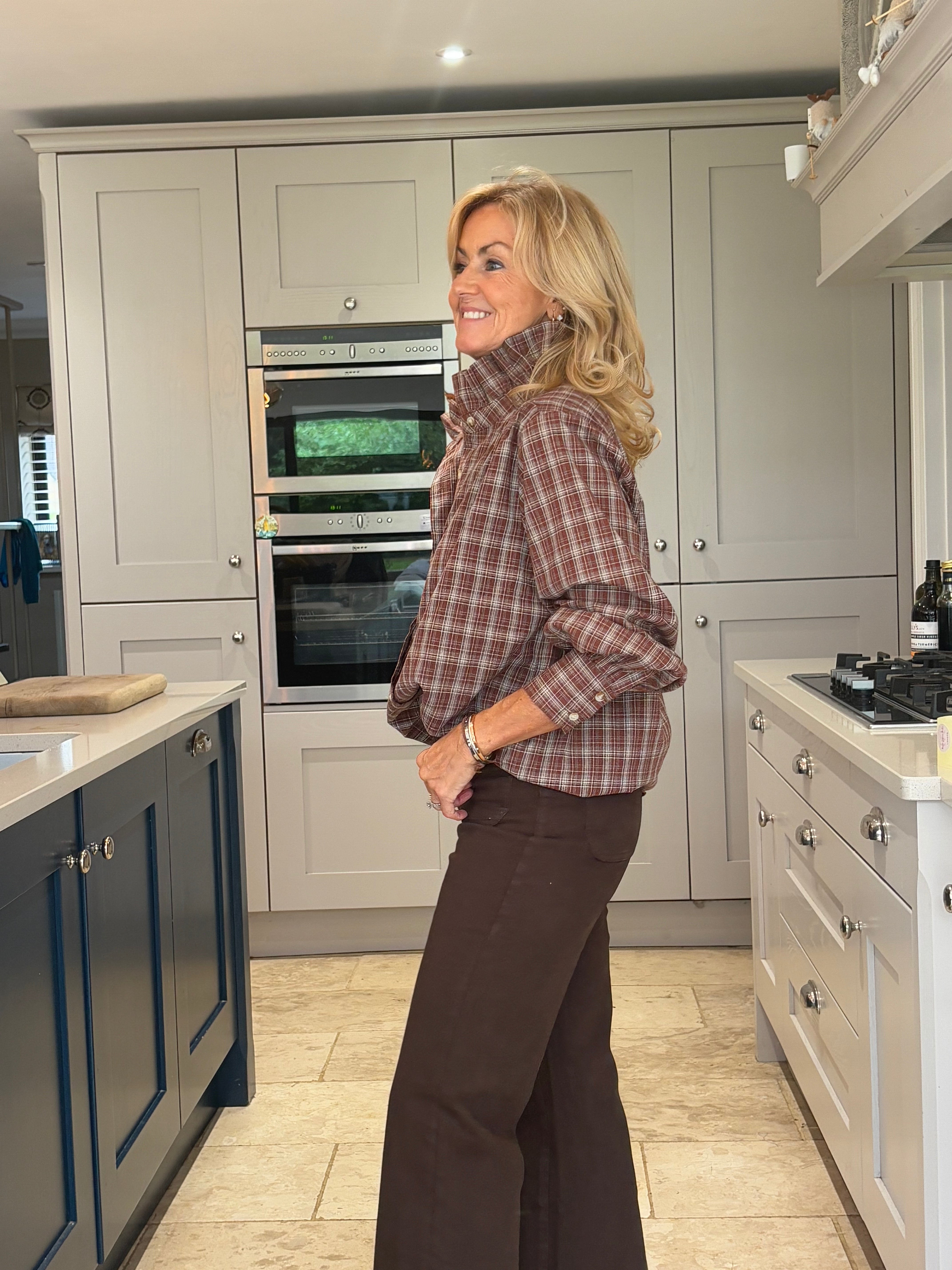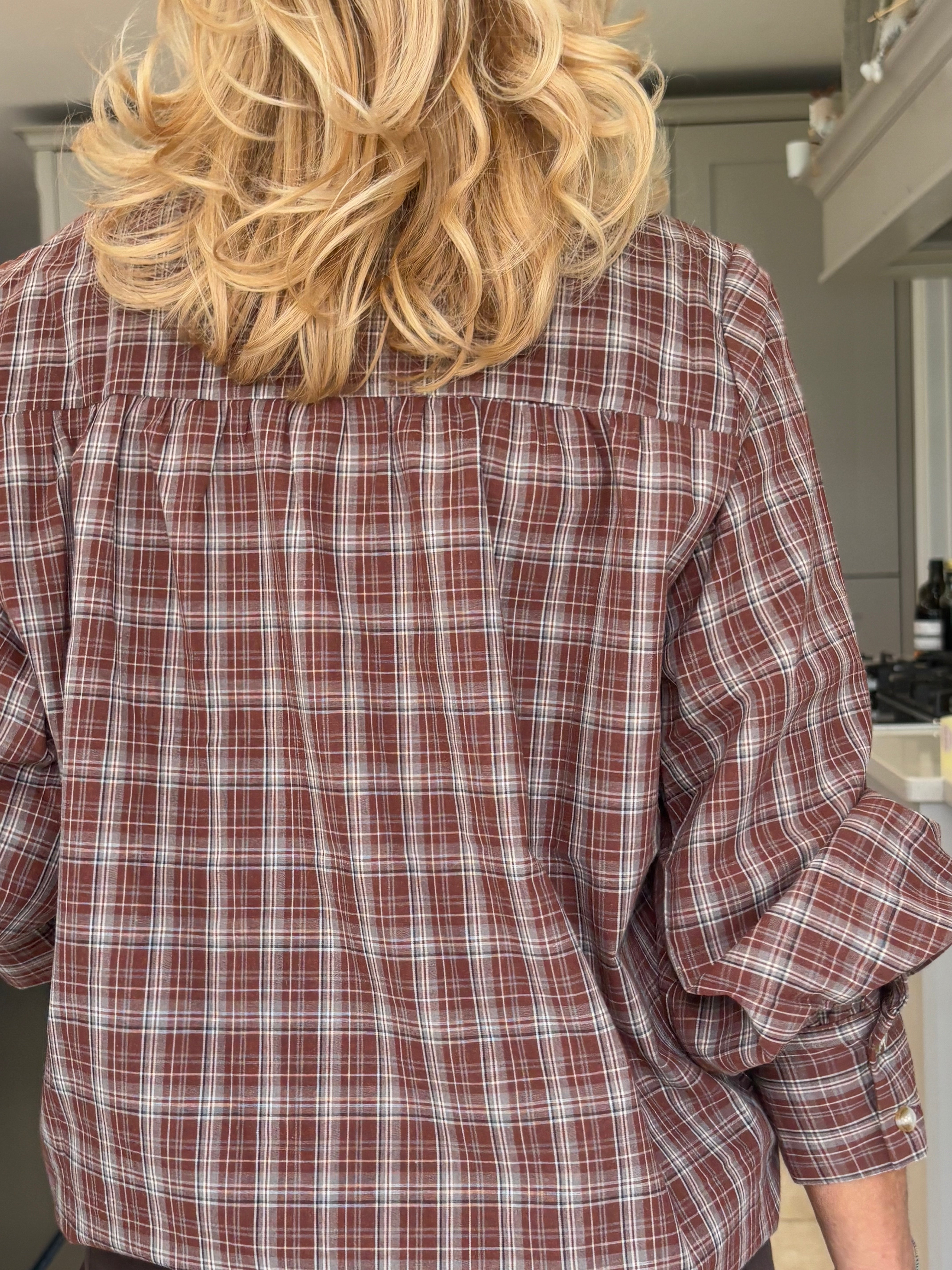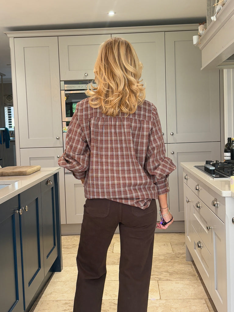 A beautiful brown and tan checked blouse with timeless English country charm. Designed with a striking stand-up frill collar and a classic button-down front, it features subtly puffed sleeves finished with wide cuffs for an elegant silhouette. Stunning, classic, and effortlessly sophisticated — a true wardrobe favourite.