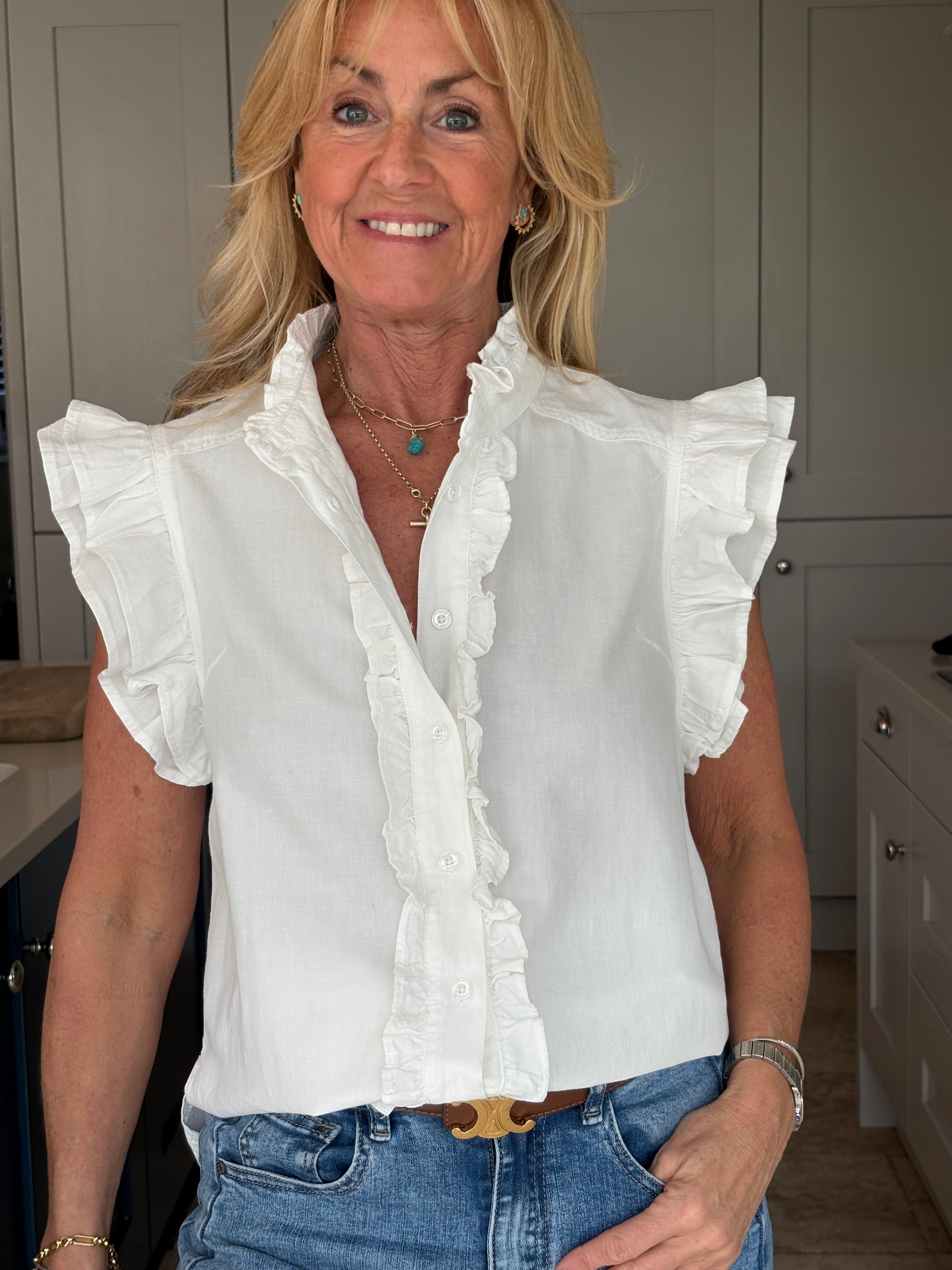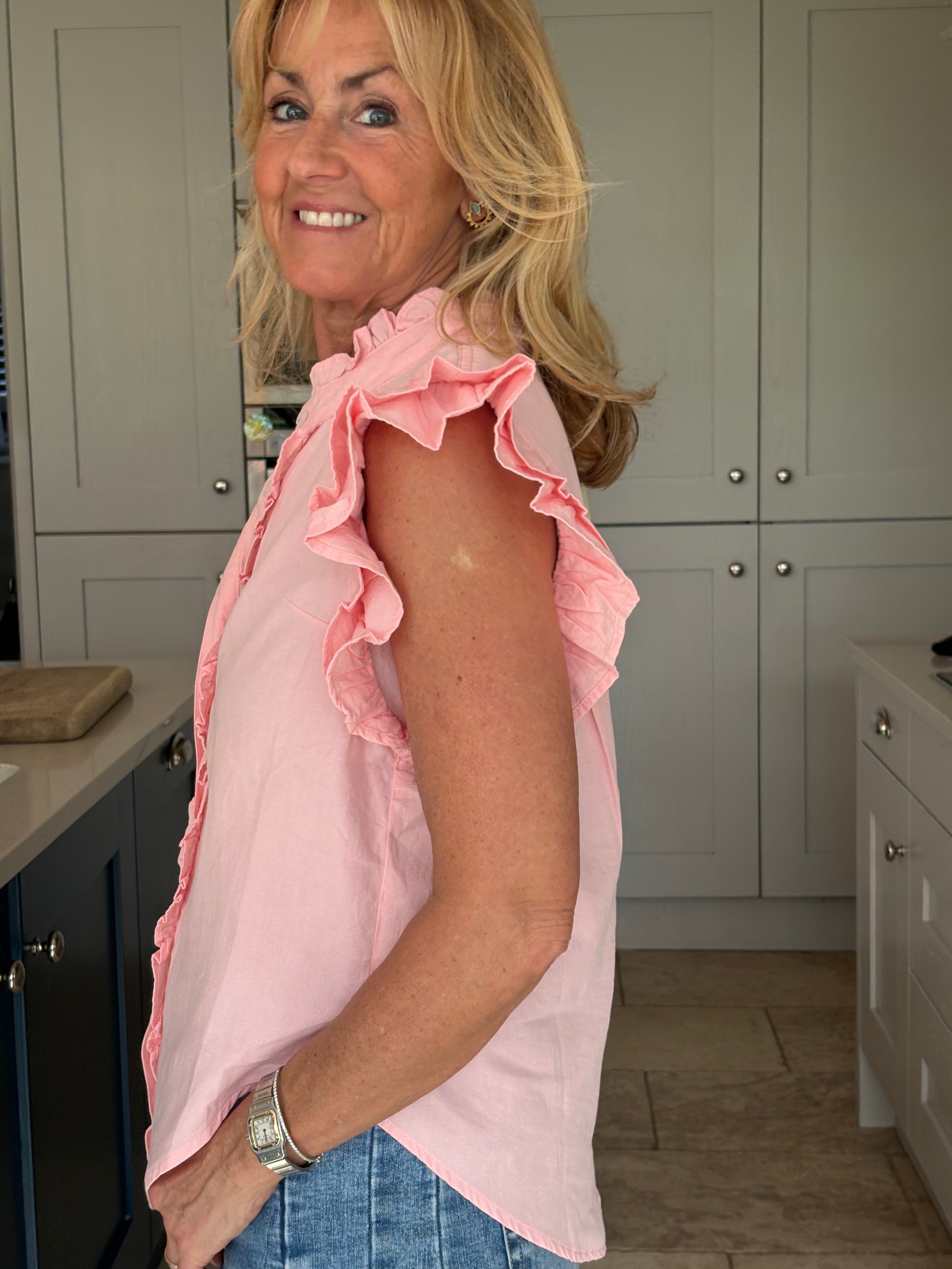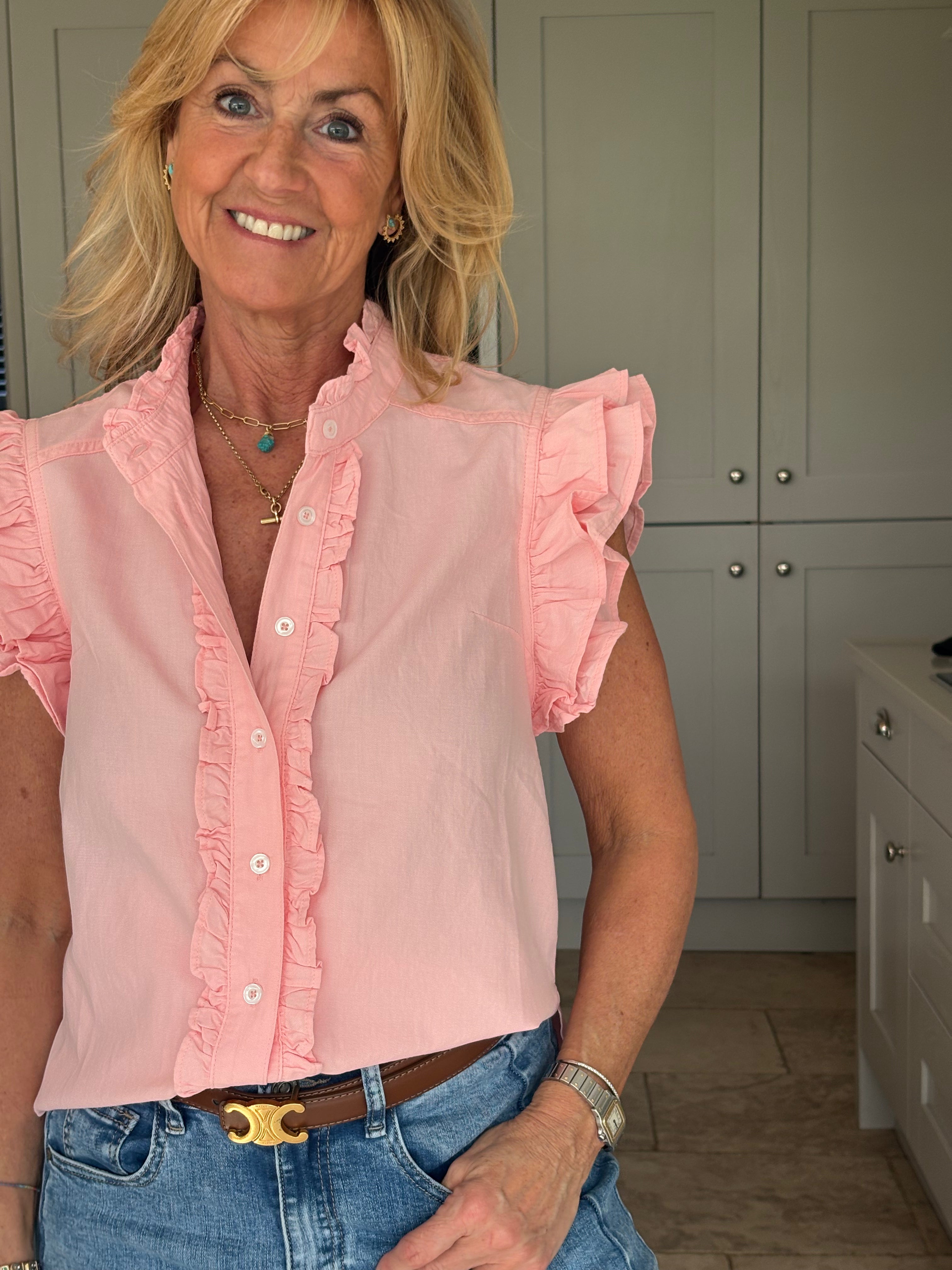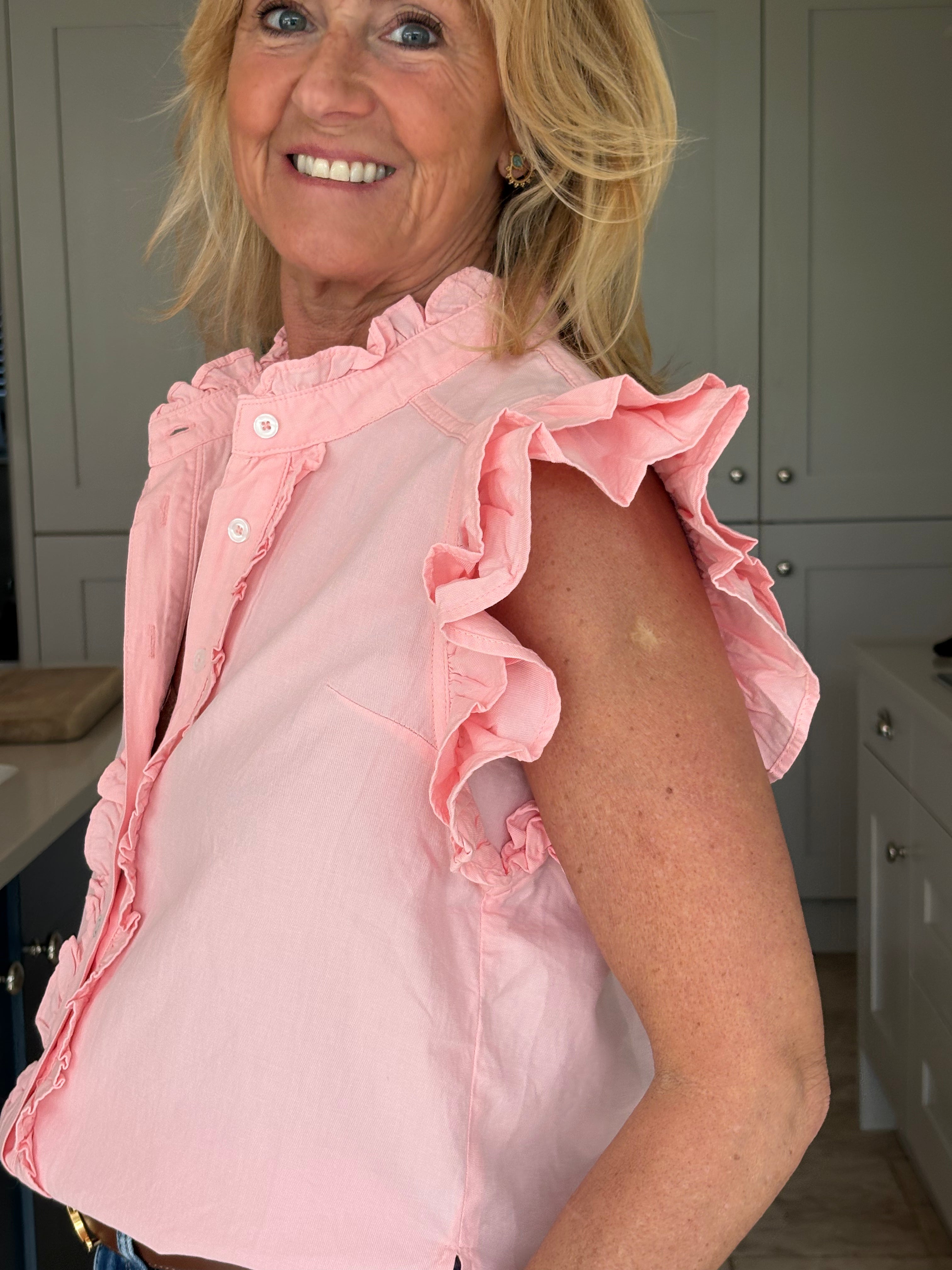A gorgeous sleeveless, soft, cotton blouse with beautifully feminine detailing. It features a stand-up ruffle collar, with delicate ruffles running down the front opening to create a soft, romantic focal point. A double ruffle around the armholes adds extra charm and movement, giving the blouse a wonderfully girlie and romantic feel. Finished with a classic shirt-style hemline and two small side splits, this piece is designed for versatility — perfect worn tucked neatly into trousers or a skirt, or left loose for a more relaxed look. In Pink and White.