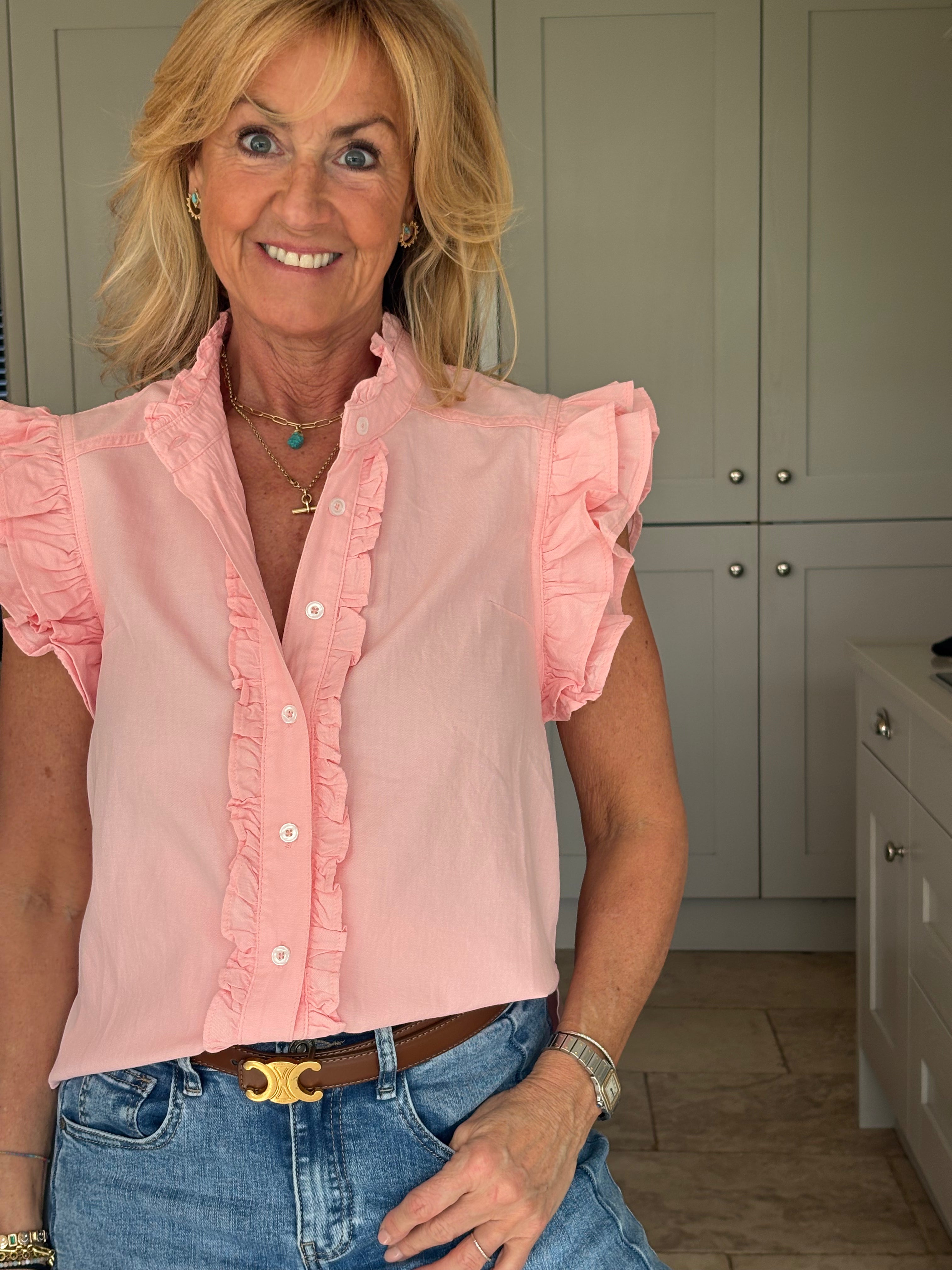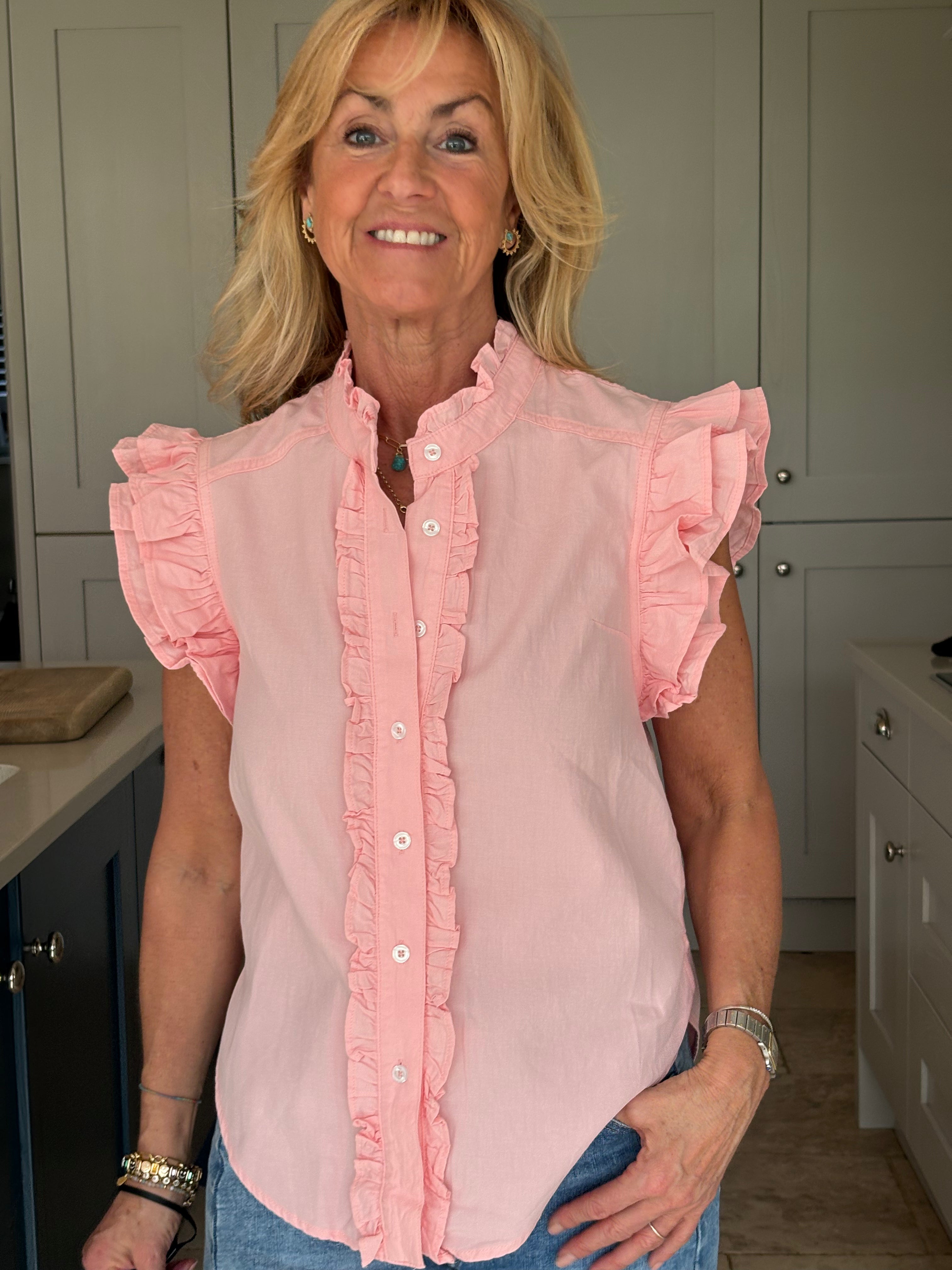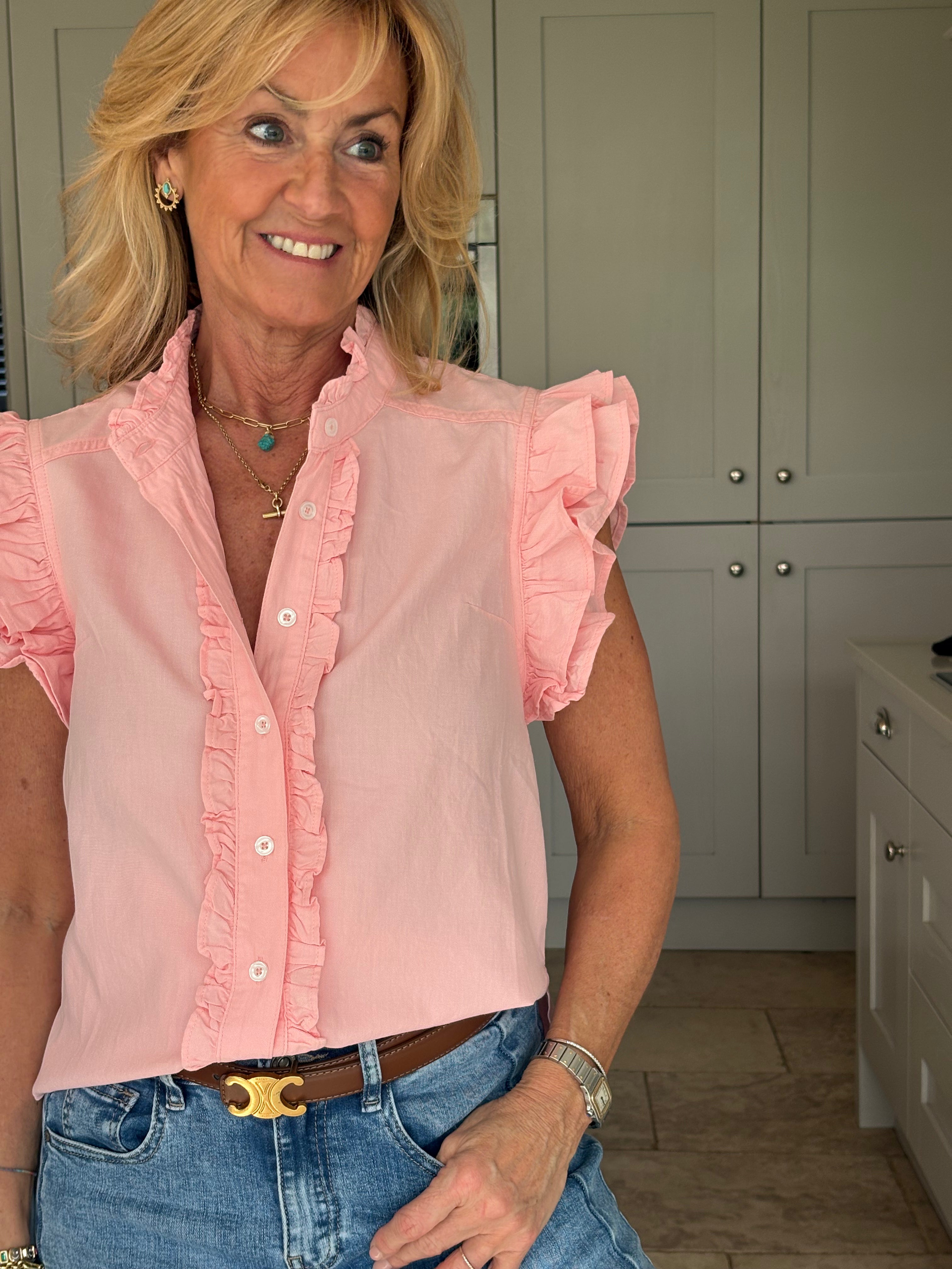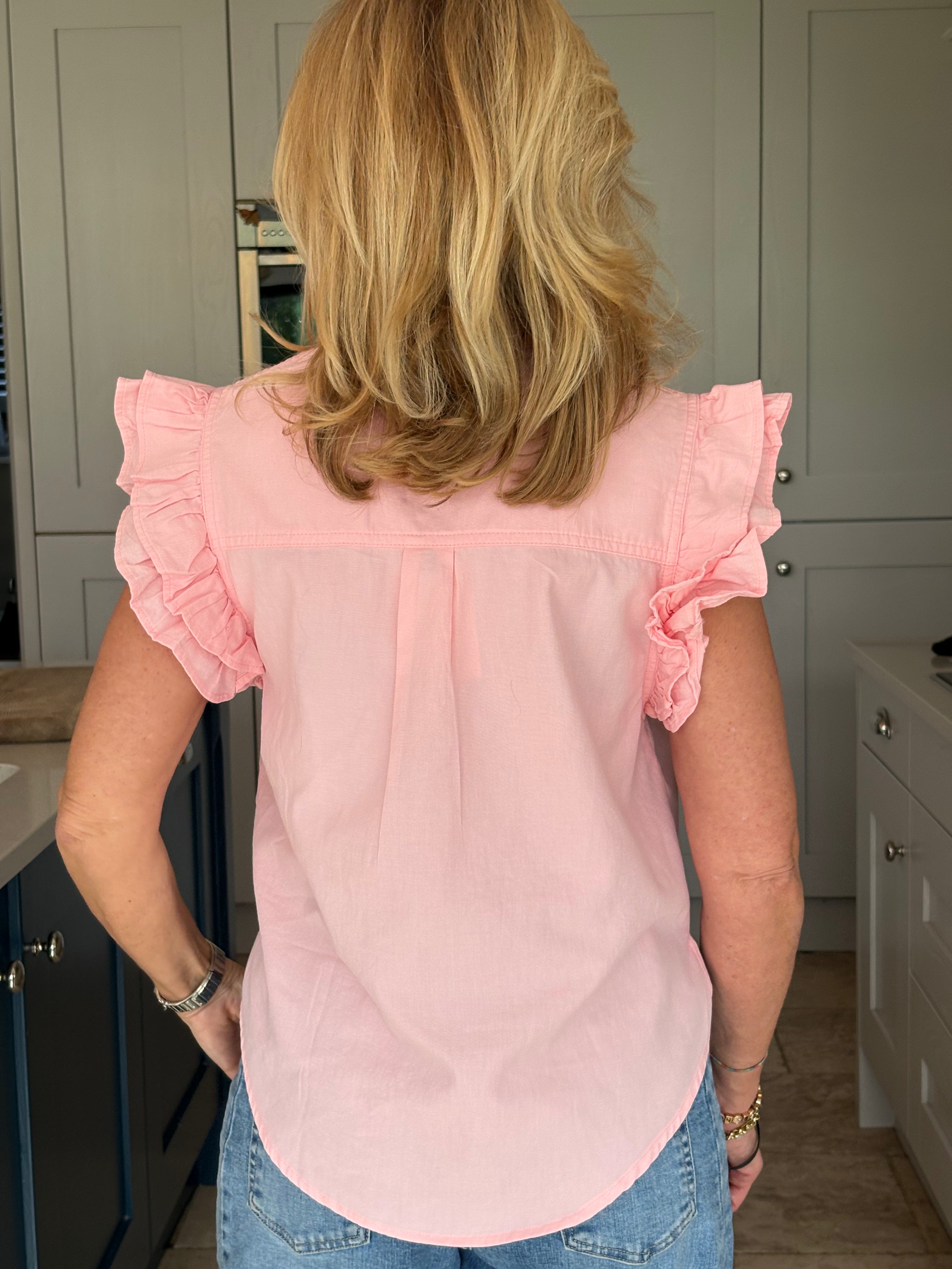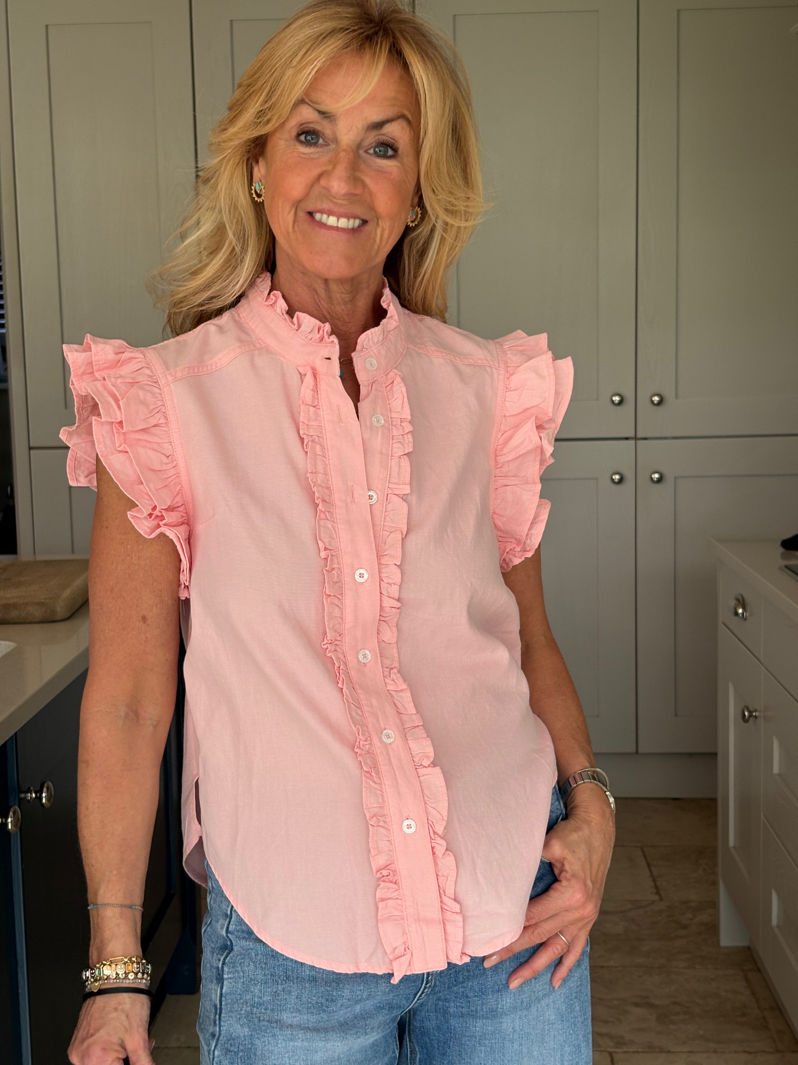 A gorgeous sleeveless, soft, cotton blouse with beautifully feminine detailing. It features a stand-up ruffle collar, with delicate ruffles running down the front opening to create a soft, romantic focal point. A double ruffle around the armholes adds extra charm and movement, giving the blouse a wonderfully girlie and romantic feel. Finished with a classic shirt-style hemline and two small side splits, this piece is designed for versatility — perfect worn tucked neatly into trousers or a skirt, or left loose for a more relaxed look. In Pink and White.