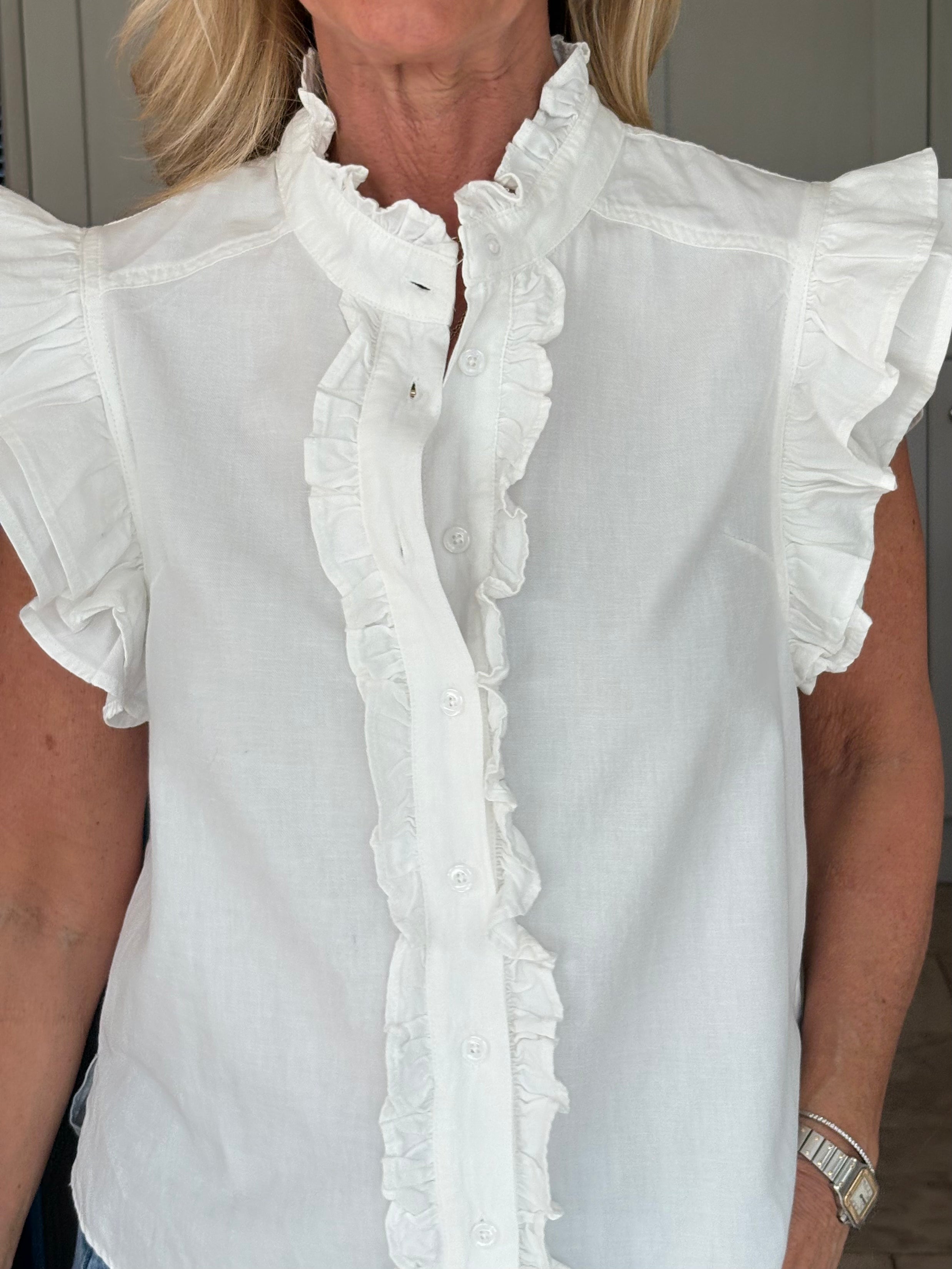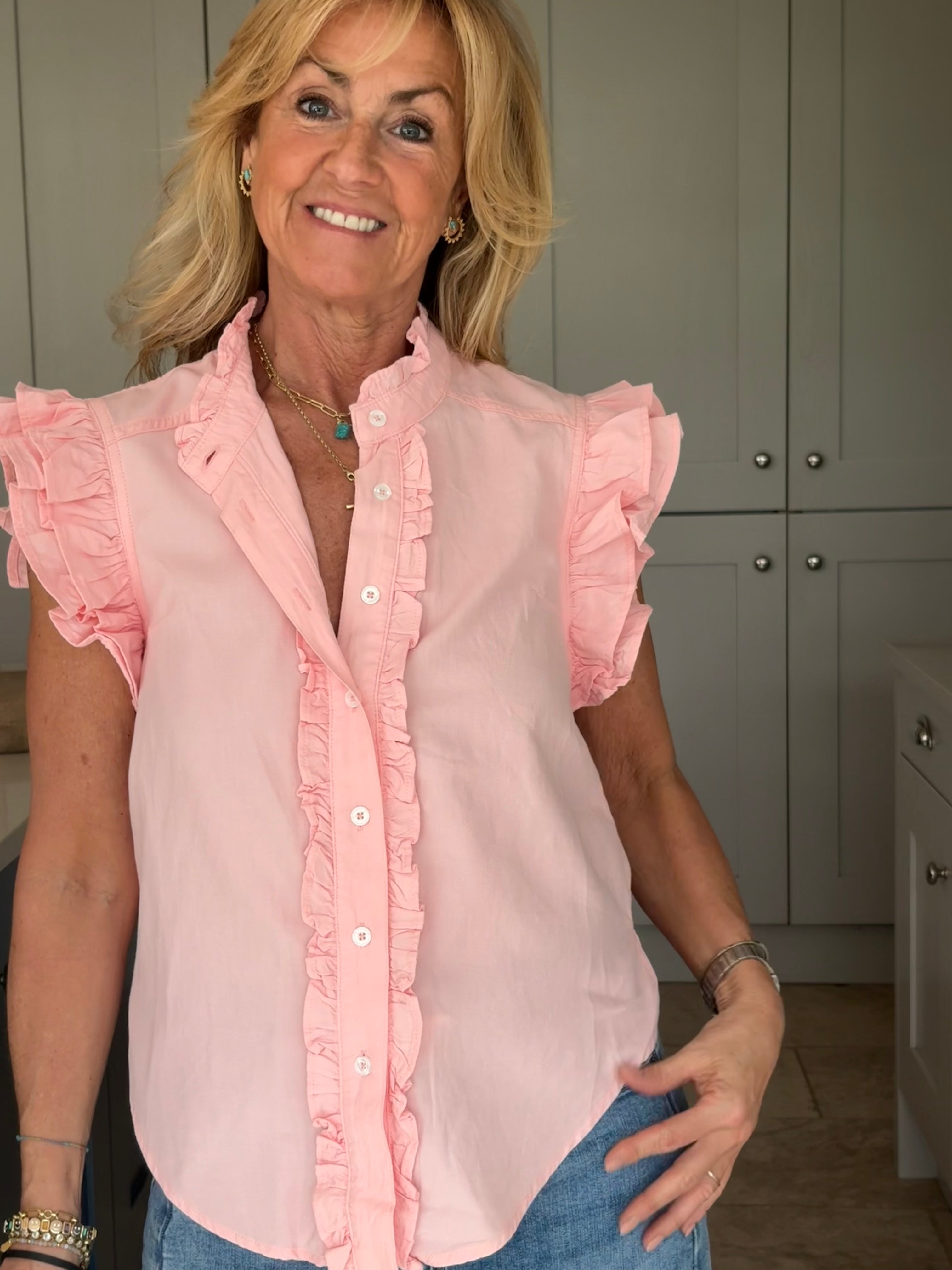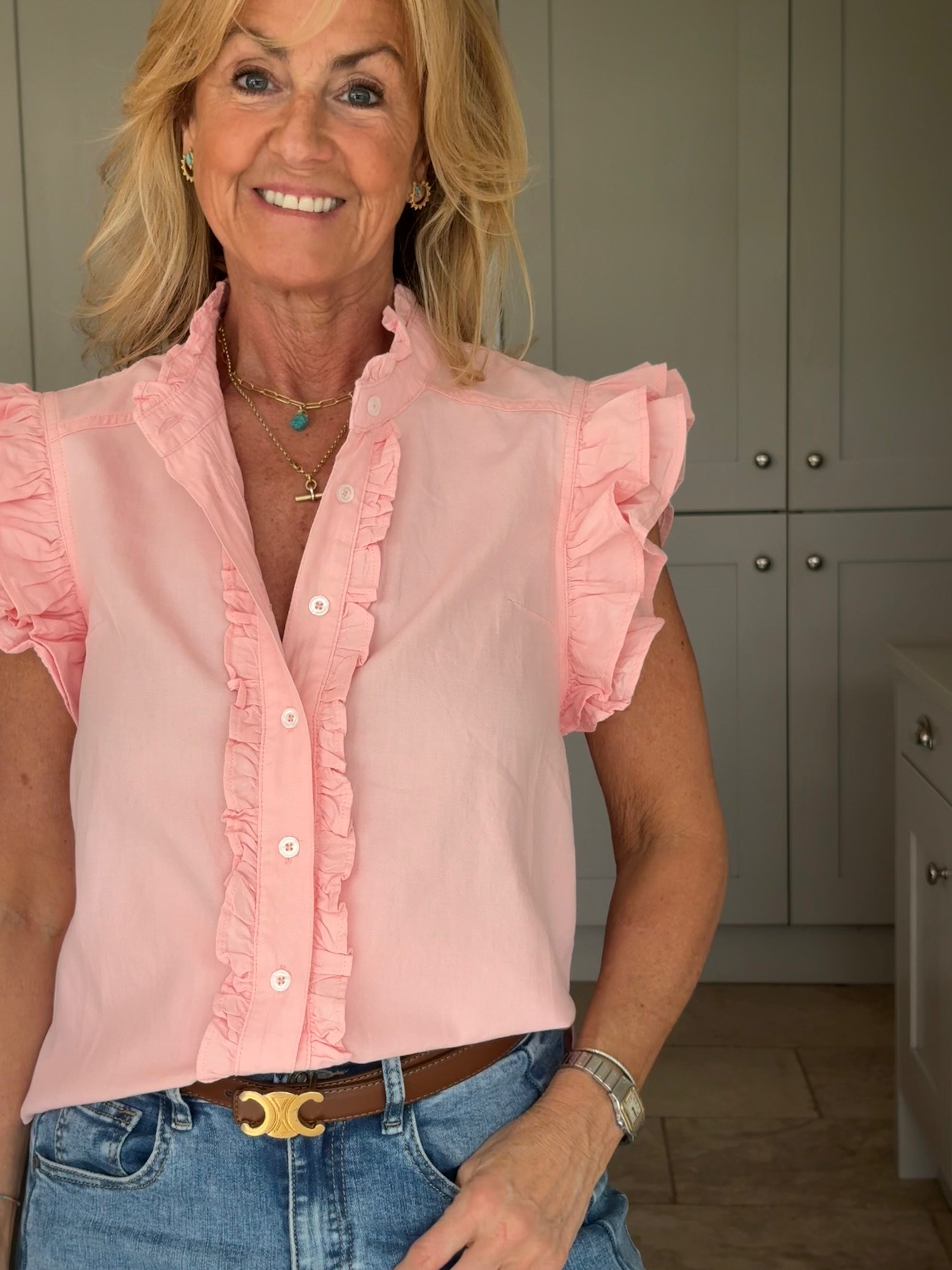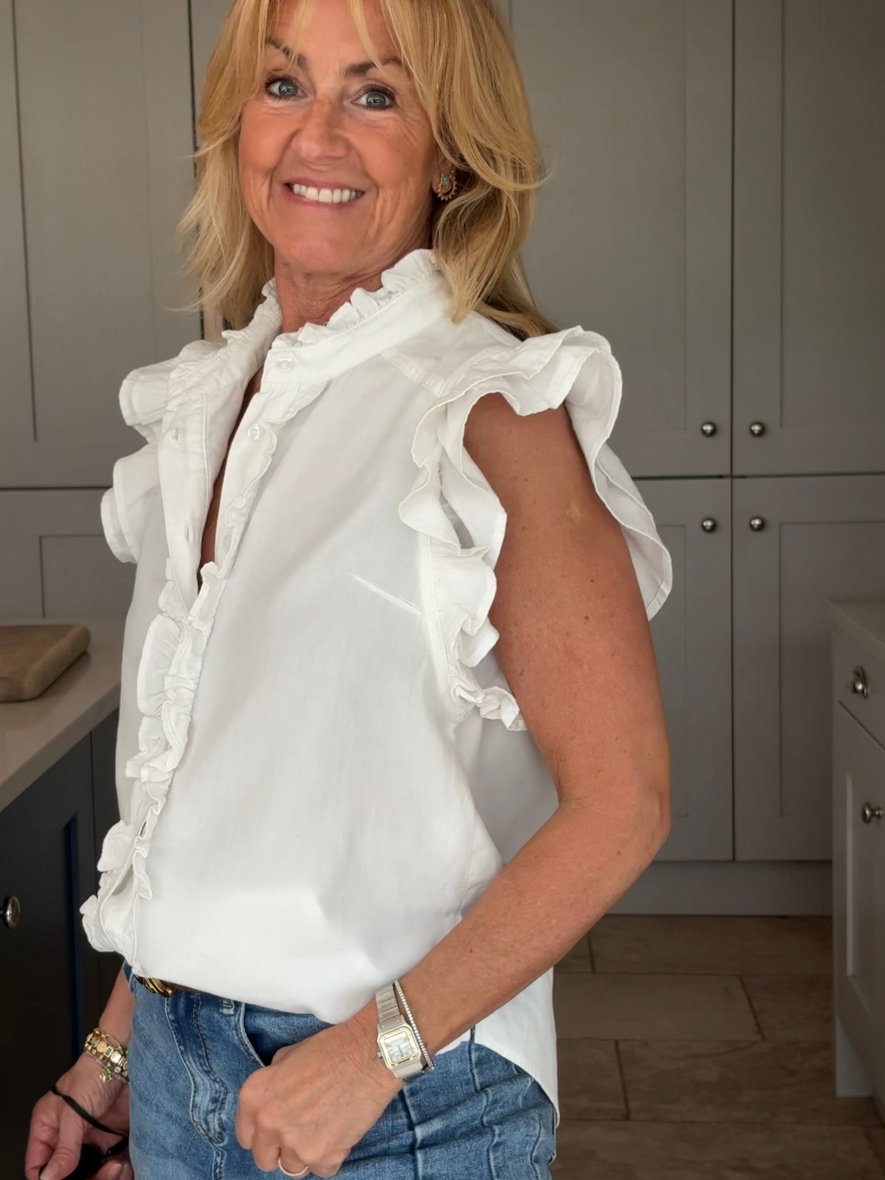 A gorgeous sleeveless, soft, cotton blouse with beautifully feminine detailing. It features a stand-up ruffle collar, with delicate ruffles running down the front opening to create a soft, romantic focal point. A double ruffle around the armholes adds extra charm and movement, giving the blouse a wonderfully girlie and romantic feel. Finished with a classic shirt-style hemline and two small side splits, this piece is designed for versatility — perfect worn tucked neatly into trousers or a skirt, or left loose for a more relaxed look. In Pink and White.