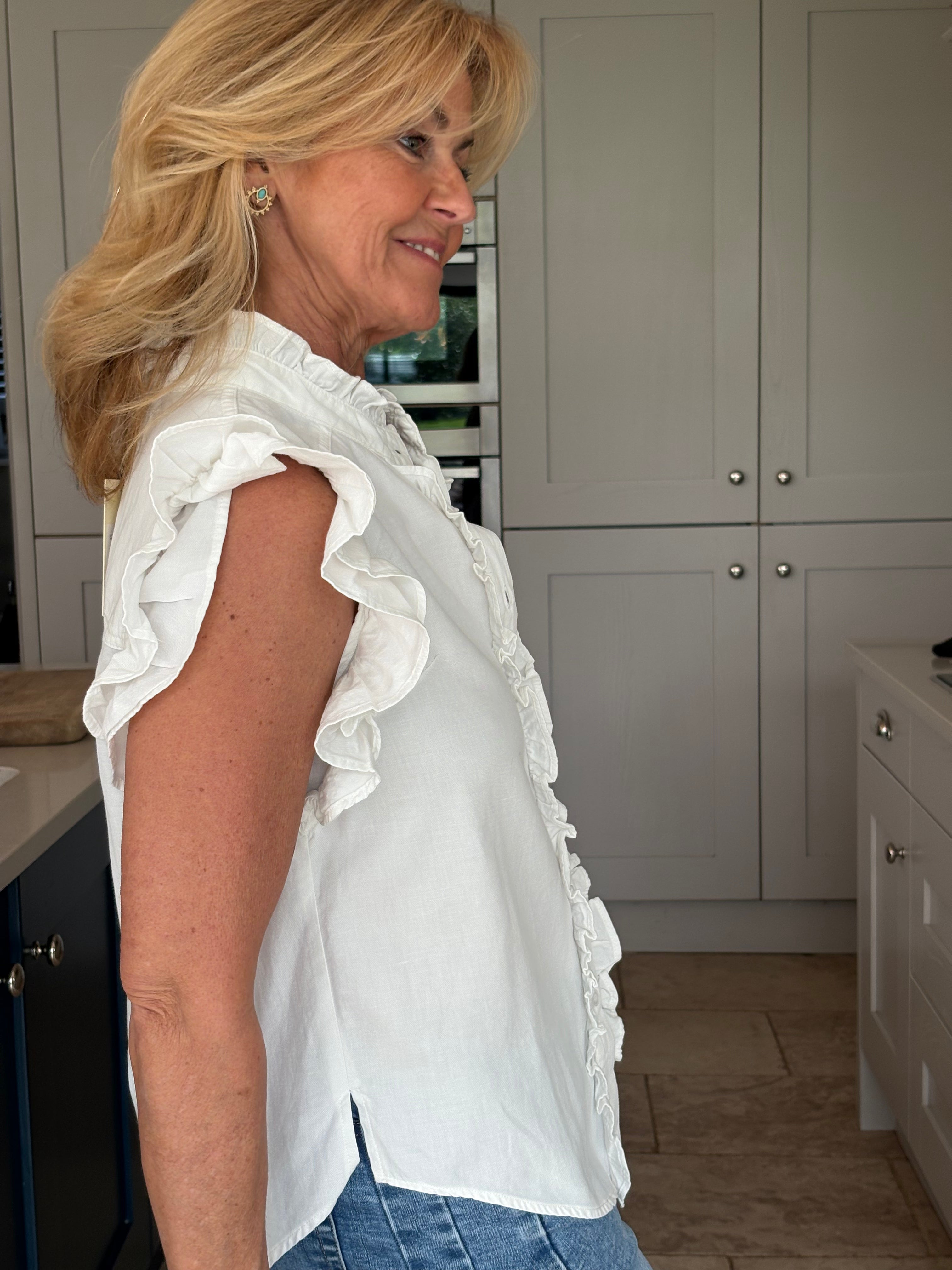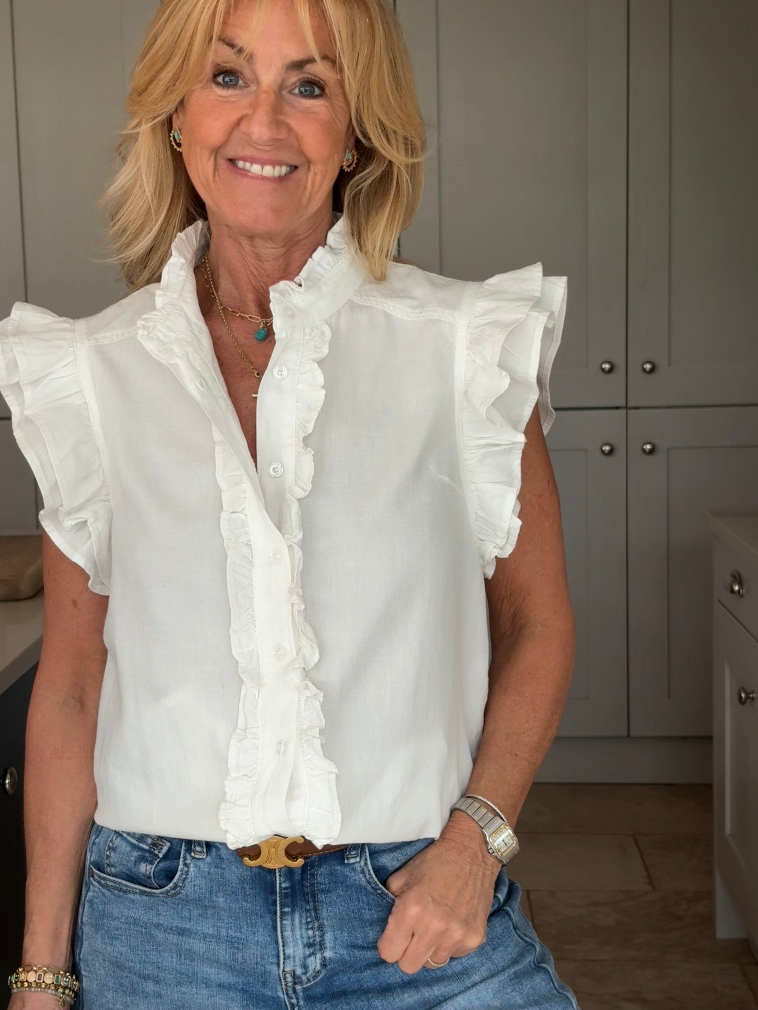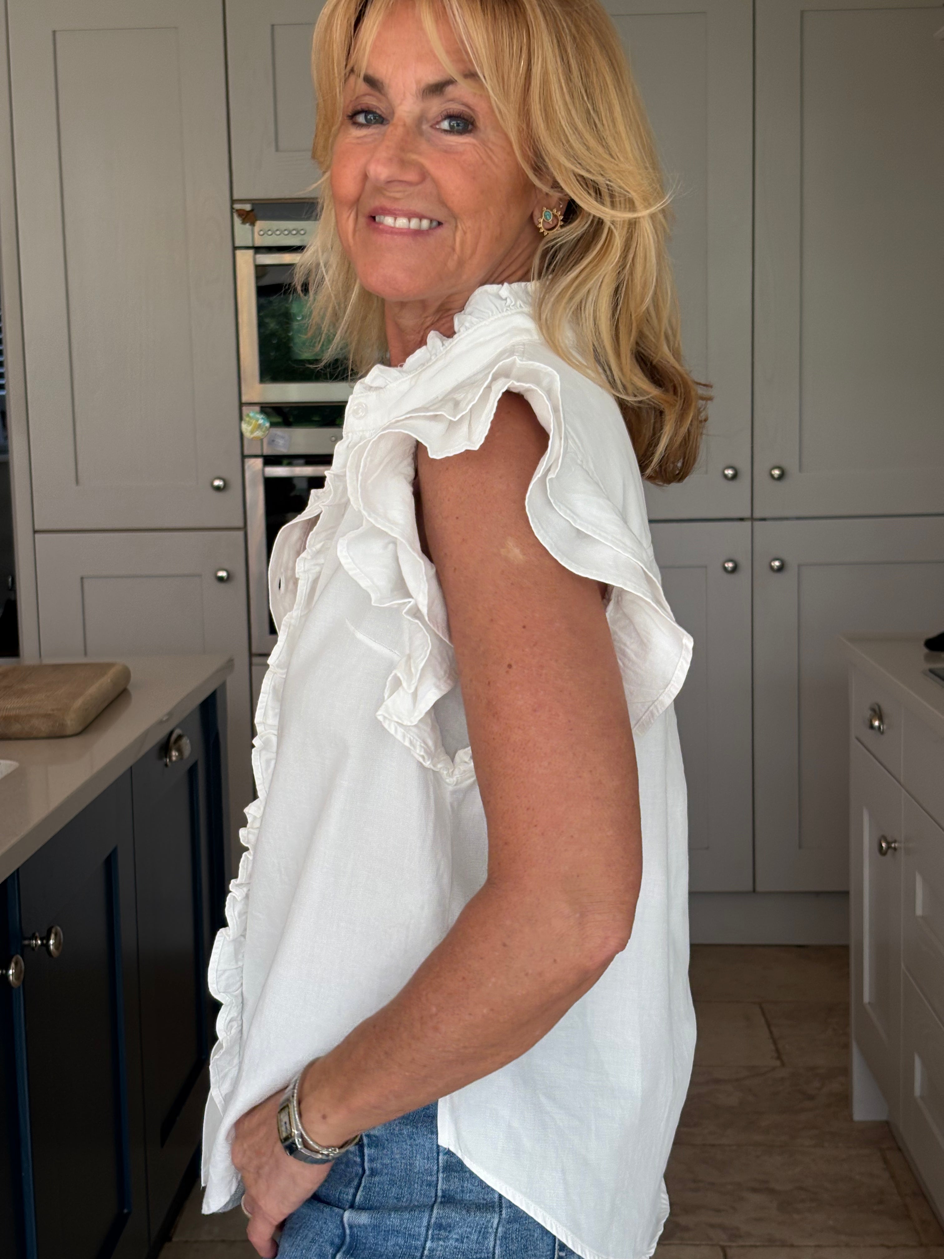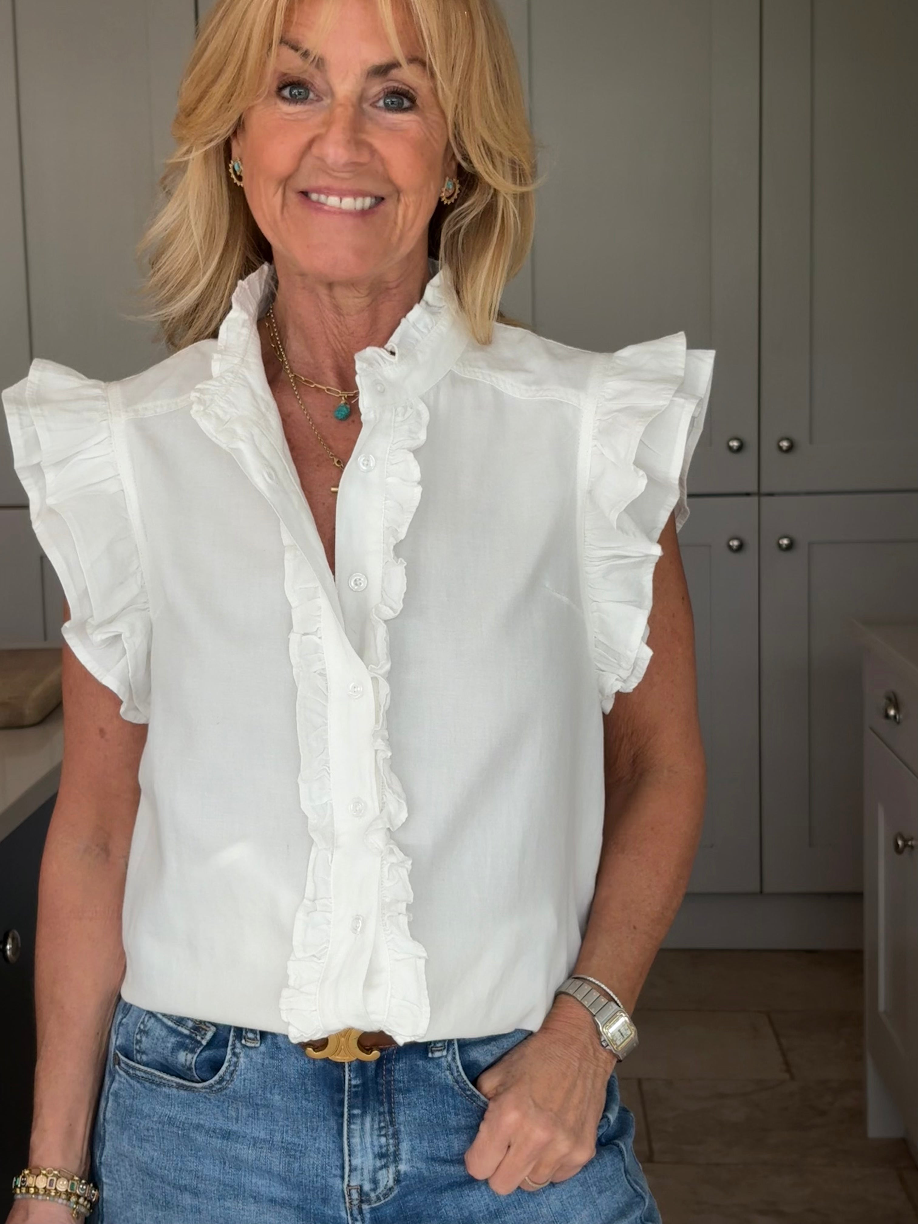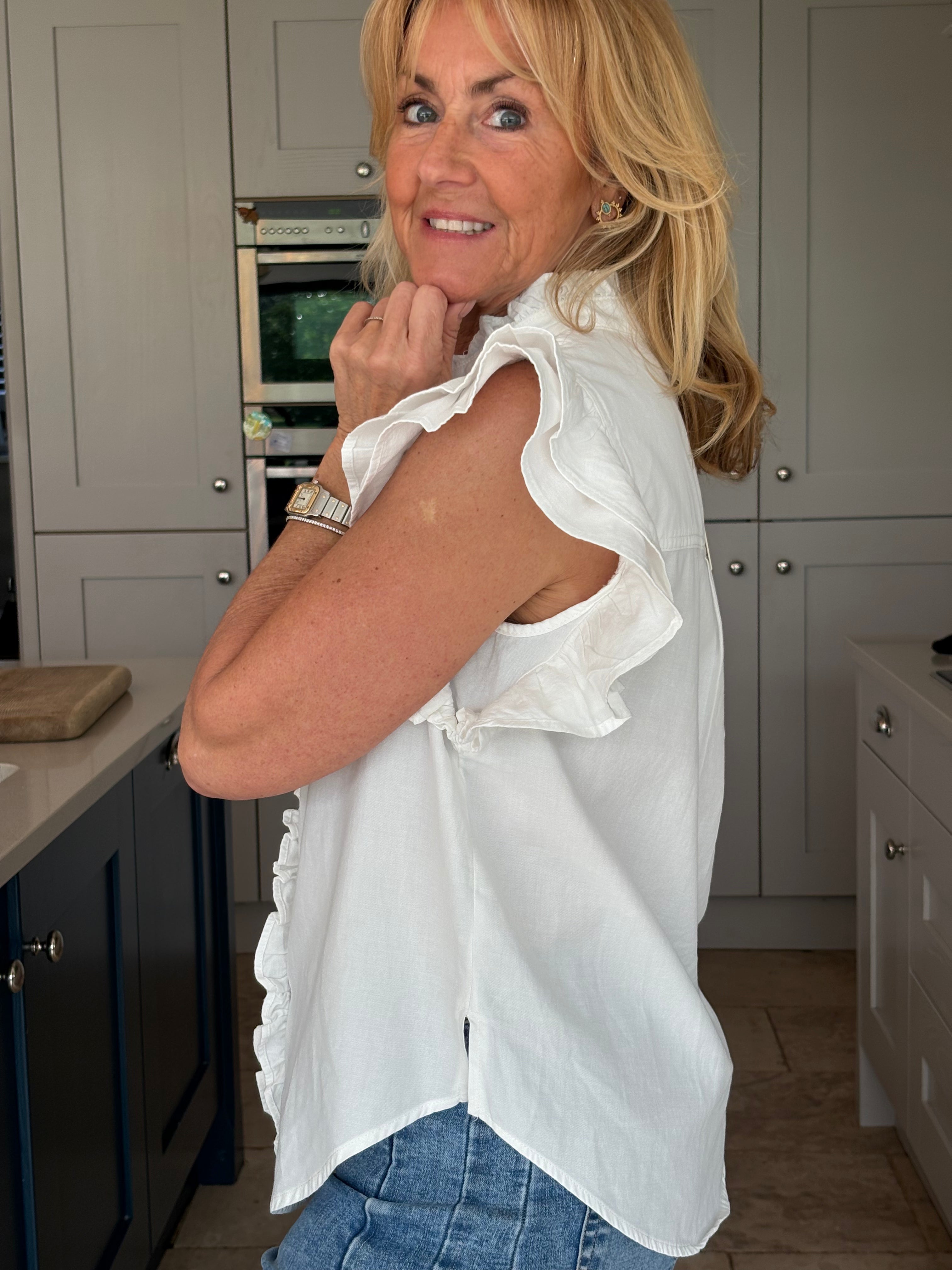 A gorgeous sleeveless, soft, cotton blouse with beautifully feminine detailing. It features a stand-up ruffle collar, with delicate ruffles running down the front opening to create a soft, romantic focal point. A double ruffle around the armholes adds extra charm and movement, giving the blouse a wonderfully girlie and romantic feel. Finished with a classic shirt-style hemline and two small side splits, this piece is designed for versatility — perfect worn tucked neatly into trousers or a skirt, or left loose for a more relaxed look. In Pink and White.