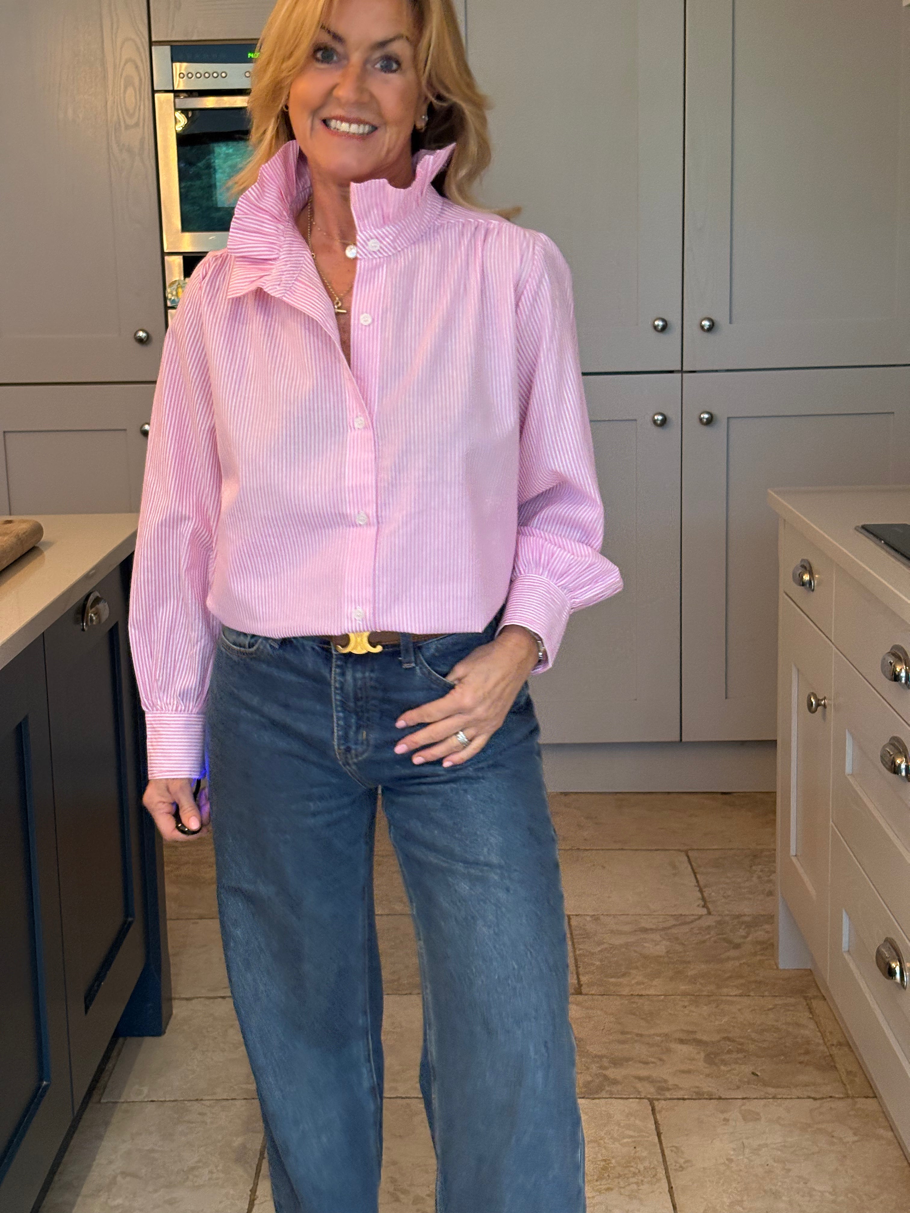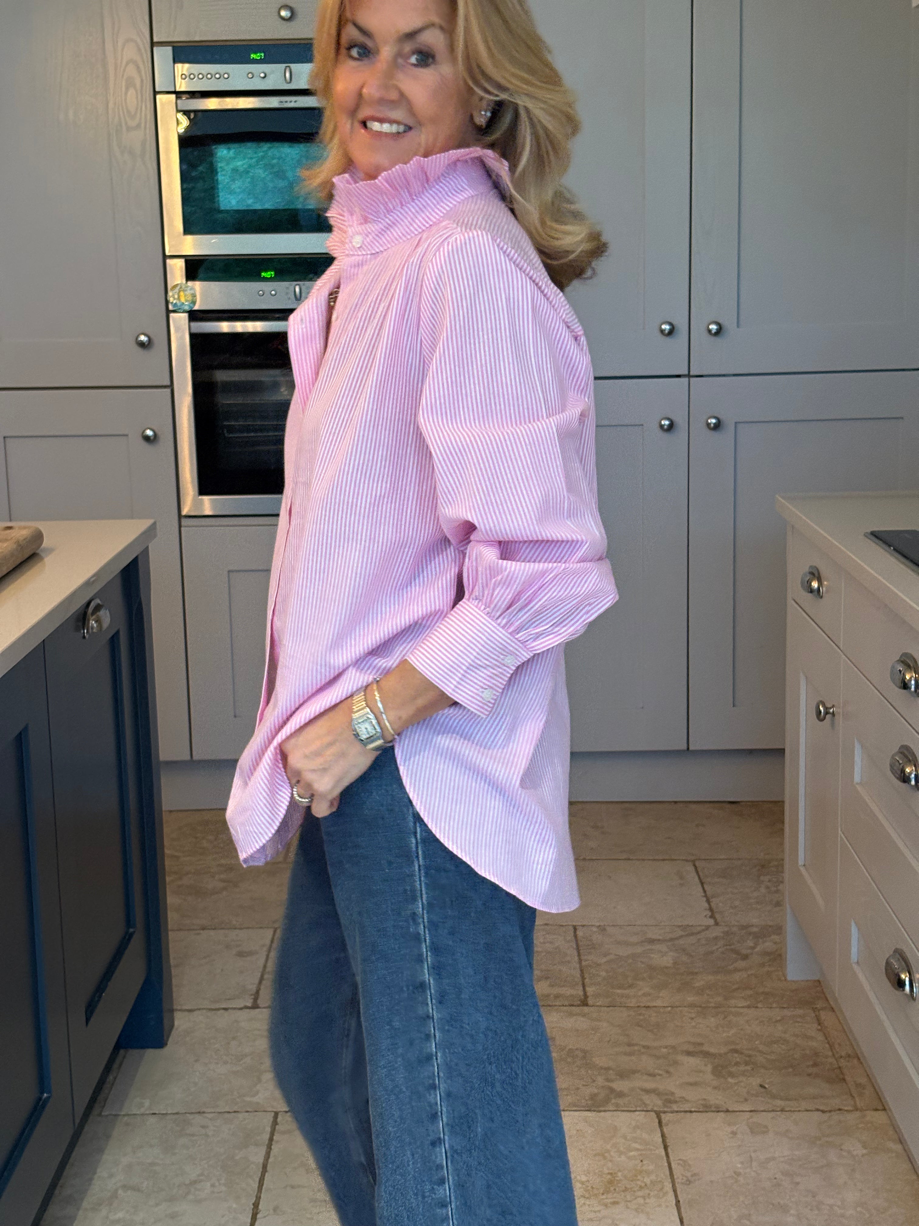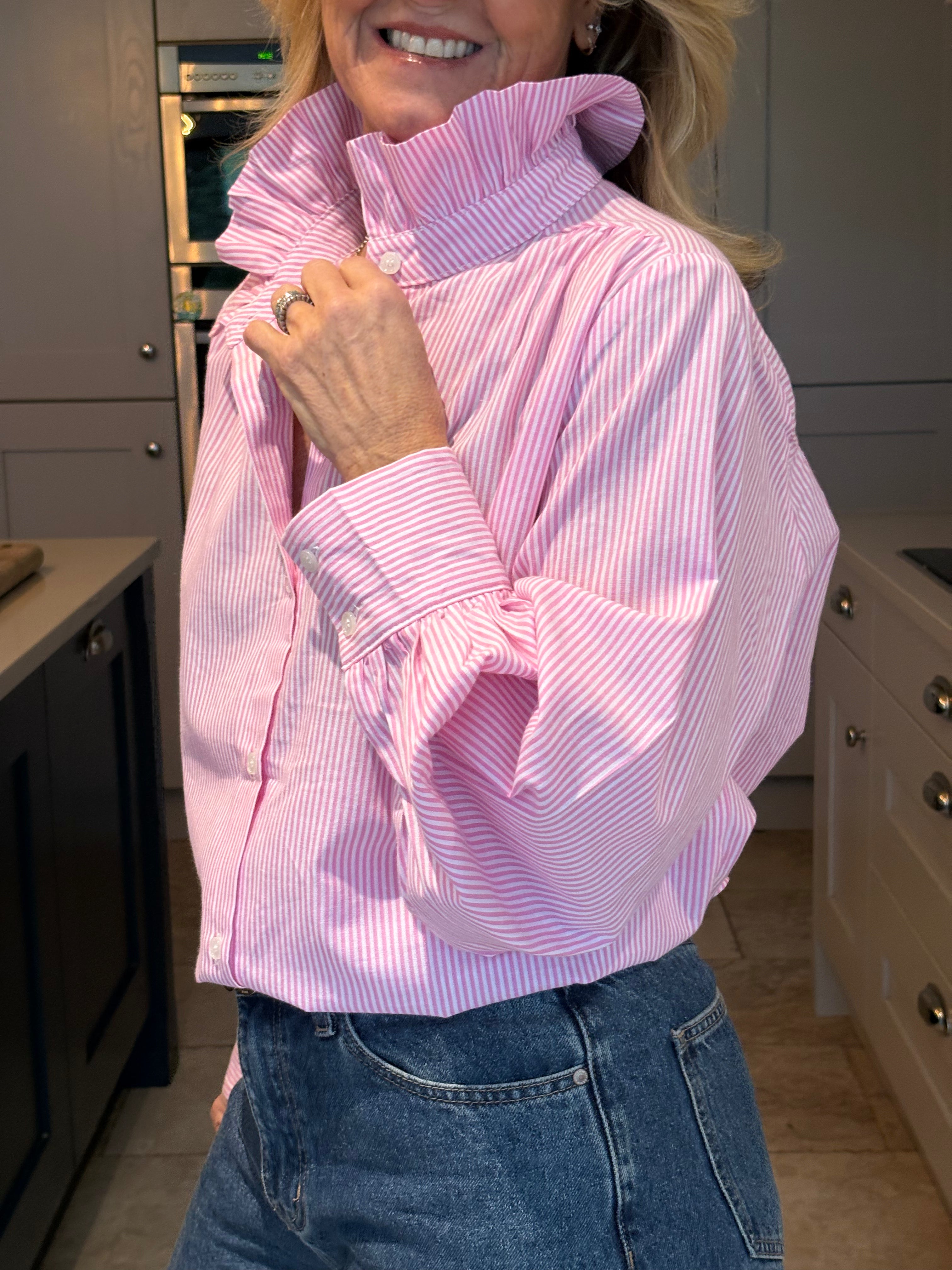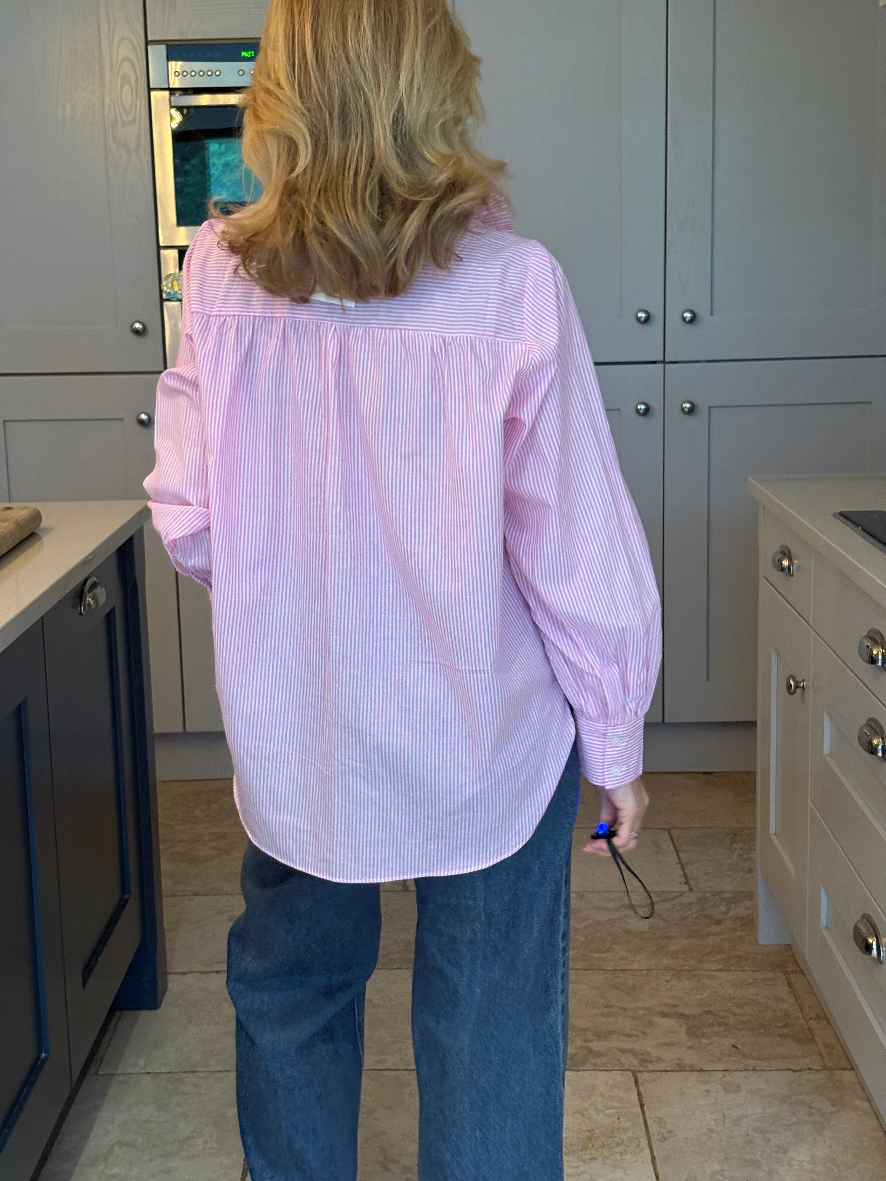 A beautiful oversized pink pin striped cotton blouse with a stand up pleated collar and a classic shirt hemline, slightly longer at the back.  Gently puffed sleeves with a deep double buttoned cuff with horizontal pin stripes. The Elodie is Cotton and comes in 2 sizes, S/M and M/L. This is an oversized fit.