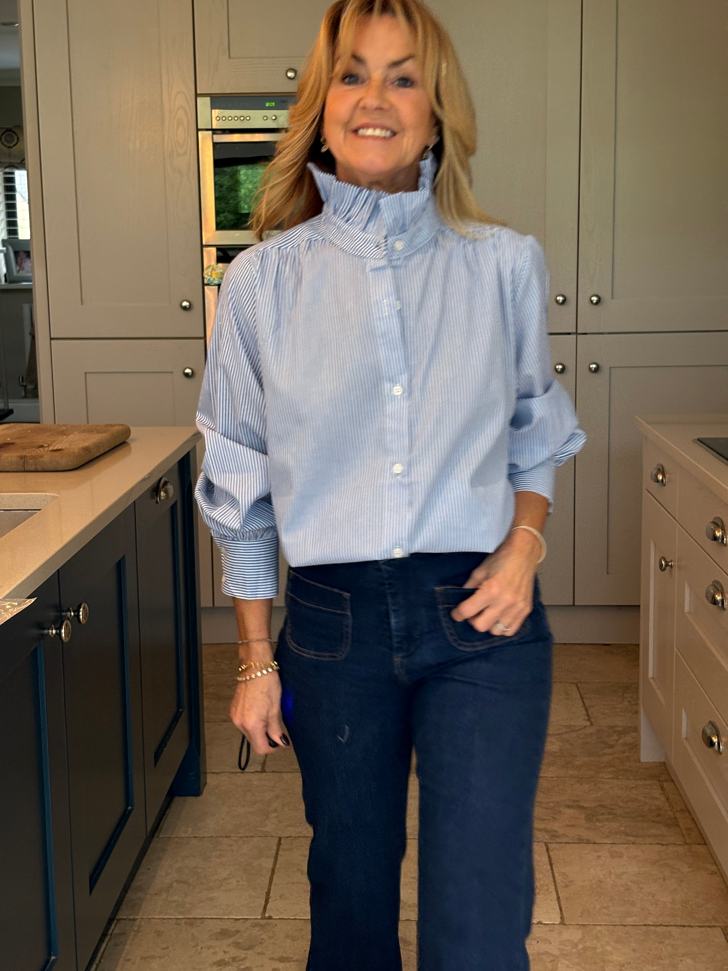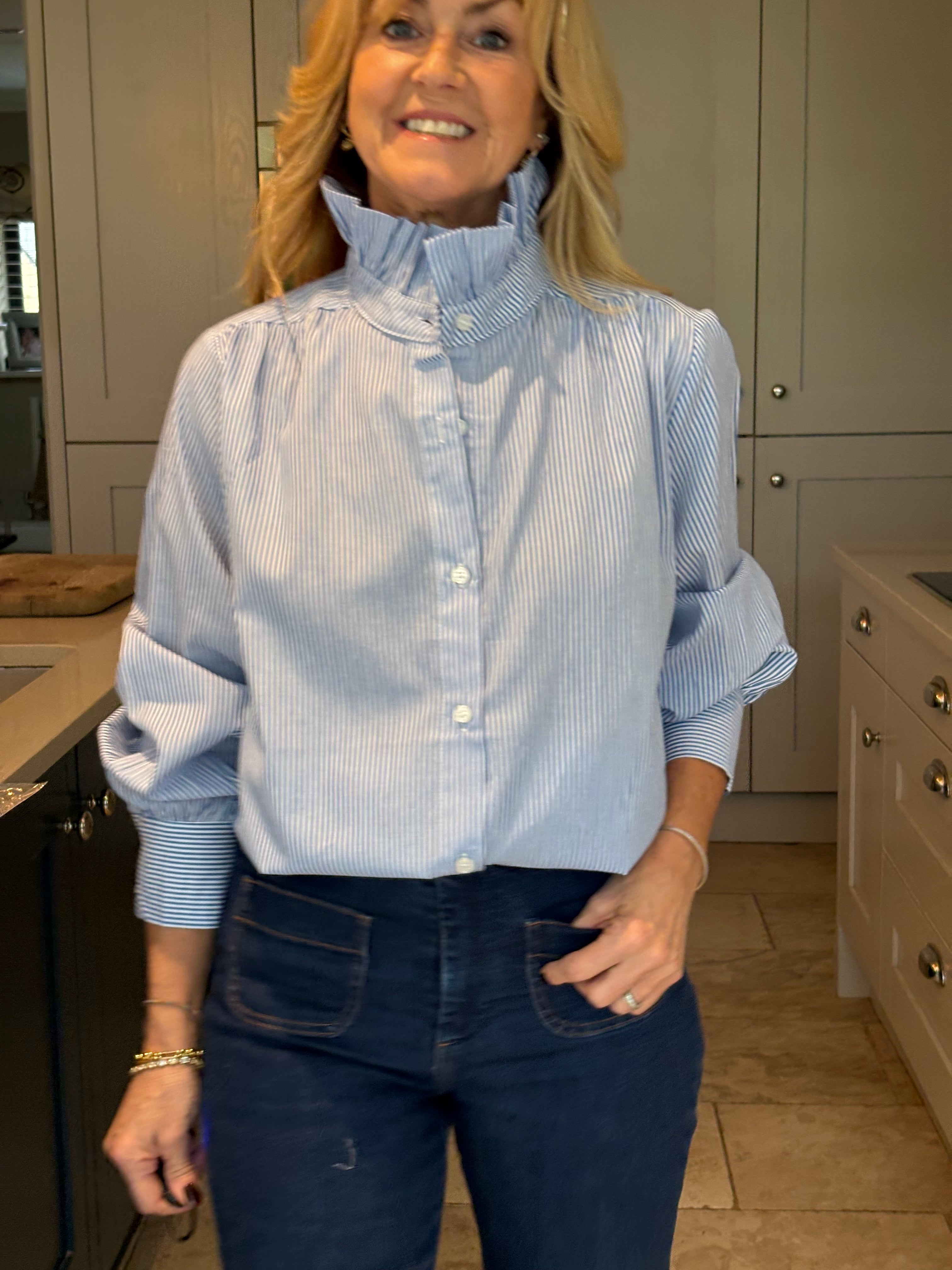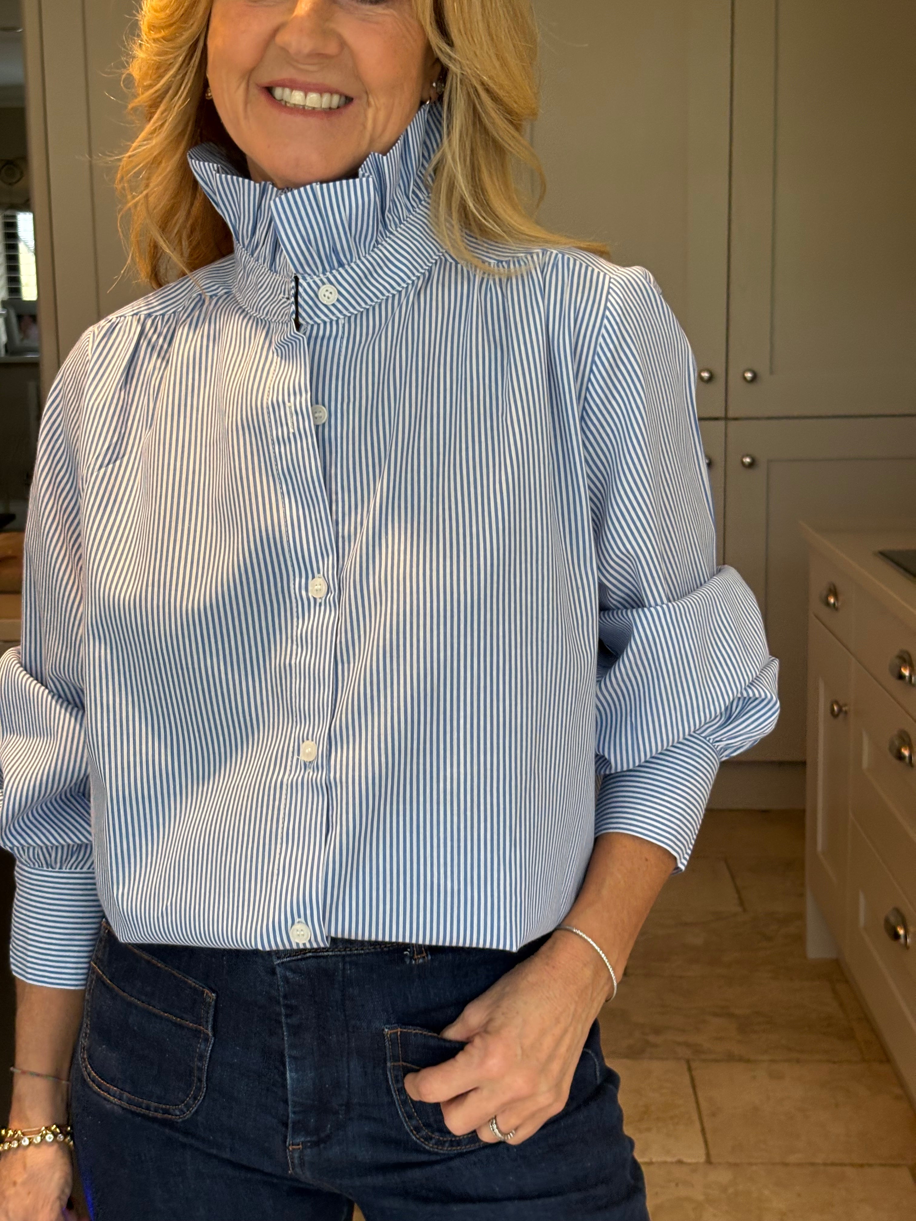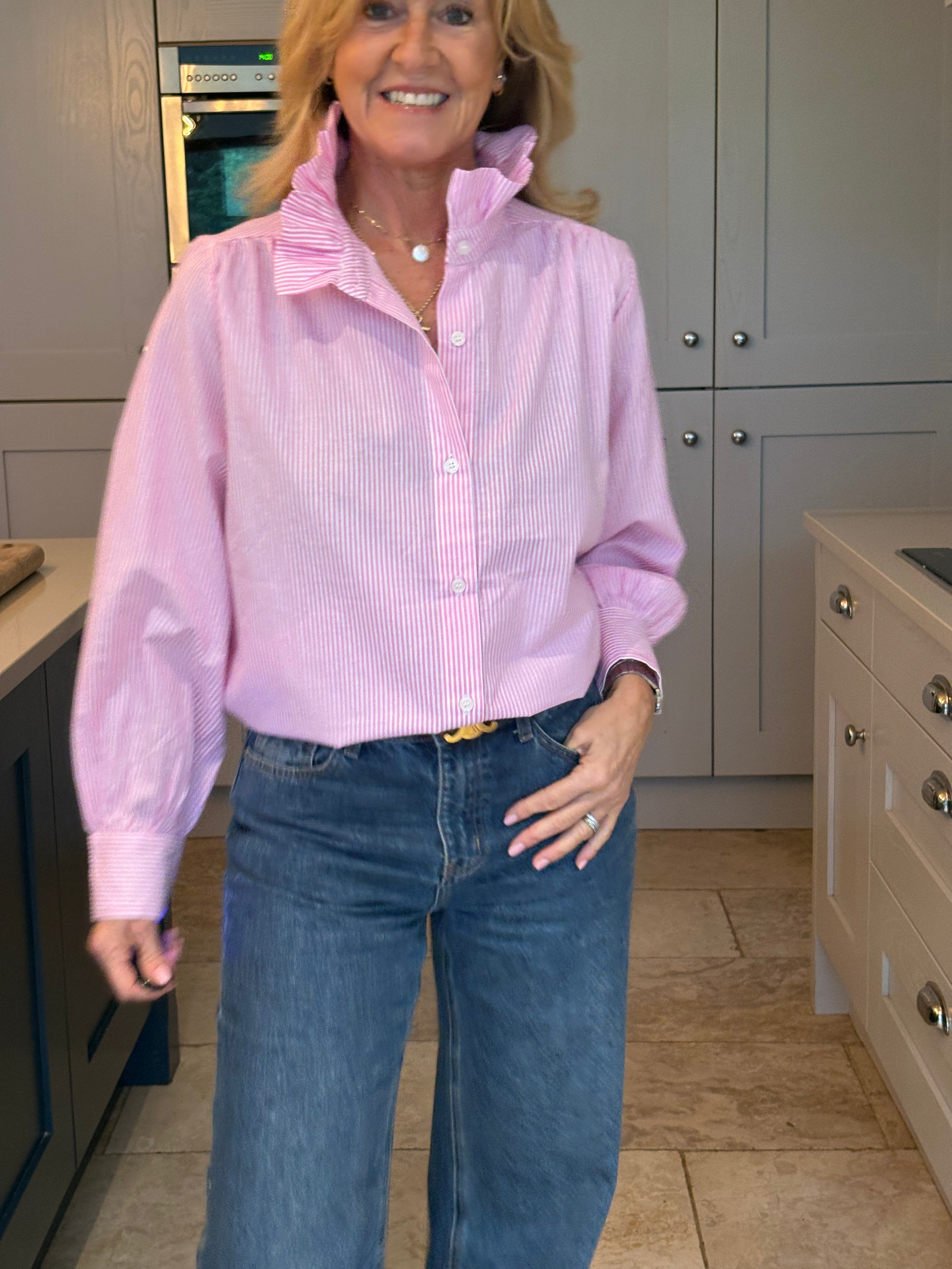 A beautiful oversized pink pin striped cotton blouse with a stand up pleated collar and a classic shirt hemline, slightly longer at the back.  Gently puffed sleeves with a deep double buttoned cuff with horizontal pin stripes. The Elodie is Cotton and comes in 2 sizes, S/M and M/L. This is an oversized fit.