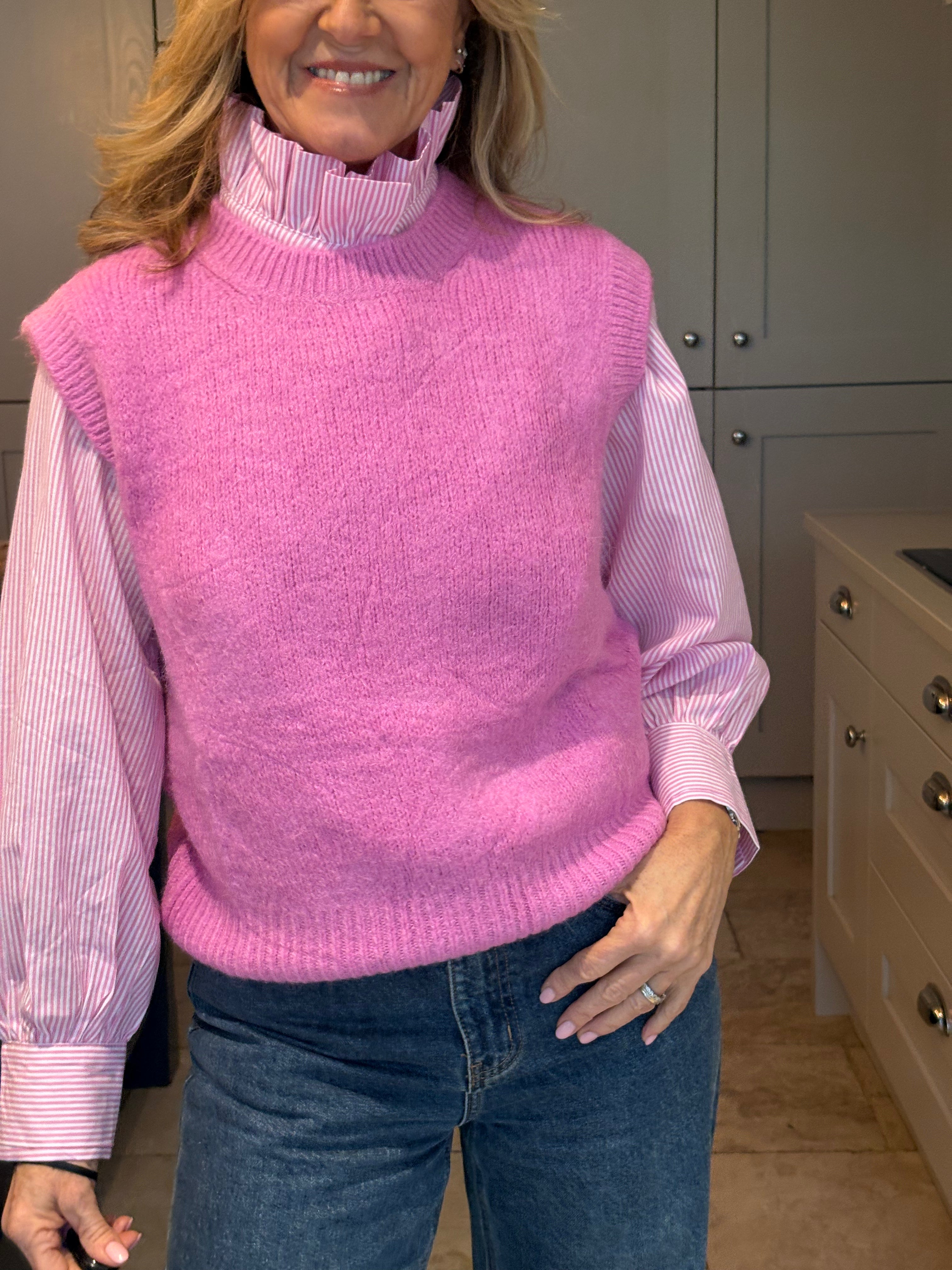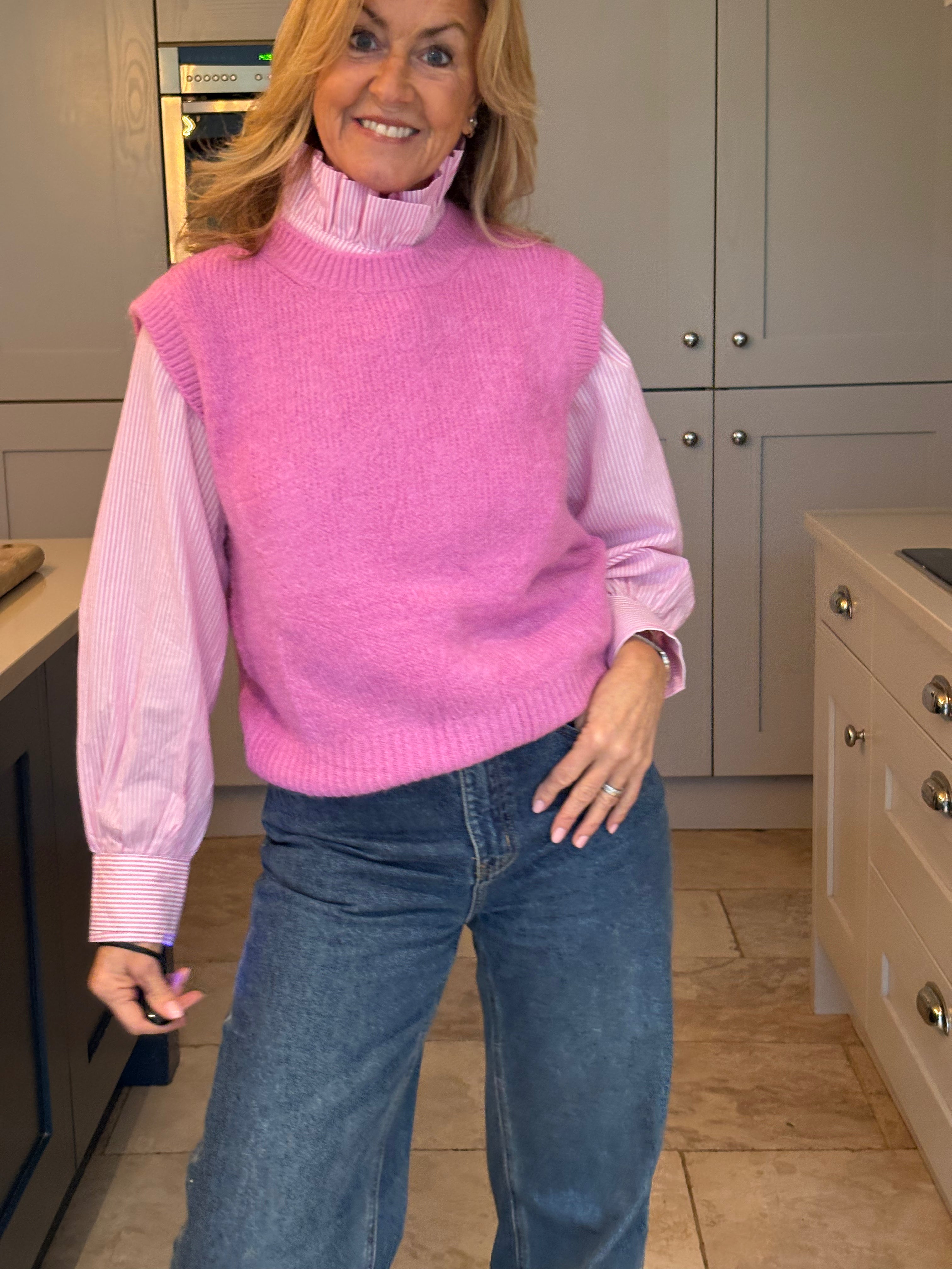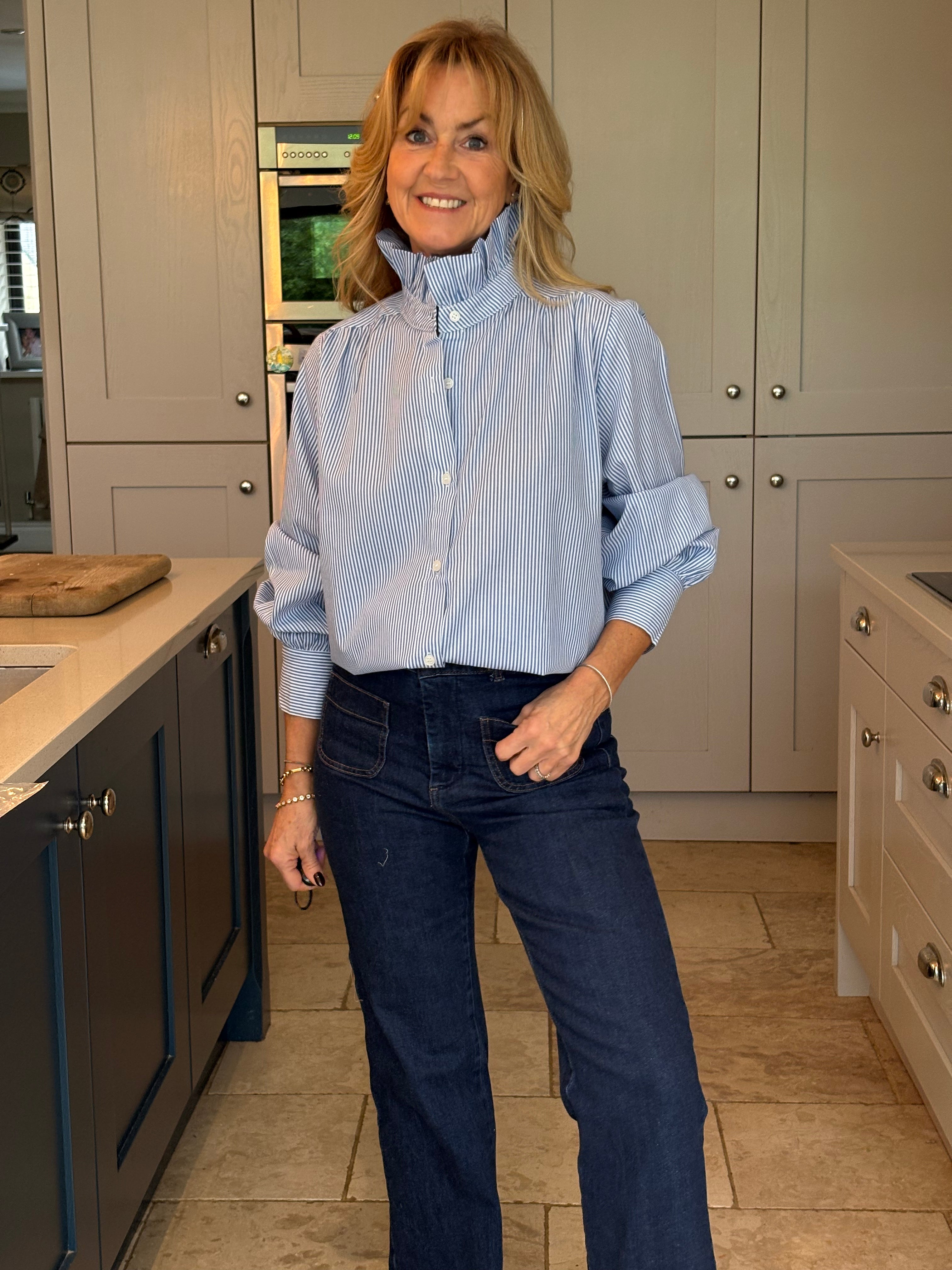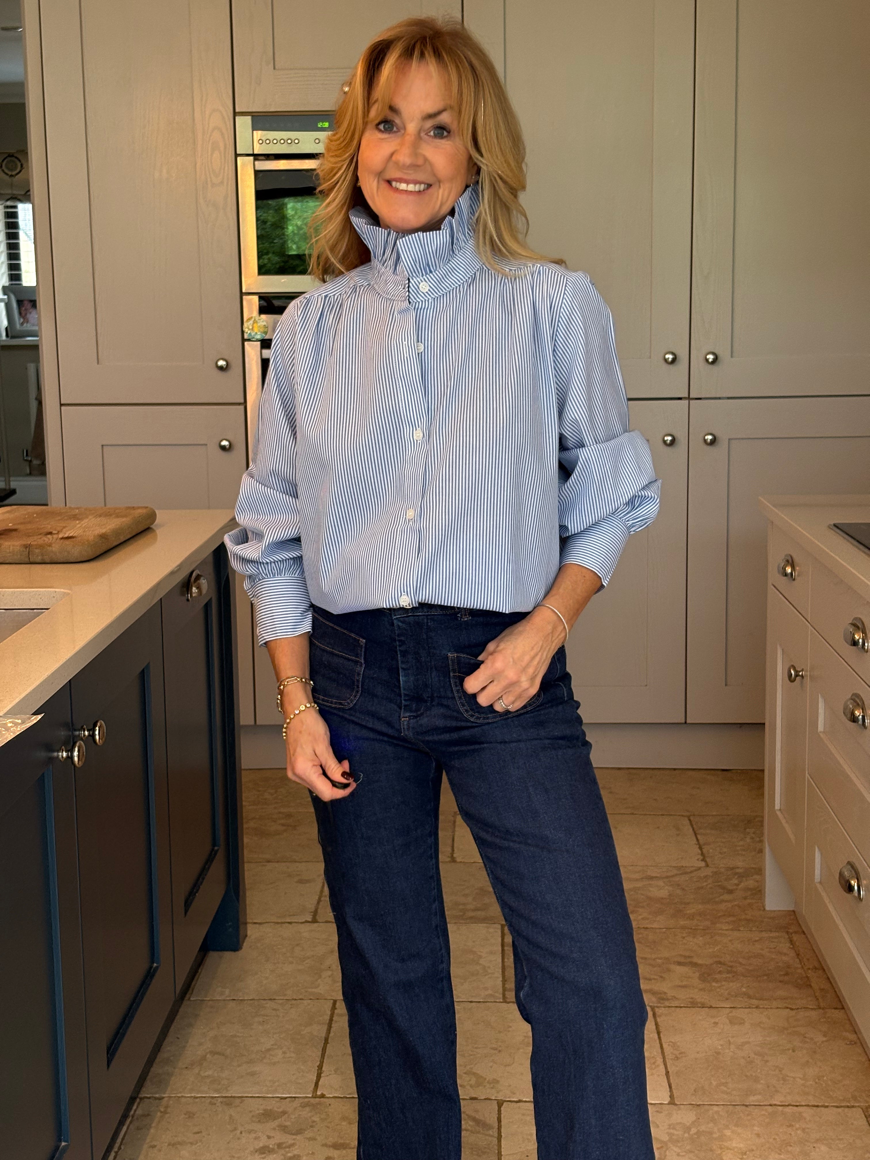 A beautiful oversized pink pin striped cotton blouse with a stand up pleated collar and a classic shirt hemline, slightly longer at the back.  Gently puffed sleeves with a deep double buttoned cuff with horizontal pin stripes. The Elodie is Cotton and comes in 2 sizes, S/M and M/L. This is an oversized fit.