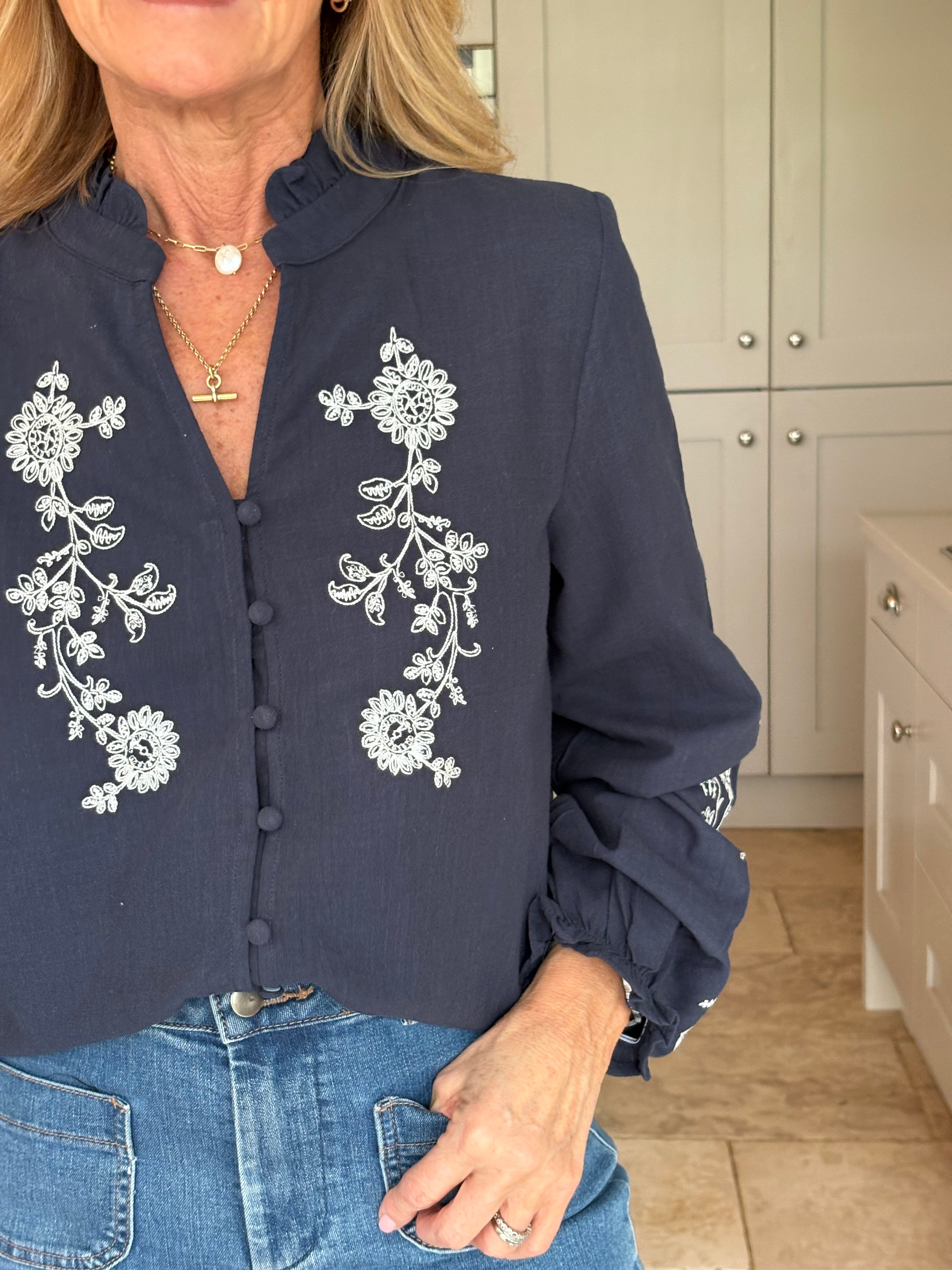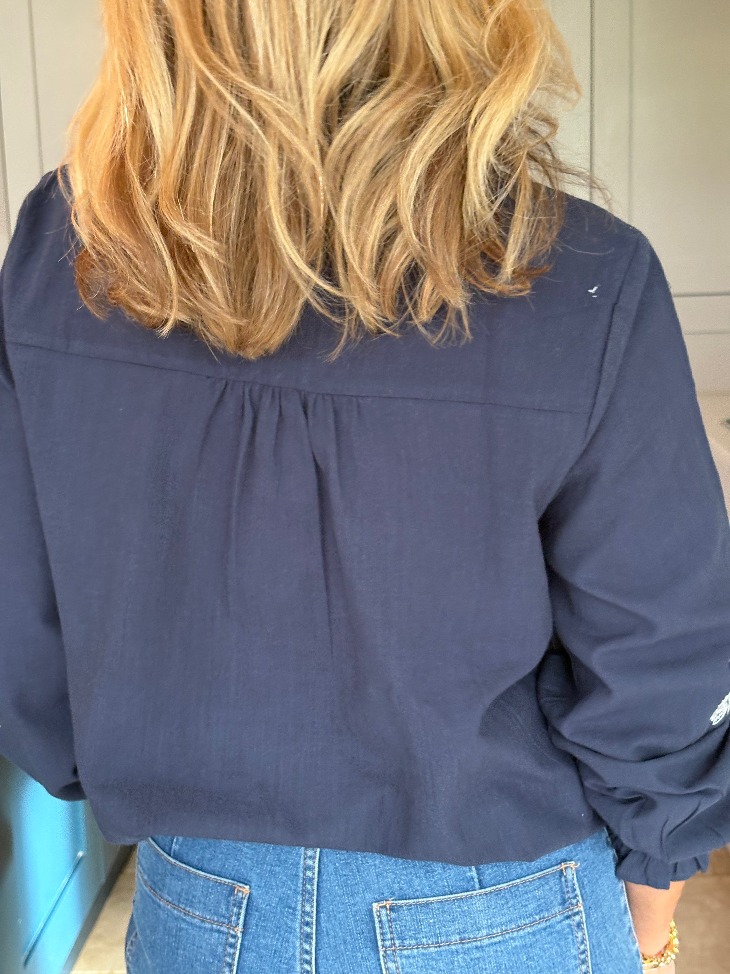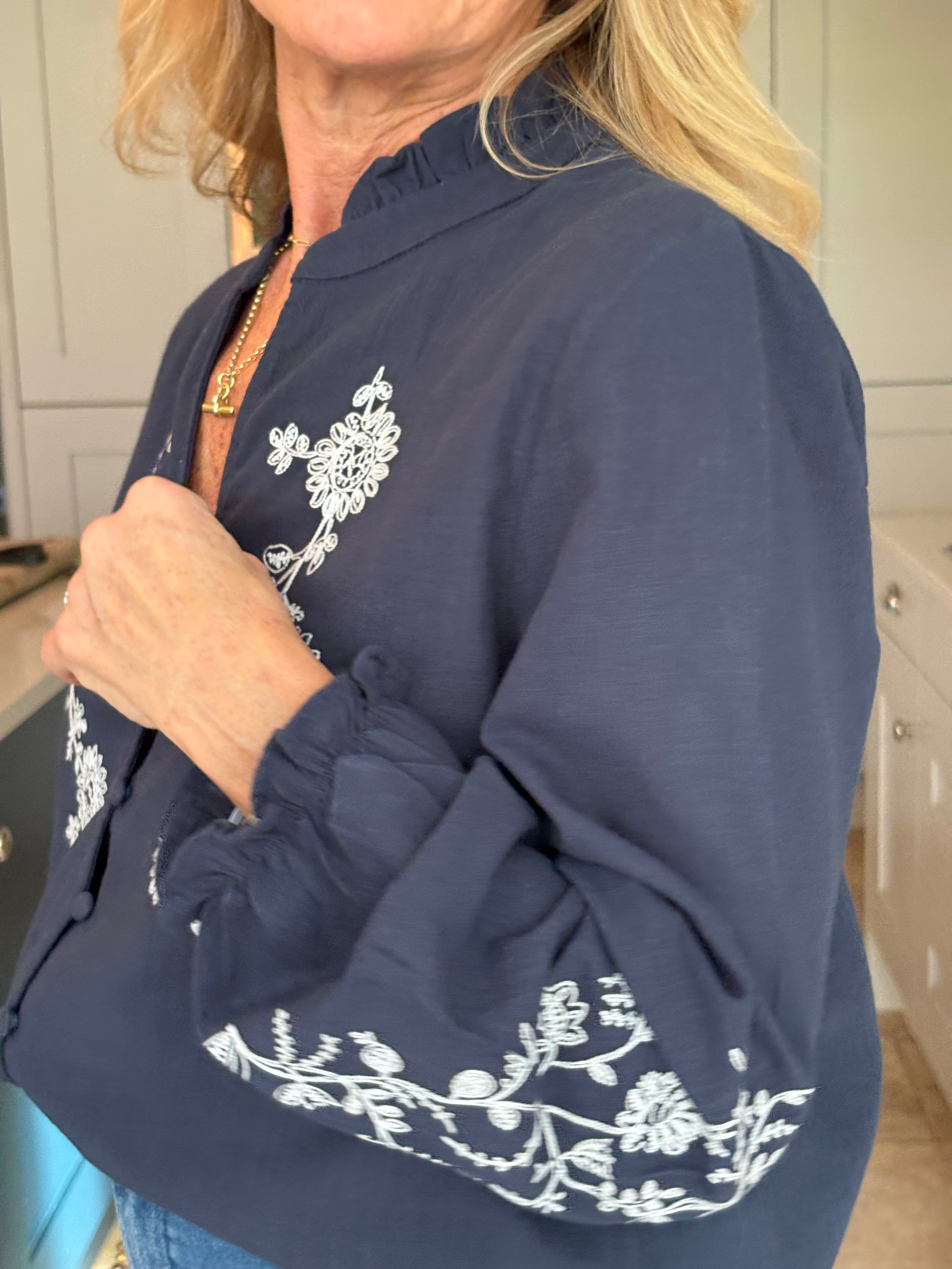 A beautifully crafted navy blue cotton blouse with white embroidery.  The same style as the Bella and the Isla blouse (for those who know my clothing).  A subtle stand up pleated collar and a V neckline.  Buttoned down the front and long, puffed sleeves with an elasticated cuff.  The Erin is a classic fit.  Loose but not oversized.  She comes in 2 sizes, S/M and M/L.