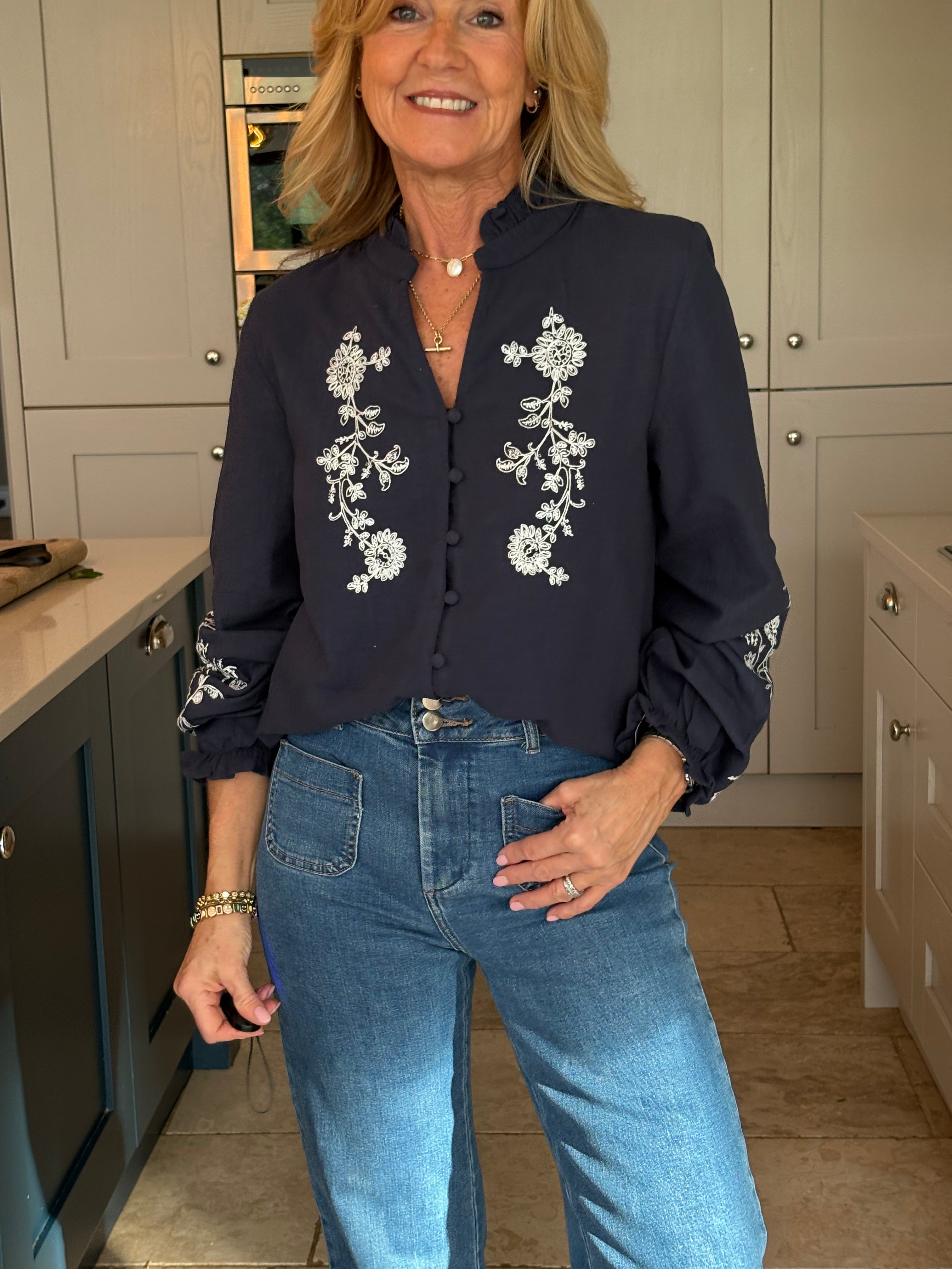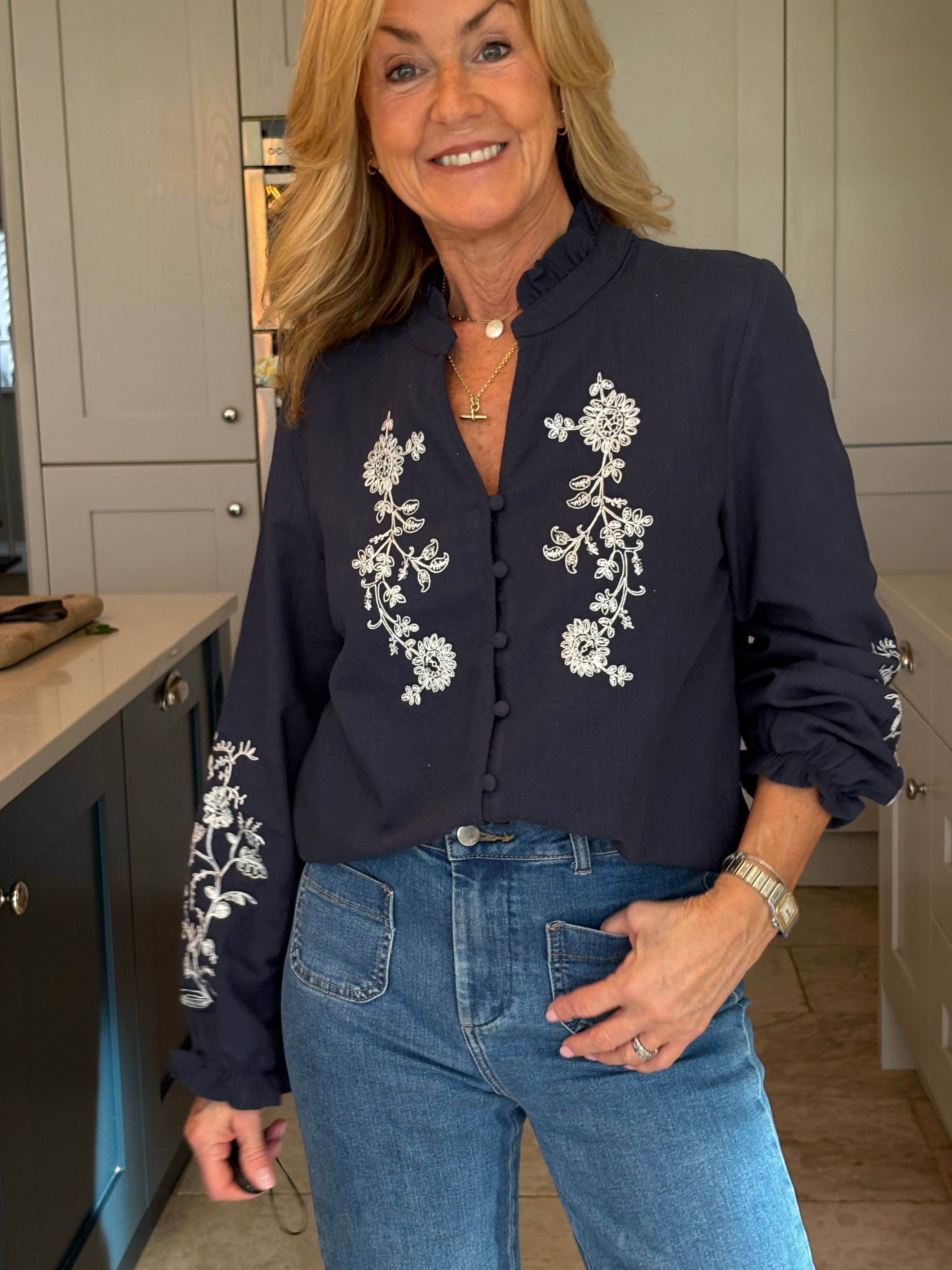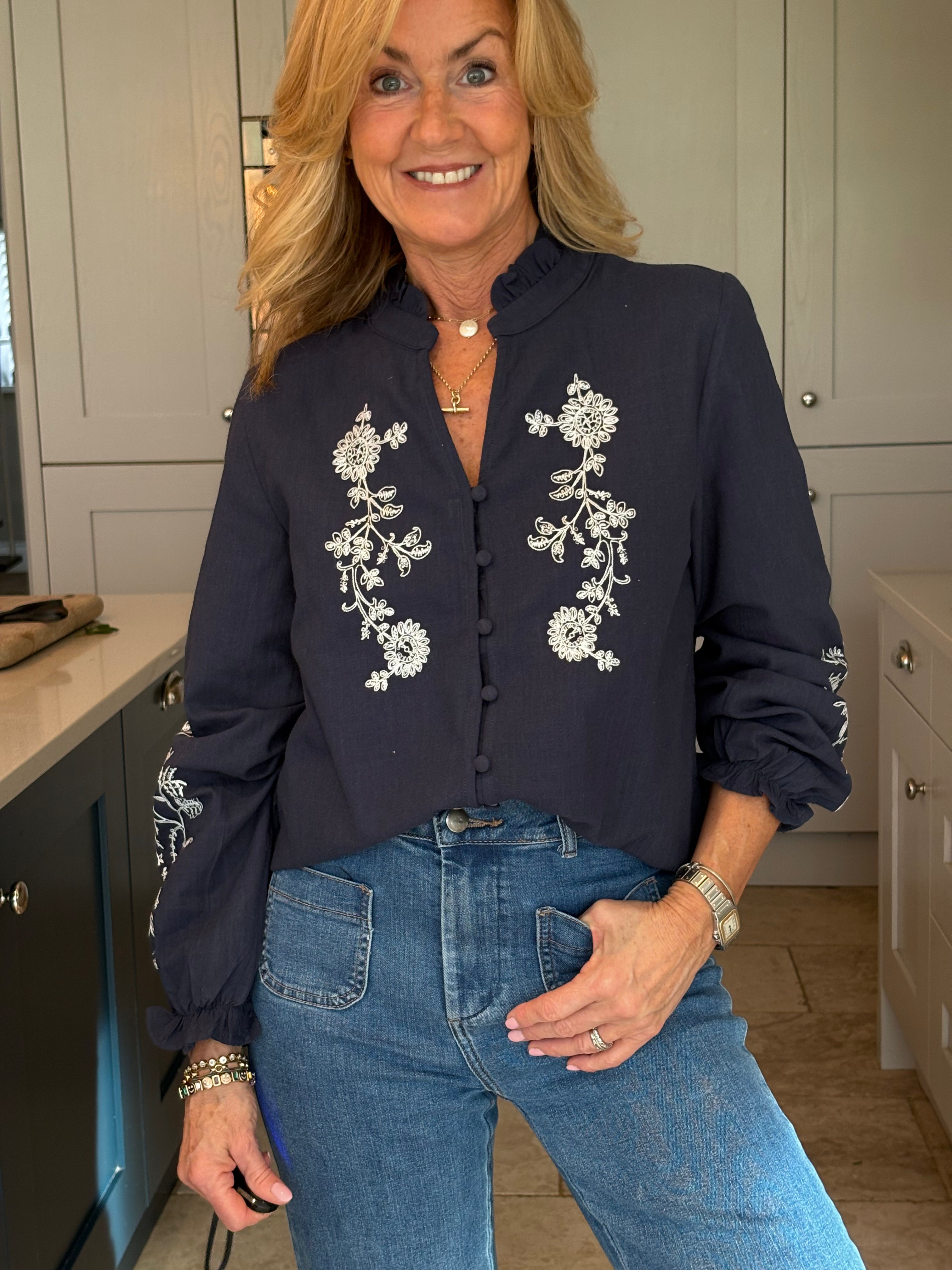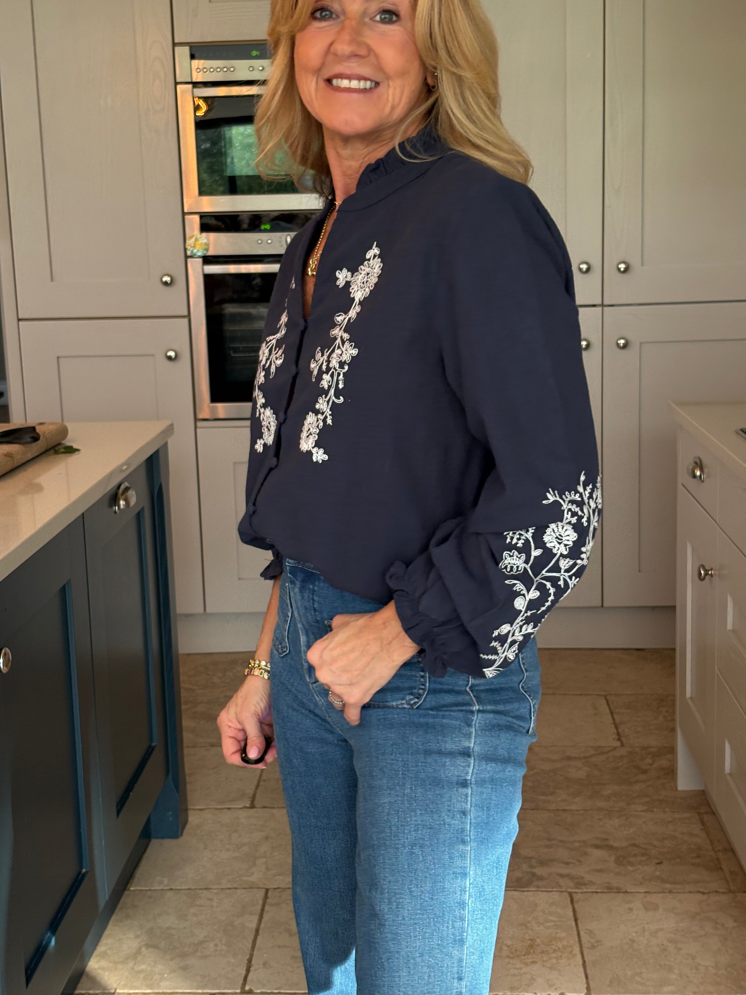 A beautifully crafted navy blue cotton blouse with white embroidery.  The same style as the Bella and the Isla blouse (for those who know my clothing).  A subtle stand up pleated collar and a V neckline.  Buttoned down the front and long, puffed sleeves with an elasticated cuff.  The Erin is a classic fit.  Loose but not oversized.  She comes in 2 sizes, S/M and M/L.