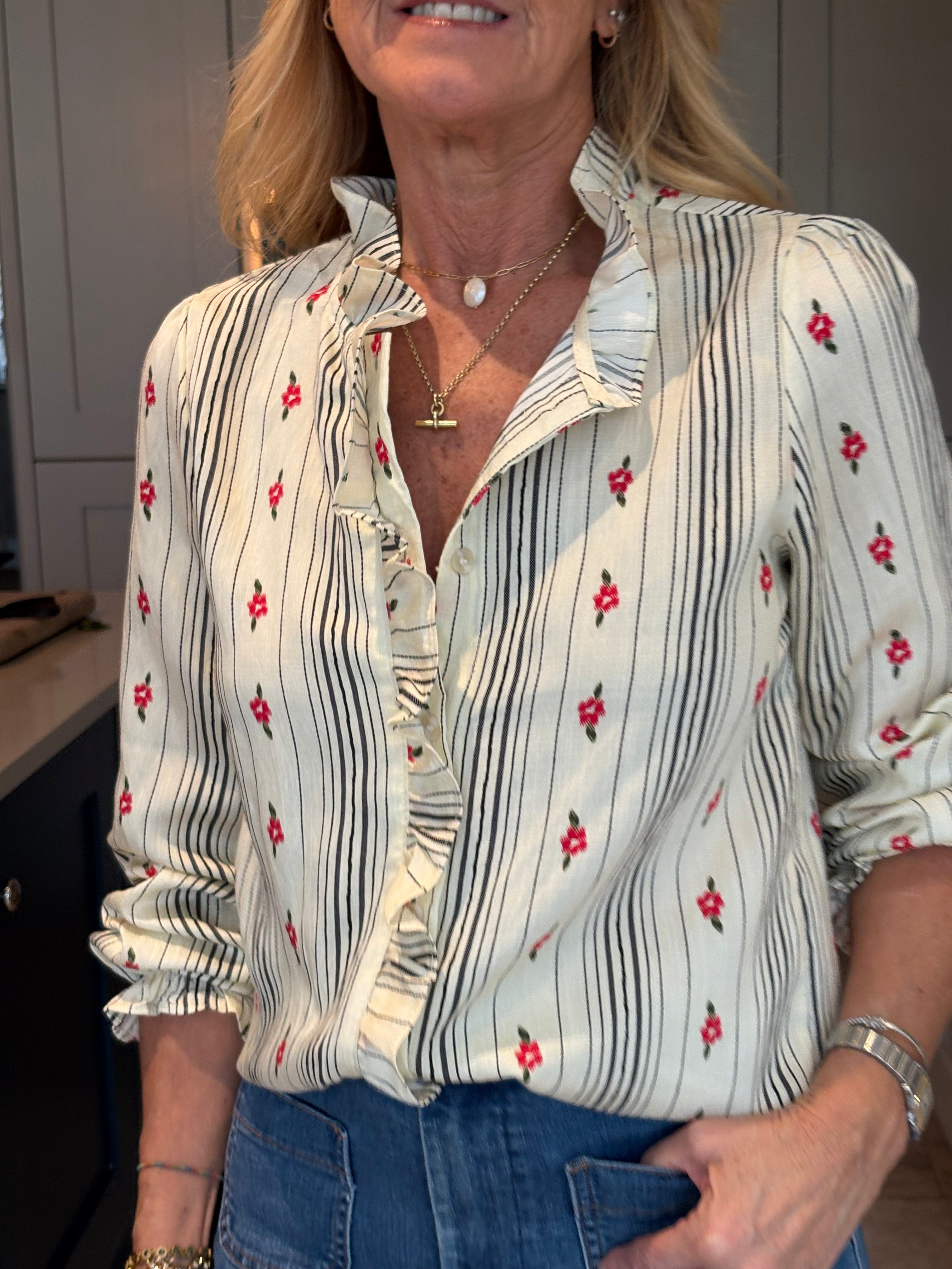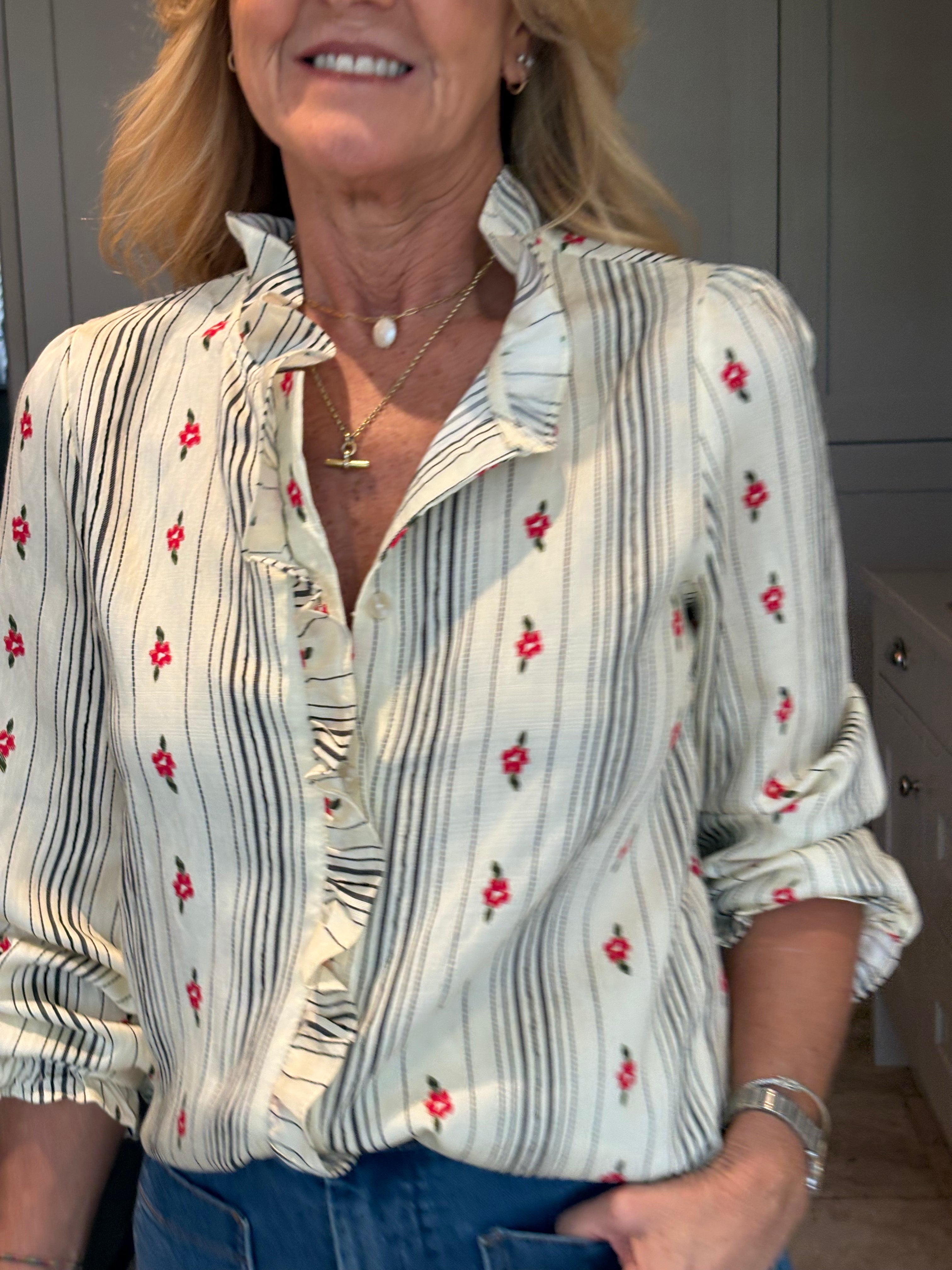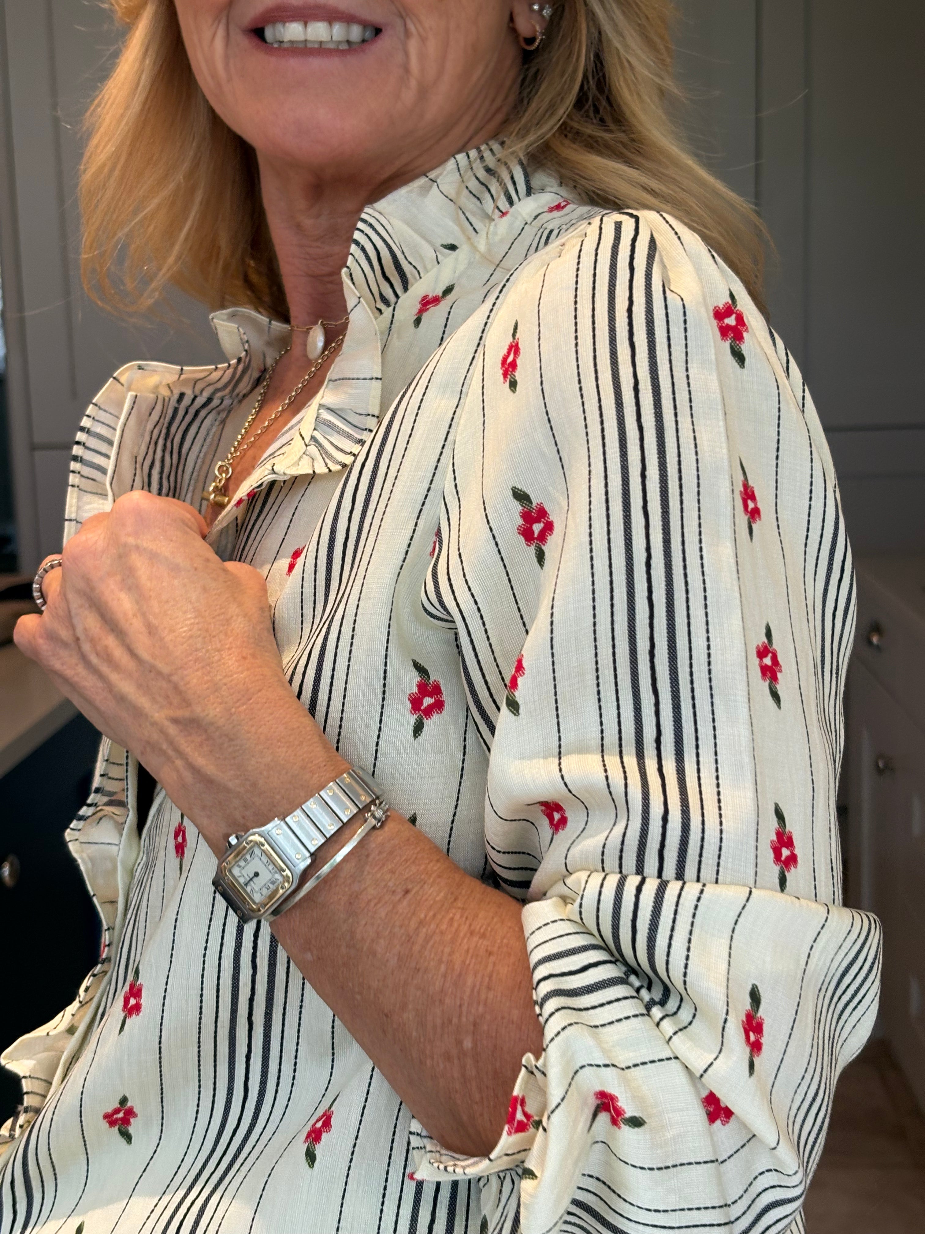 A beautifully soft and fluid viscose blouse with a ruffle collar extending all the way down the front closure. Puffed shoulders and gently pyffed sleeves finishing with an elasticated frill cuff. The Erin has charcoal grey/black stripes and a deep red rose with green leaves stamped throughout the blouse.