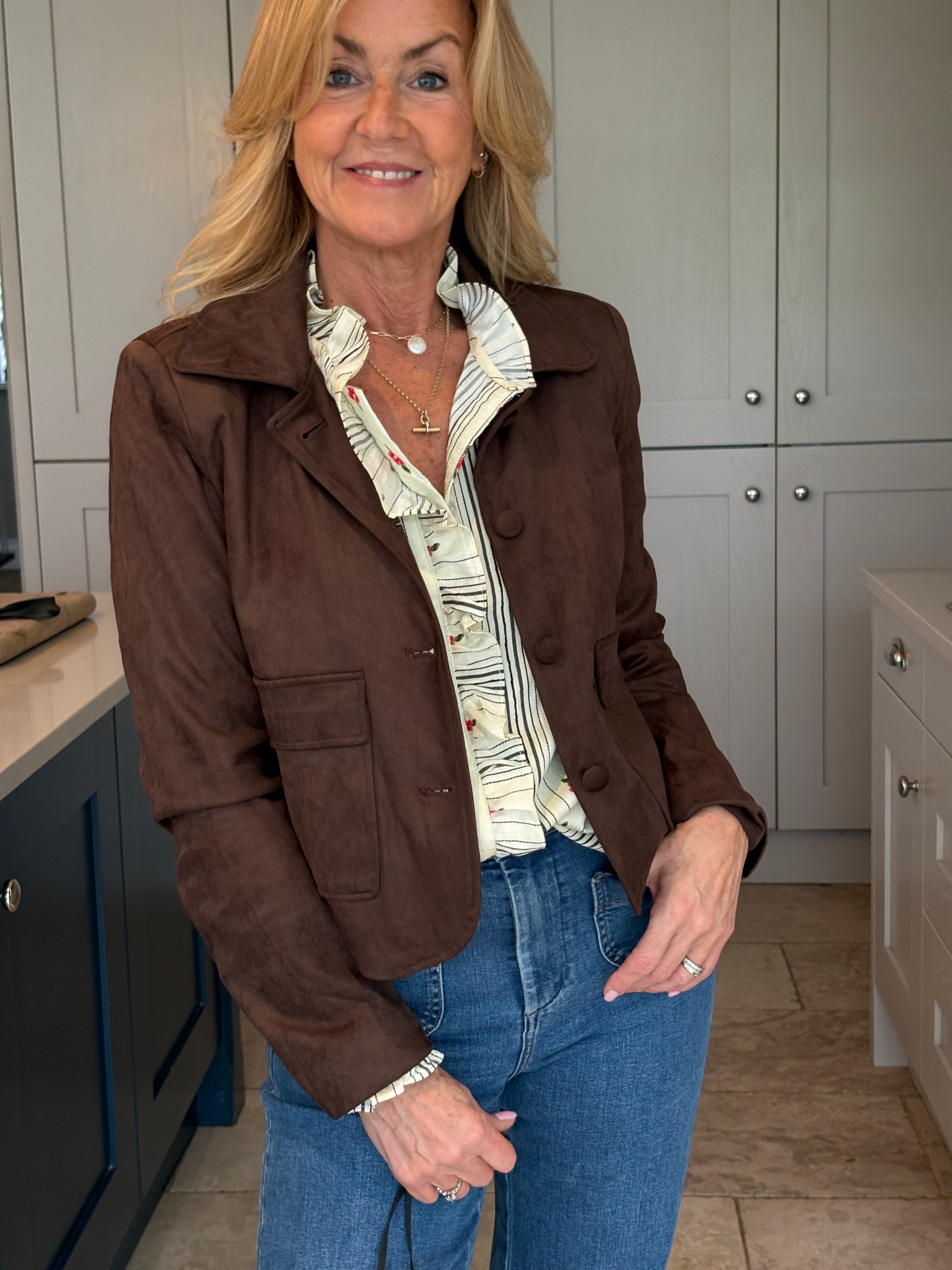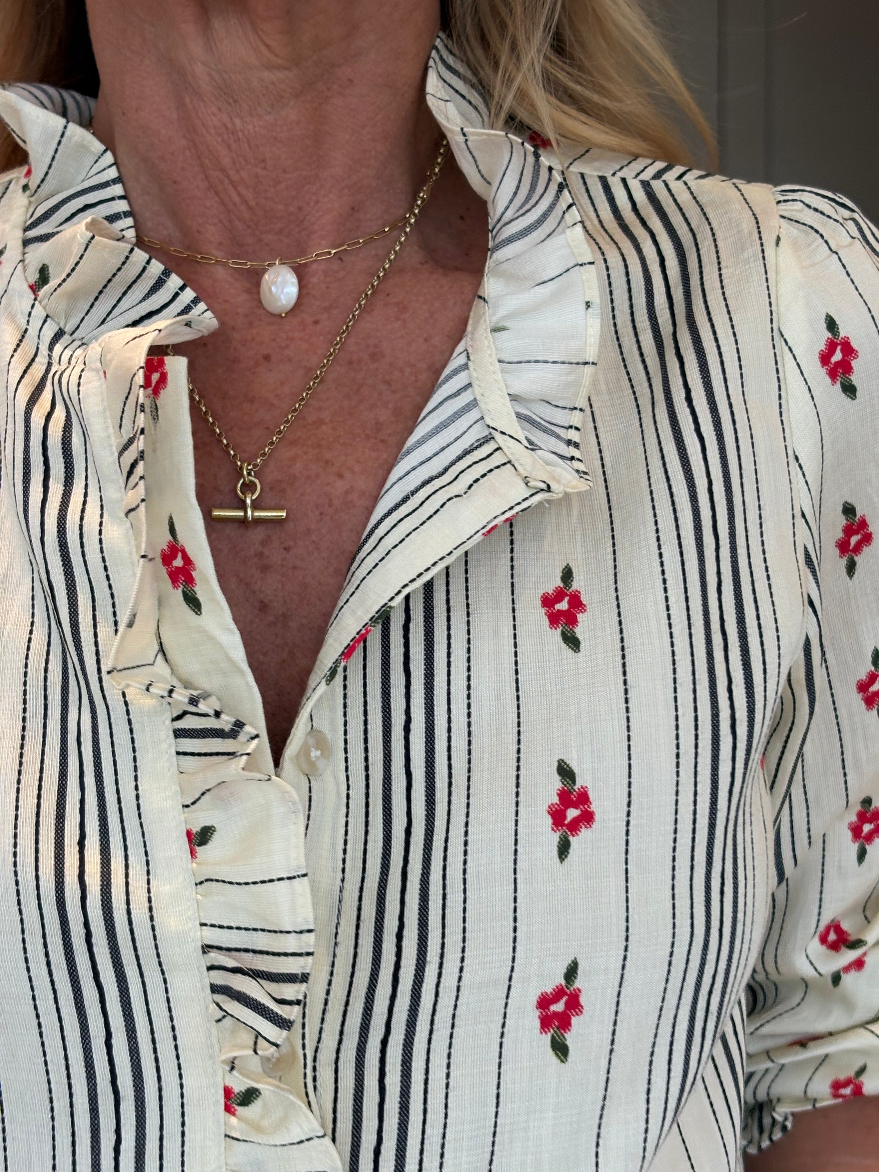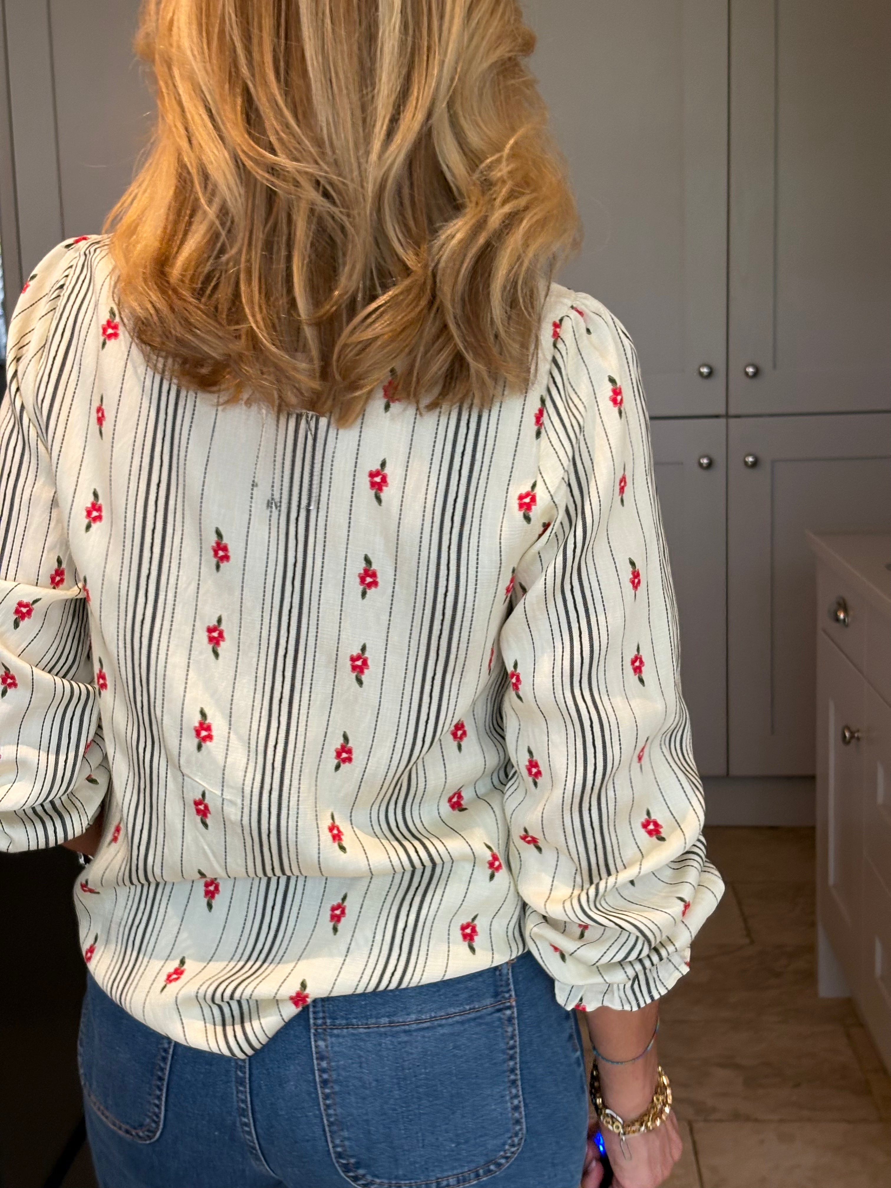 A beautifully soft and fluid viscose blouse with a ruffle collar extending all the way down the front closure. Puffed shoulders and gently pyffed sleeves finishing with an elasticated frill cuff. The Erin has charcoal grey/black stripes and a deep red rose with green leaves stamped throughout the blouse.