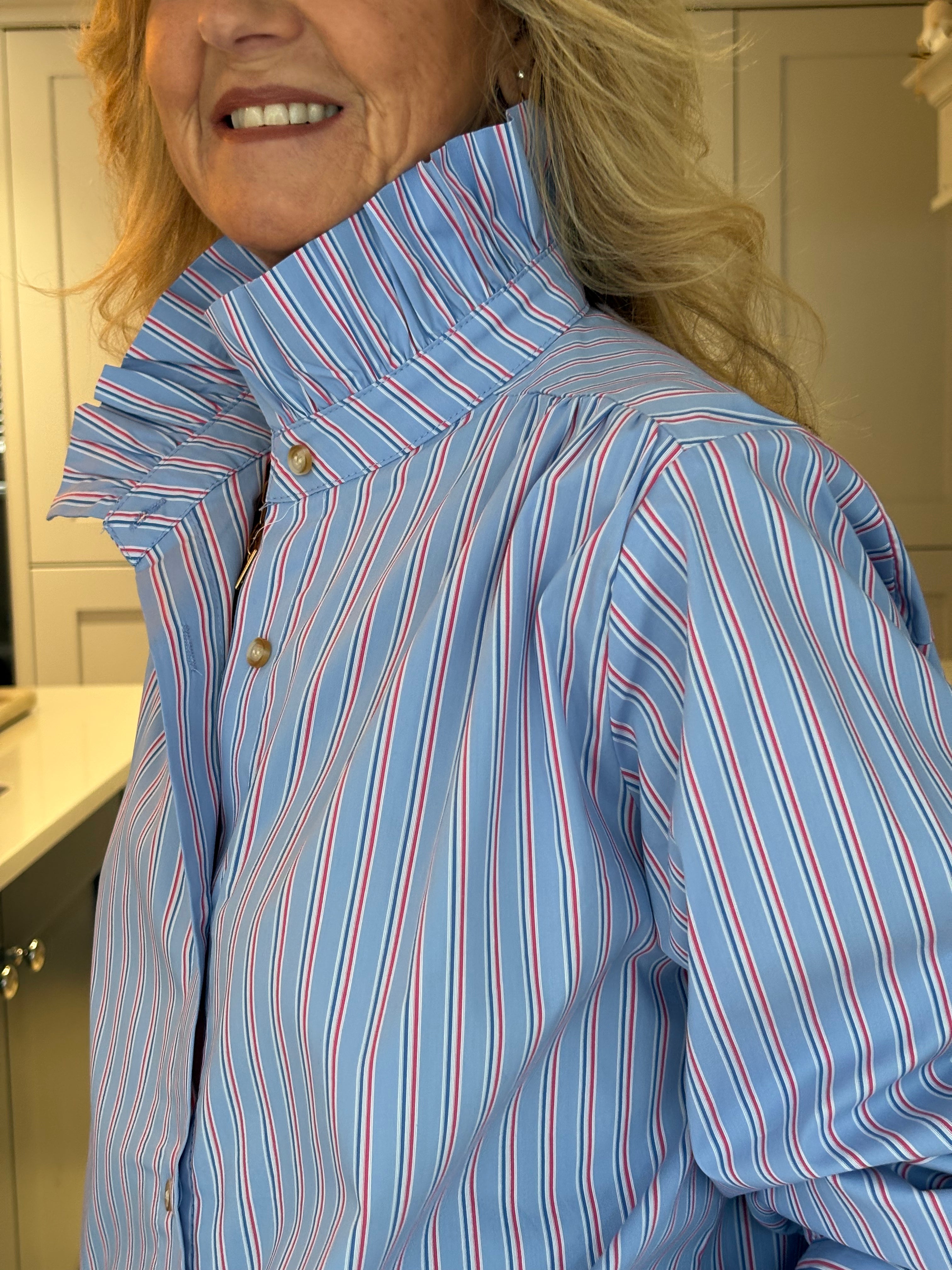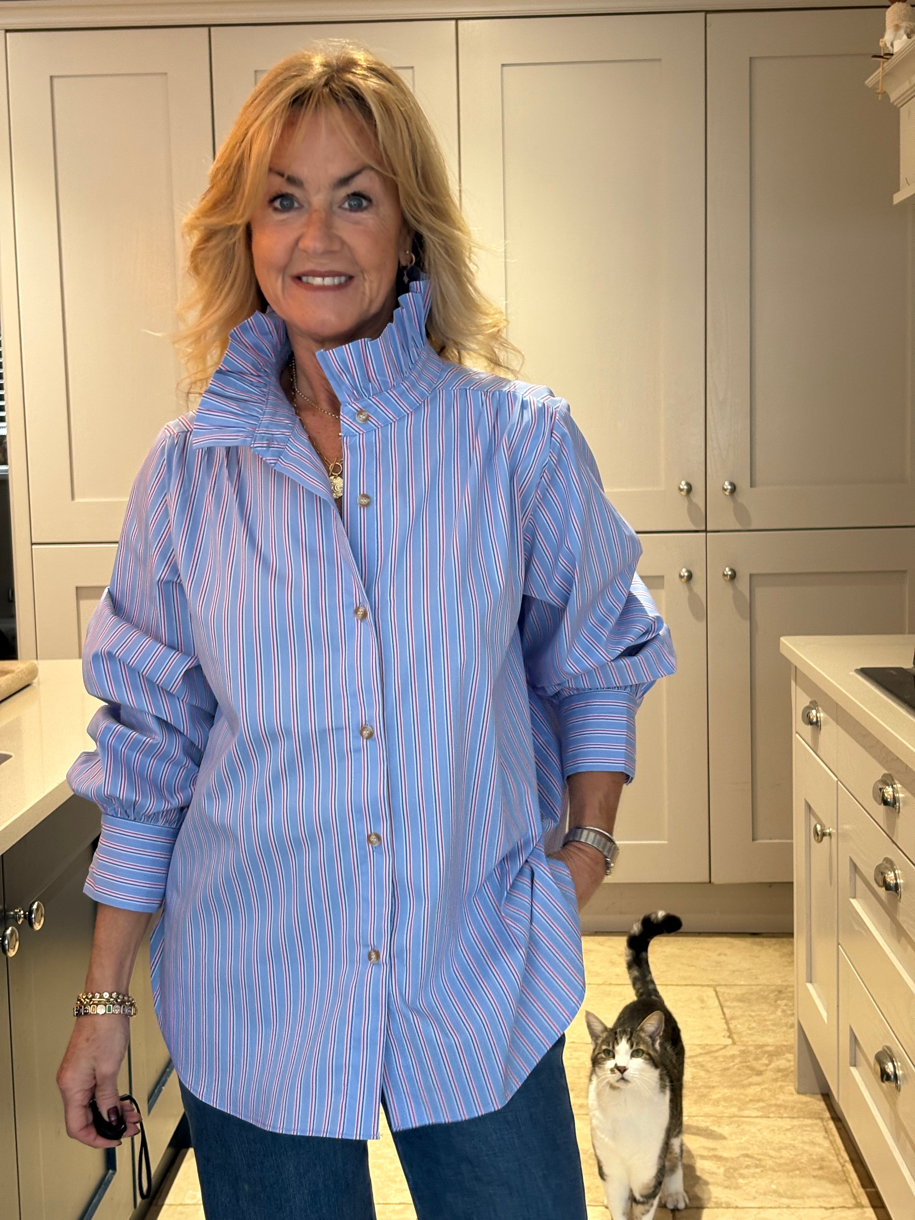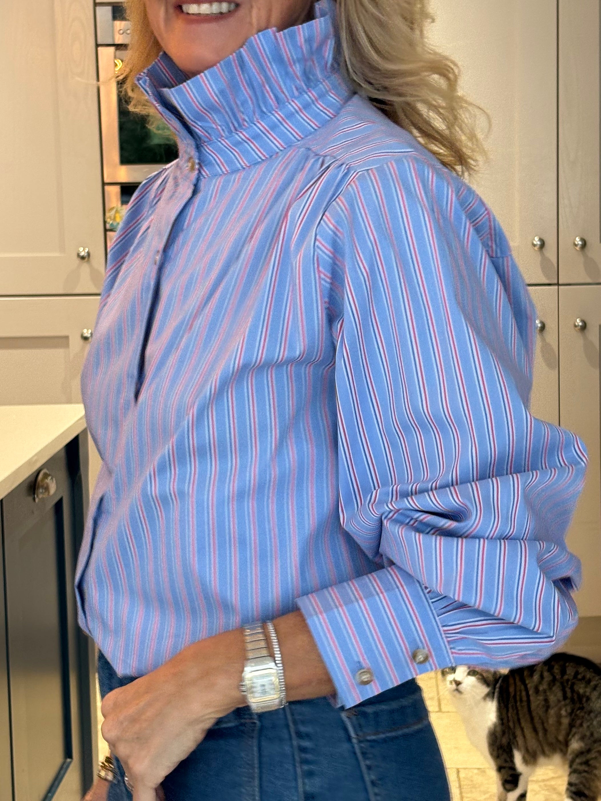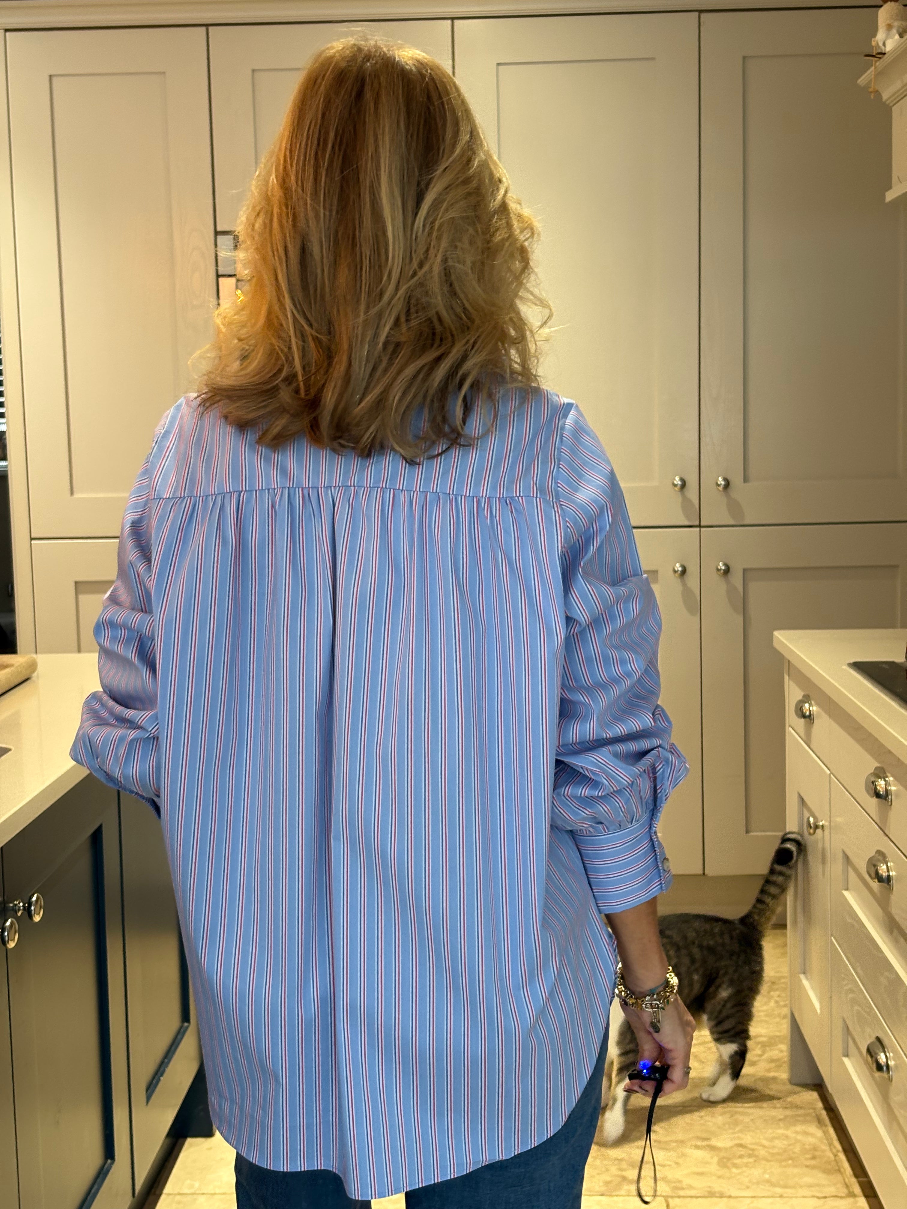 The Lara blouse comes in two colours. Blue with a pink, navy and white stripe throughout and pink with a royal blue, yellow and white stripe.