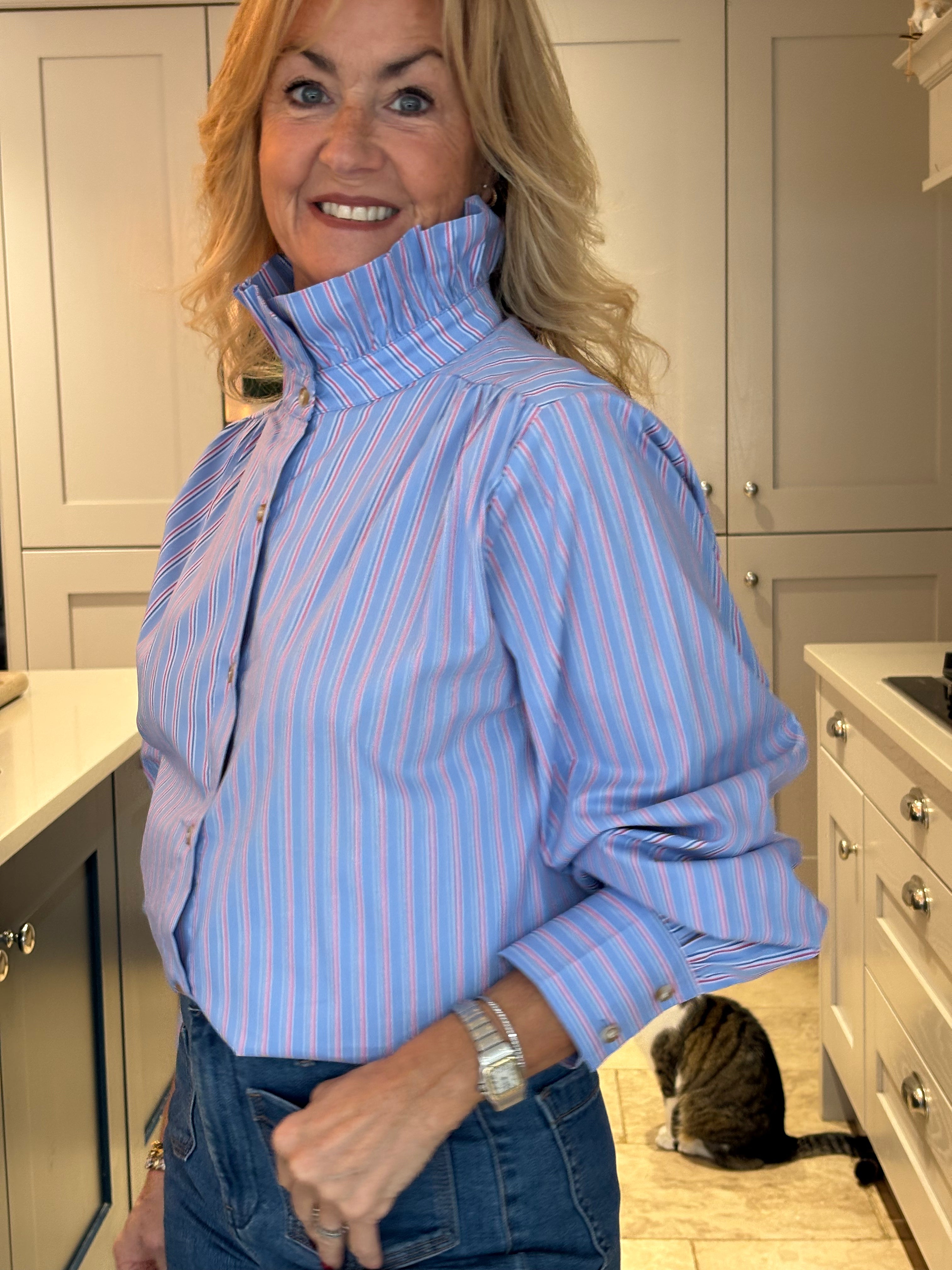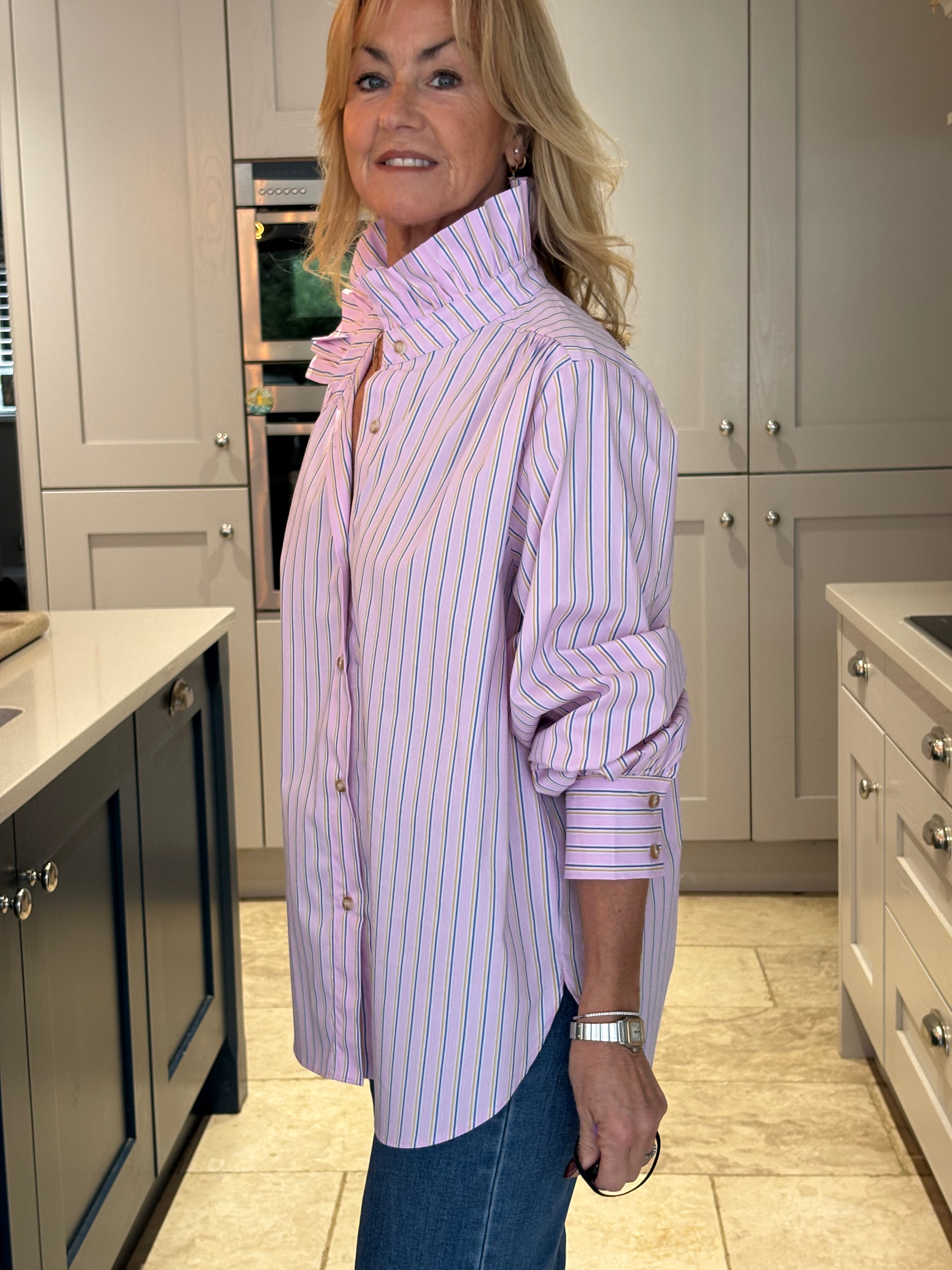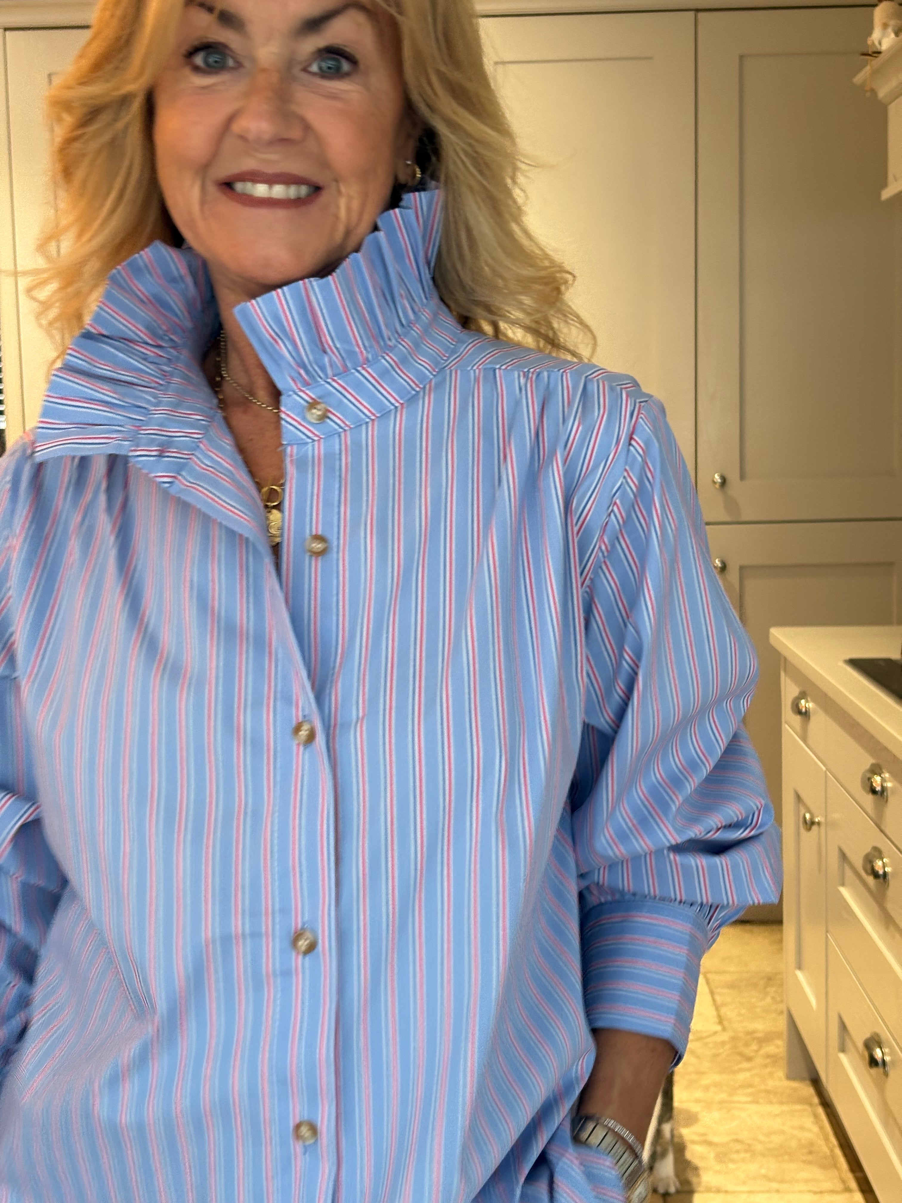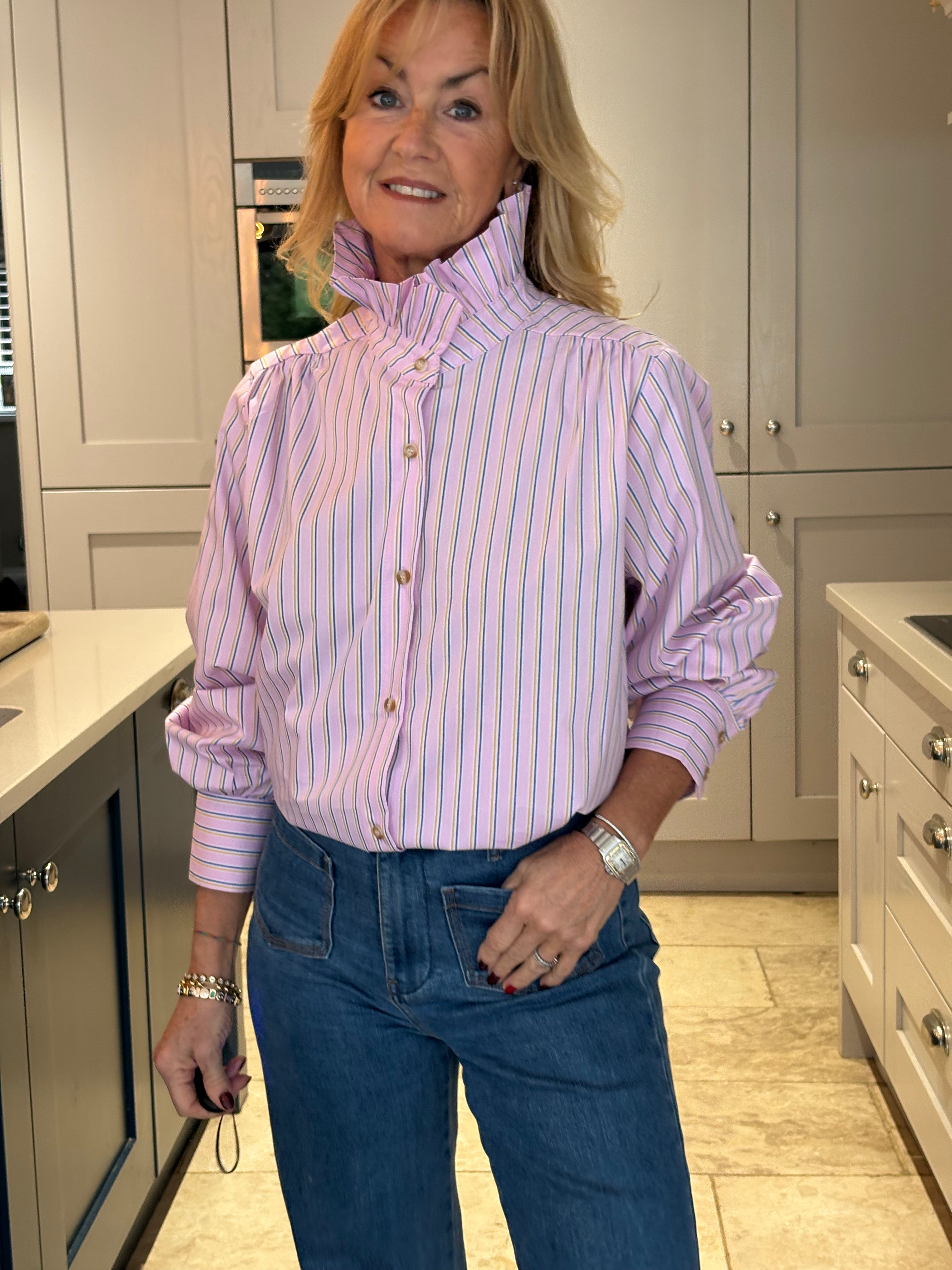 The Lara blouse comes in two colours. Blue with a pink, navy and white stripe throughout and pink with a royal blue, yellow and white stripe.