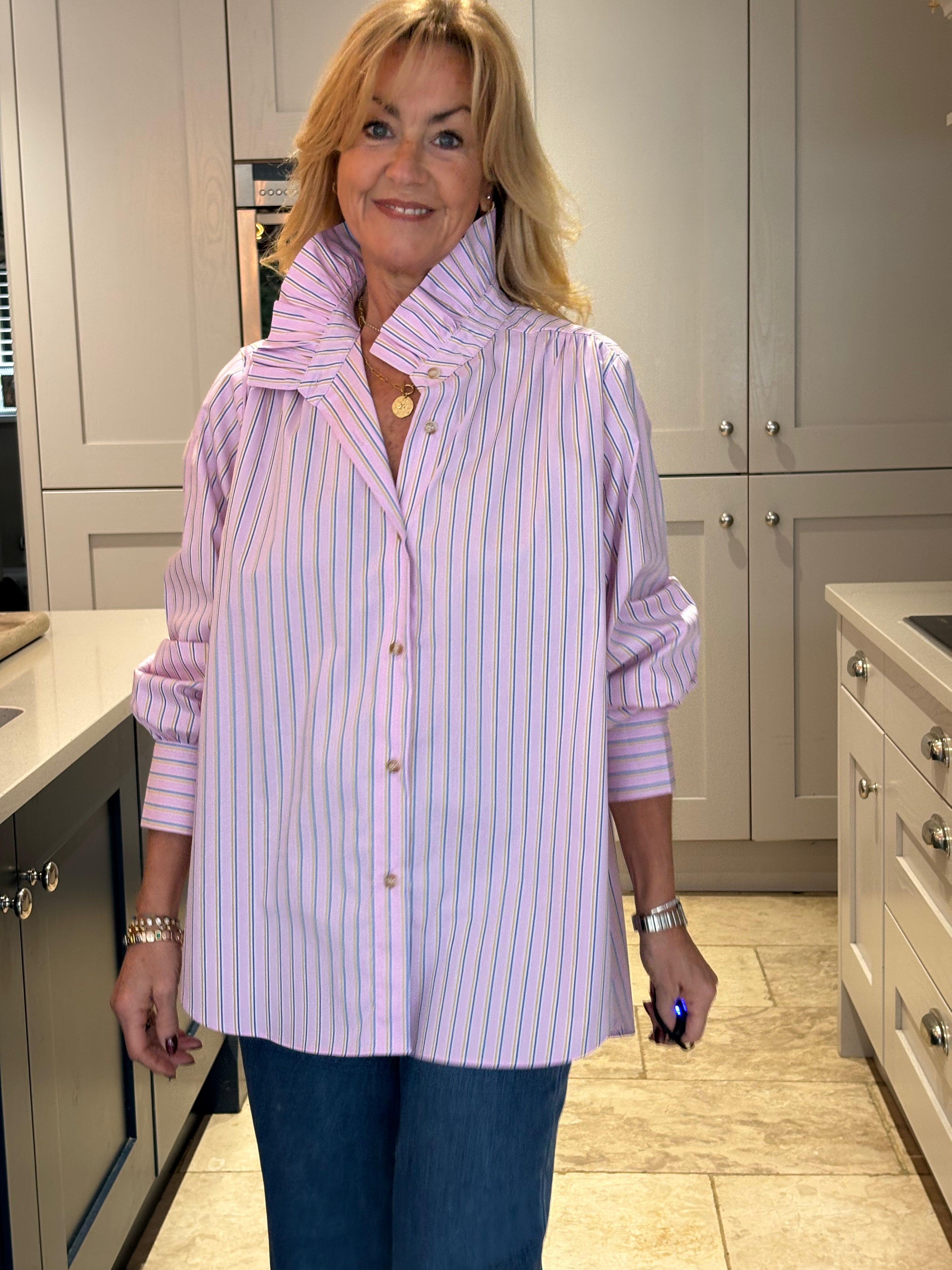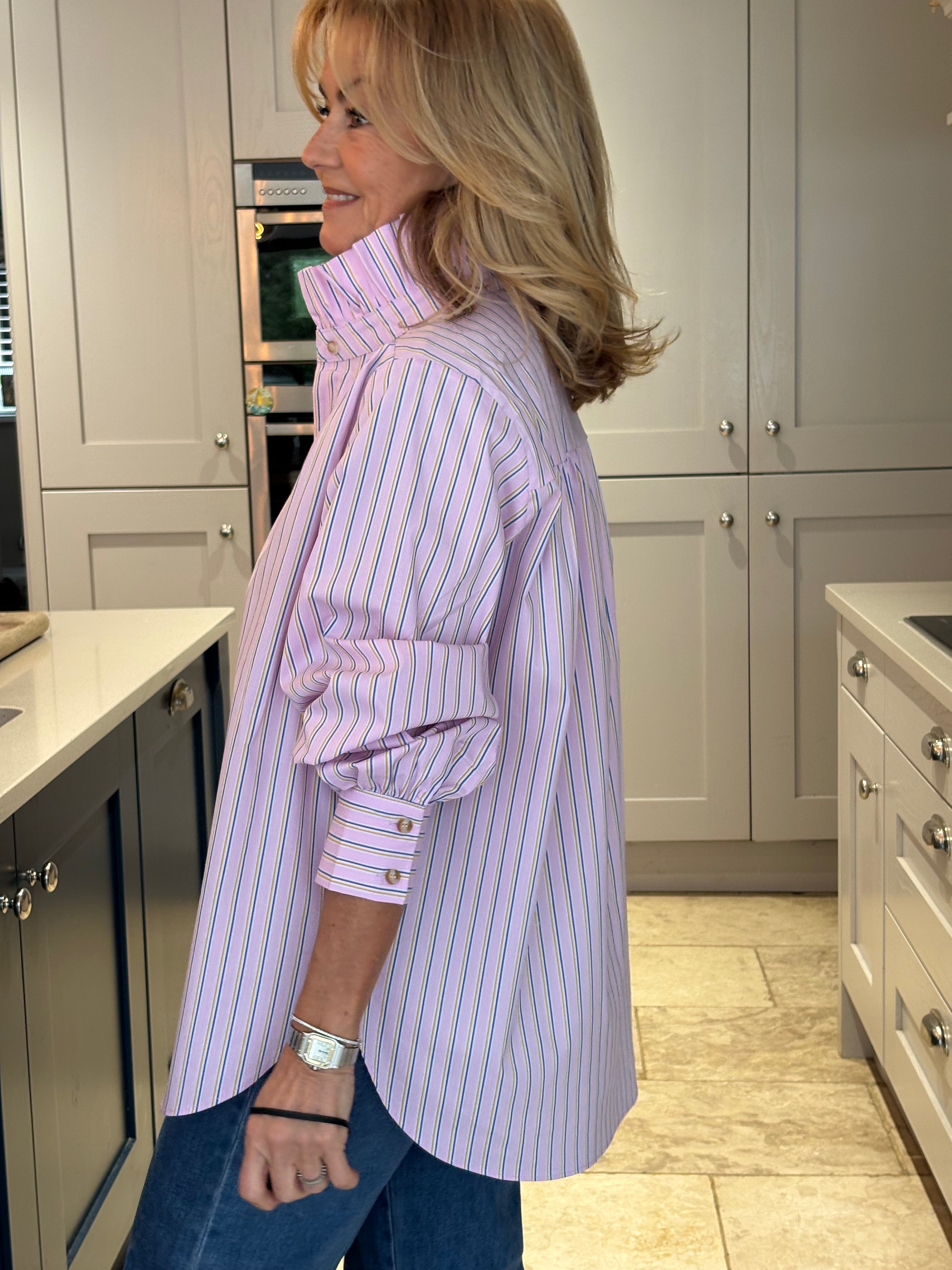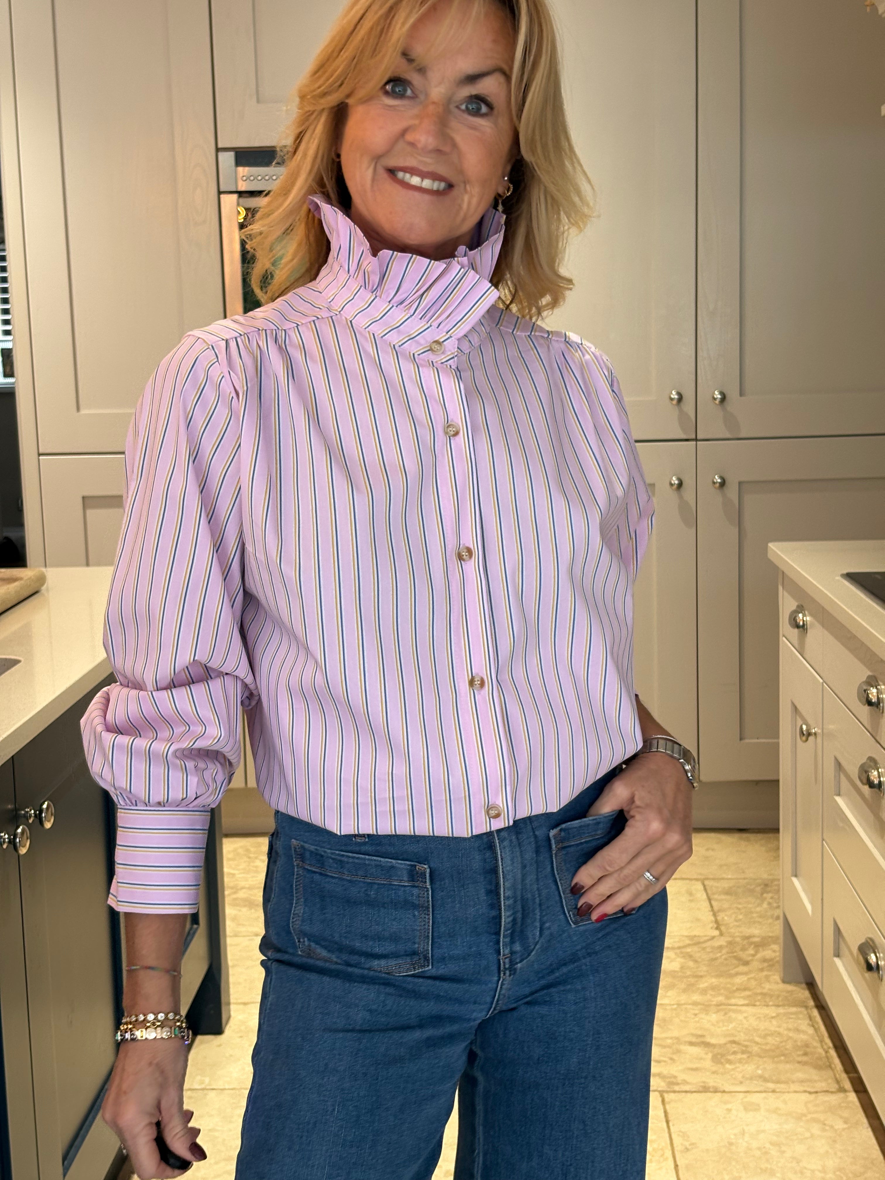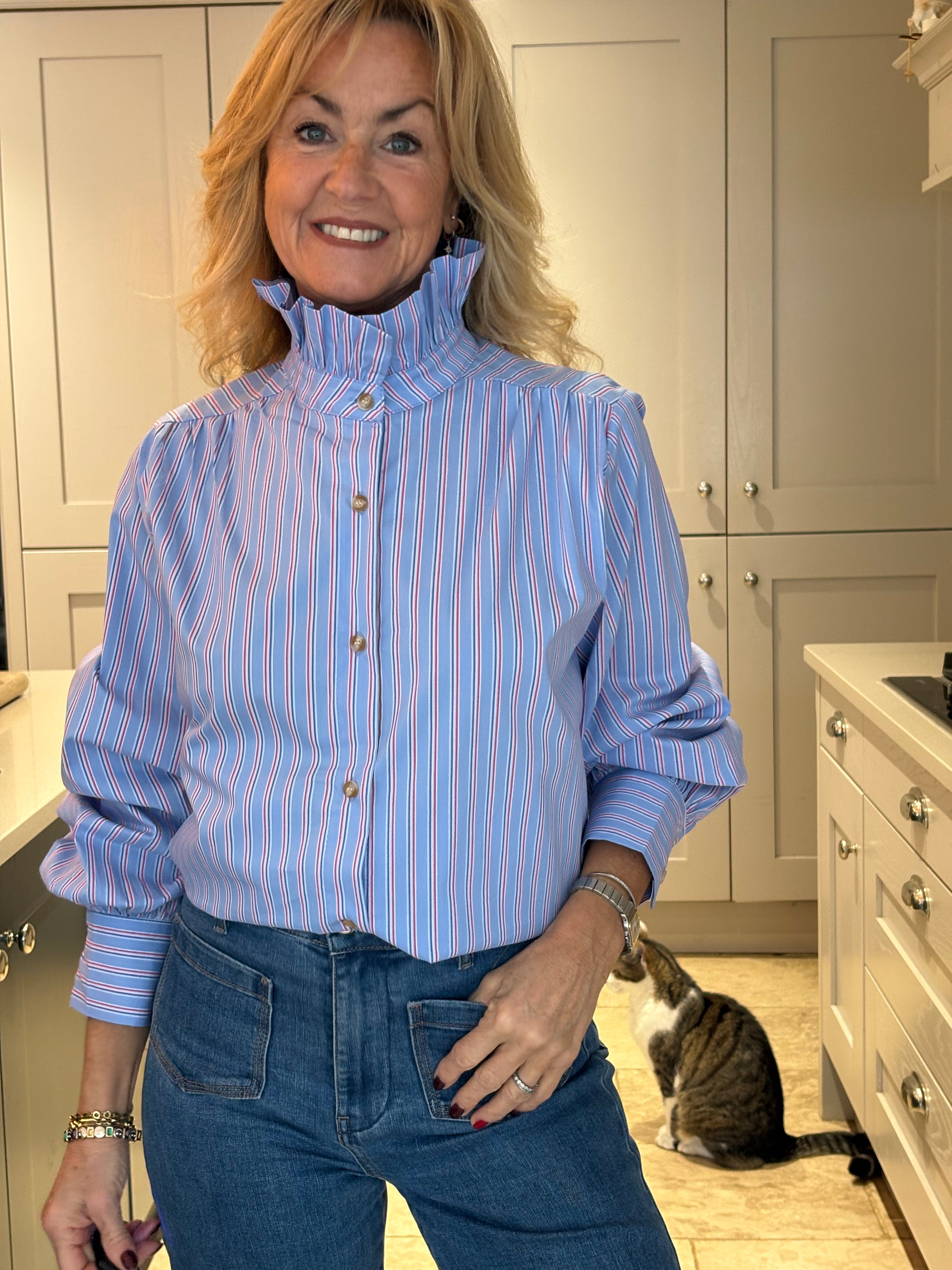 The Lara blouse comes in two colours. Blue with a pink, navy and white stripe throughout and pink with a royal blue, yellow and white stripe.