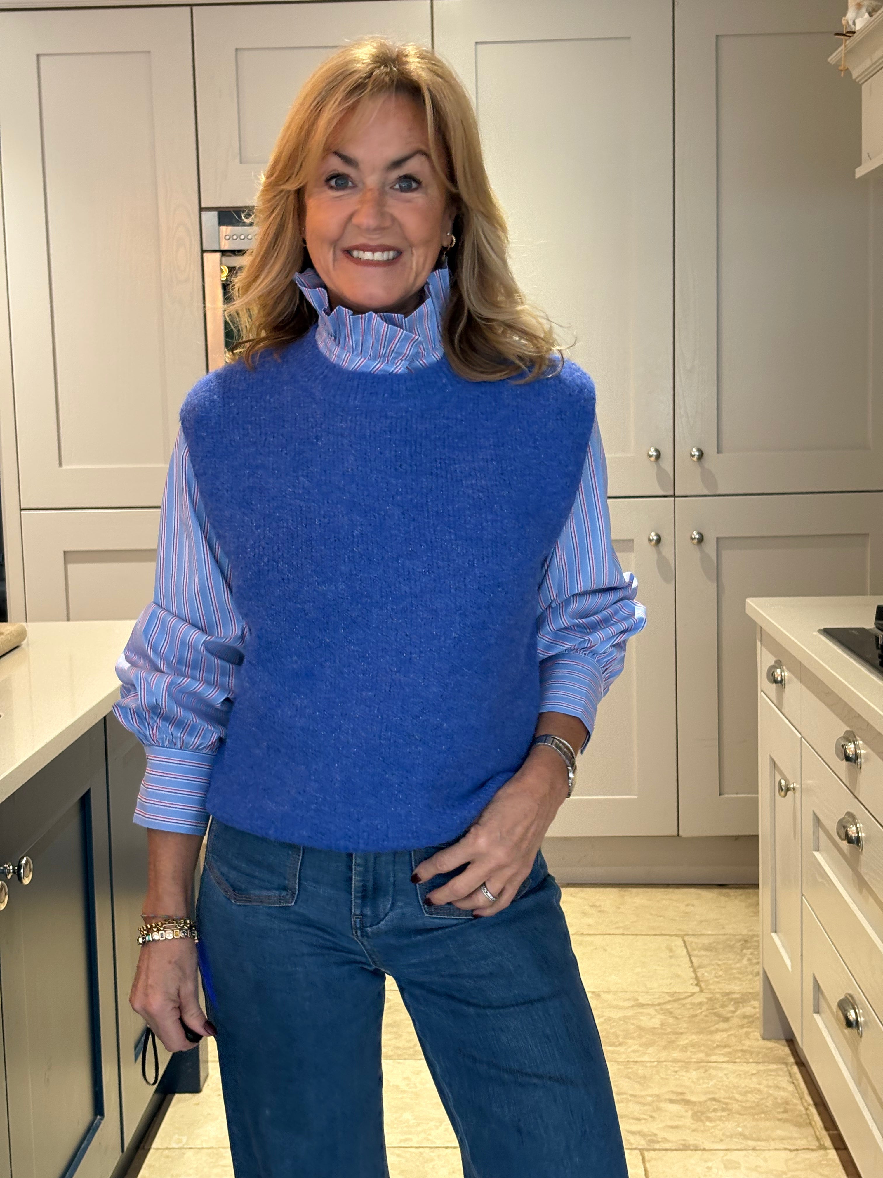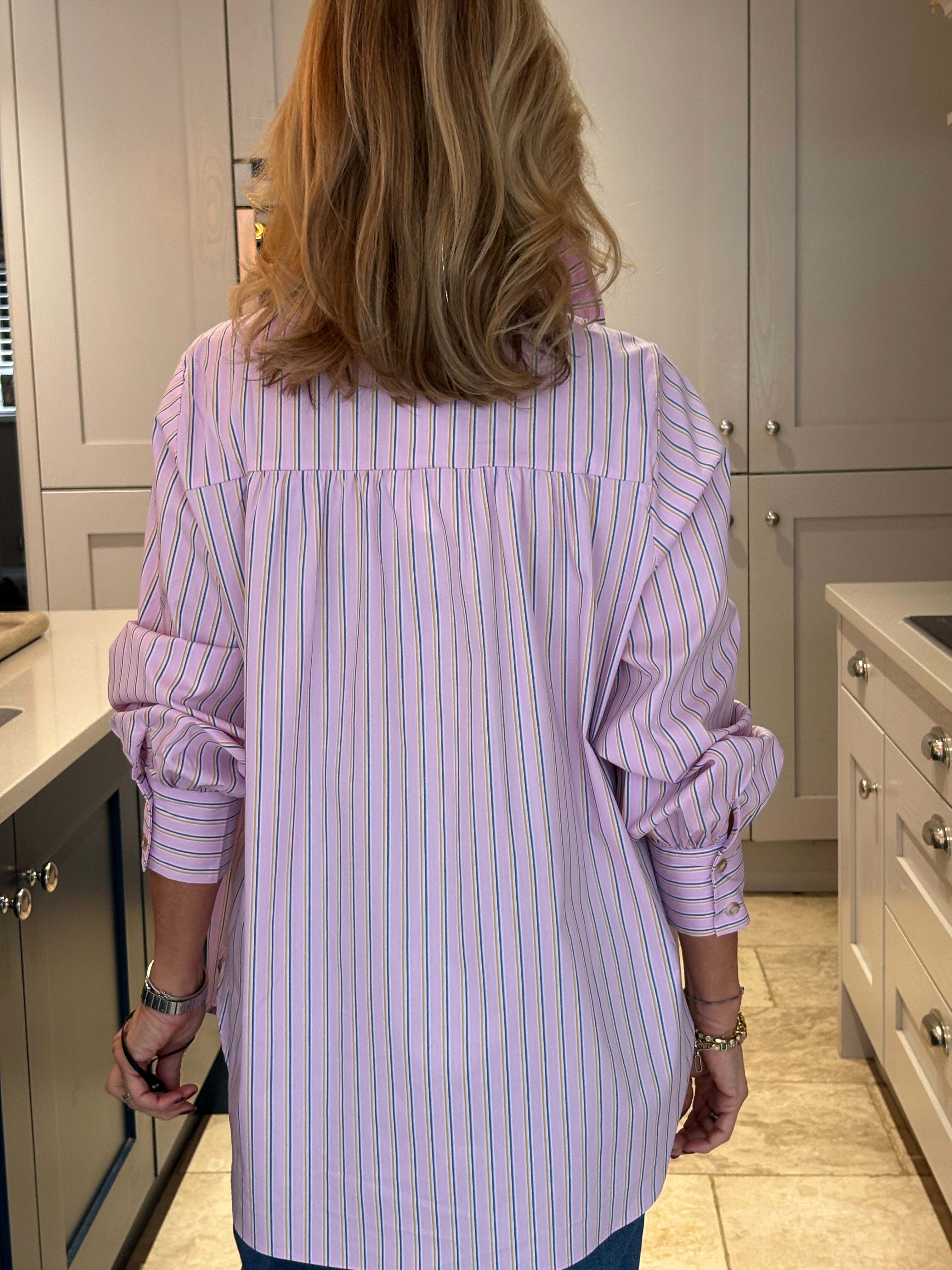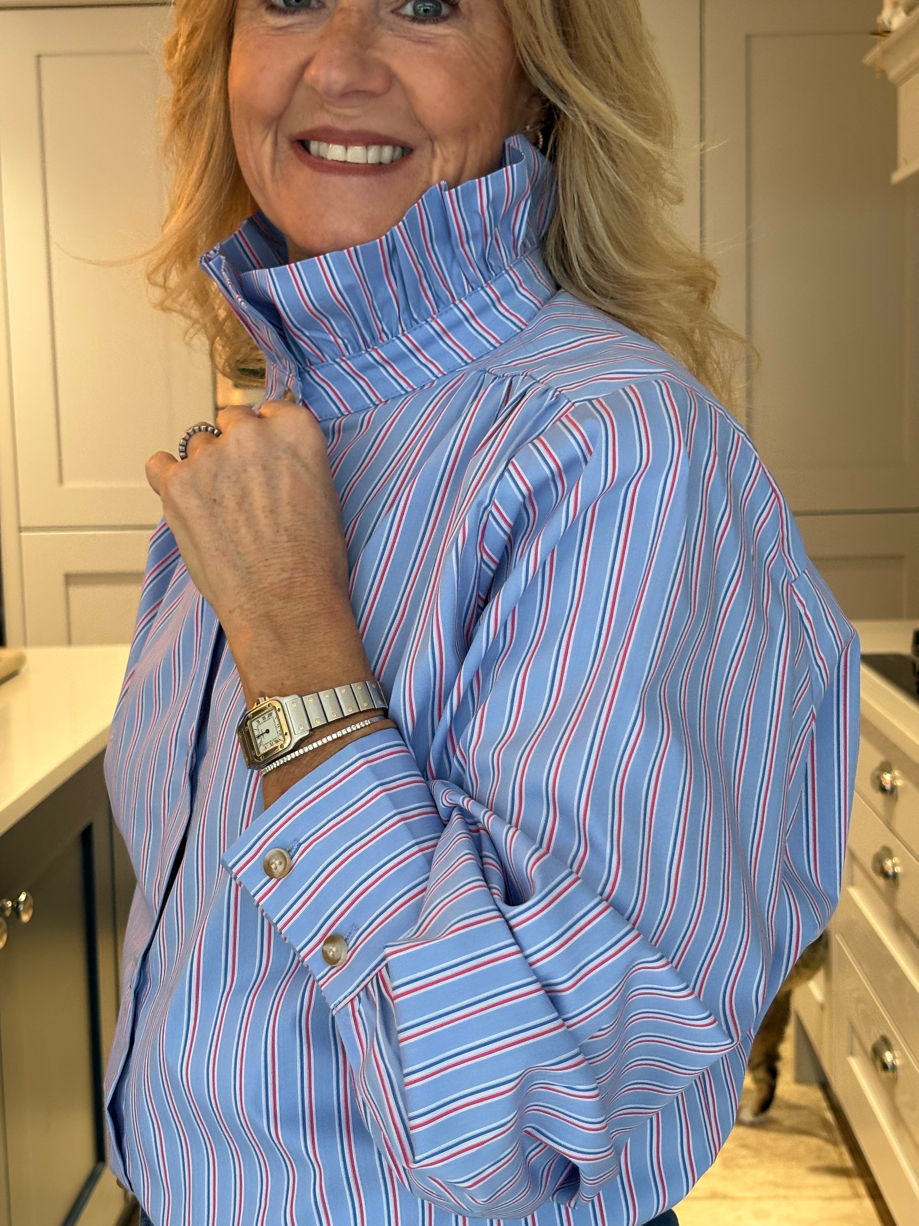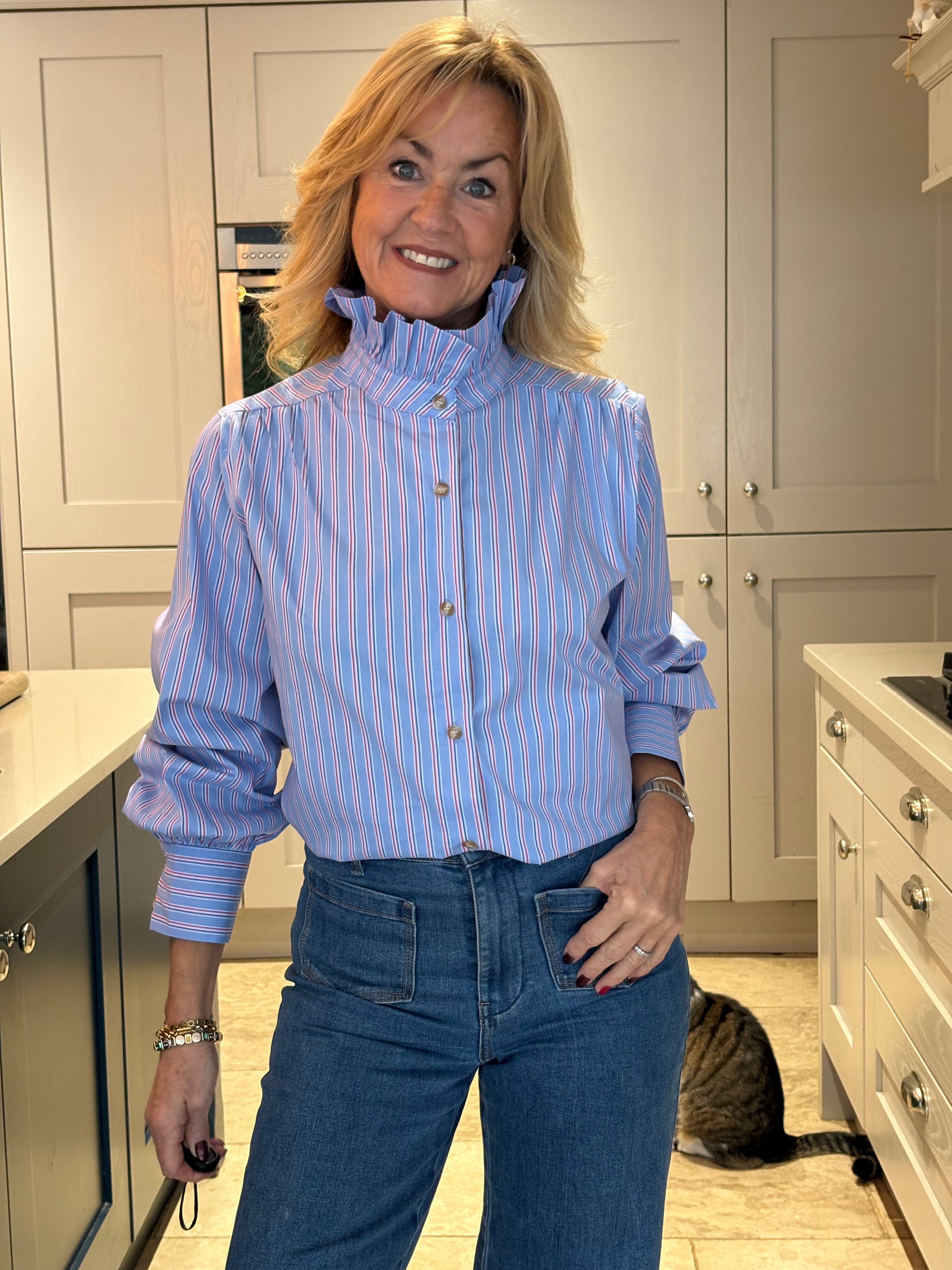 The Lara blouse comes in two colours. Blue with a pink, navy and white stripe throughout and pink with a royal blue, yellow and white stripe.