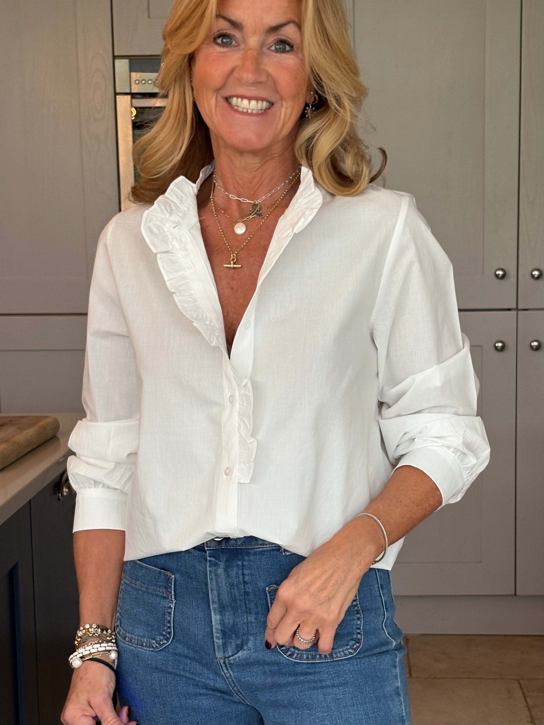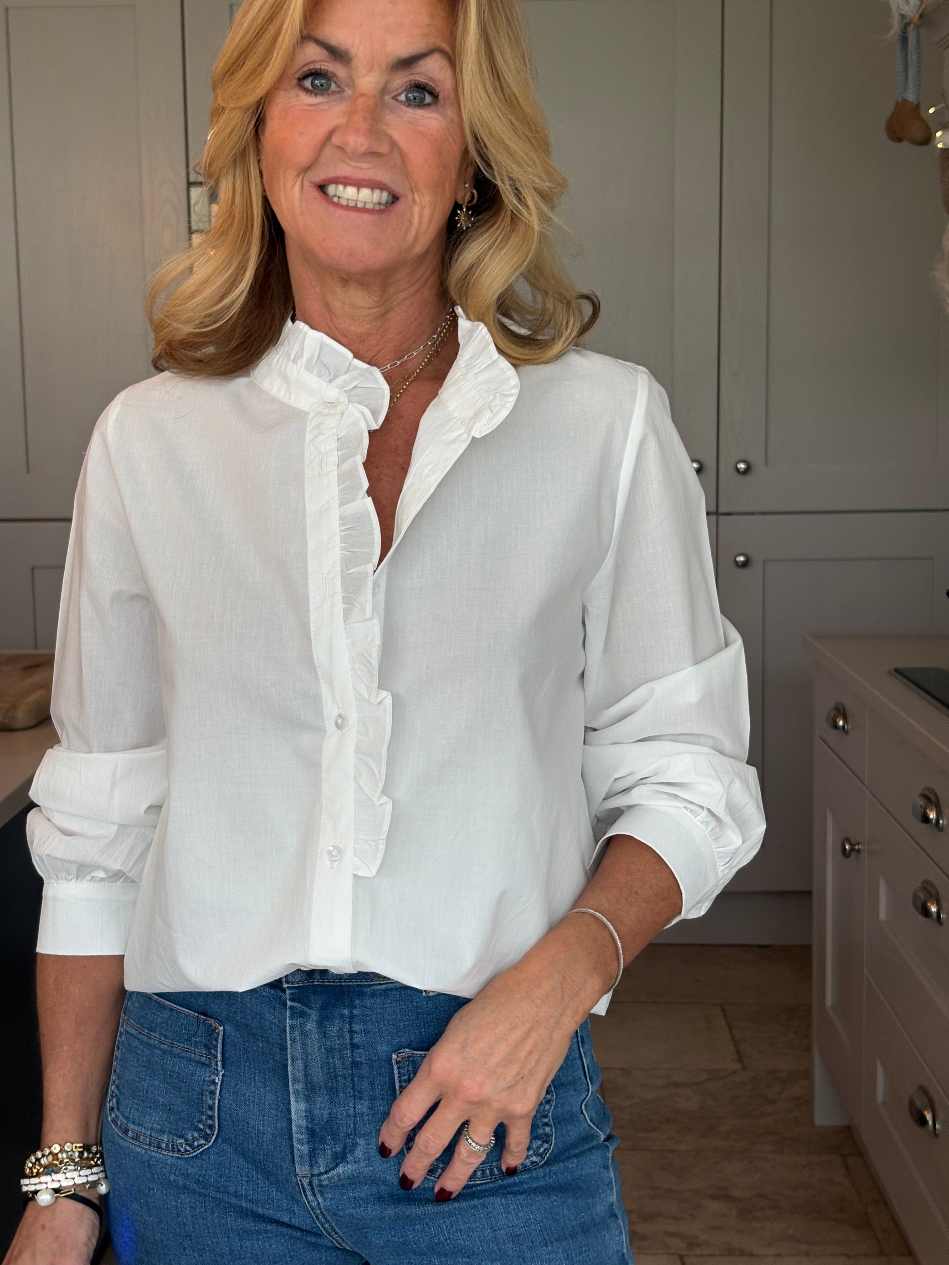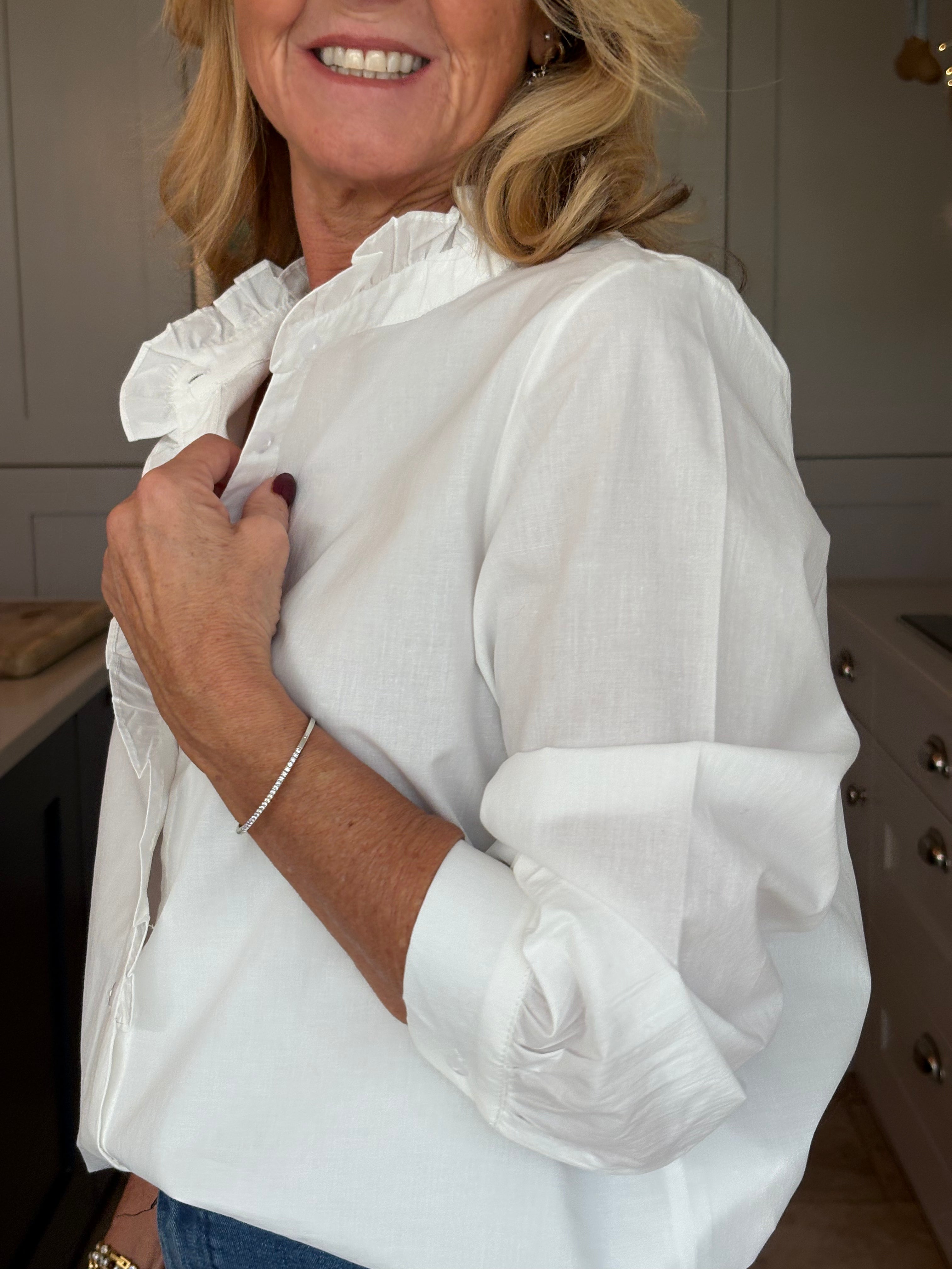 This perfect white cotton blouse is a true find, crafted from 100% soft and fluid cotton that feels luxurious against the skin. It features a frill-trimmed round neckline that gracefully extends halfway down the buttoned front, adding a charming detail to its classic design. The gently puffed sleeves enhance its feminine silhouette, while the small cuffs provide a polished finish. Elegant, classic, and timeless, this blouse is a versatile wardrobe staple that can be effortlessly dressed up or down, making it suitable for any occasion. Its enduring style ensures it will remain a favorite for years to come.