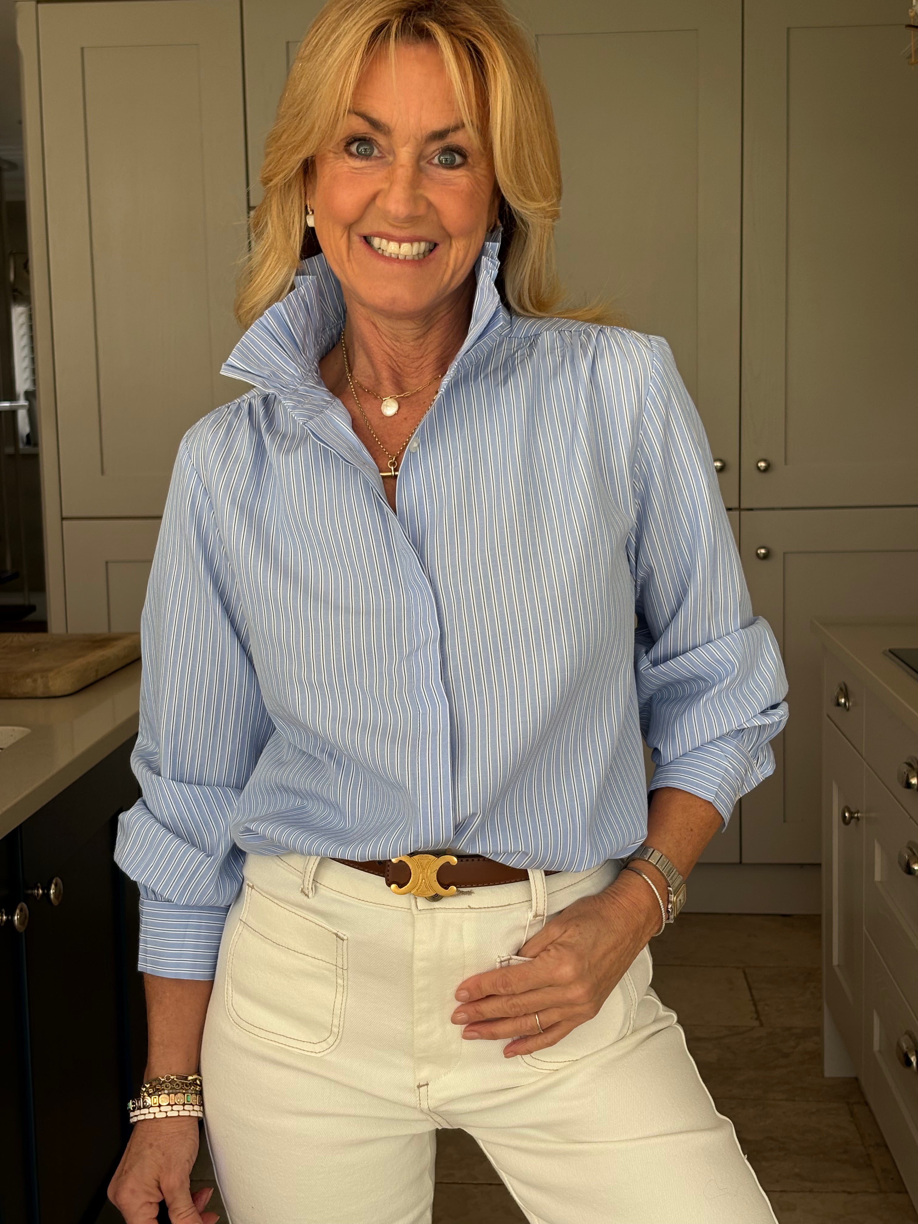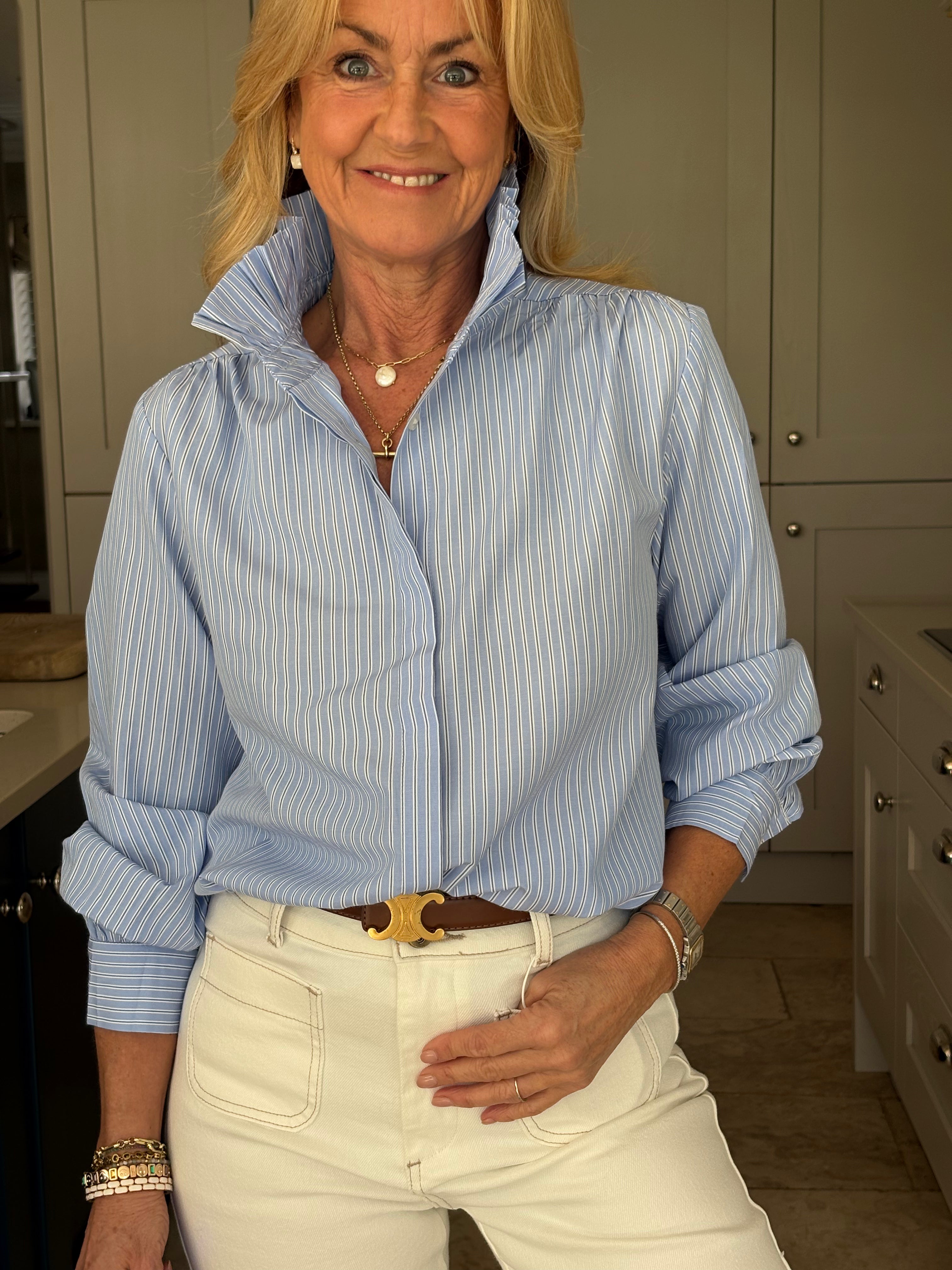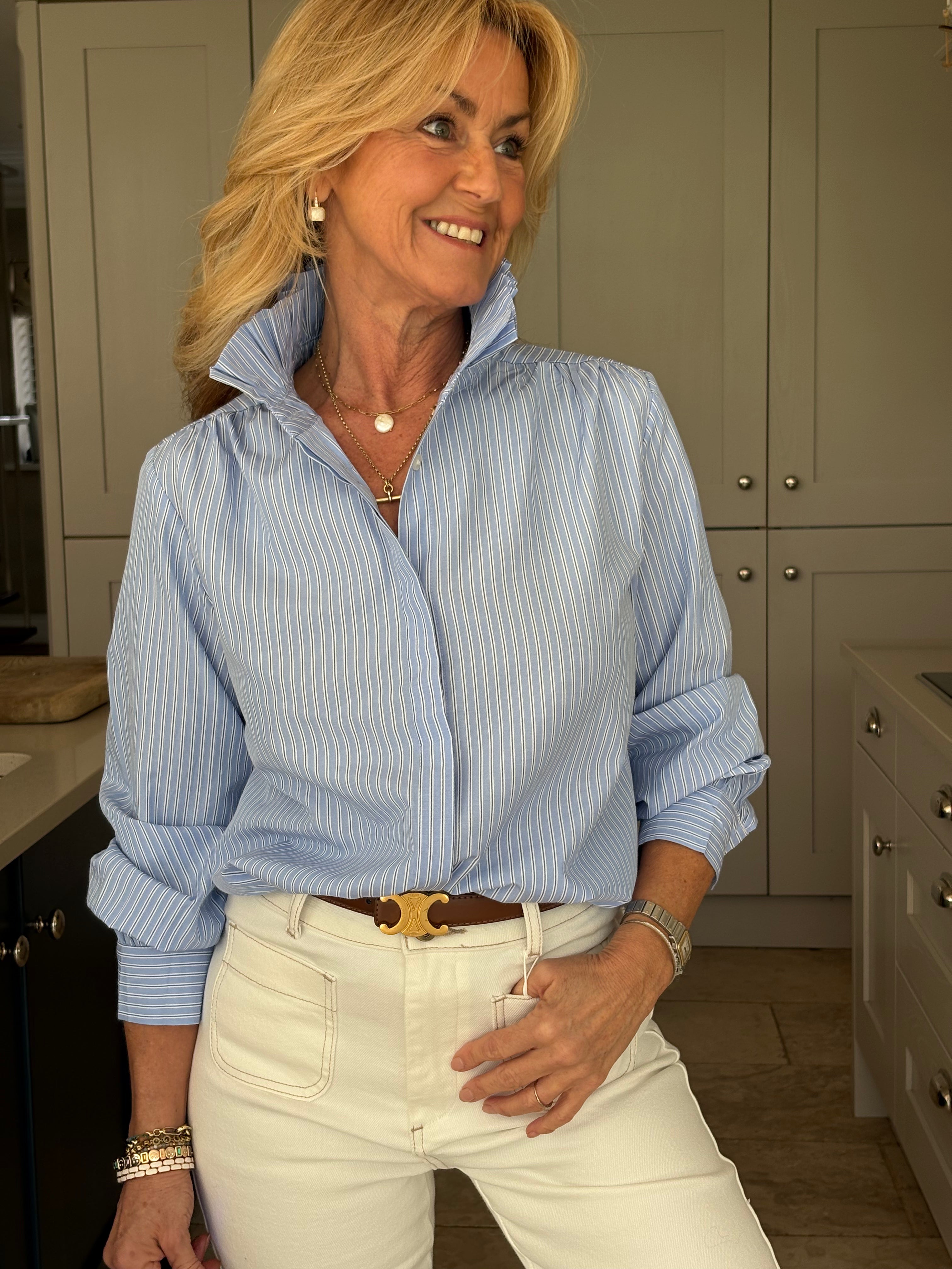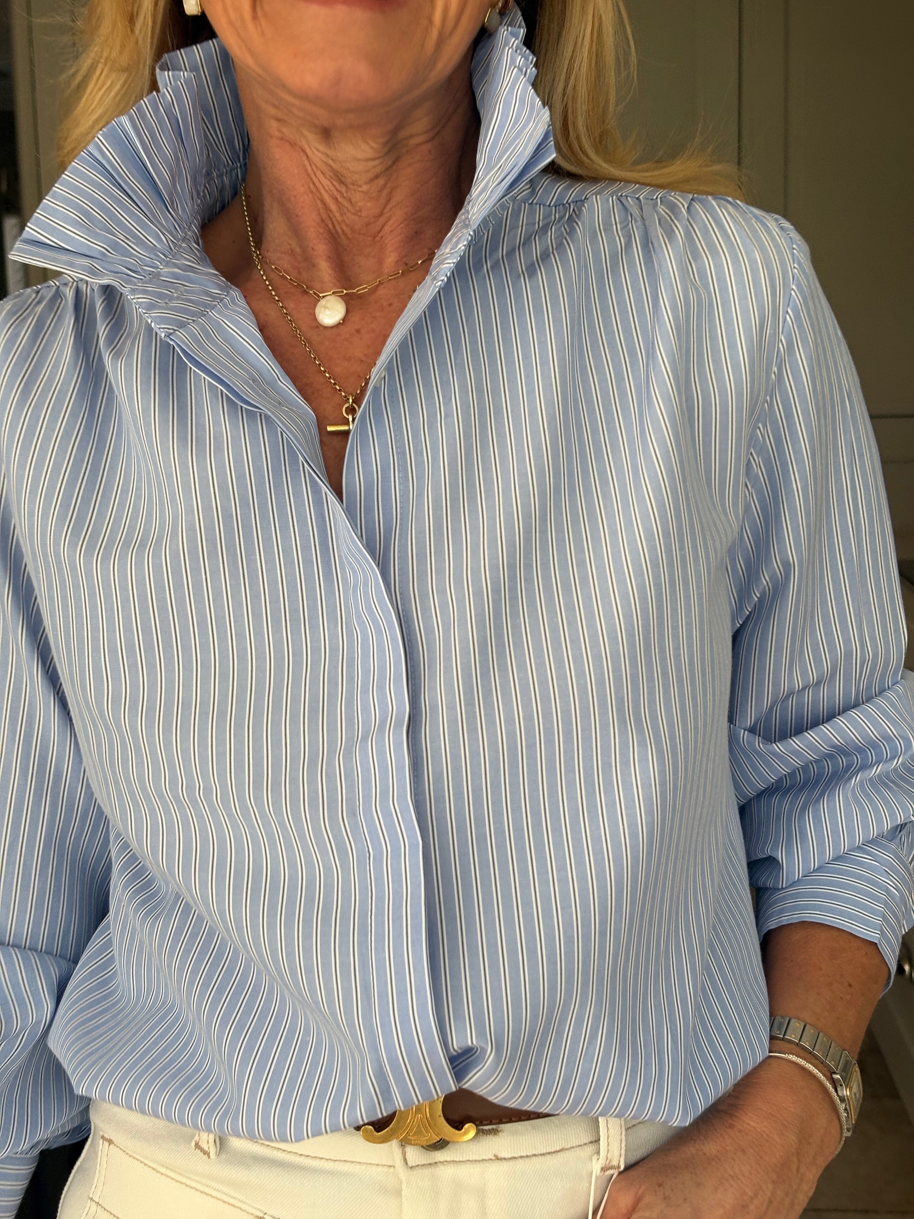 The Marin is a stunning pinstripe blouse with a high pleated collar giving it a regal look.  Fabulous worn elegantly,  on its own or under a jacket, and casually under a jumper with the collar exposed.  The sleeves are gently puffed with a cuff and there is a box pleat on the back. This blouse is a regular fit and is not overly generous - see sizing below.
