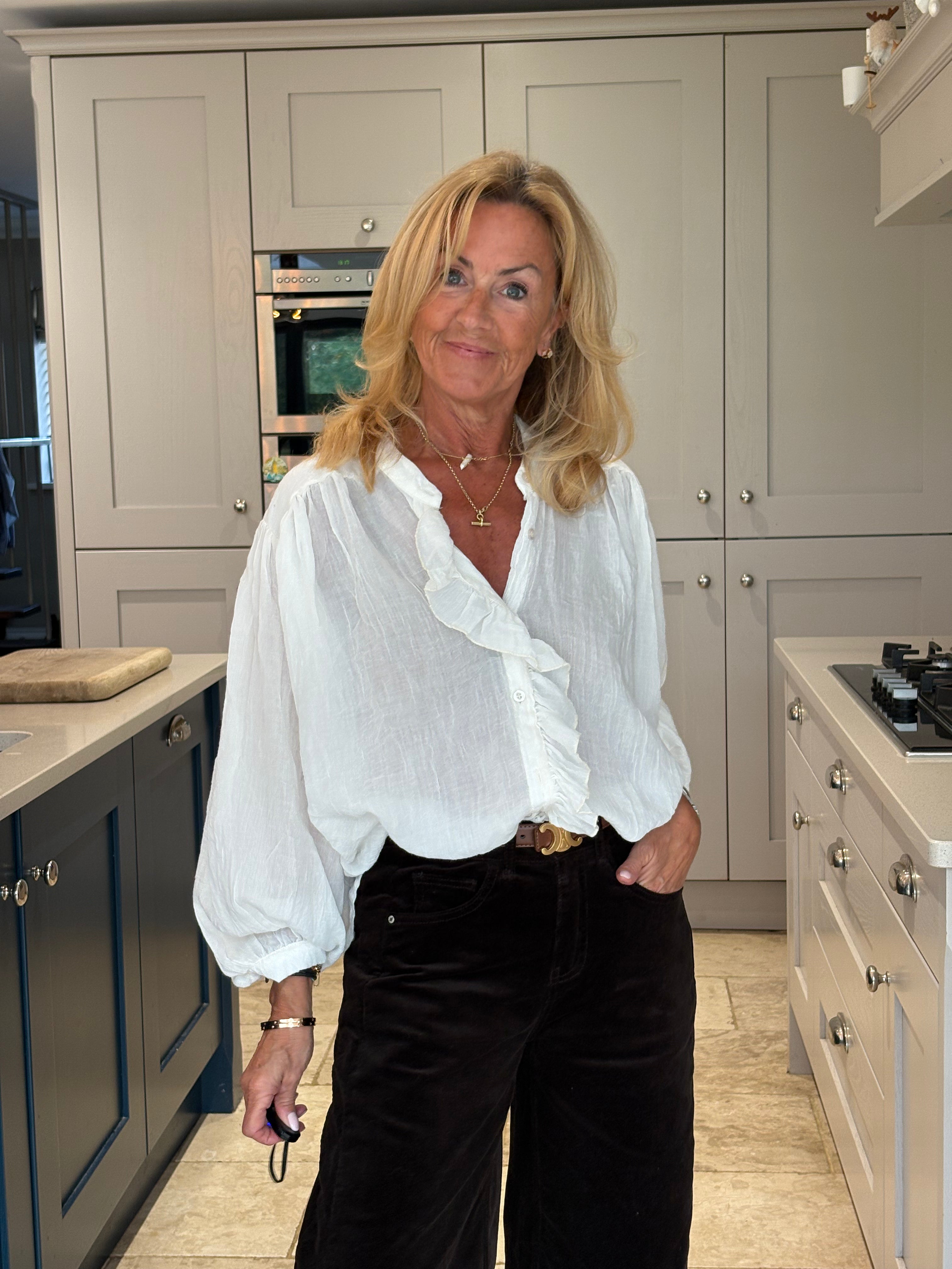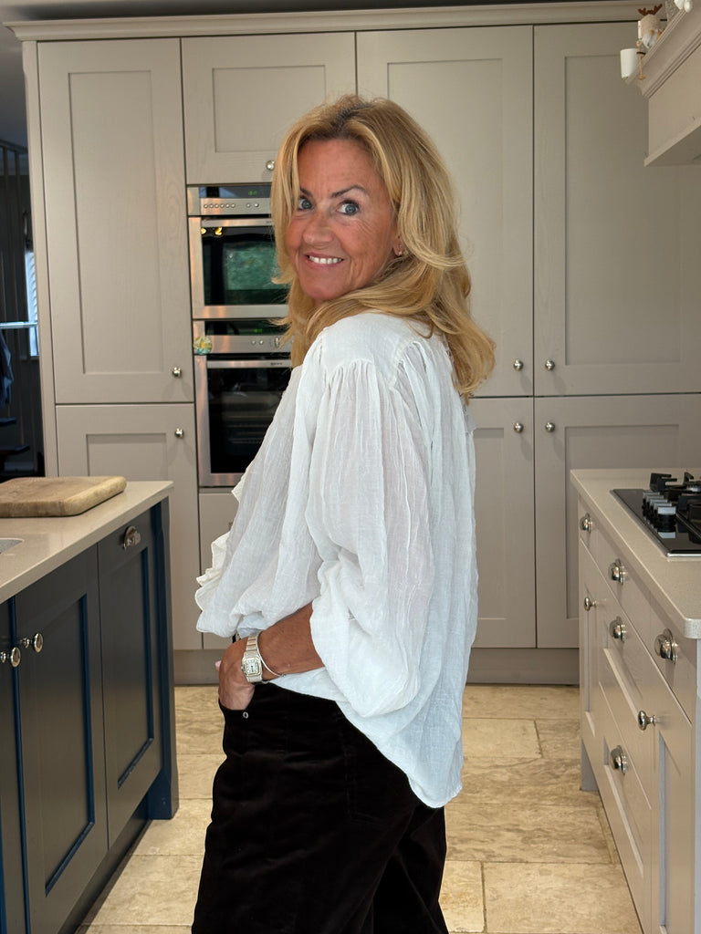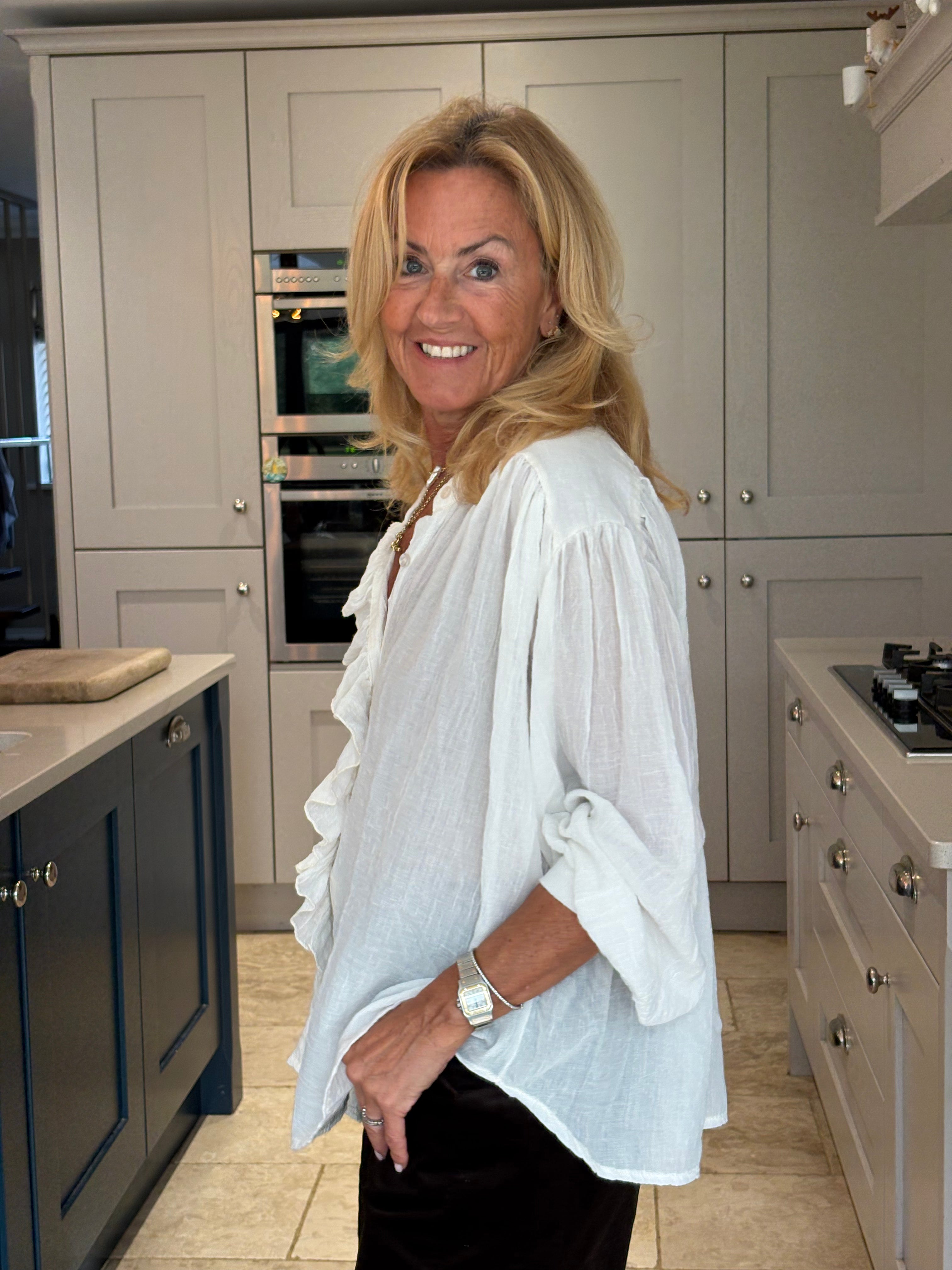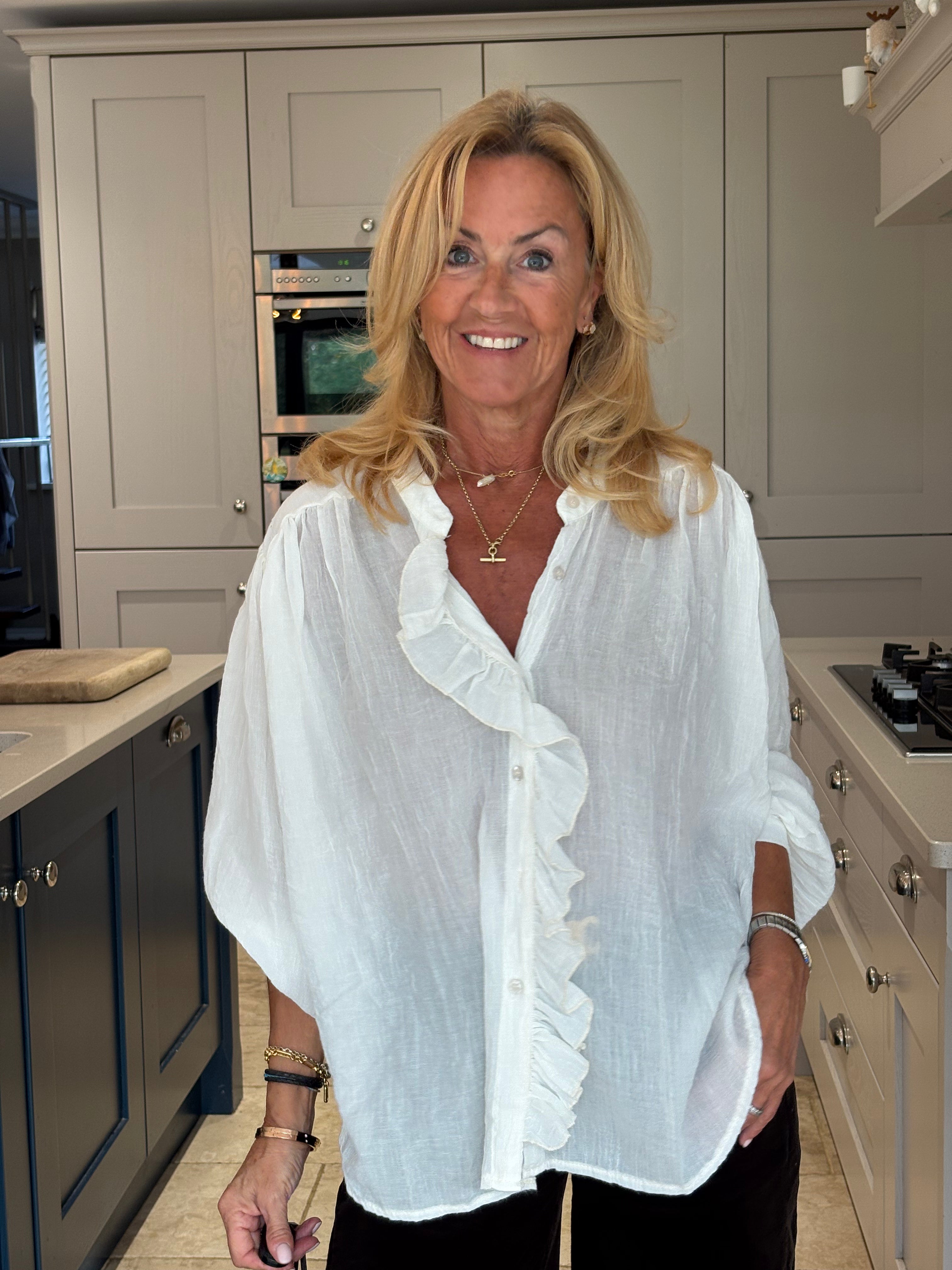 The Olivia is made from a soft, breathable cotton for comfort. It is buttoned down front with a stylish ruffle frill, has a round neckline for a classic touch and a loose body for a relaxed silhouette. Large puffed sleeves for a dramatic and fashionable effect and is fluid and floaty, perfect for layering or wearing alone