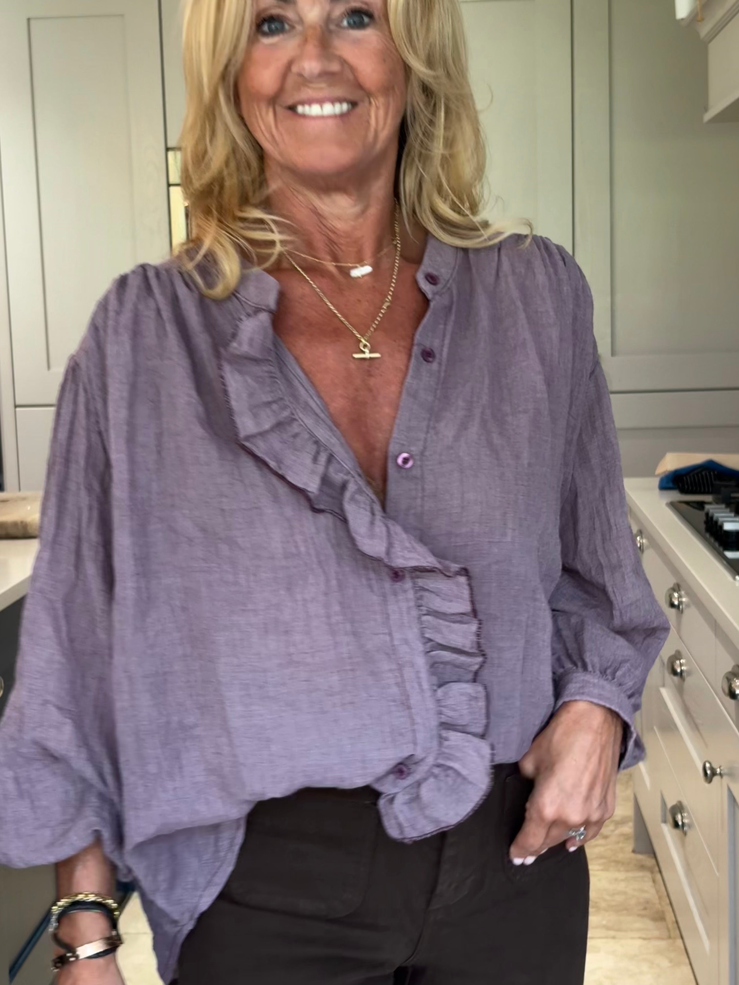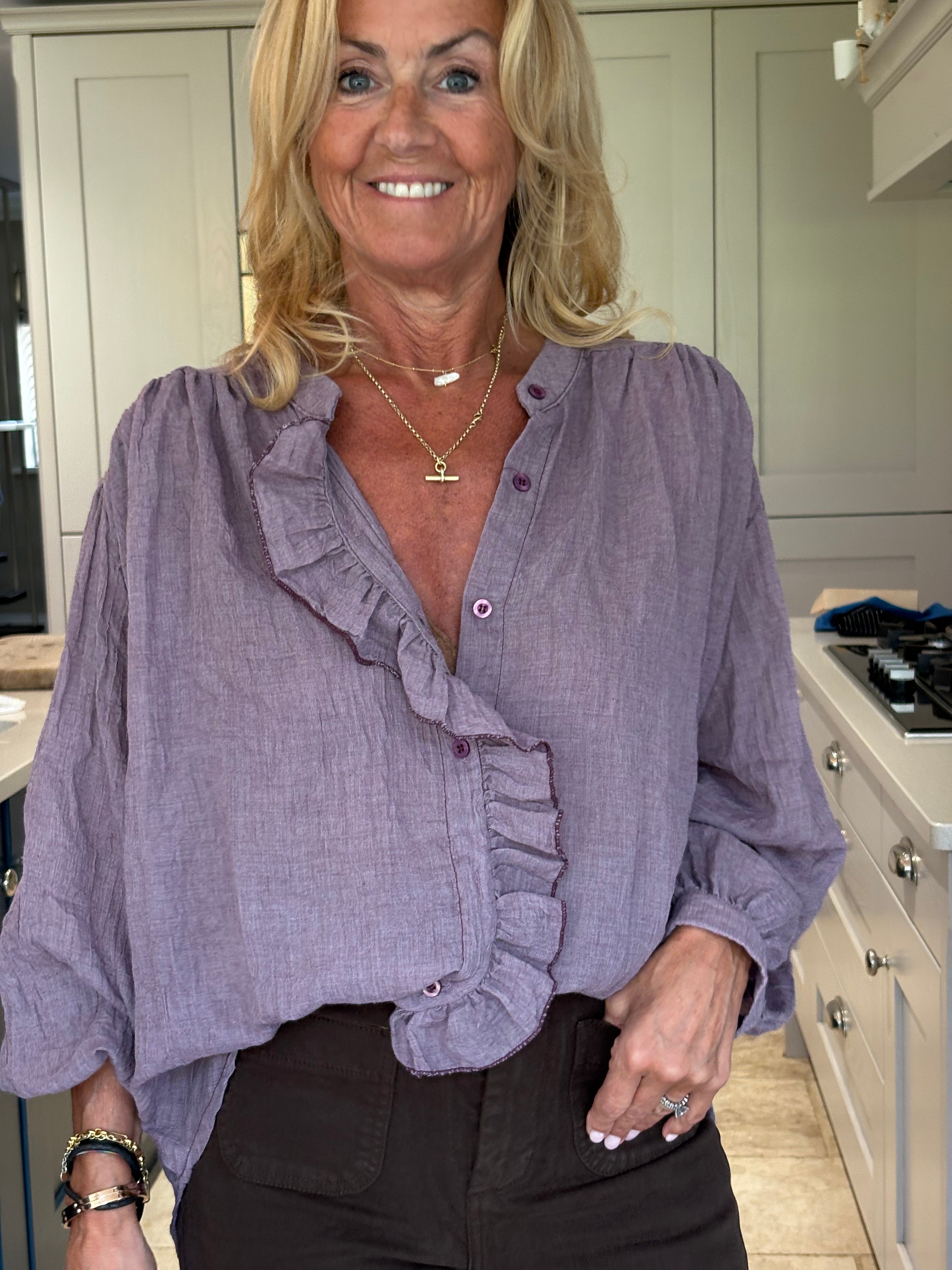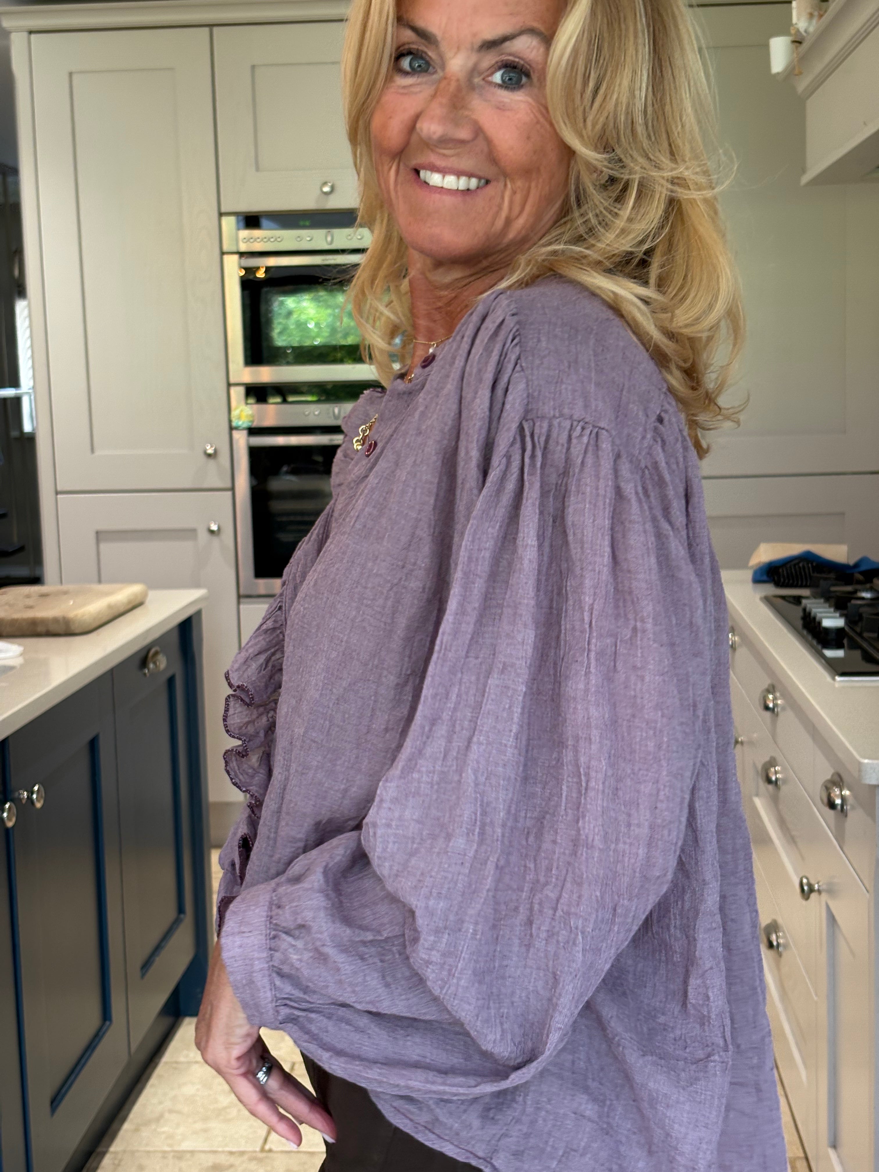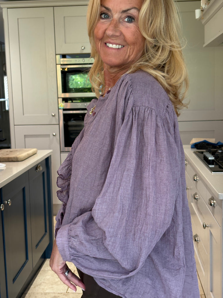 The Olivia is made from a soft, breathable cotton for comfort. It is buttoned down front with a stylish ruffle frill, has a round neckline for a classic touch and a loose body for a relaxed silhouette. Large puffed sleeves for a dramatic and fashionable effect and is fluid and floaty, perfect for layering or wearing alone