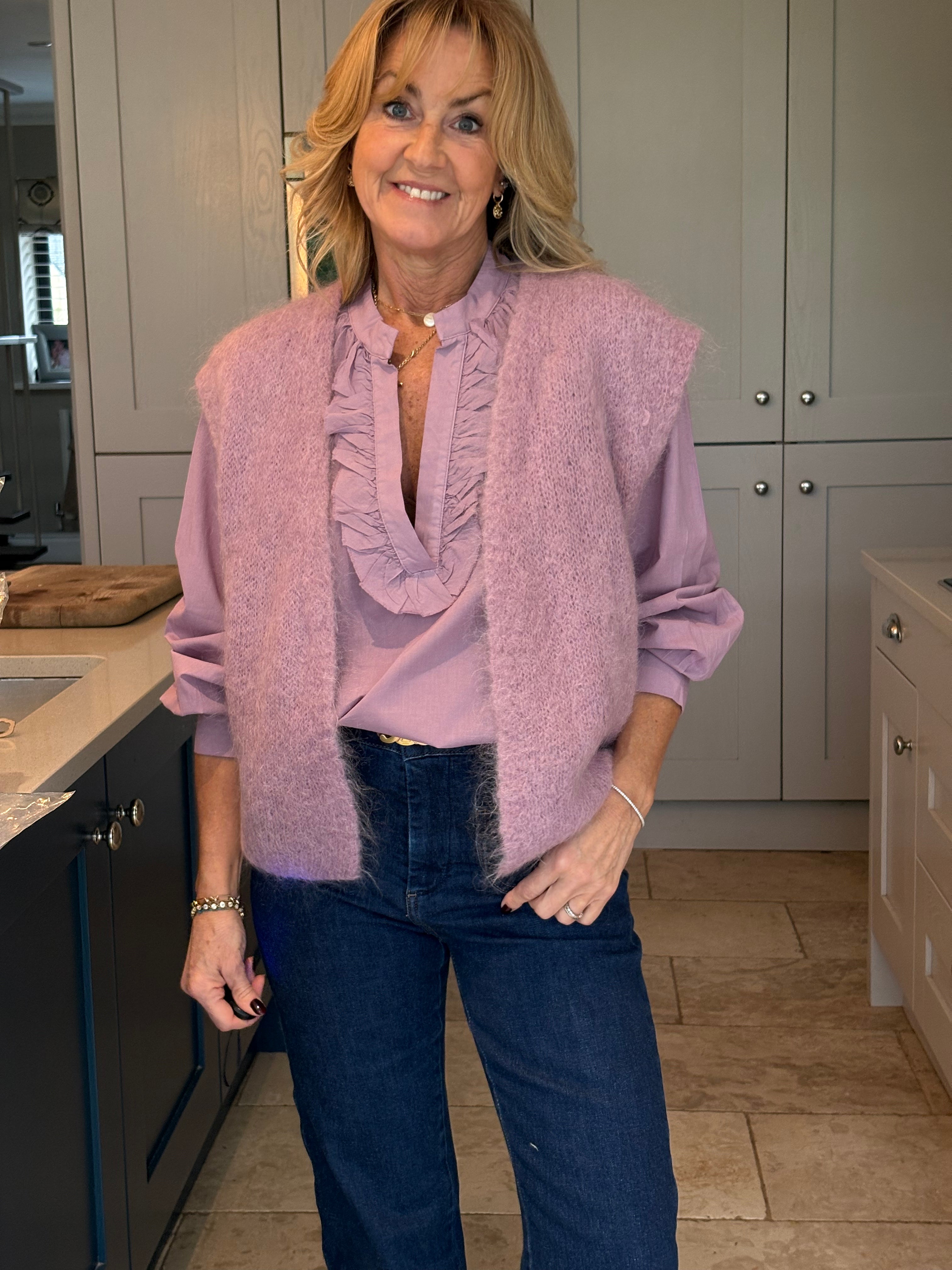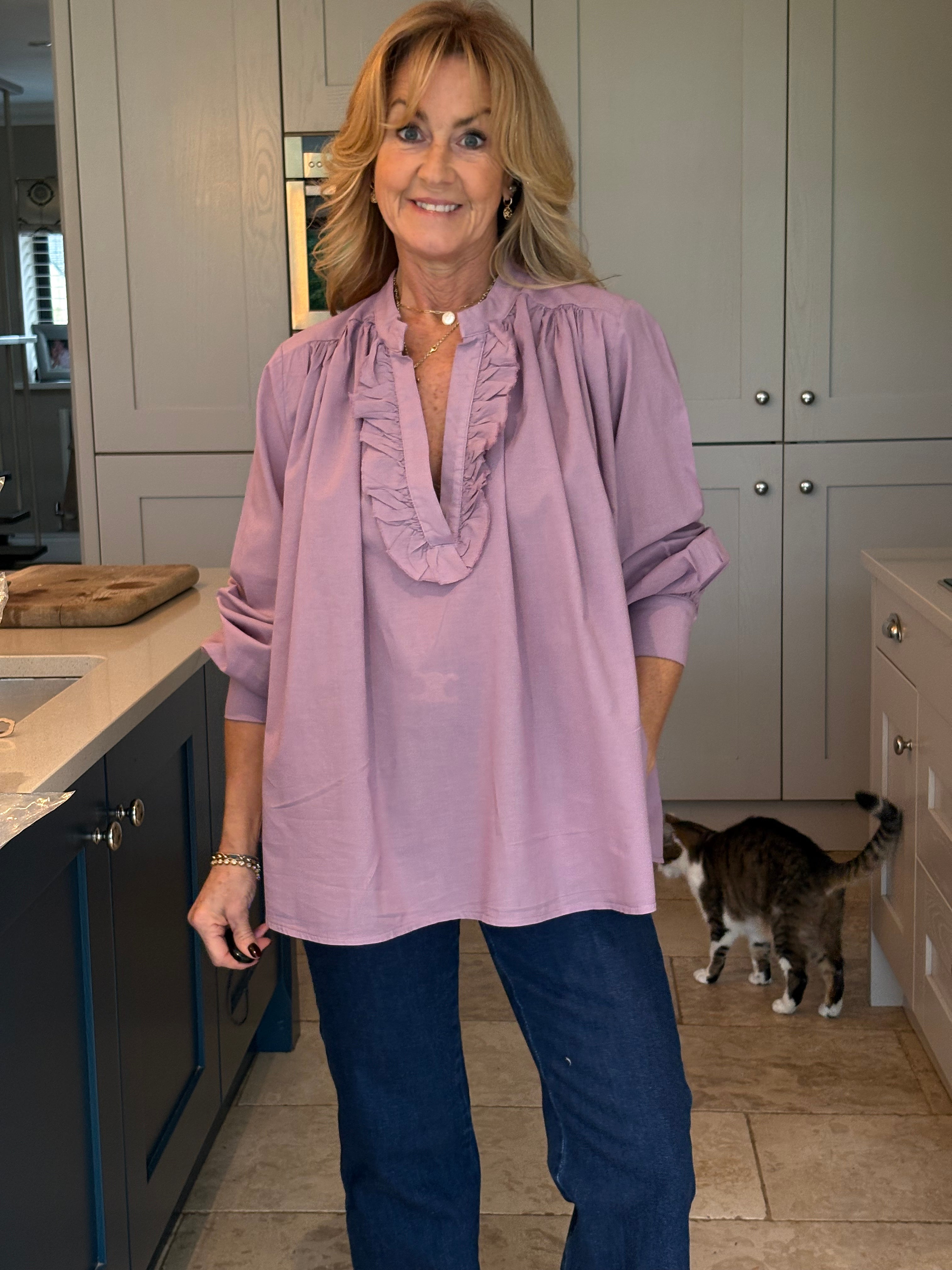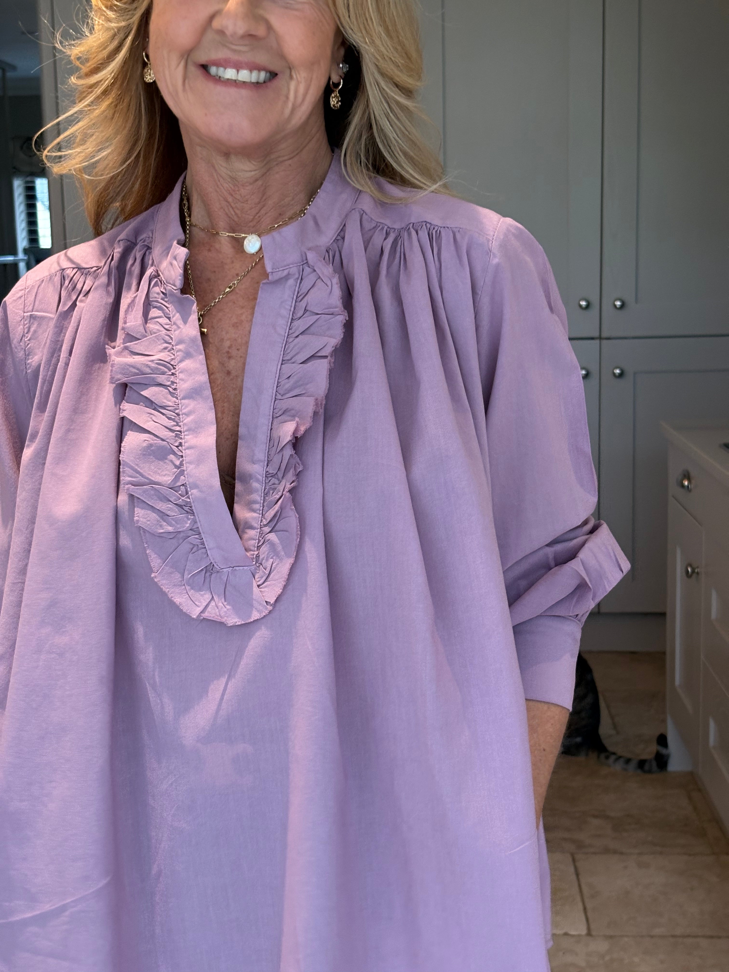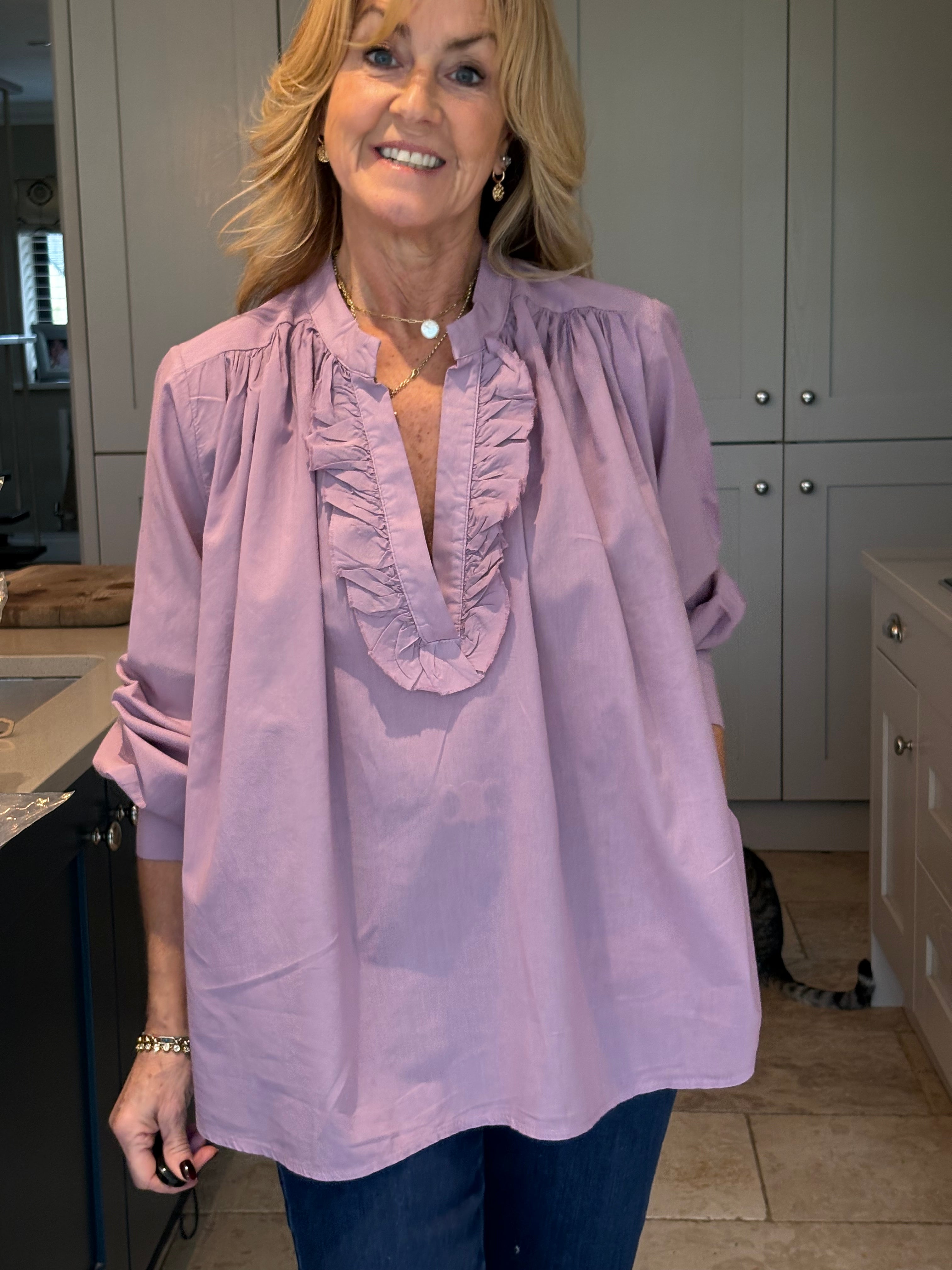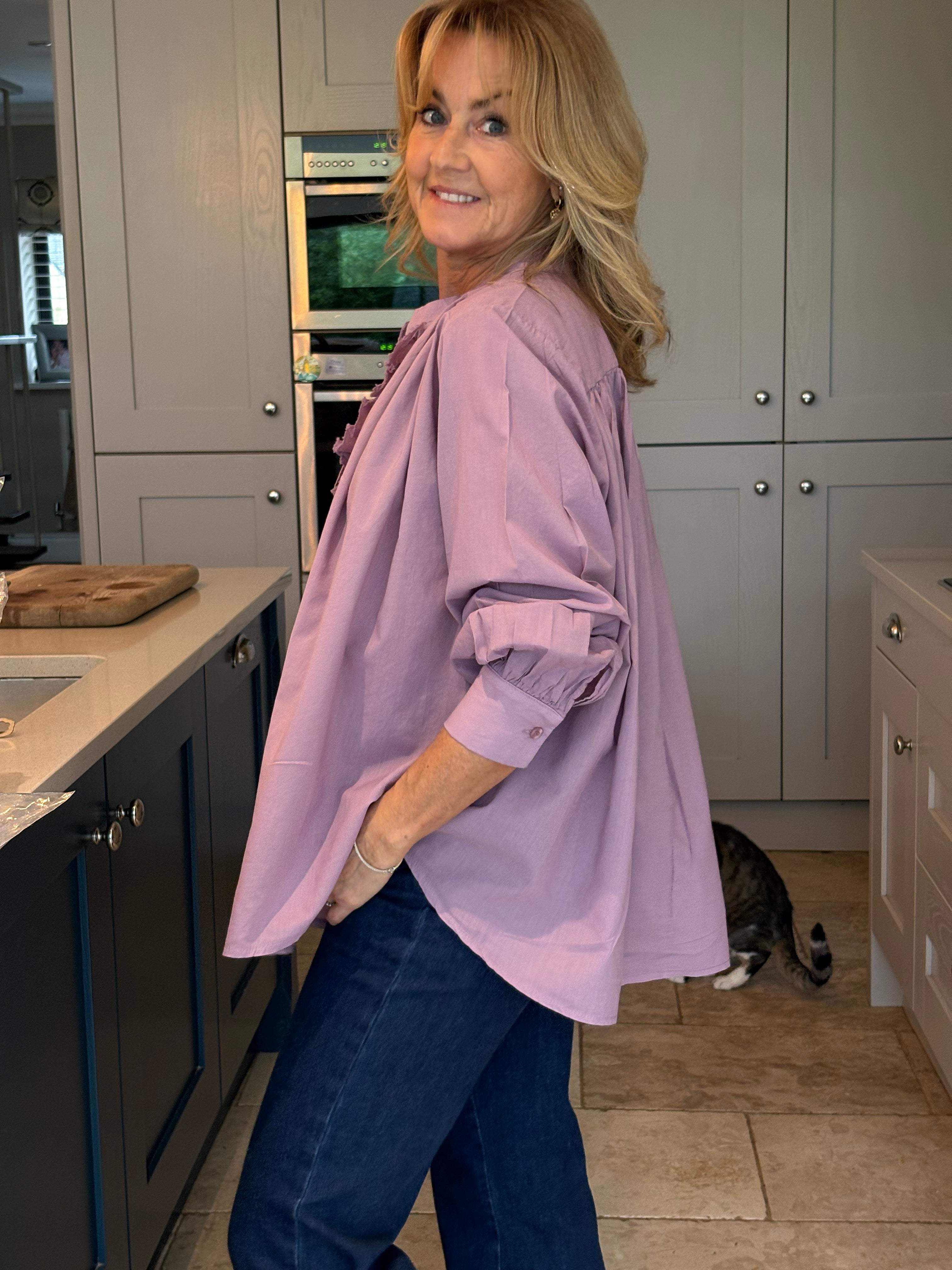 Gorgeous light cotton smocked blouse with a softly frilled V neckline and gently puffed sleeves finished with a cuff. Designed with a gathered yoke at both the front and back, it creates a beautiful smocked effect that adds texture and movement. The shirt-style hemline is slightly longer at the back for a flattering, easy fit. Large, breezy, and fluid, this versatile blouse can be worn loose for relaxed elegance or tucked in for a more polished look.
