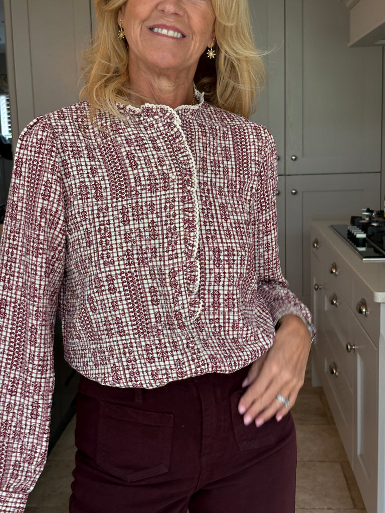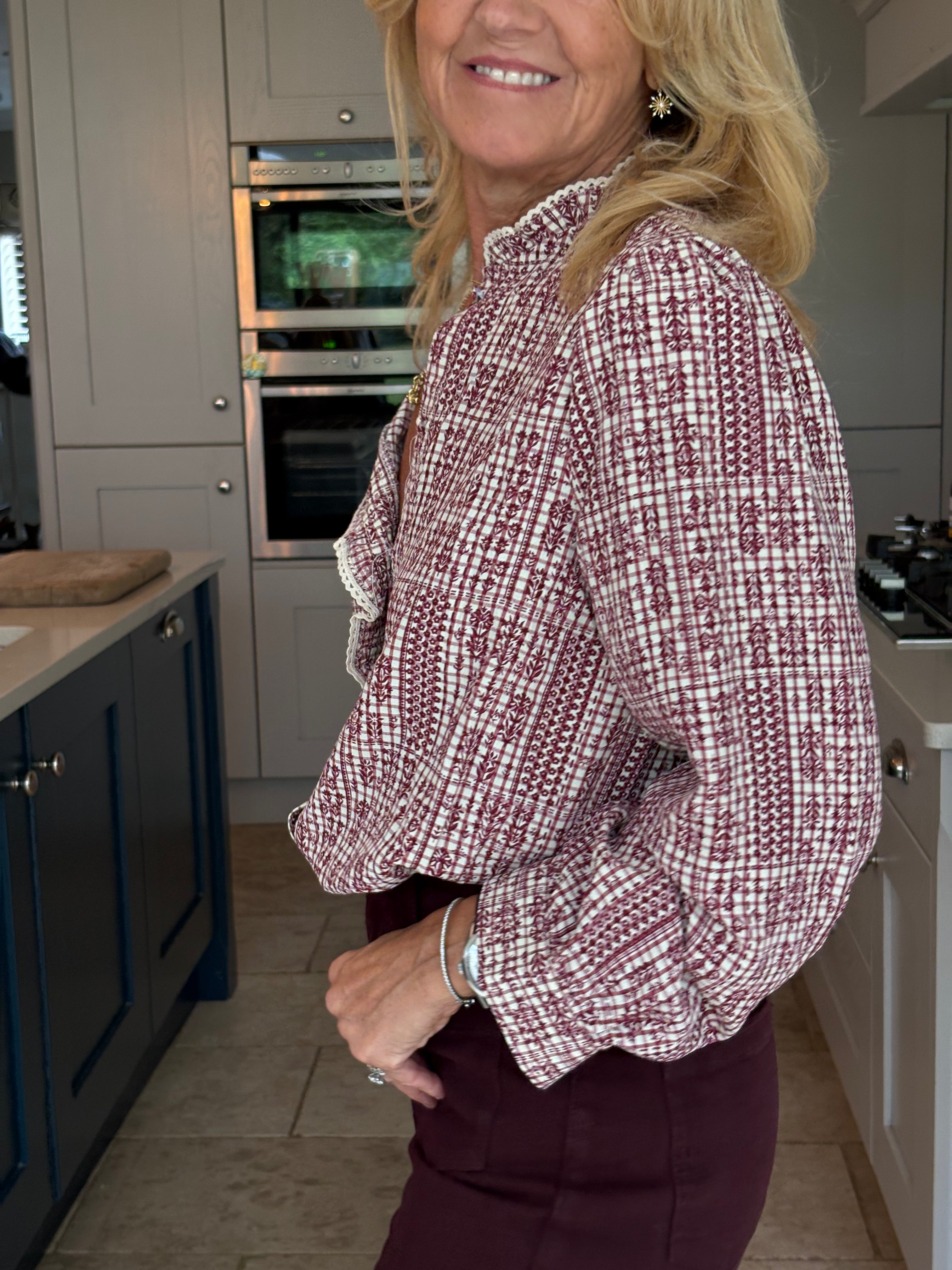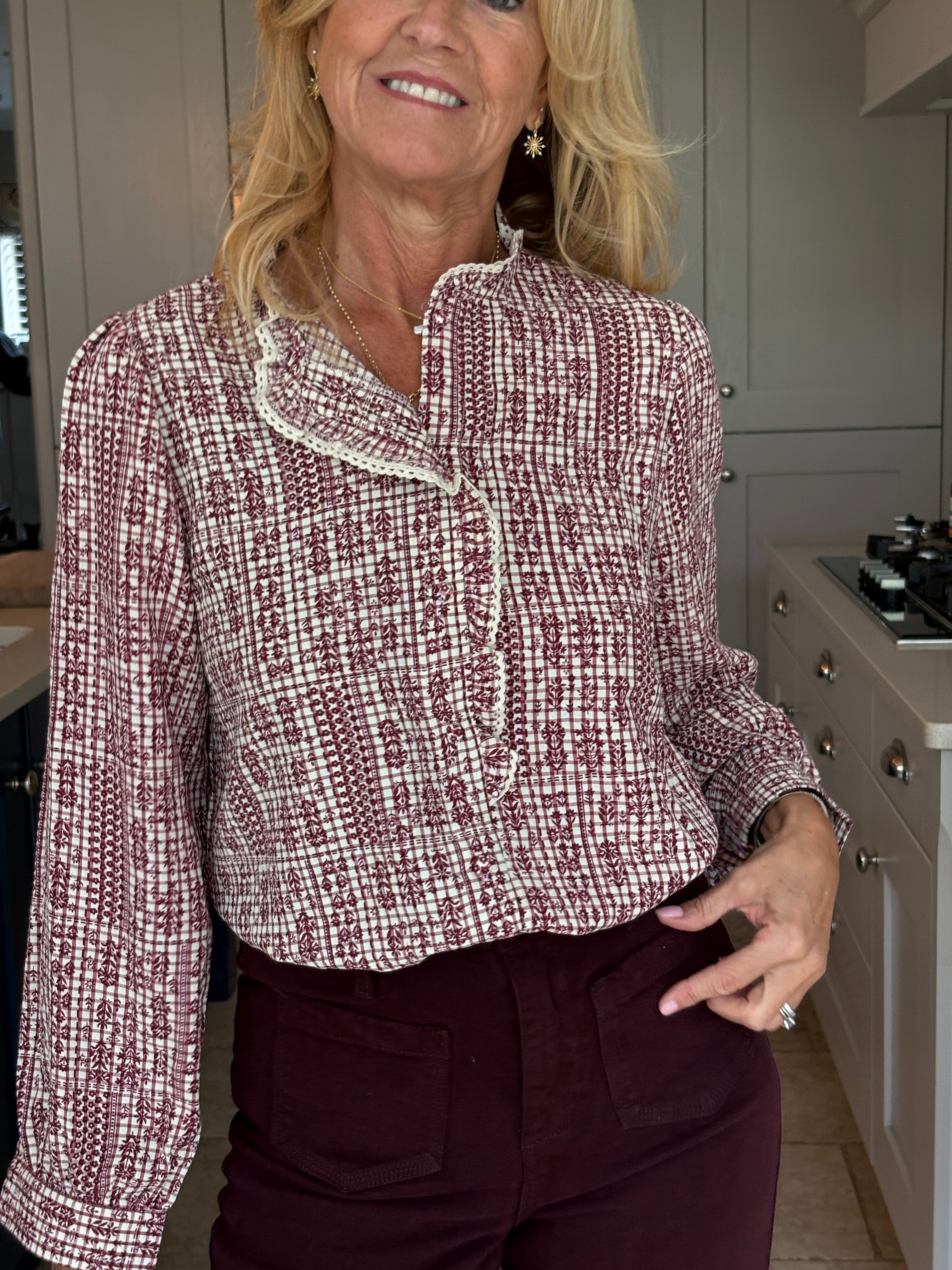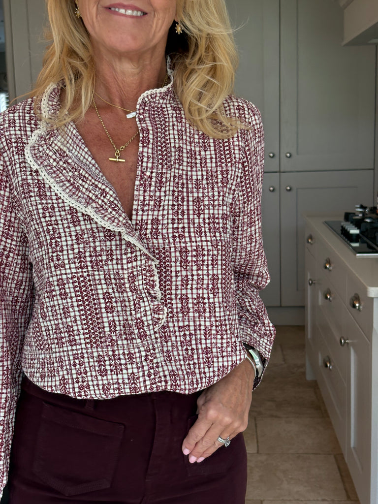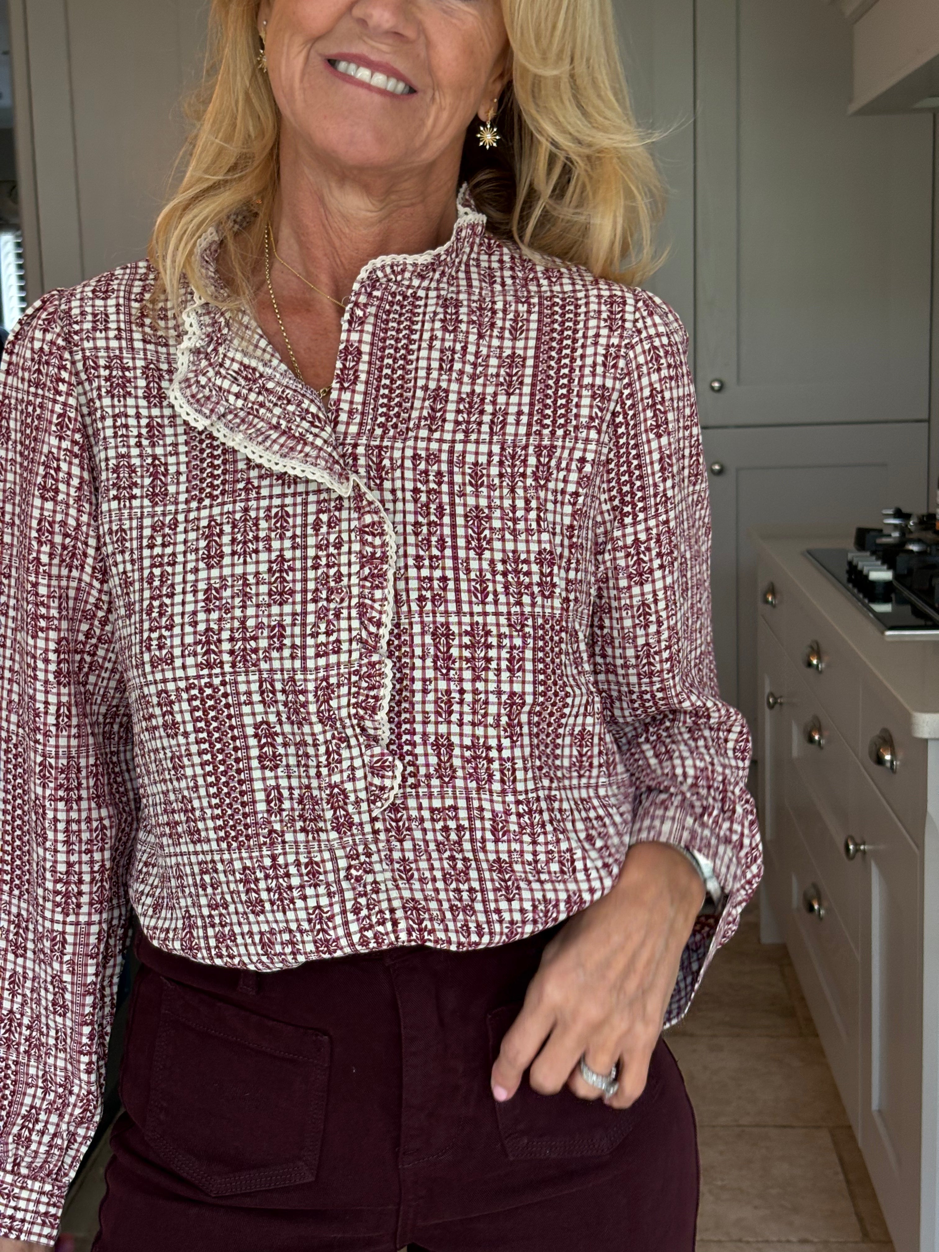A gorgeous cotton blend fluid blouse featuring intricate detailing. It has a delicate frill collar and a frill-trimmed front opening, adding a feminine touch. The subtle puffed sleeves enhance the blouse's elegant silhouette. The pattern is a charming burgundy and cream check, accented with a subtle burgundy vine print, creating a beautifully pretty and sophisticated look. Perfect for adding a touch of elegance to any outfit.