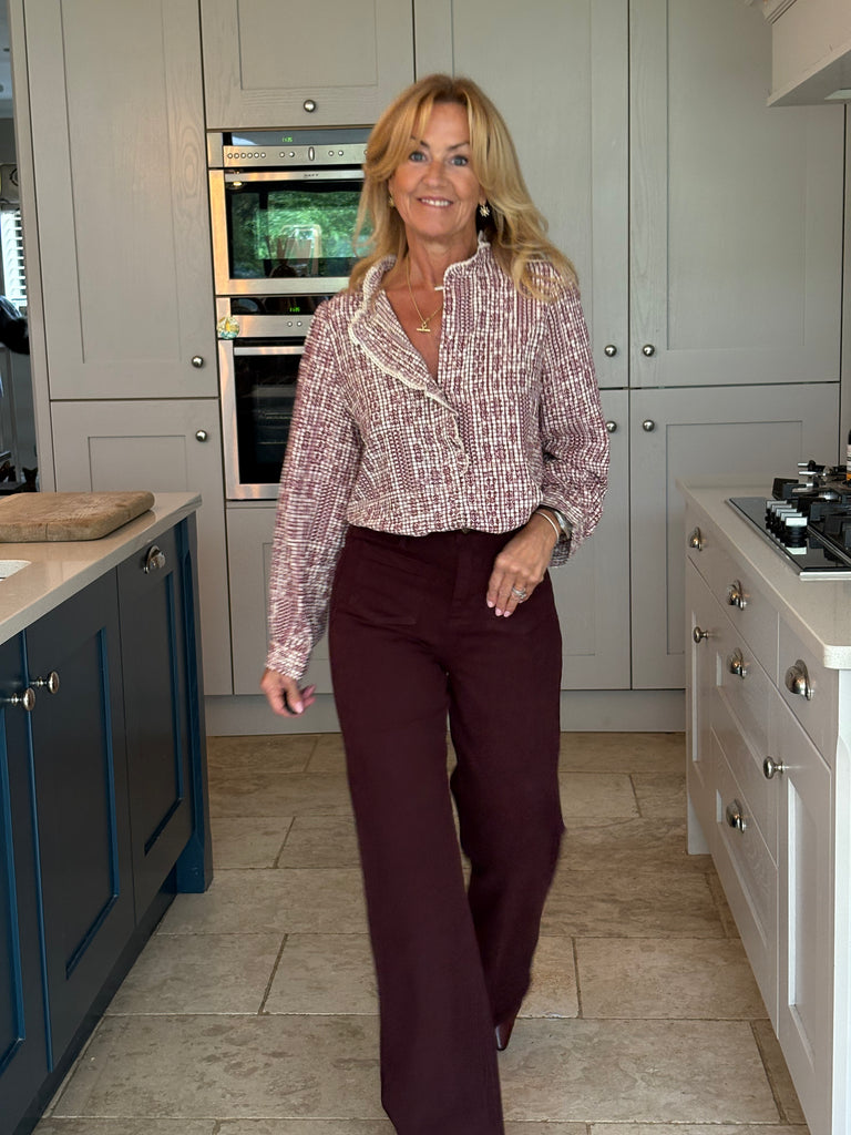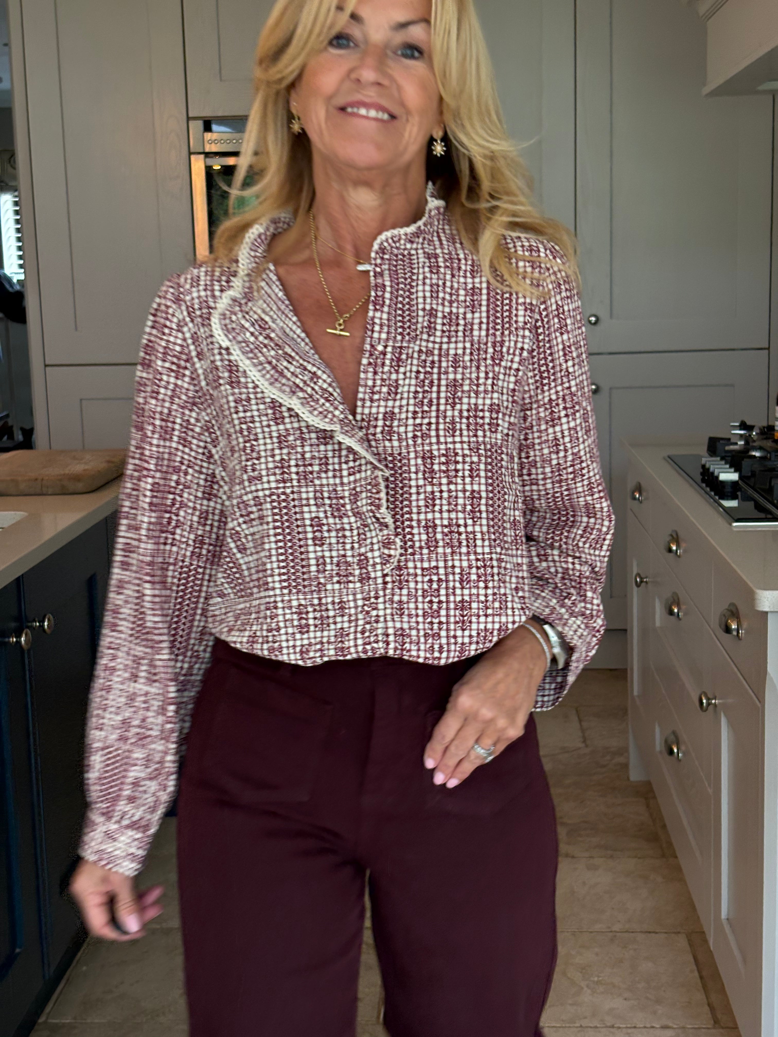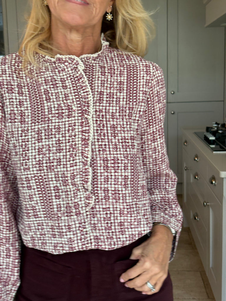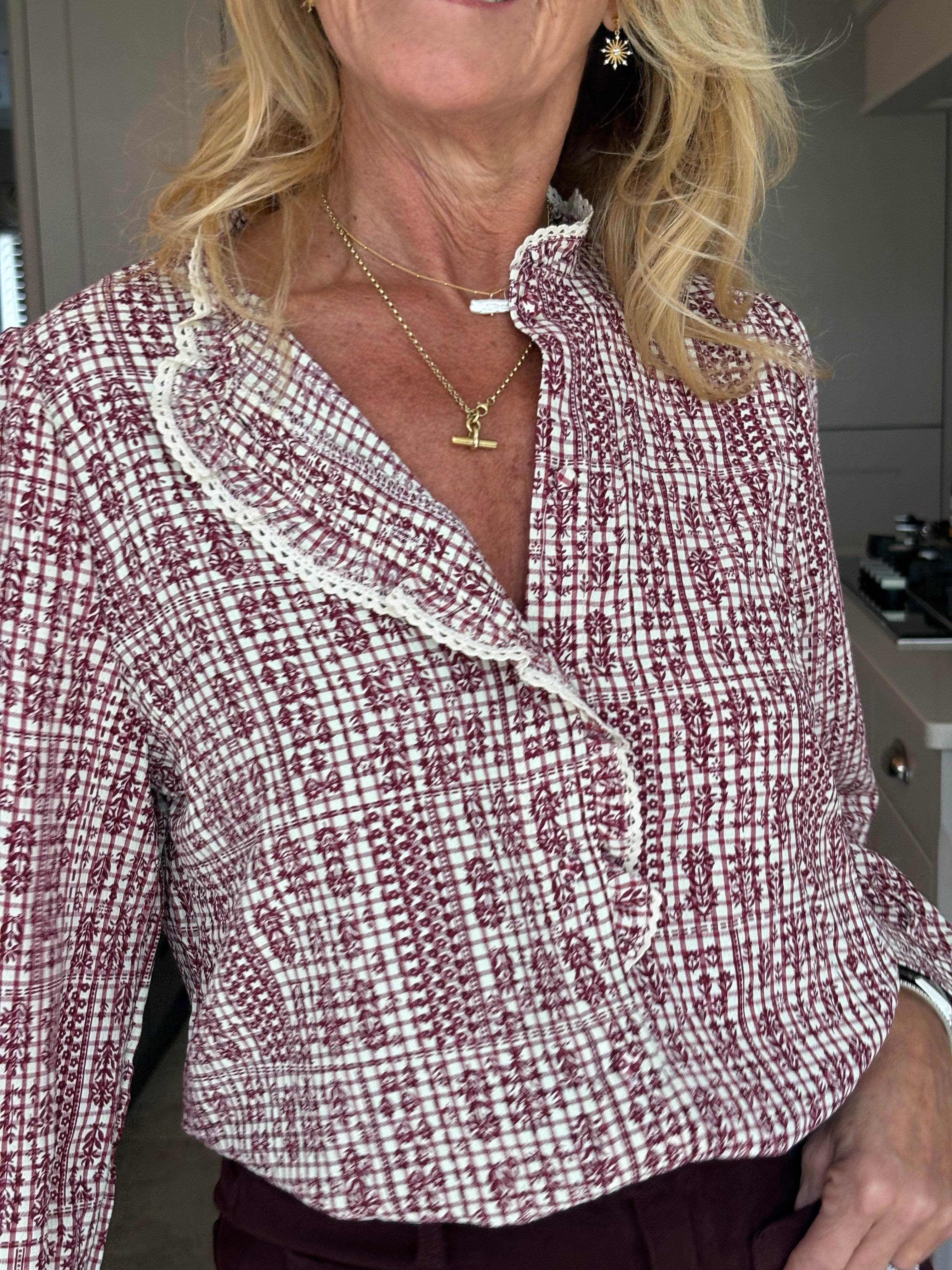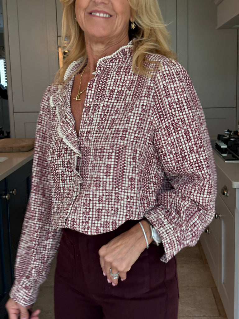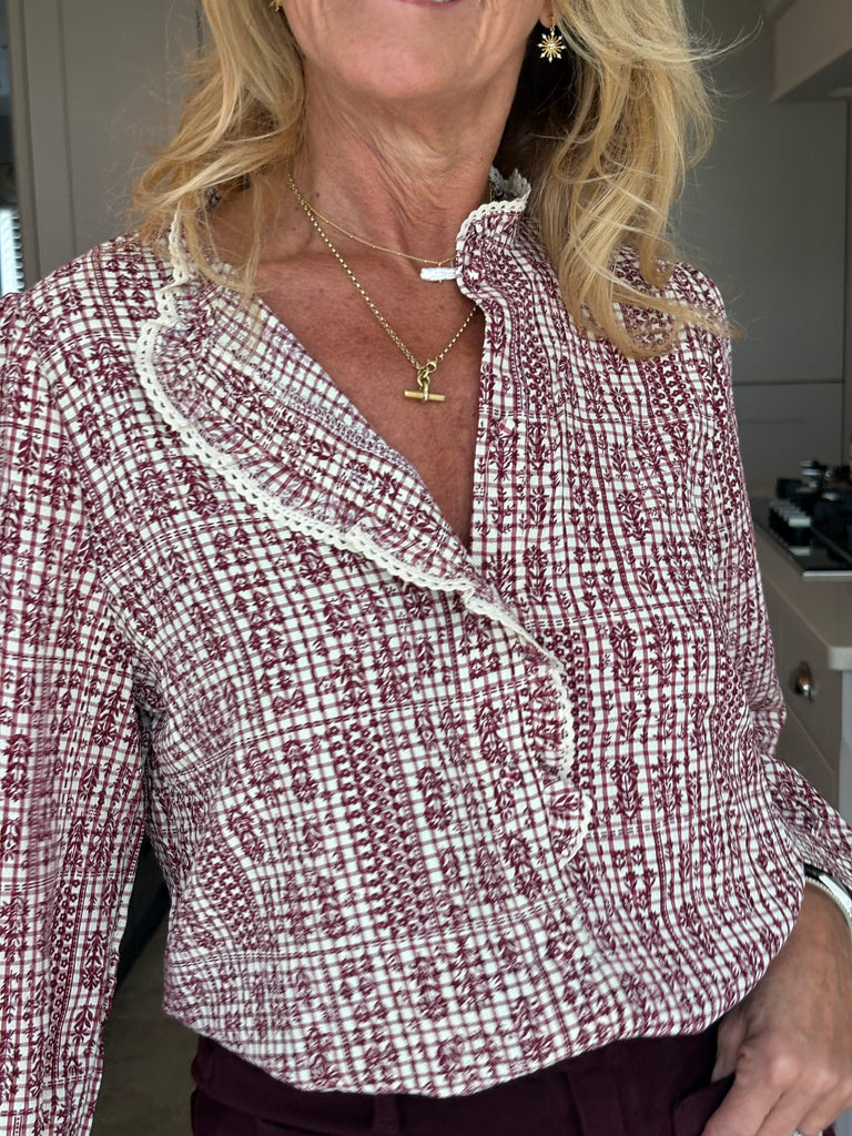 A gorgeous cotton blend fluid blouse featuring intricate detailing. It has a delicate frill collar and a frill-trimmed front opening, adding a feminine touch. The subtle puffed sleeves enhance the blouse's elegant silhouette. The pattern is a charming burgundy and cream check, accented with a subtle burgundy vine print, creating a beautifully pretty and sophisticated look. Perfect for adding a touch of elegance to any outfit.