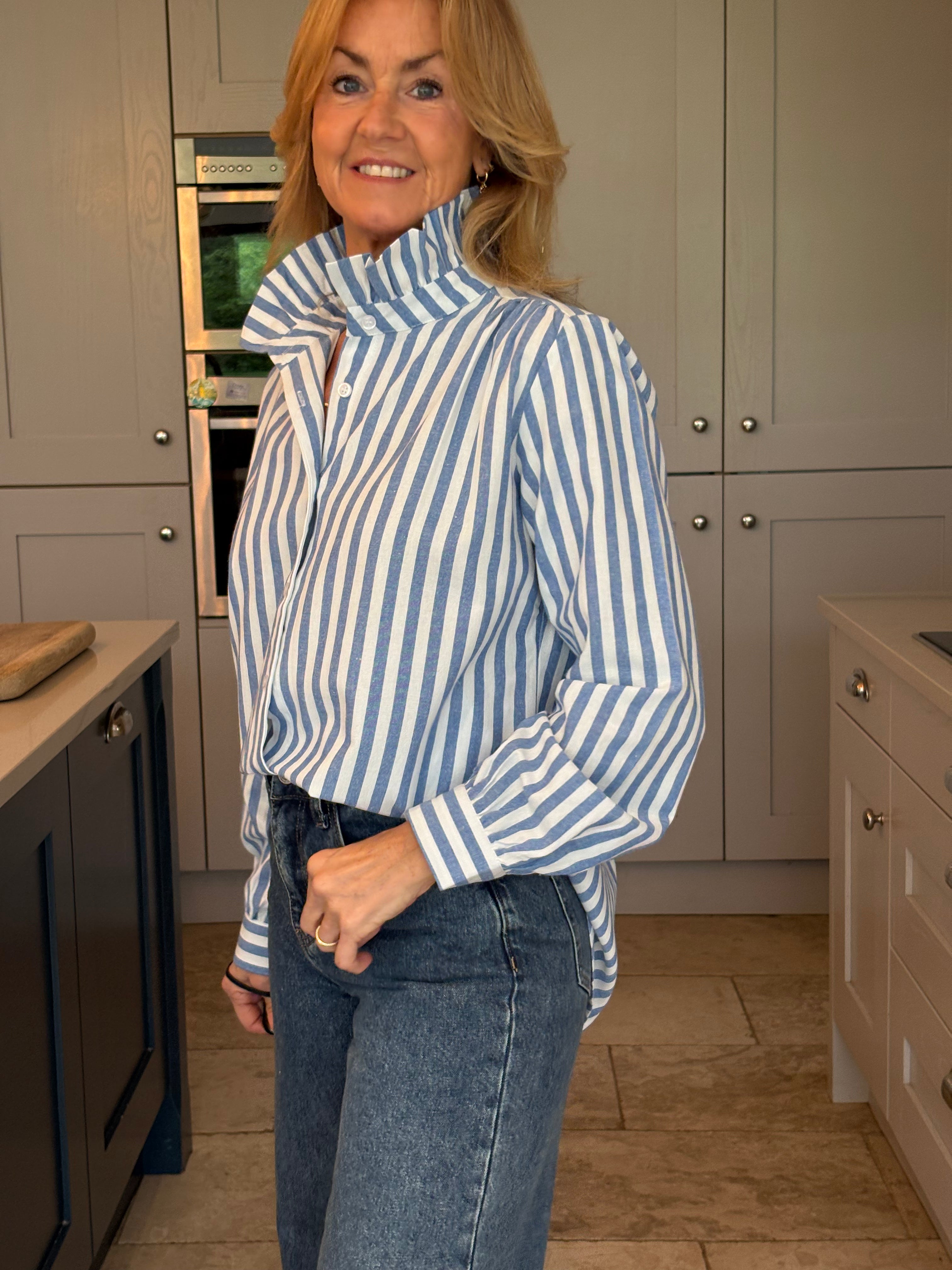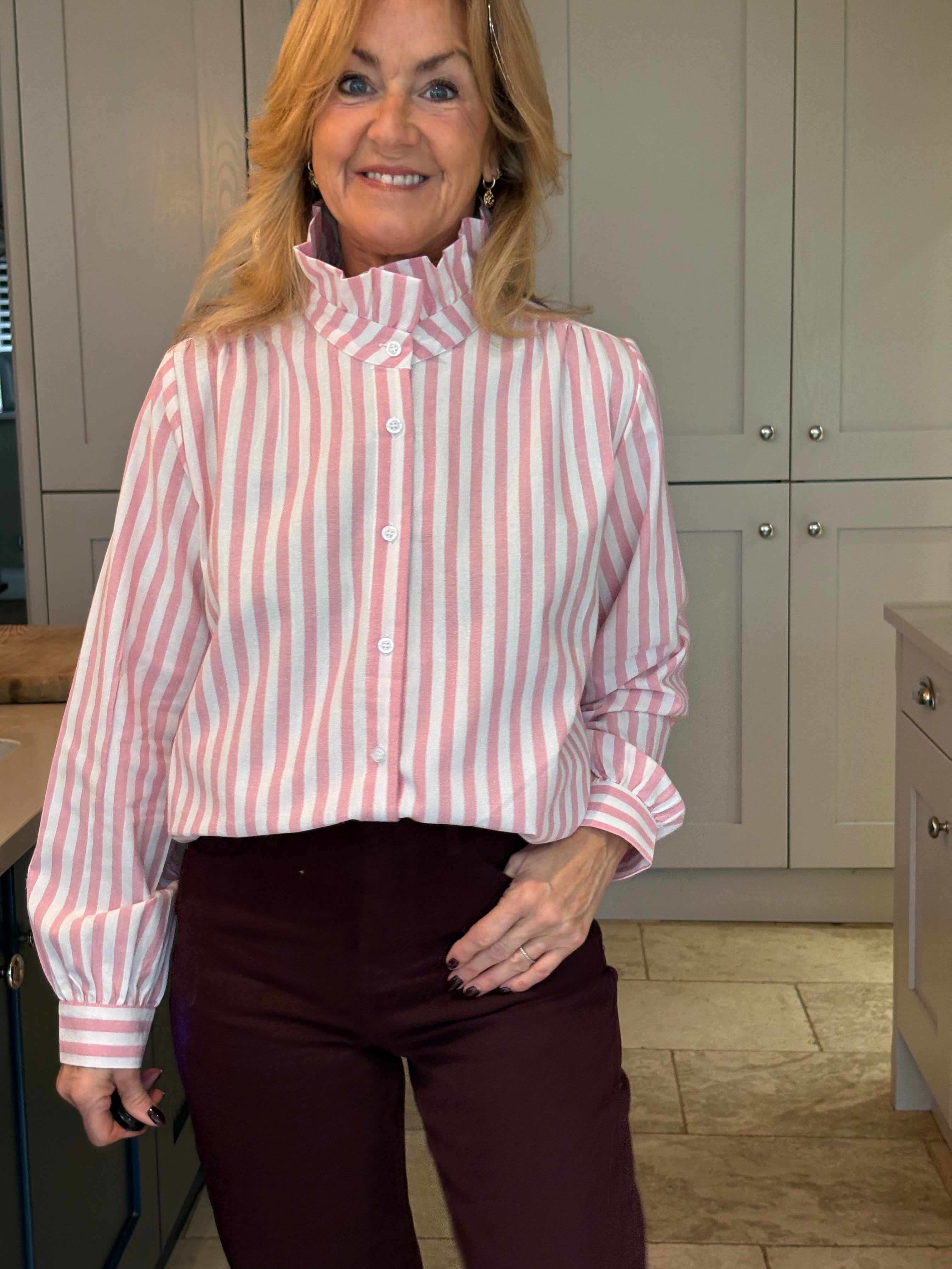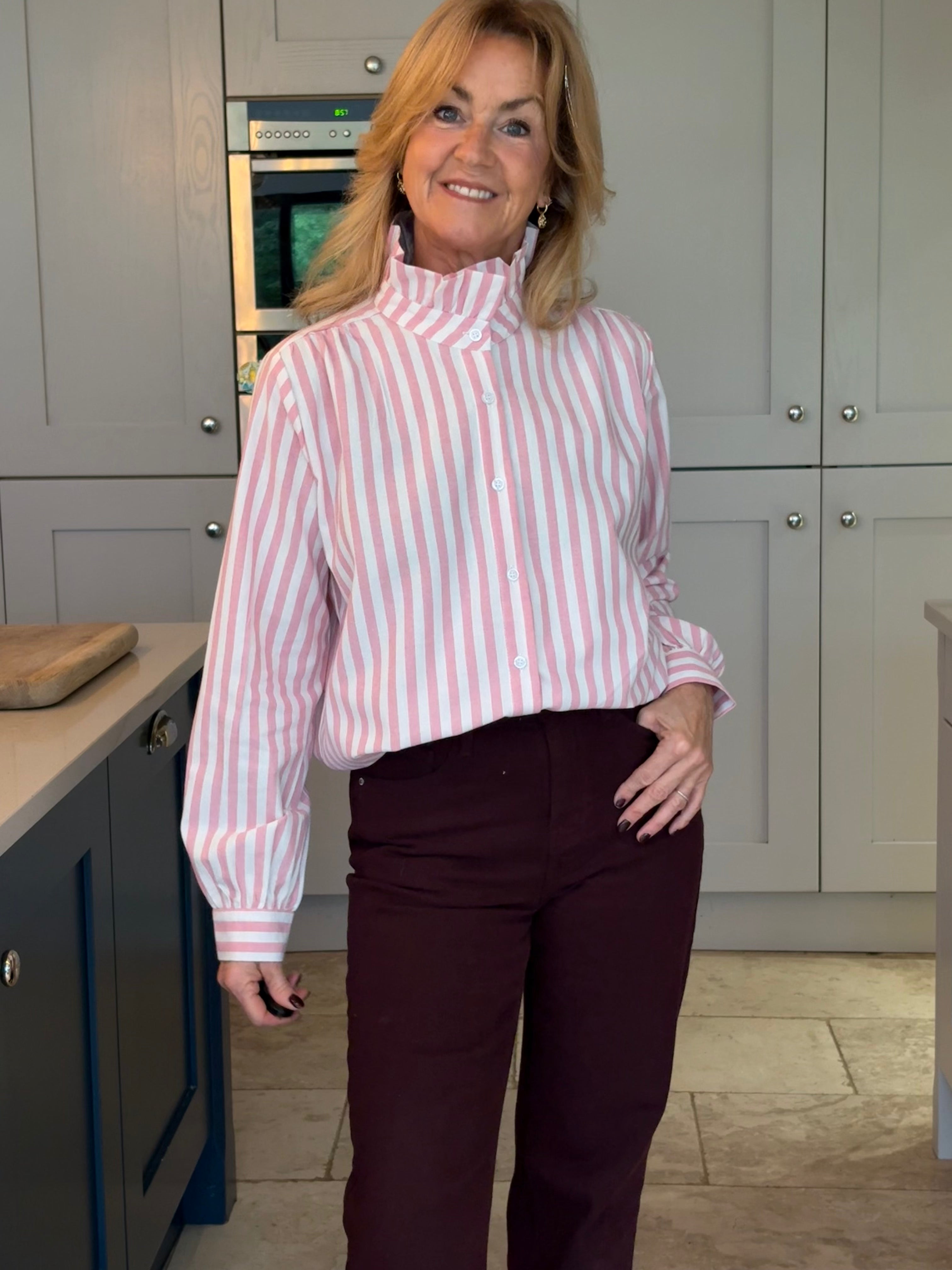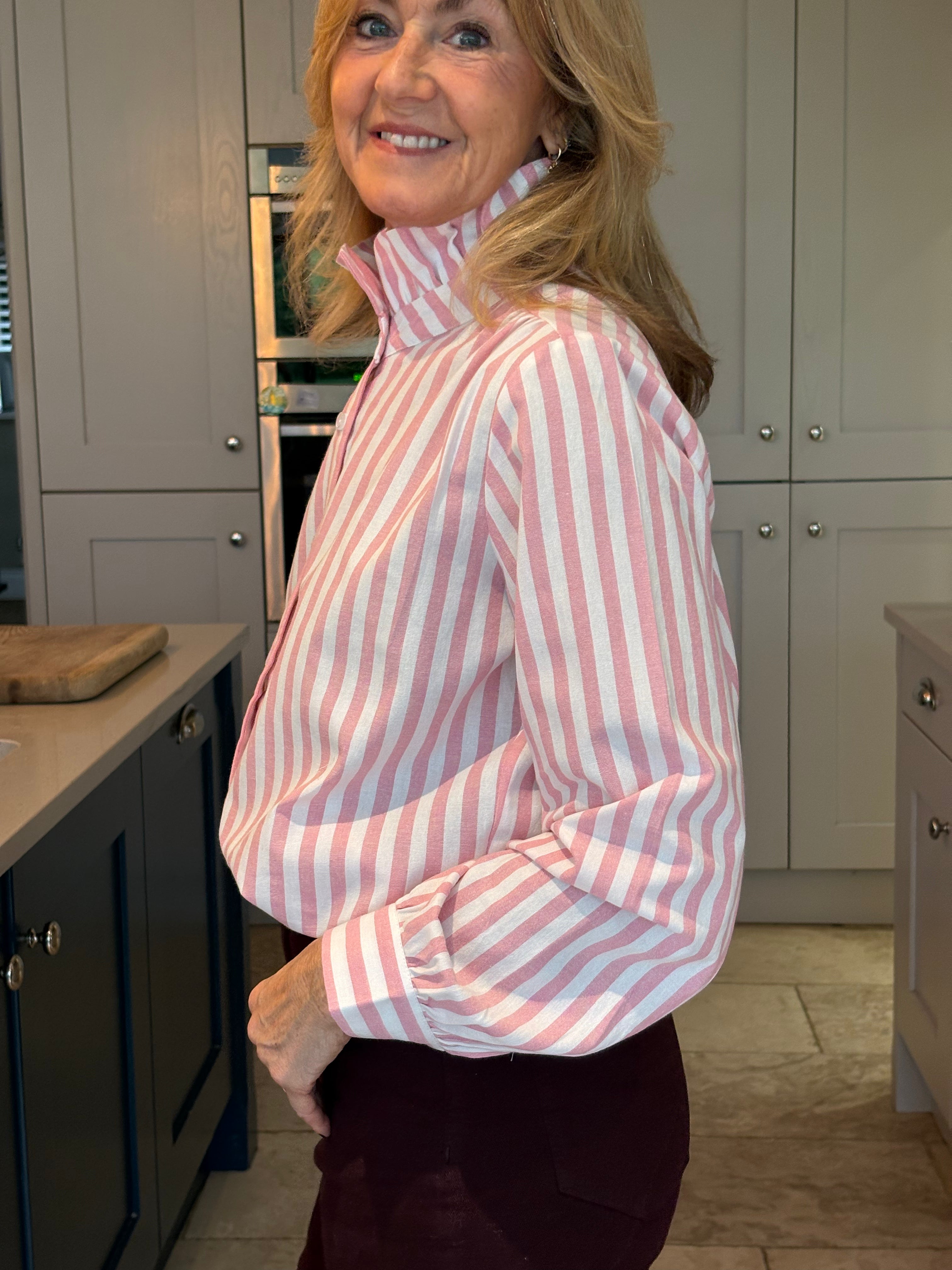 This gorgeous striped khaki and cream cotton shirt is a perfect blend of sophistication and casual charm. Featuring a classic shirt hemline, it offers a timeless silhouette that flatters a variety of body types. The high pleated collar adds a unique touch, elevating the overall design and making it a standout piece in your wardrobe. The puffed sleeves, finished with stylish cuffs, contribute to its feminine appeal while providing a comfortable fit. This shirt is incredibly versatile; you can dress it up by pairing it with tailored trousers or a chic skirt for a polished look. Alternatively, it can be worn casually under a cosy jumper, allowing the high collar to peek out for an effortlessly stylish ensemble.