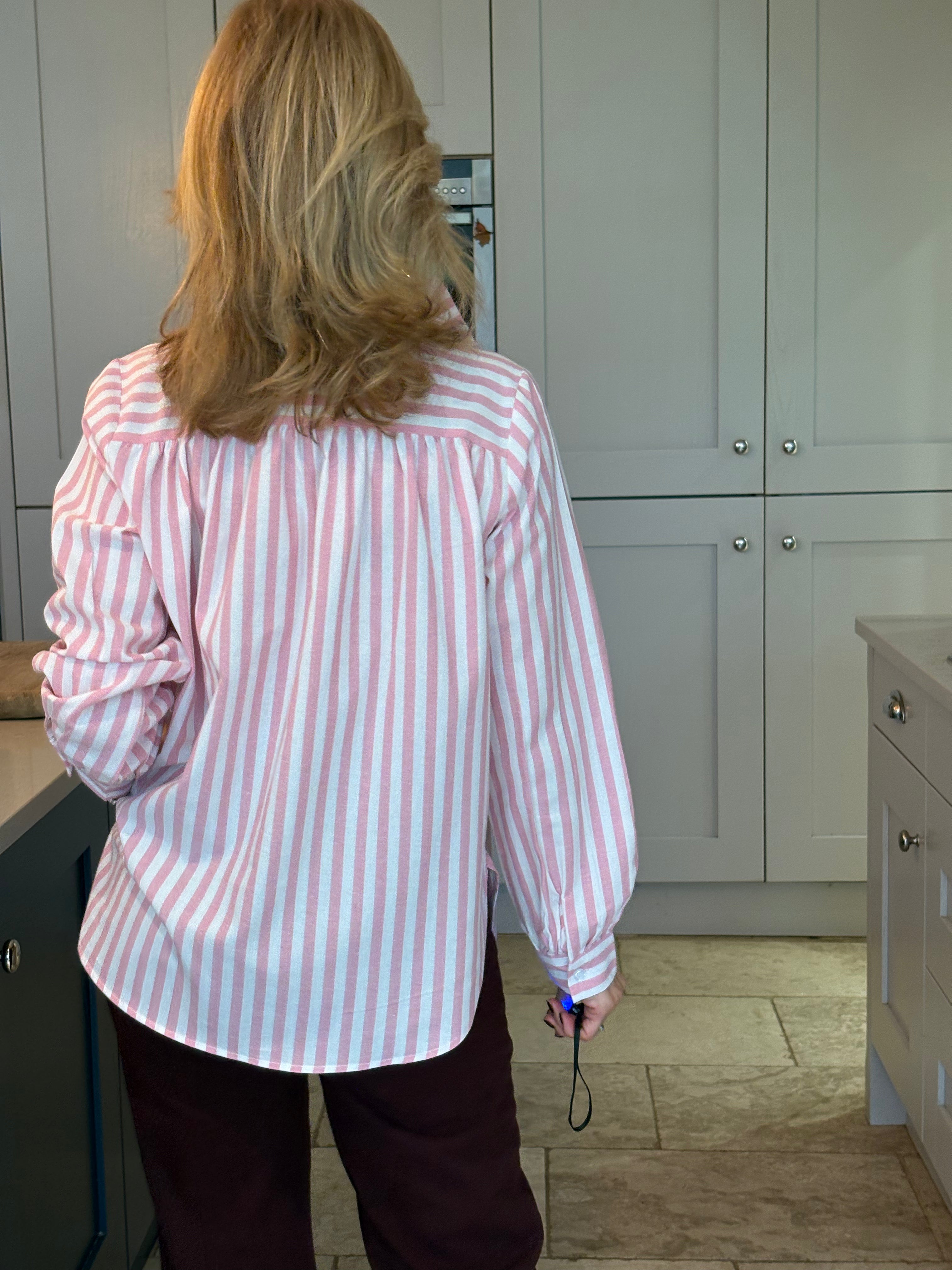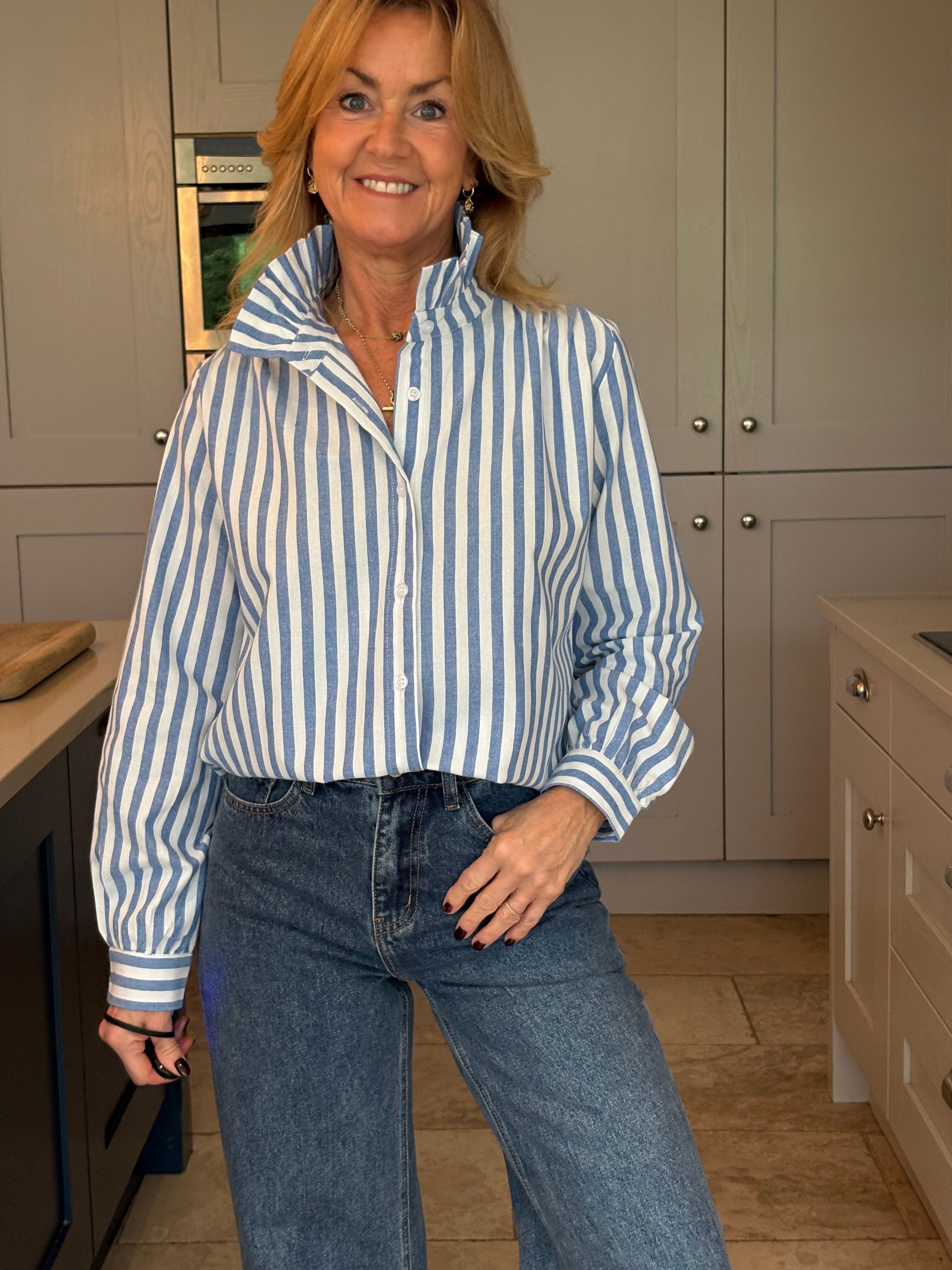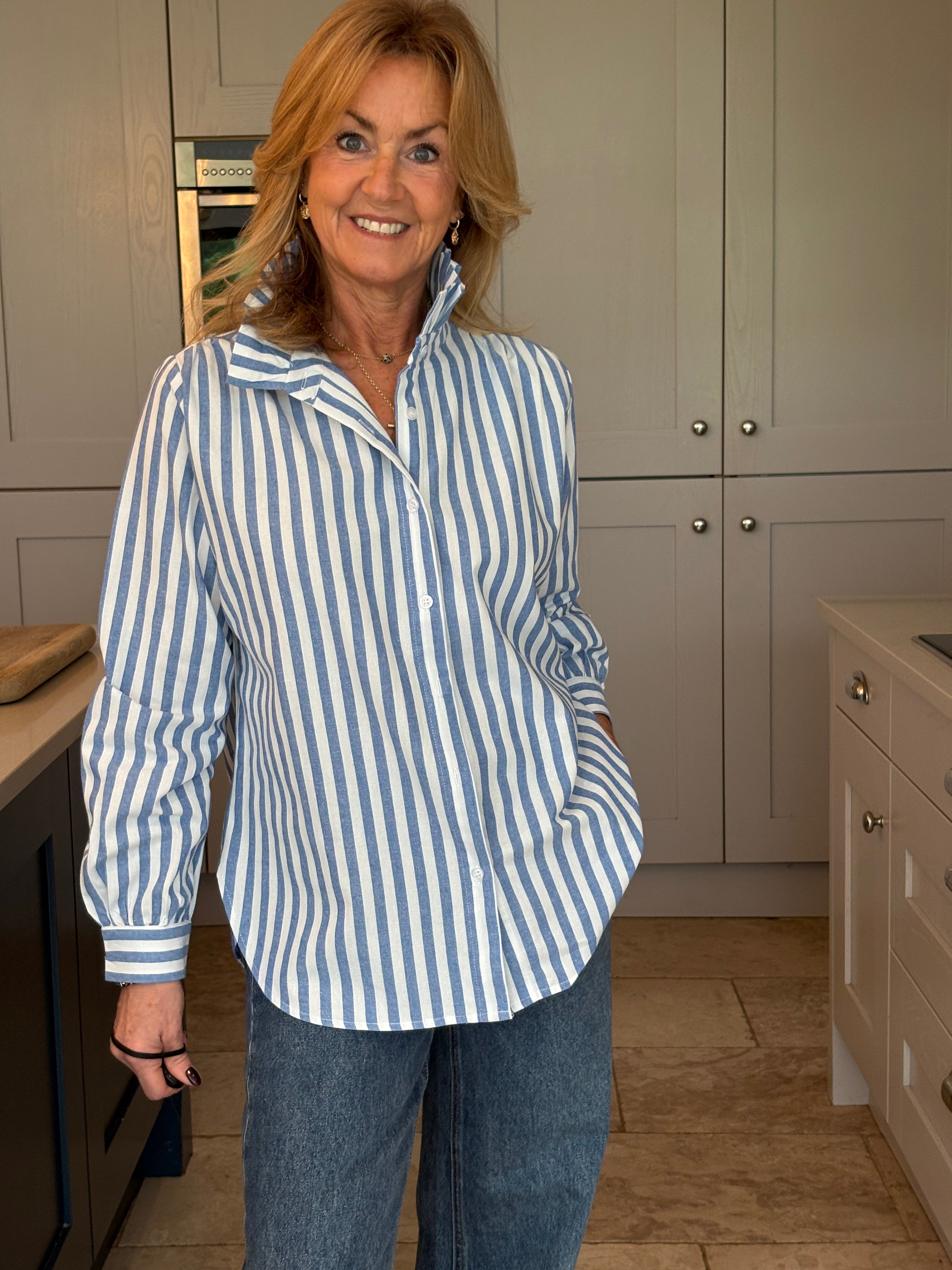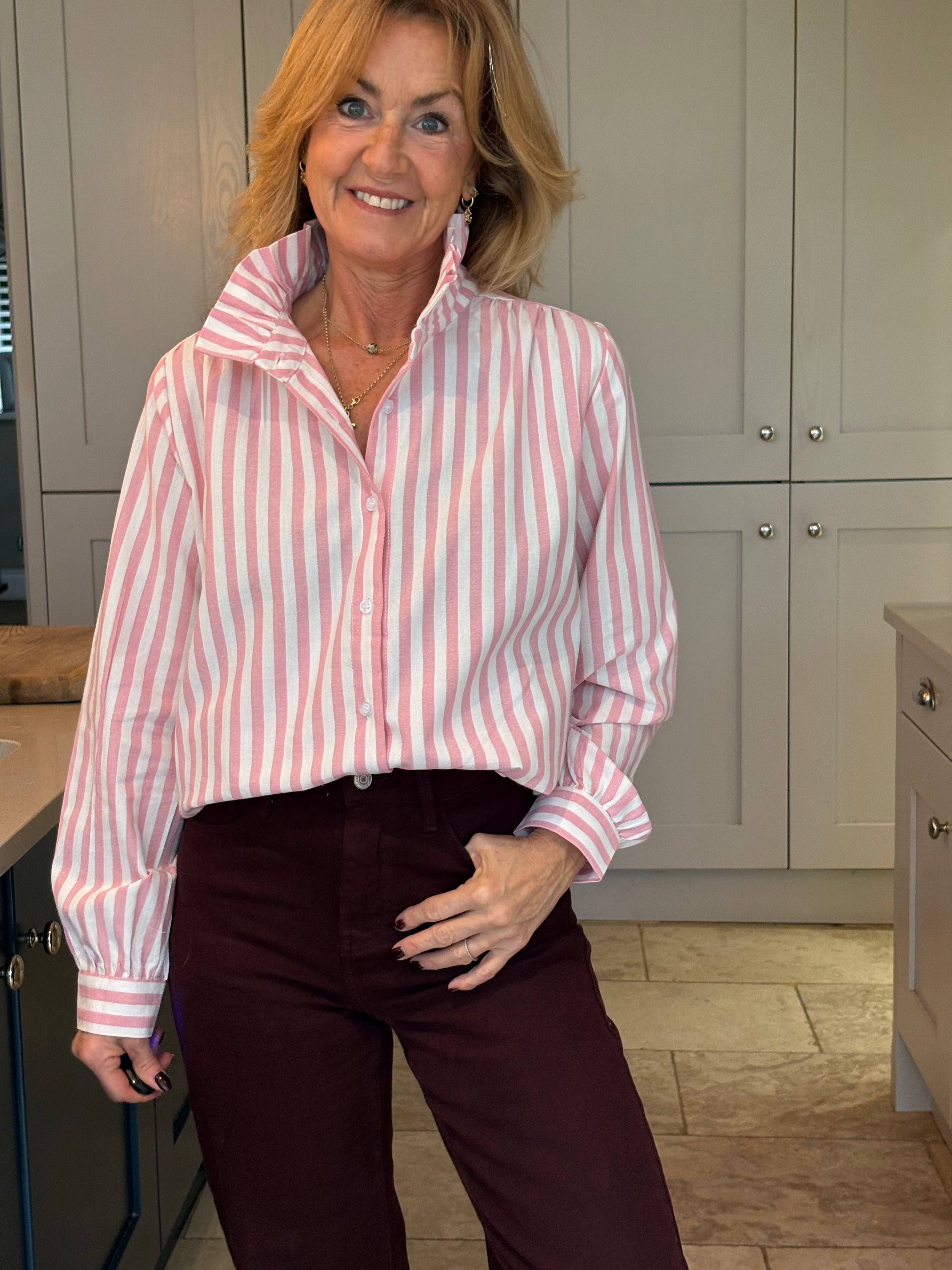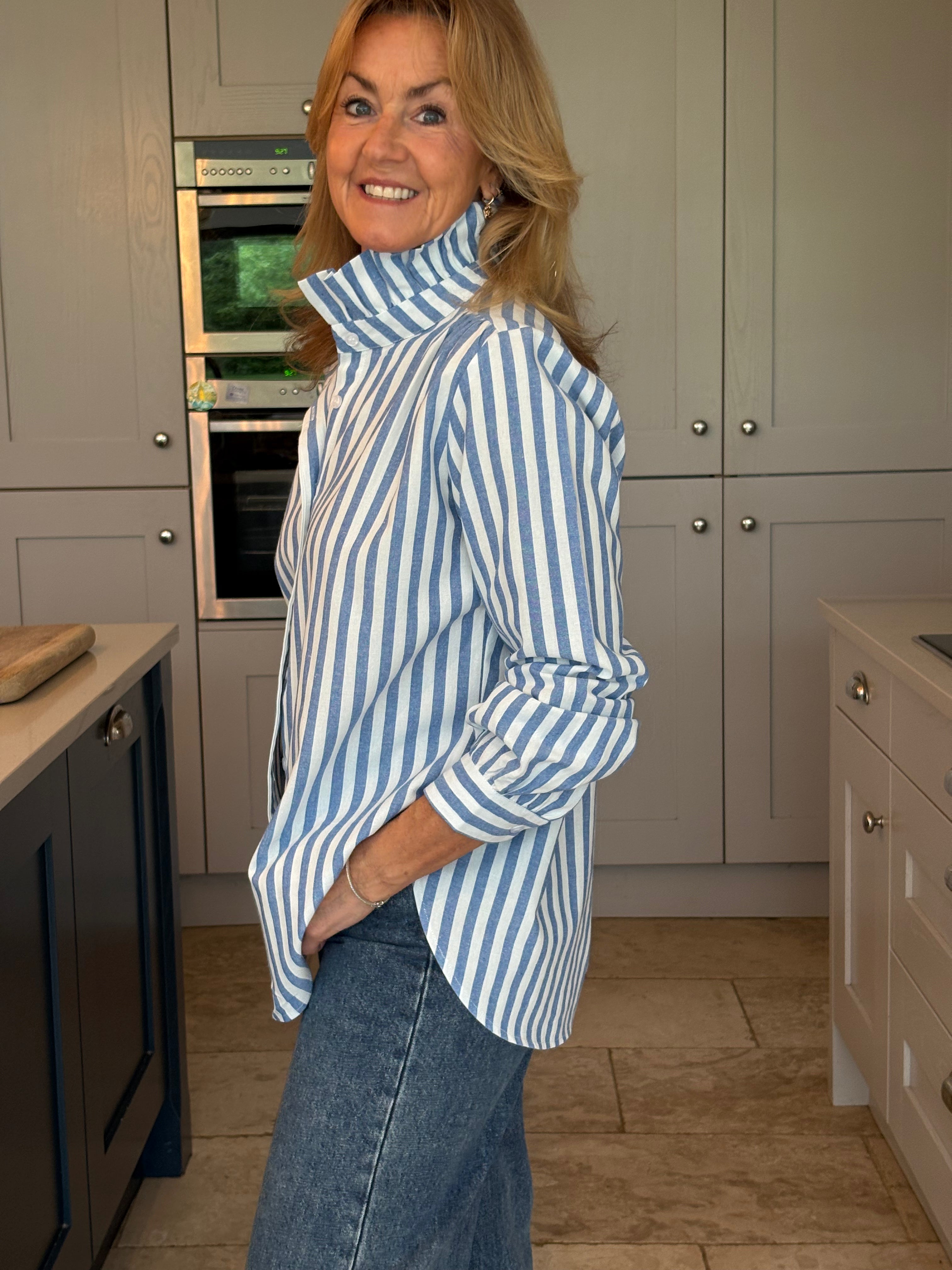 This gorgeous striped khaki and cream cotton shirt is a perfect blend of sophistication and casual charm. Featuring a classic shirt hemline, it offers a timeless silhouette that flatters a variety of body types. The high pleated collar adds a unique touch, elevating the overall design and making it a standout piece in your wardrobe. The puffed sleeves, finished with stylish cuffs, contribute to its feminine appeal while providing a comfortable fit. This shirt is incredibly versatile; you can dress it up by pairing it with tailored trousers or a chic skirt for a polished look. Alternatively, it can be worn casually under a cosy jumper, allowing the high collar to peek out for an effortlessly stylish ensemble.