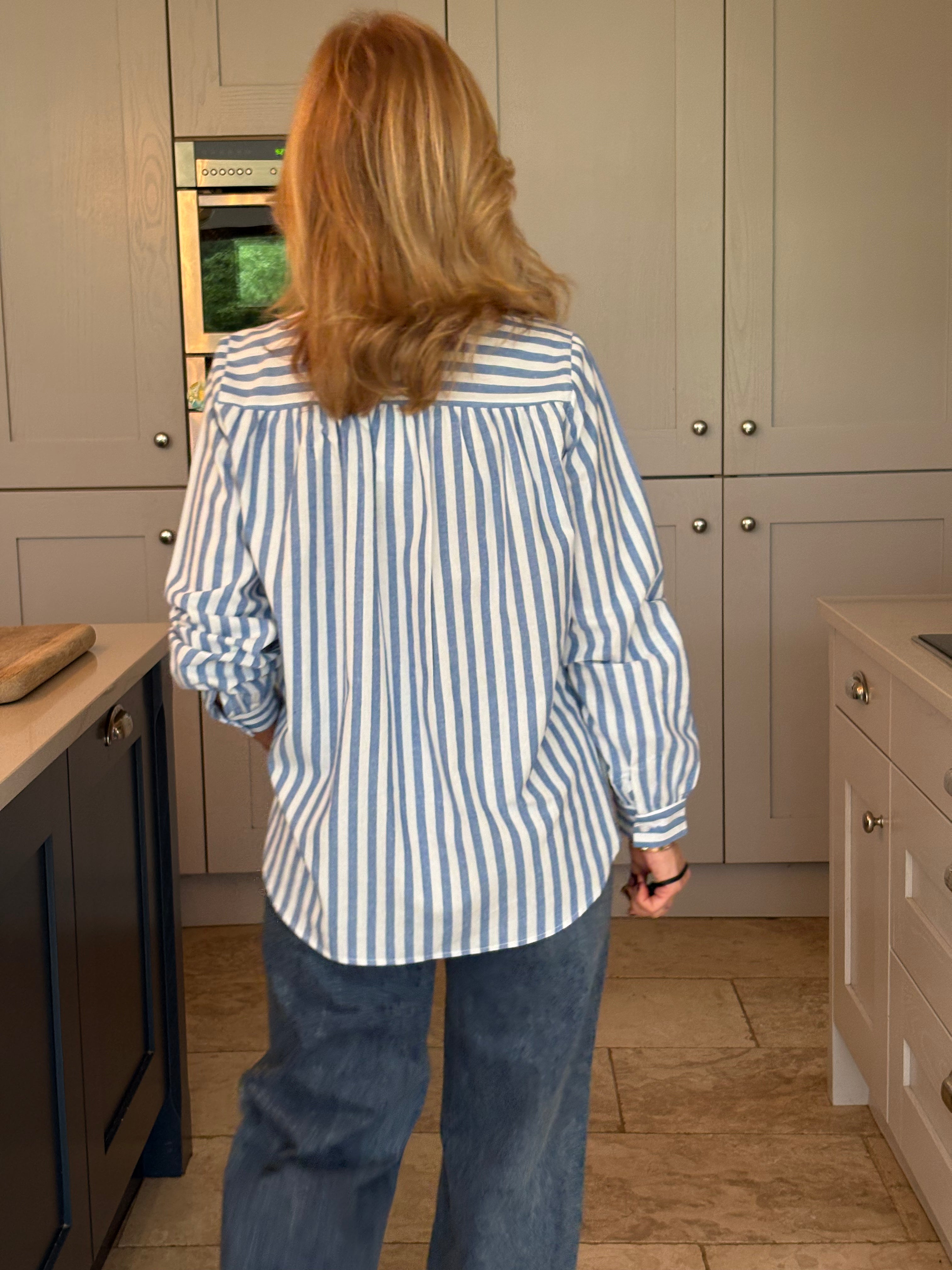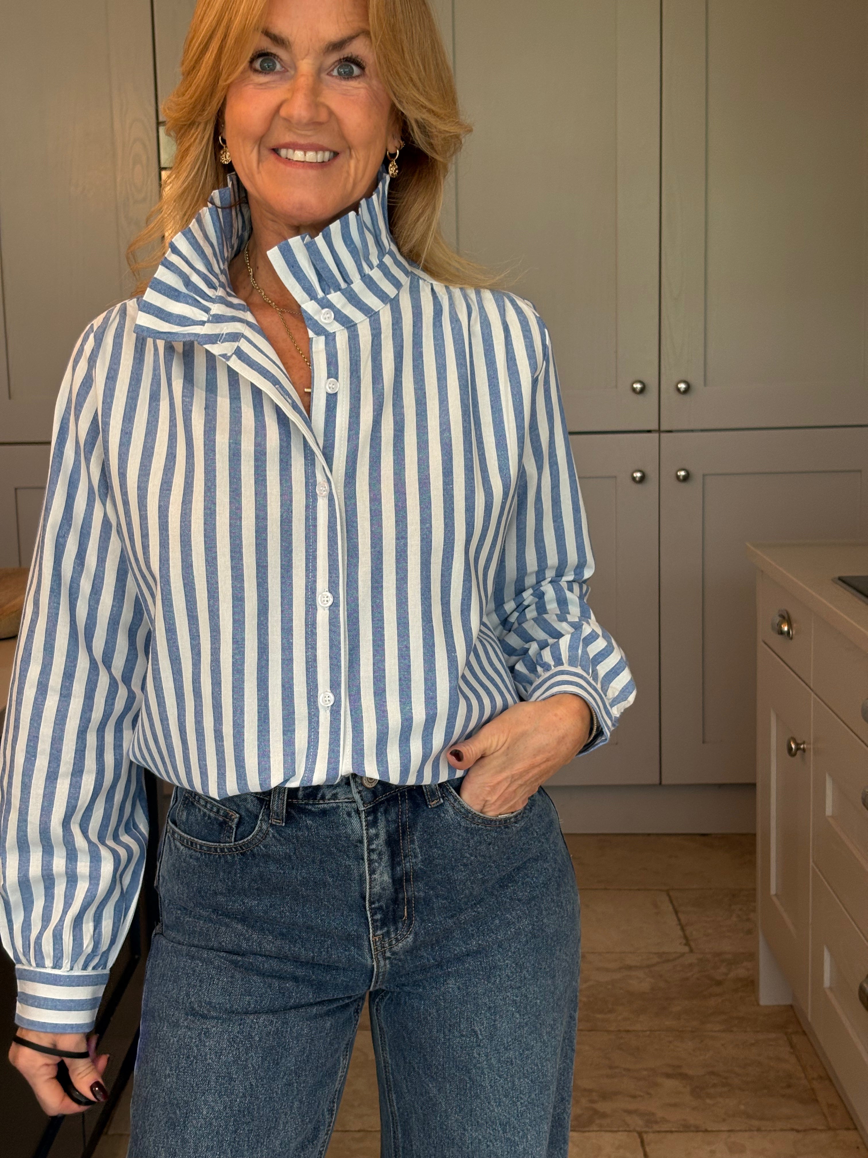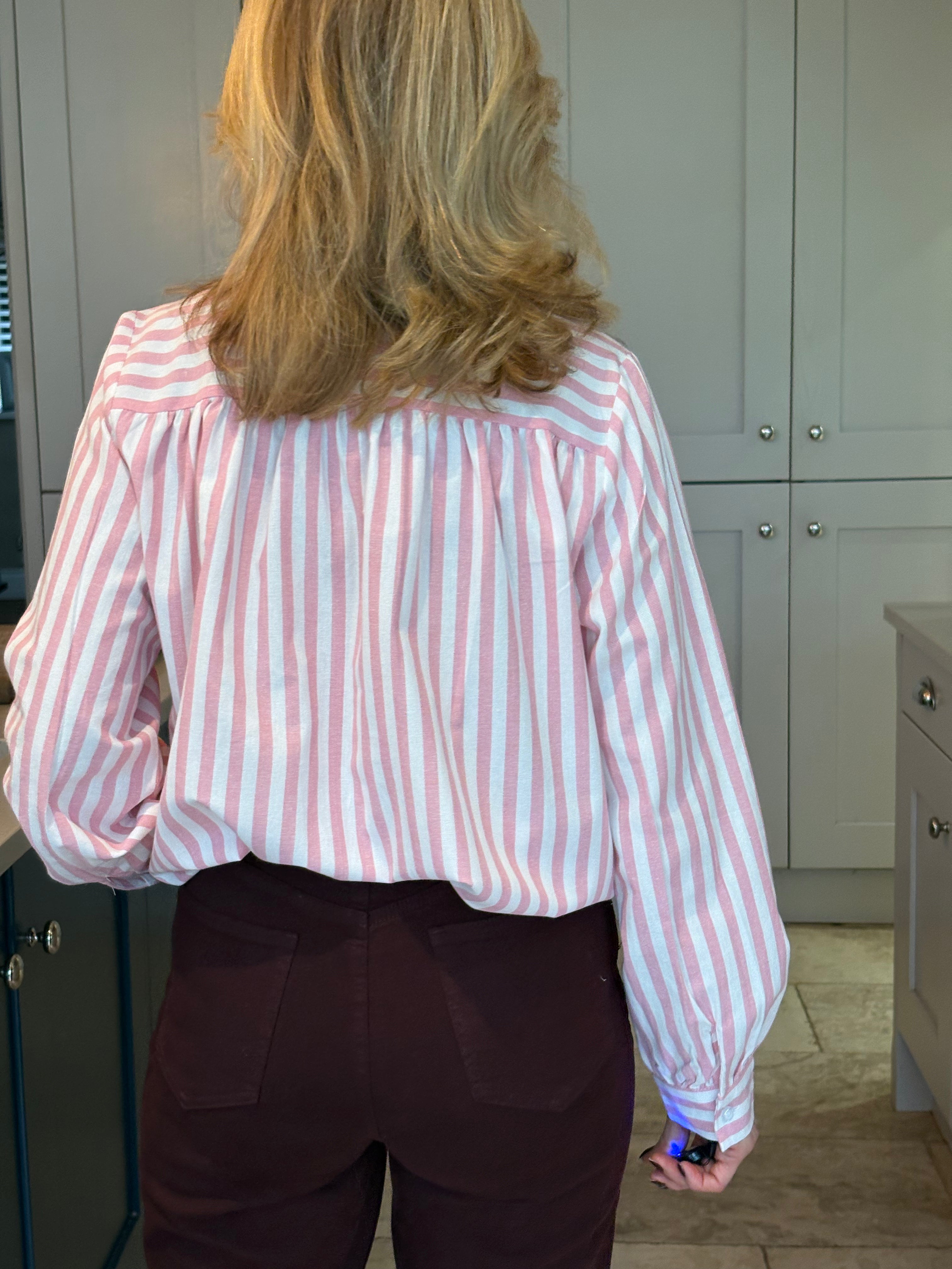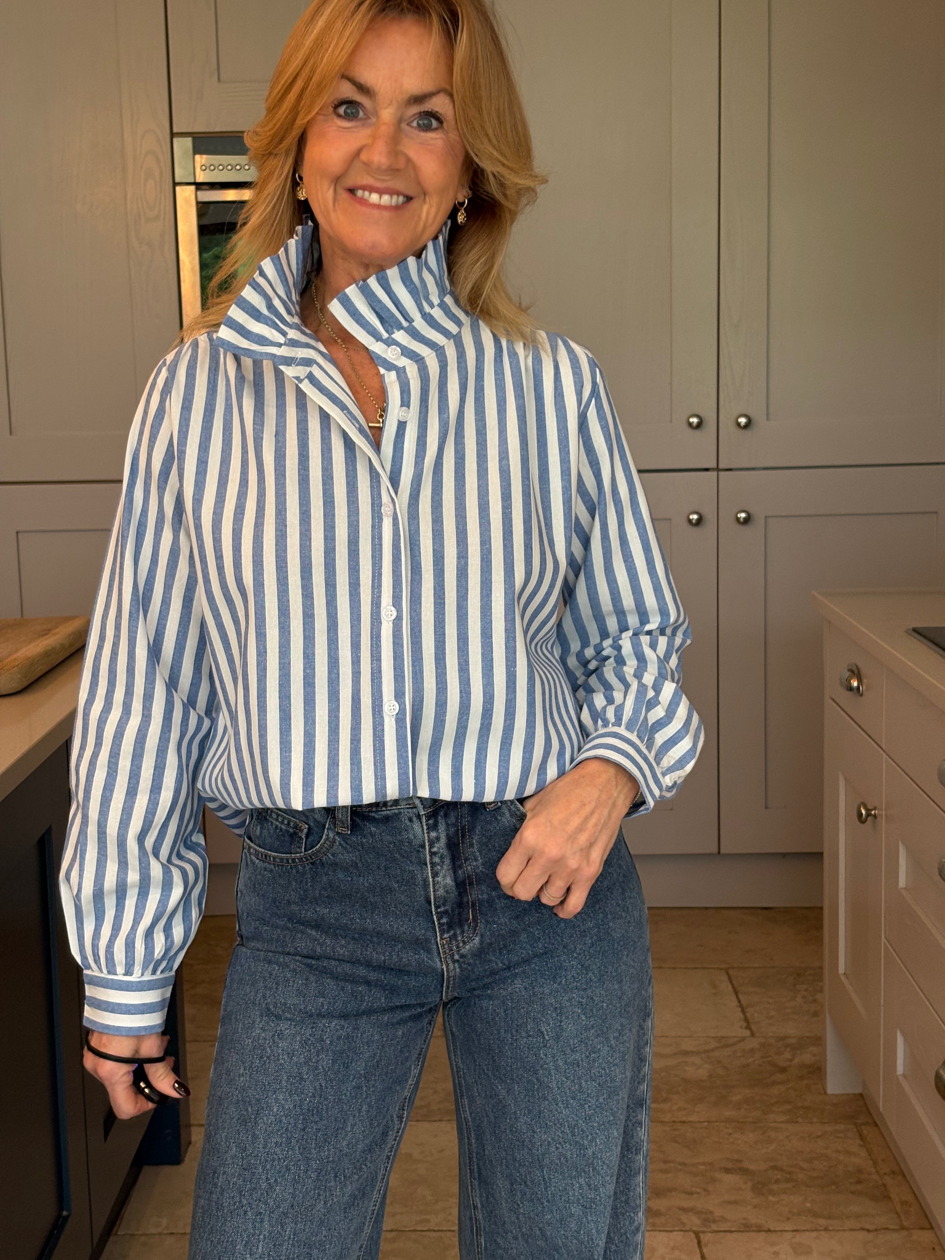 This gorgeous striped khaki and cream cotton shirt is a perfect blend of sophistication and casual charm. Featuring a classic shirt hemline, it offers a timeless silhouette that flatters a variety of body types. The high pleated collar adds a unique touch, elevating the overall design and making it a standout piece in your wardrobe. The puffed sleeves, finished with stylish cuffs, contribute to its feminine appeal while providing a comfortable fit. This shirt is incredibly versatile; you can dress it up by pairing it with tailored trousers or a chic skirt for a polished look. Alternatively, it can be worn casually under a cosy jumper, allowing the high collar to peek out for an effortlessly stylish ensemble.