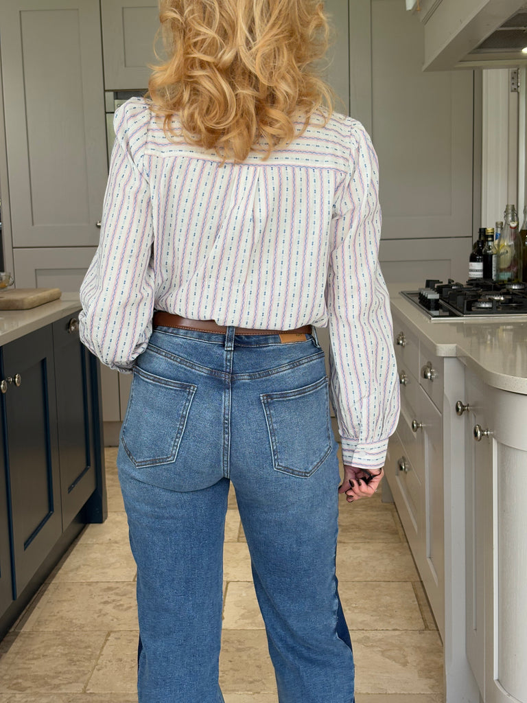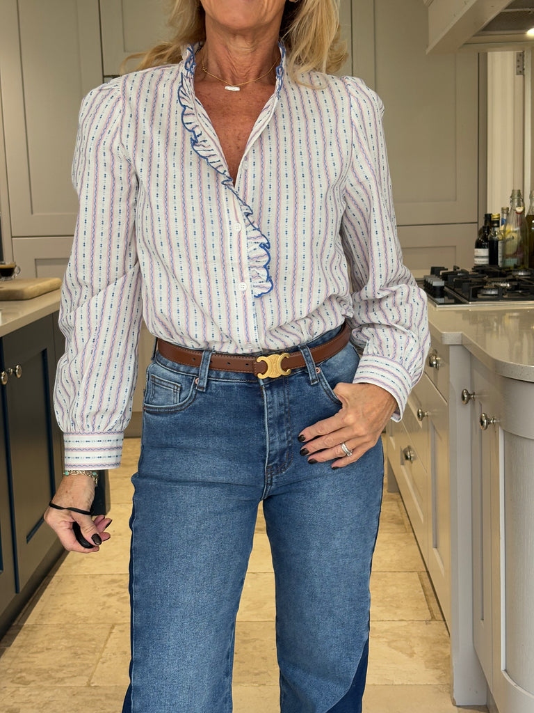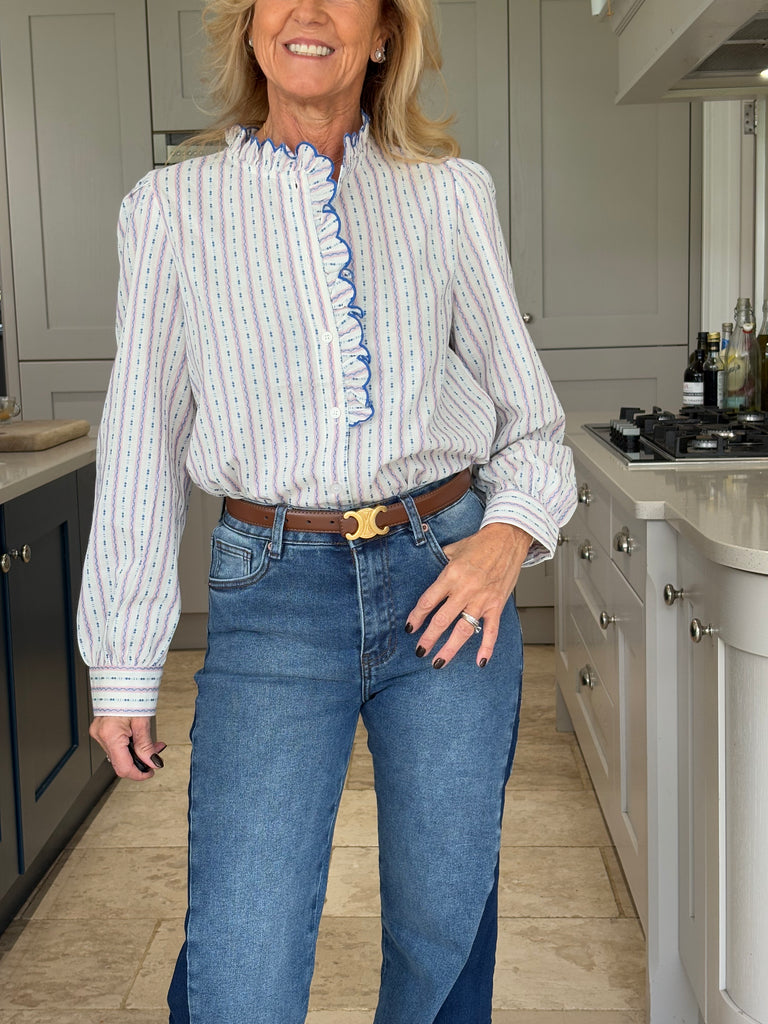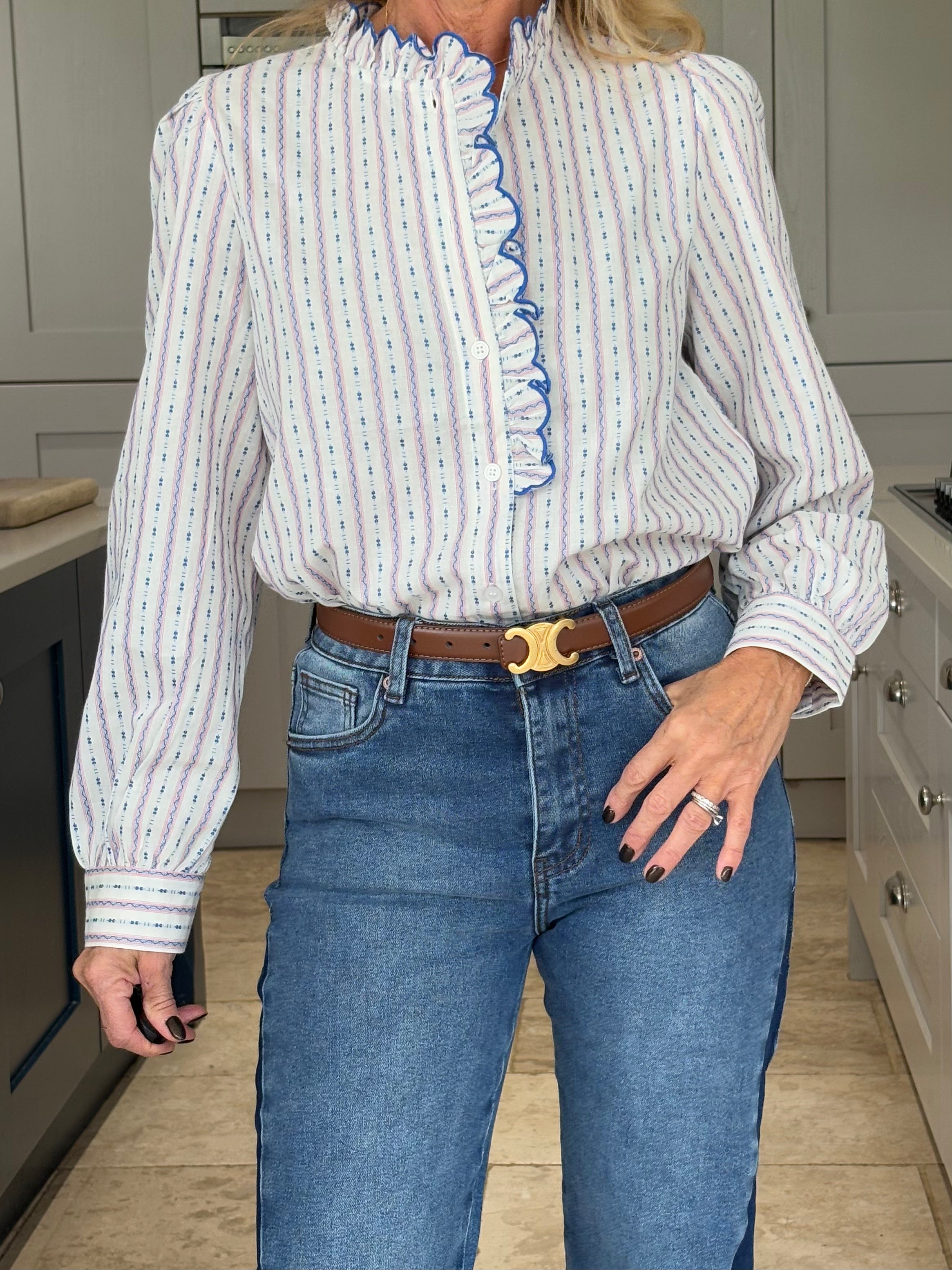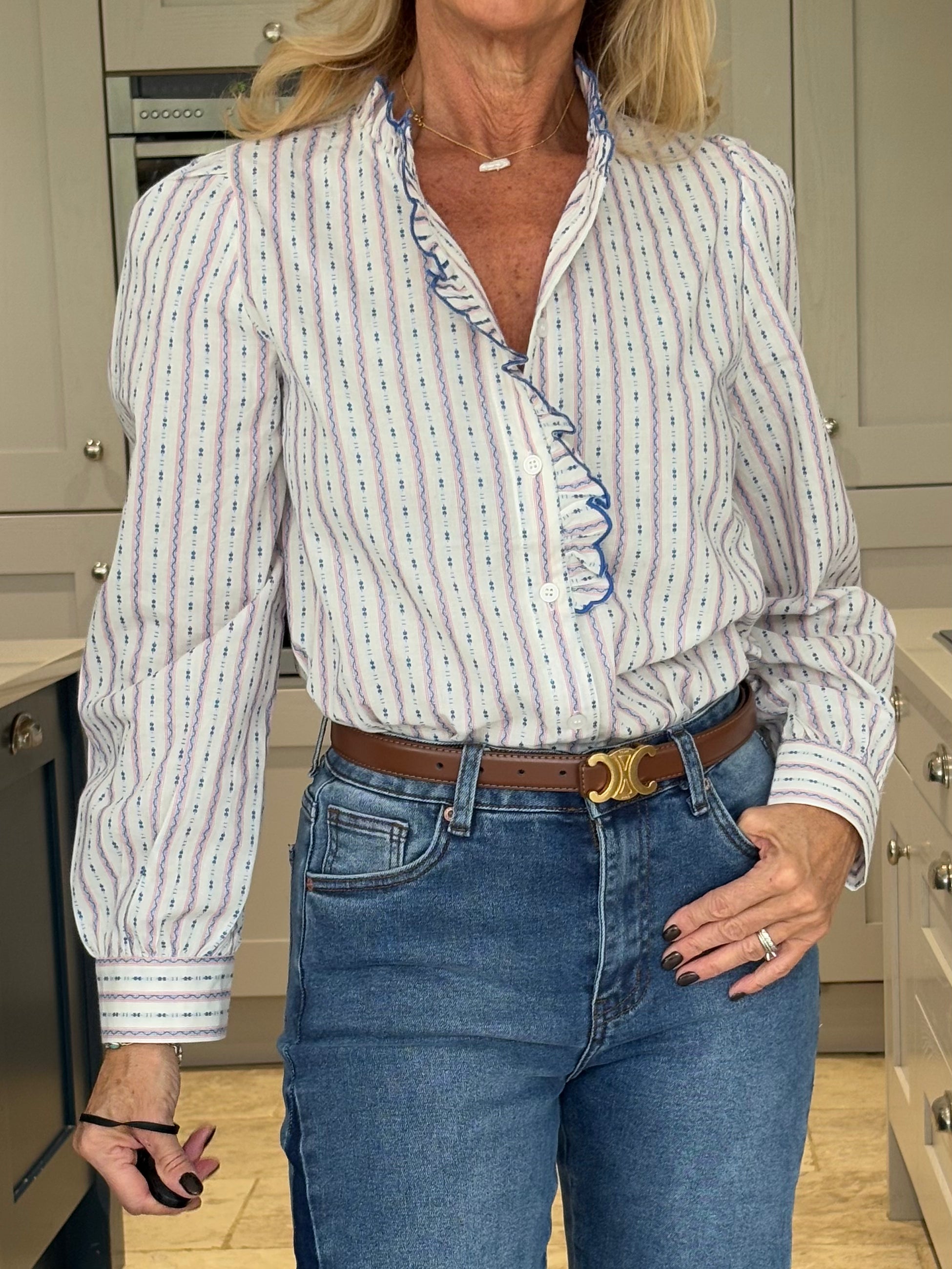 A pretty cotton blouse featuring a delicate stand-up frill collar that trails gracefully down the button front. Designed with gently puffed sleeves and a charming pink, blue, and cream pattern throughout, it’s a fresh, feminine piece that feels effortlessly girly and timelessly sweet.