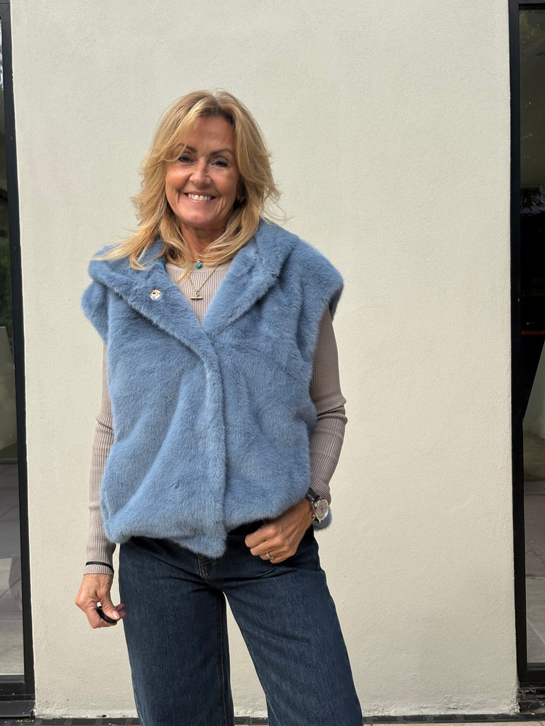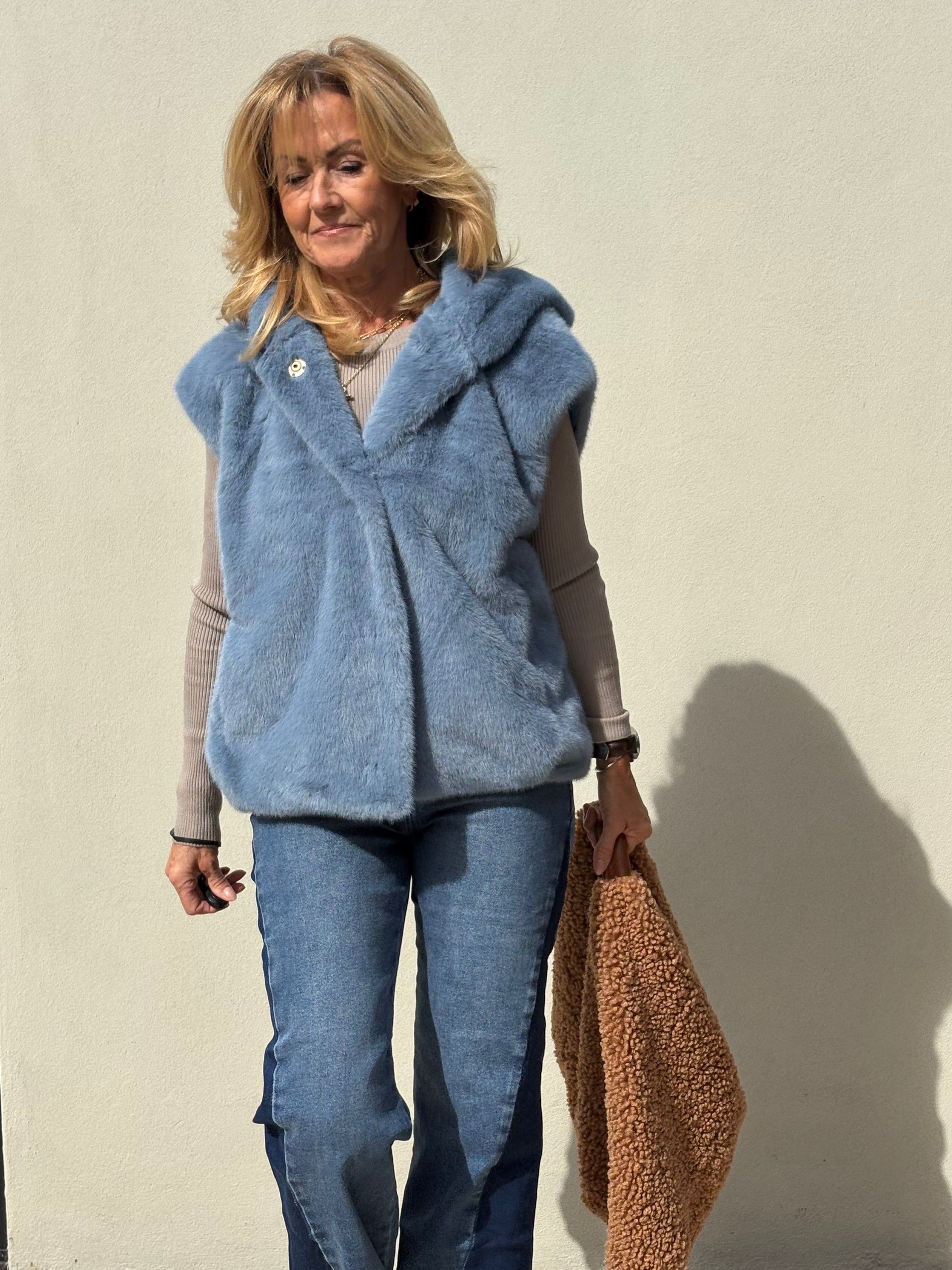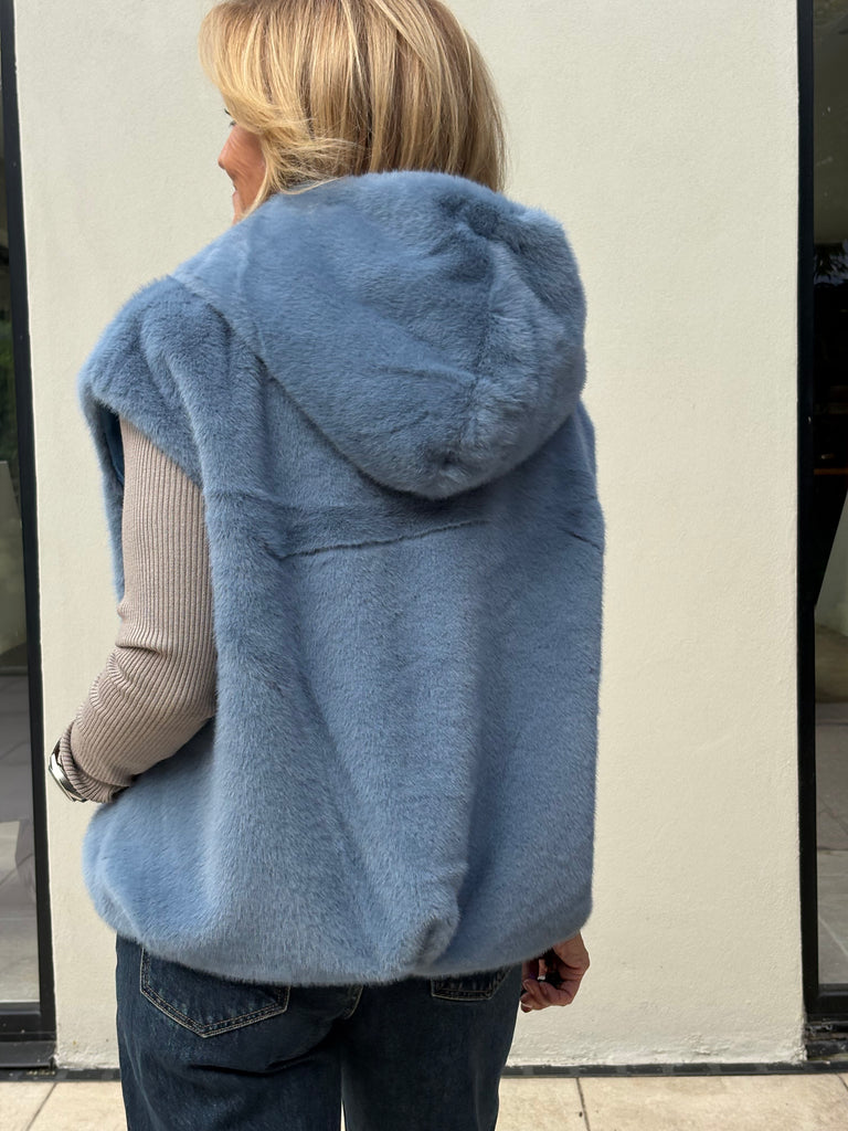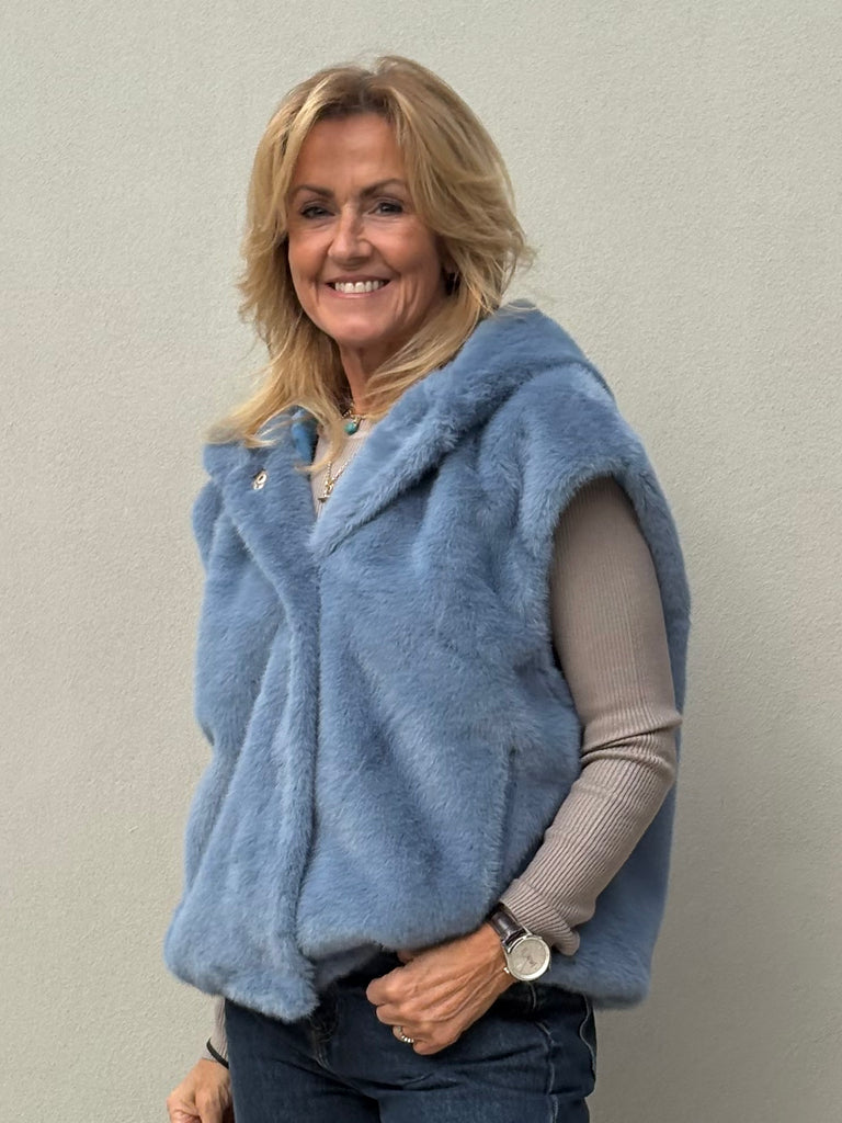 A statement layer in a soft cornflower blue, this gorgeous faux fur hooded gilet is designed in a chic blousy style that feels both feminine and elegant. Featuring a front closure and two side pockets, it’s as practical as it is stylish. Perfect for layering, it looks equally effortless over a denim or leather jacket, or simply thrown on top of a cosy jumper for a touch of playful glamour.