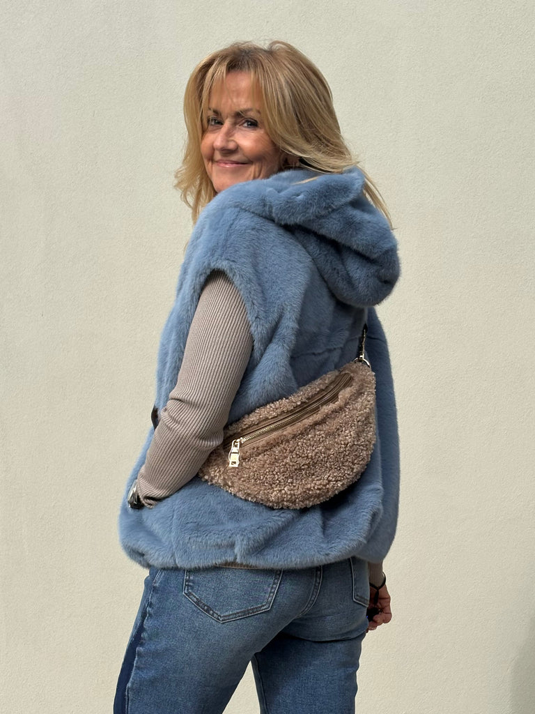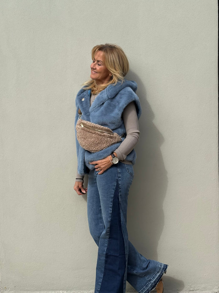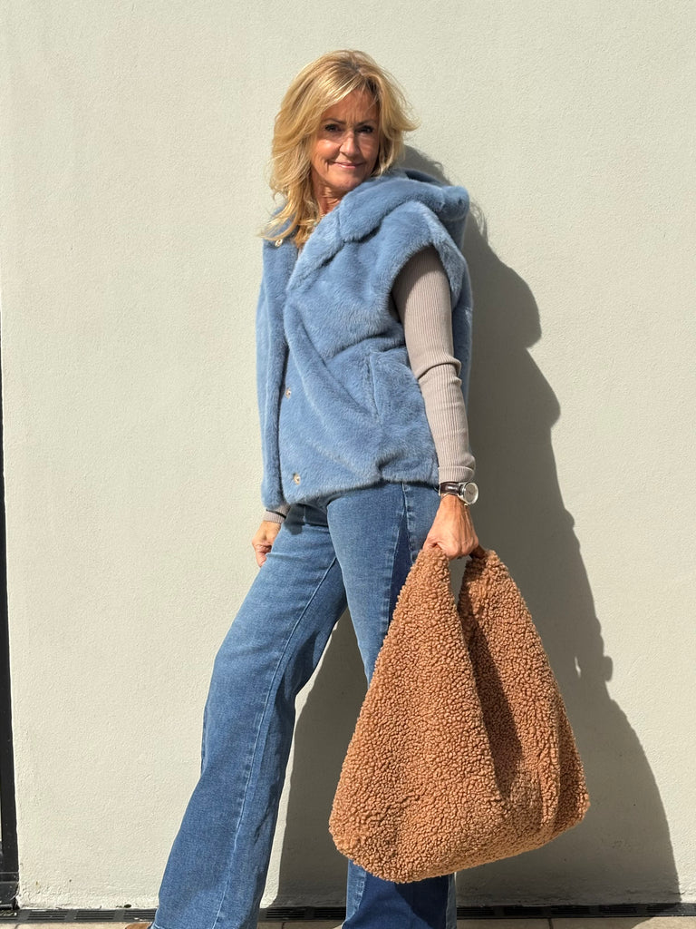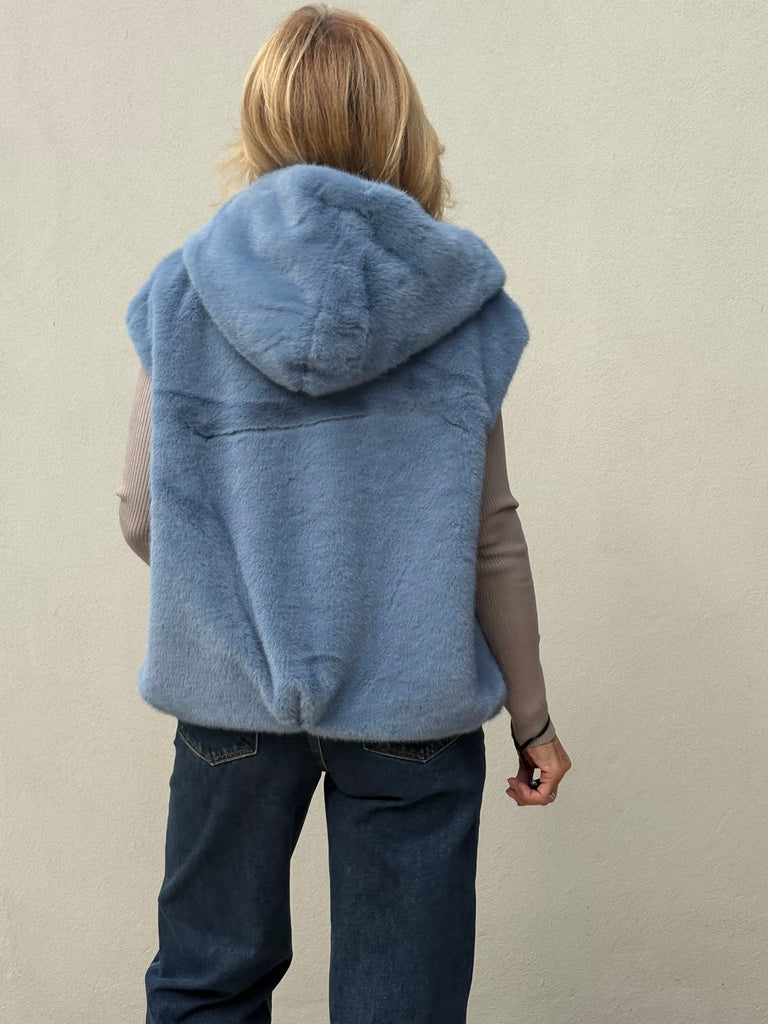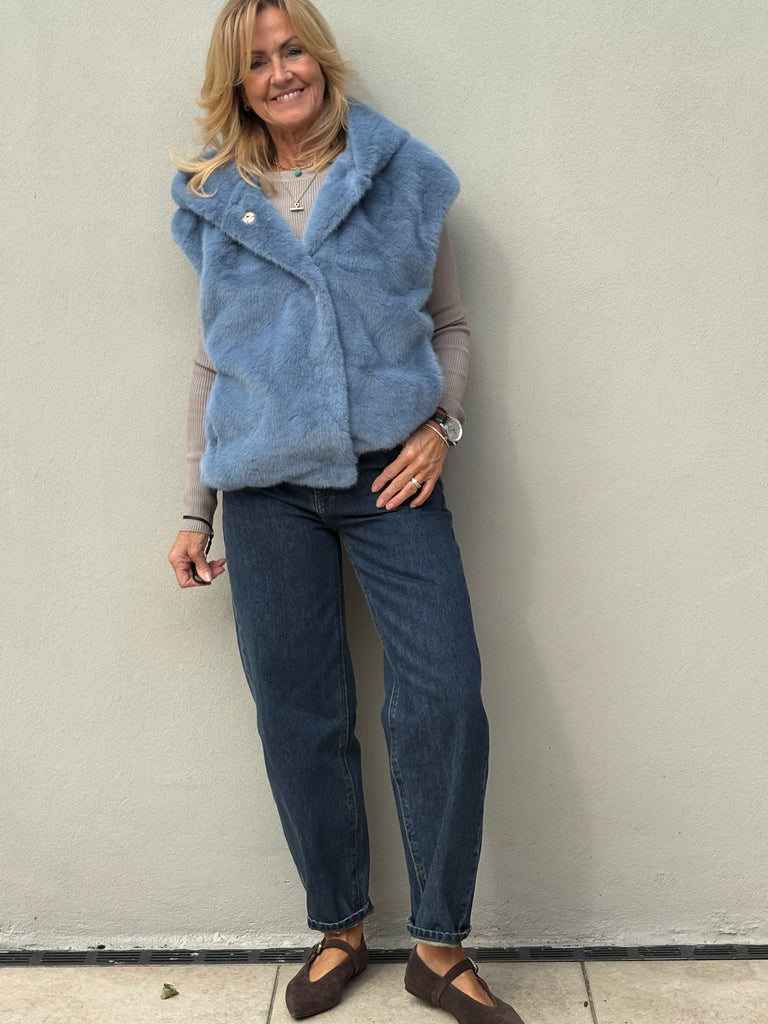 A statement layer in a soft cornflower blue, this gorgeous faux fur hooded gilet is designed in a chic blousy style that feels both feminine and elegant. Featuring a front closure and two side pockets, it’s as practical as it is stylish. Perfect for layering, it looks equally effortless over a denim or leather jacket, or simply thrown on top of a cosy jumper for a touch of playful glamour.