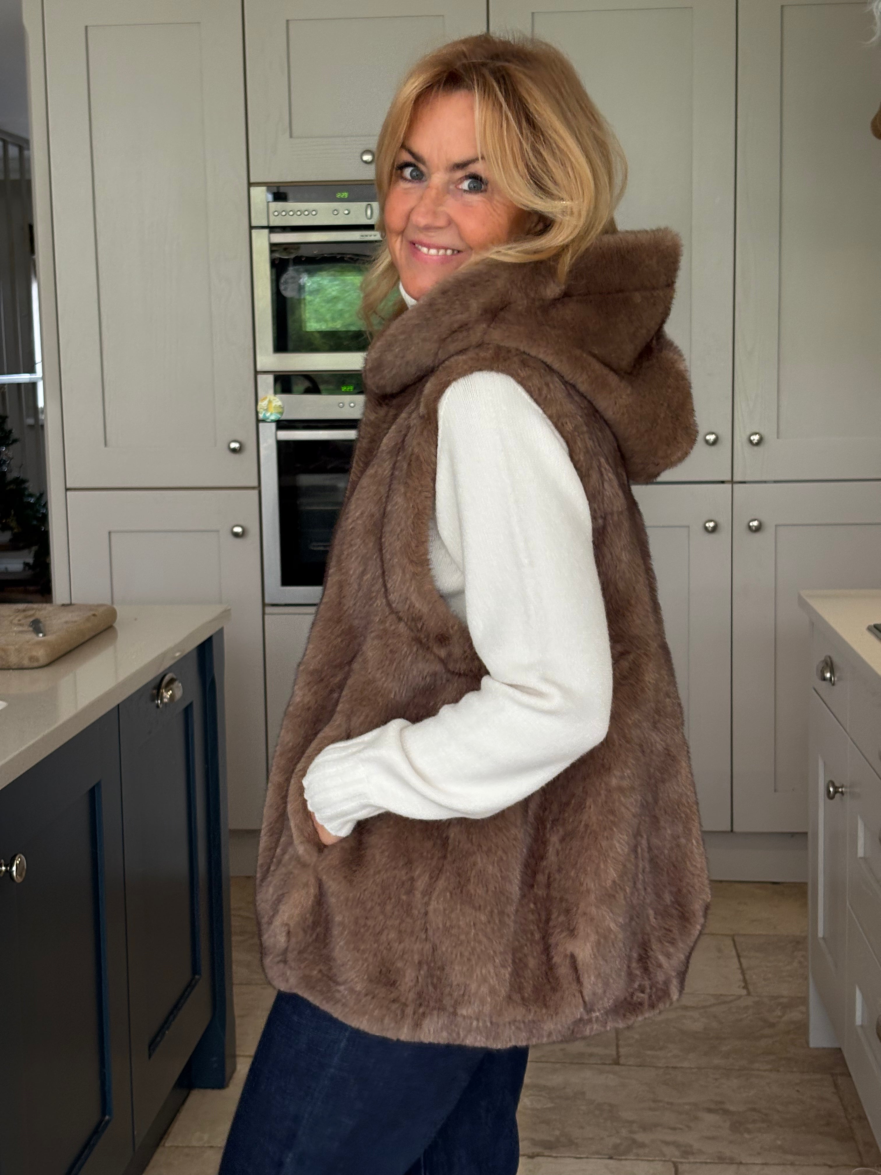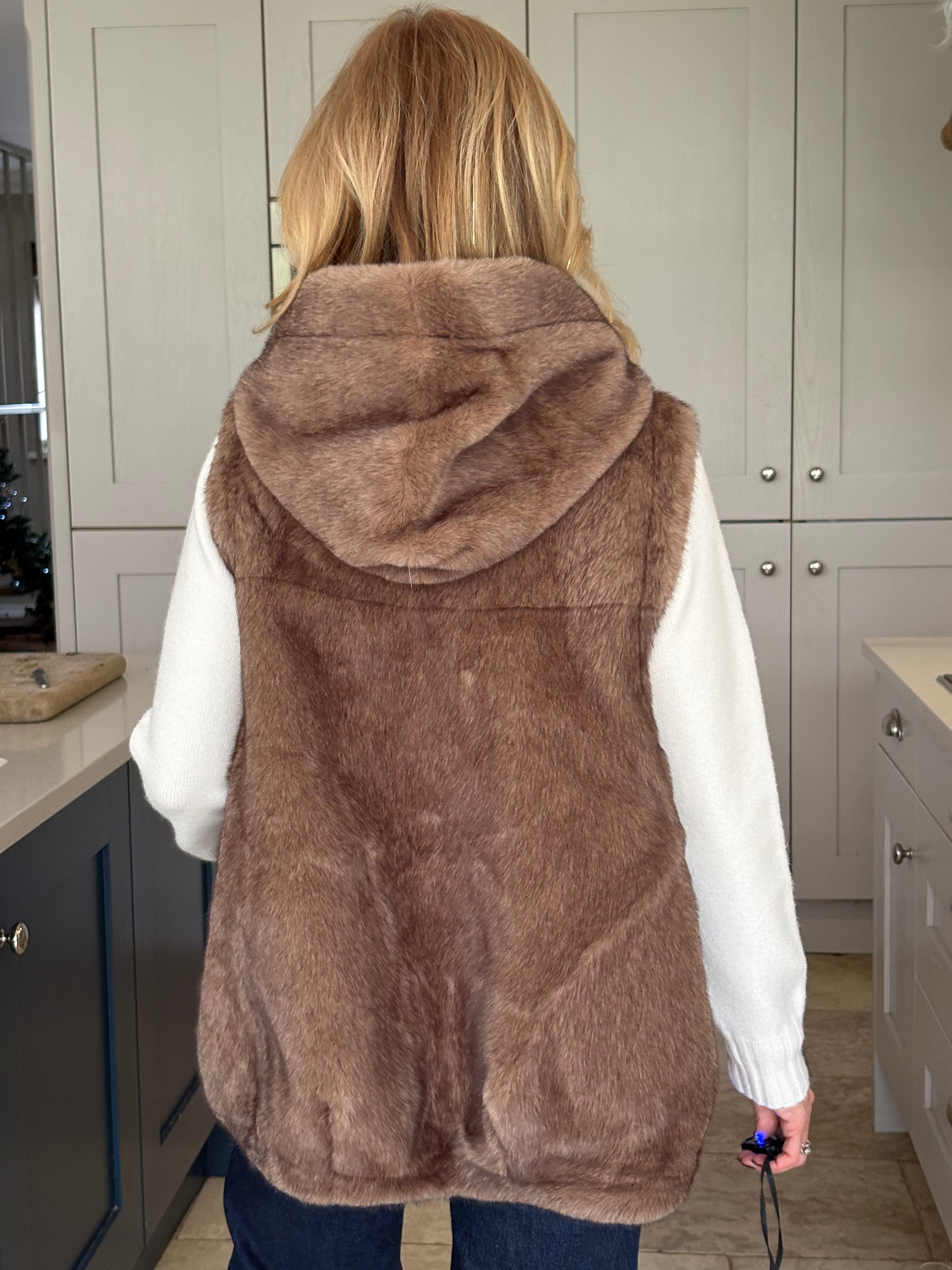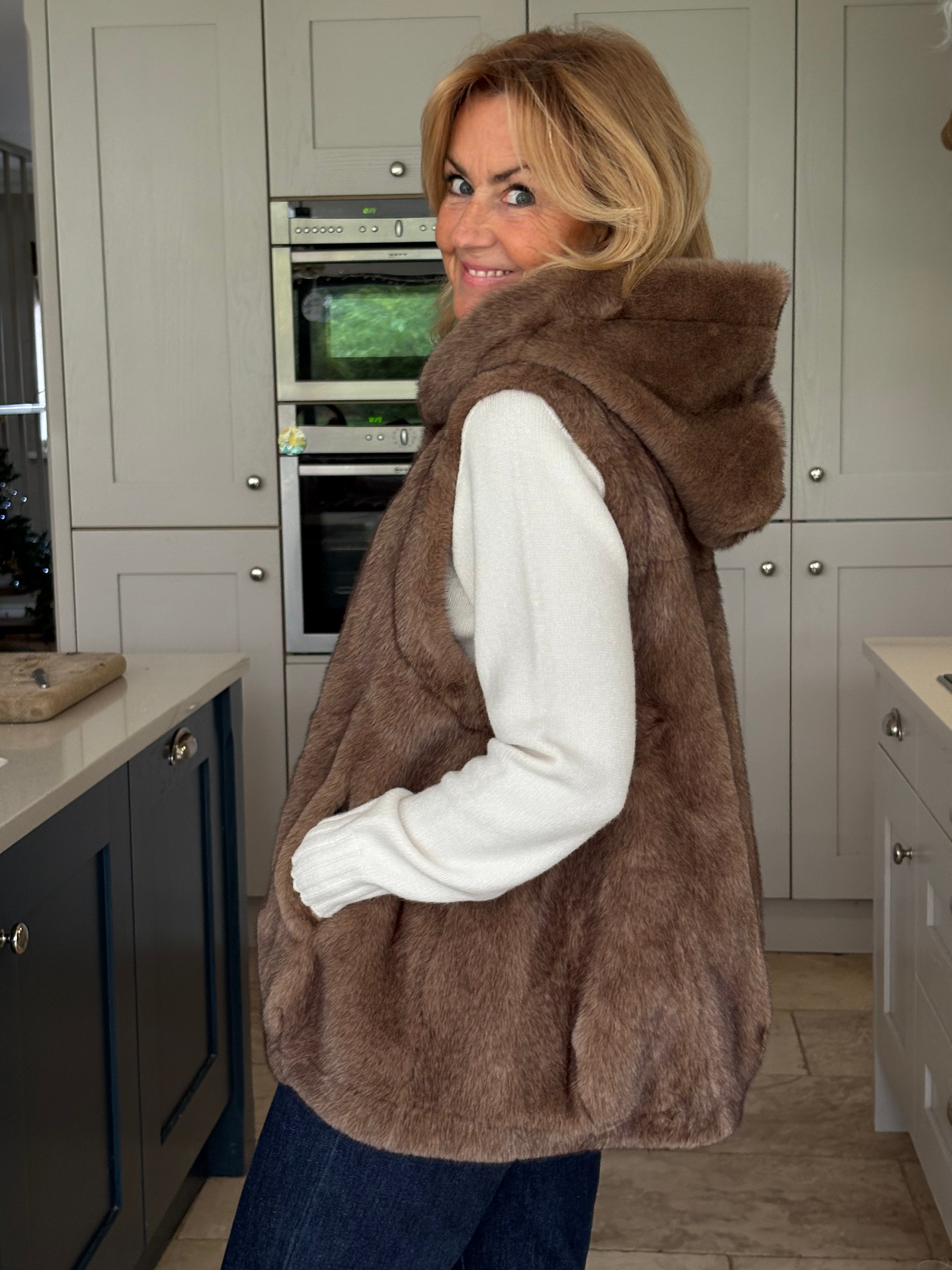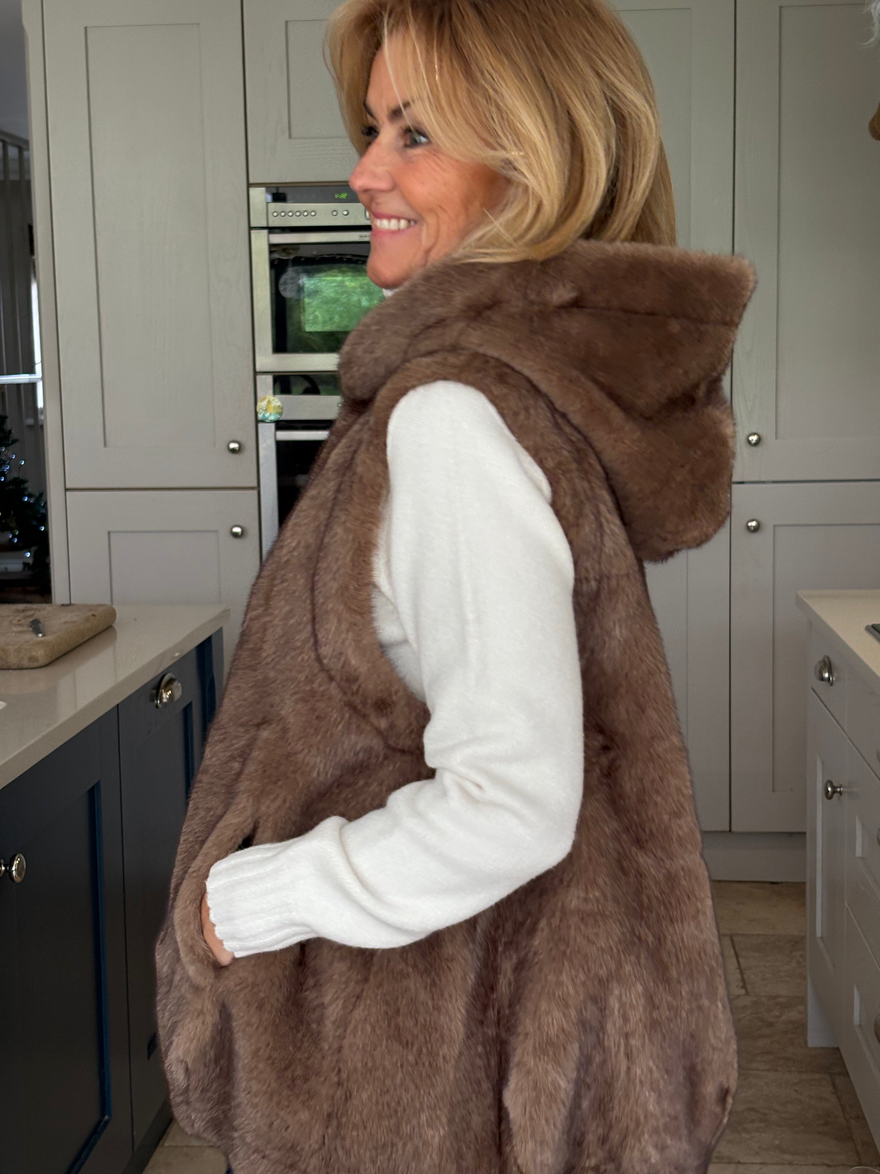 A gorgeous A line faux fur gilet with a subtly gathered hemline giving it a blousy effect. With a large wide hood and two pockets, this gilet is both elegant and versatile.