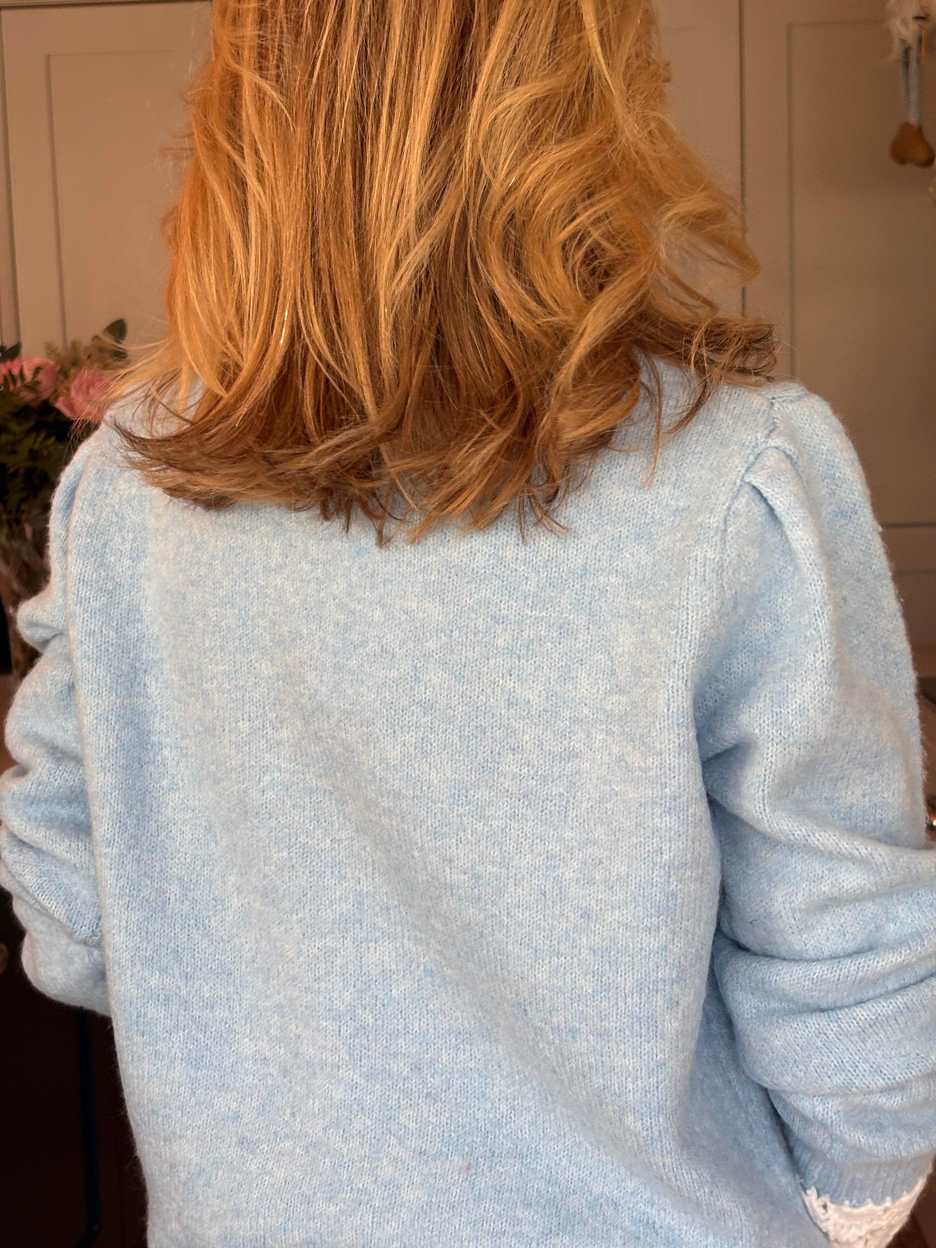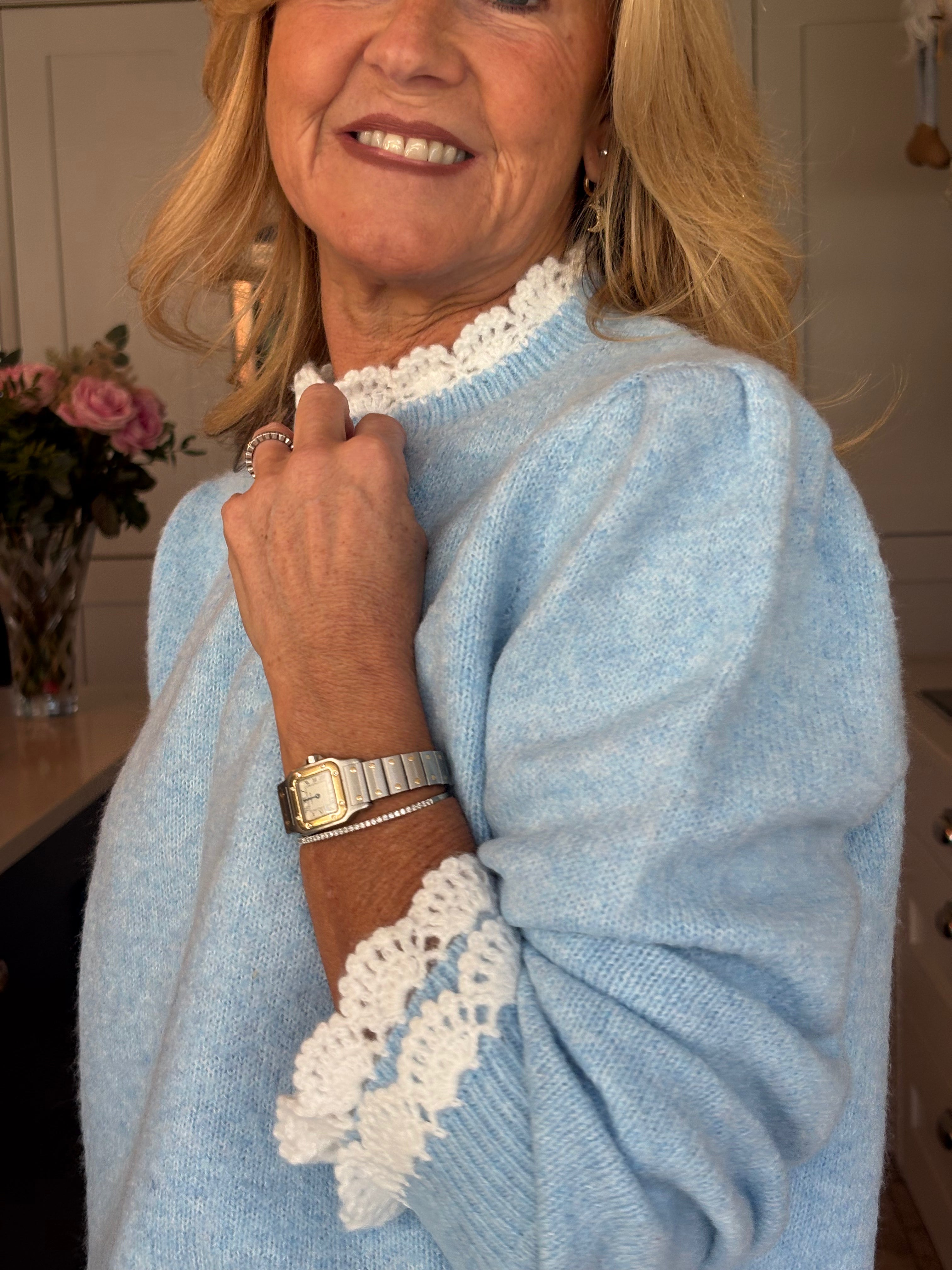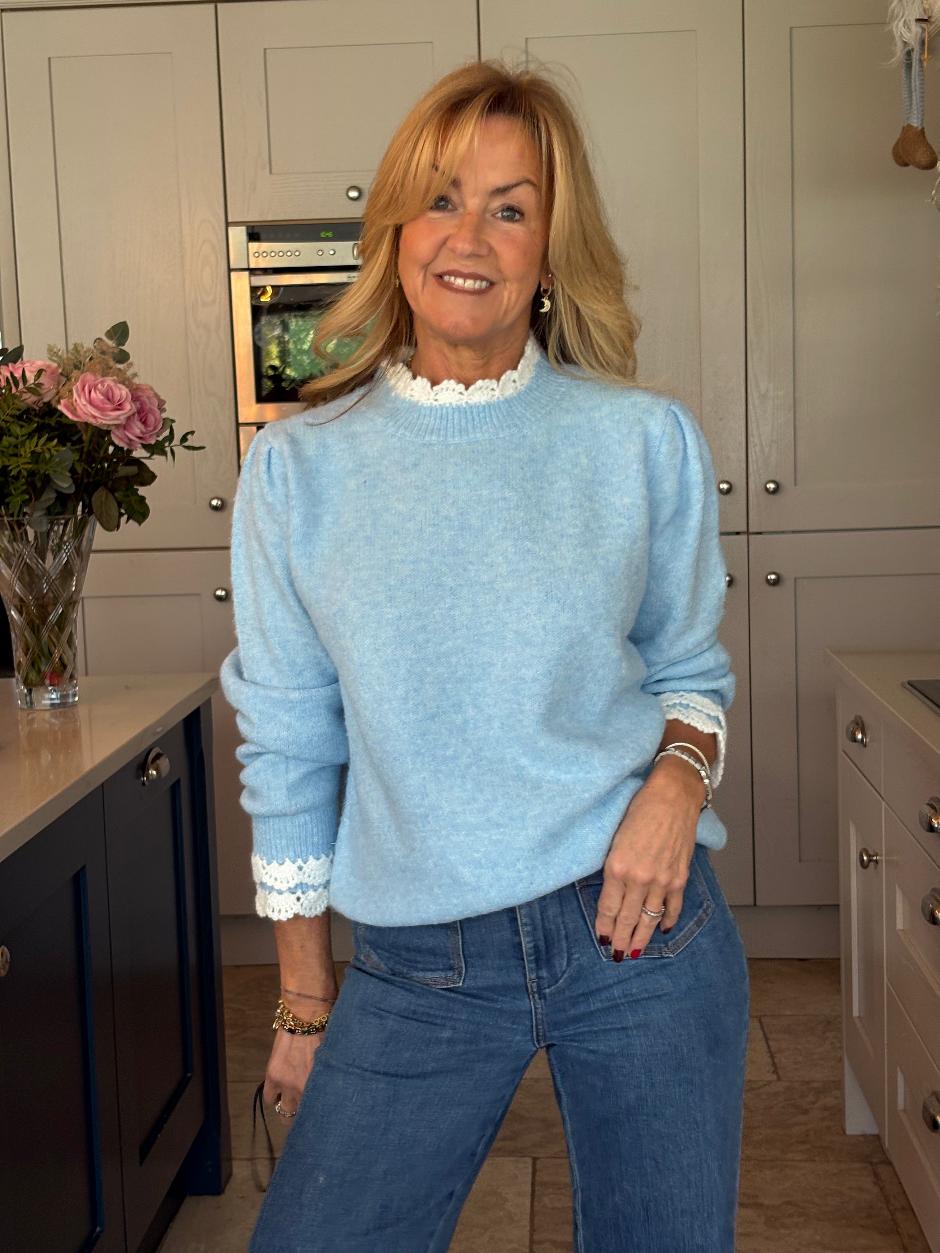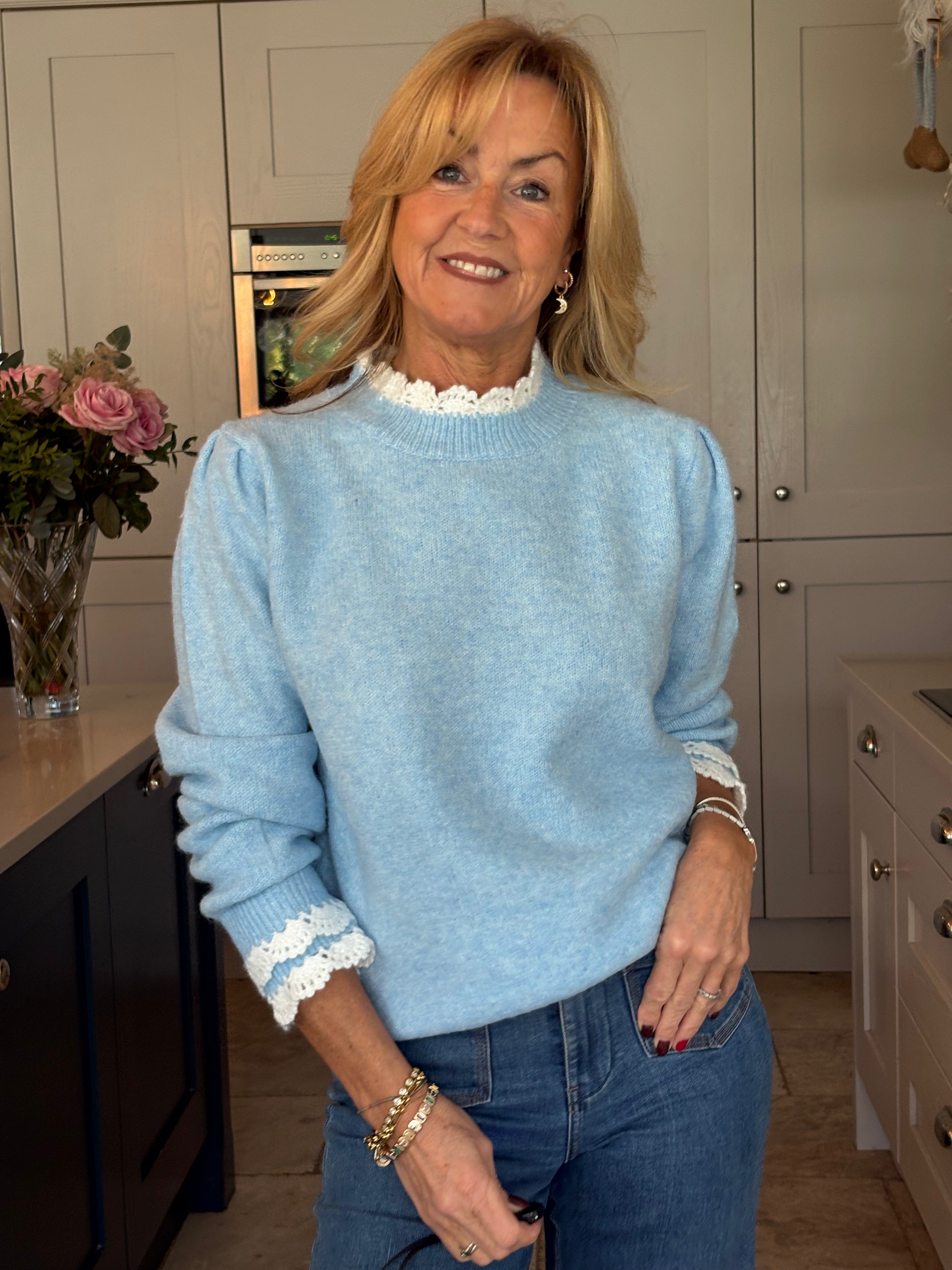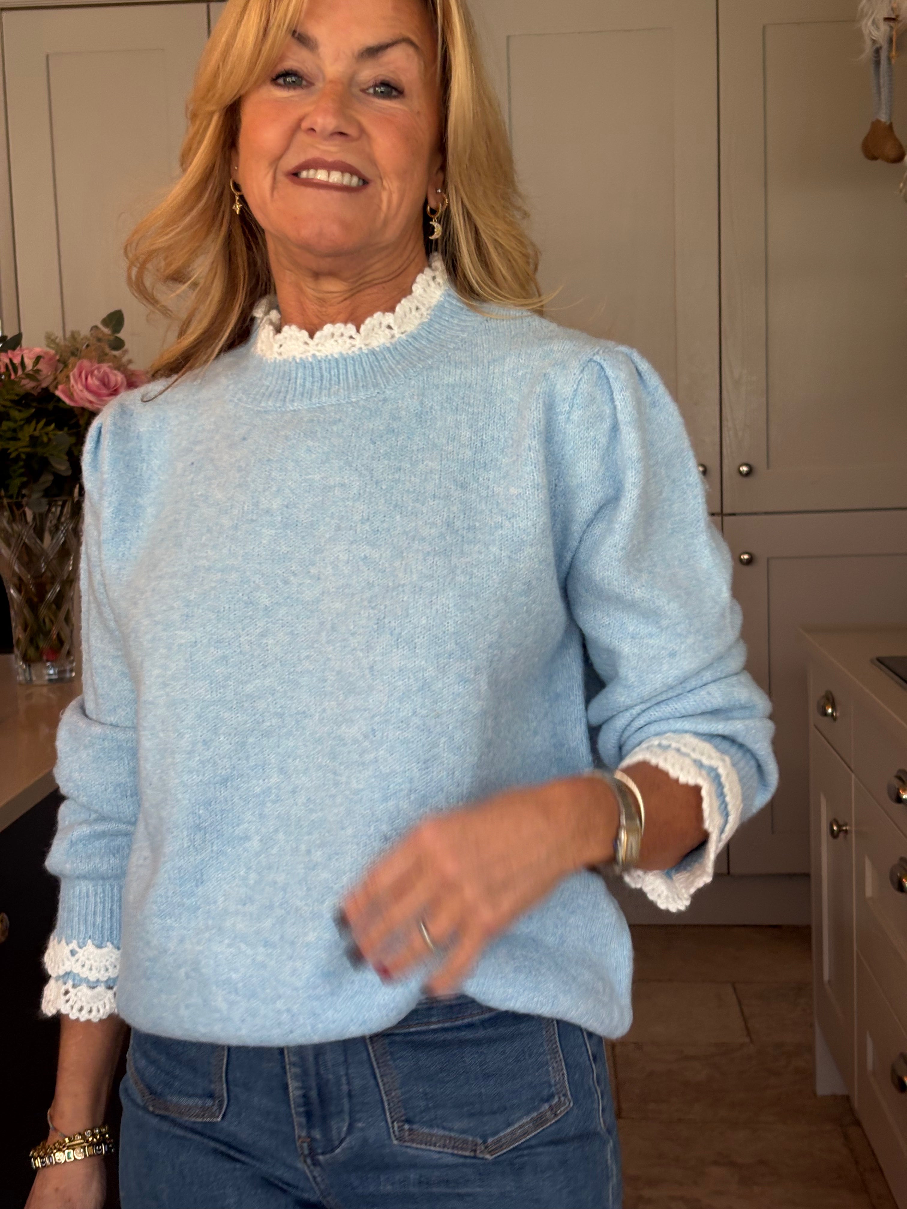 A super cute traditional style crew neck jumper with a gorgeous white crochet trim at the collar and on the cuffs giving the illusion of wearing a shirt underneath. Puff, stylish shoulders. Easy to wear and really soft and comfortable. In baby pink, baby blue and navy blue.