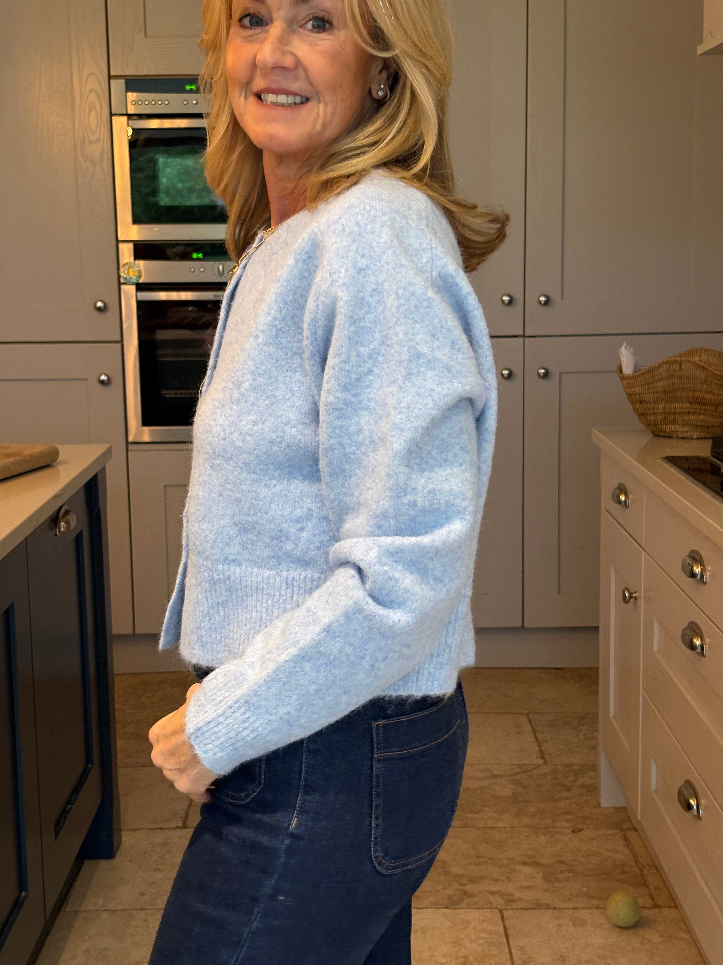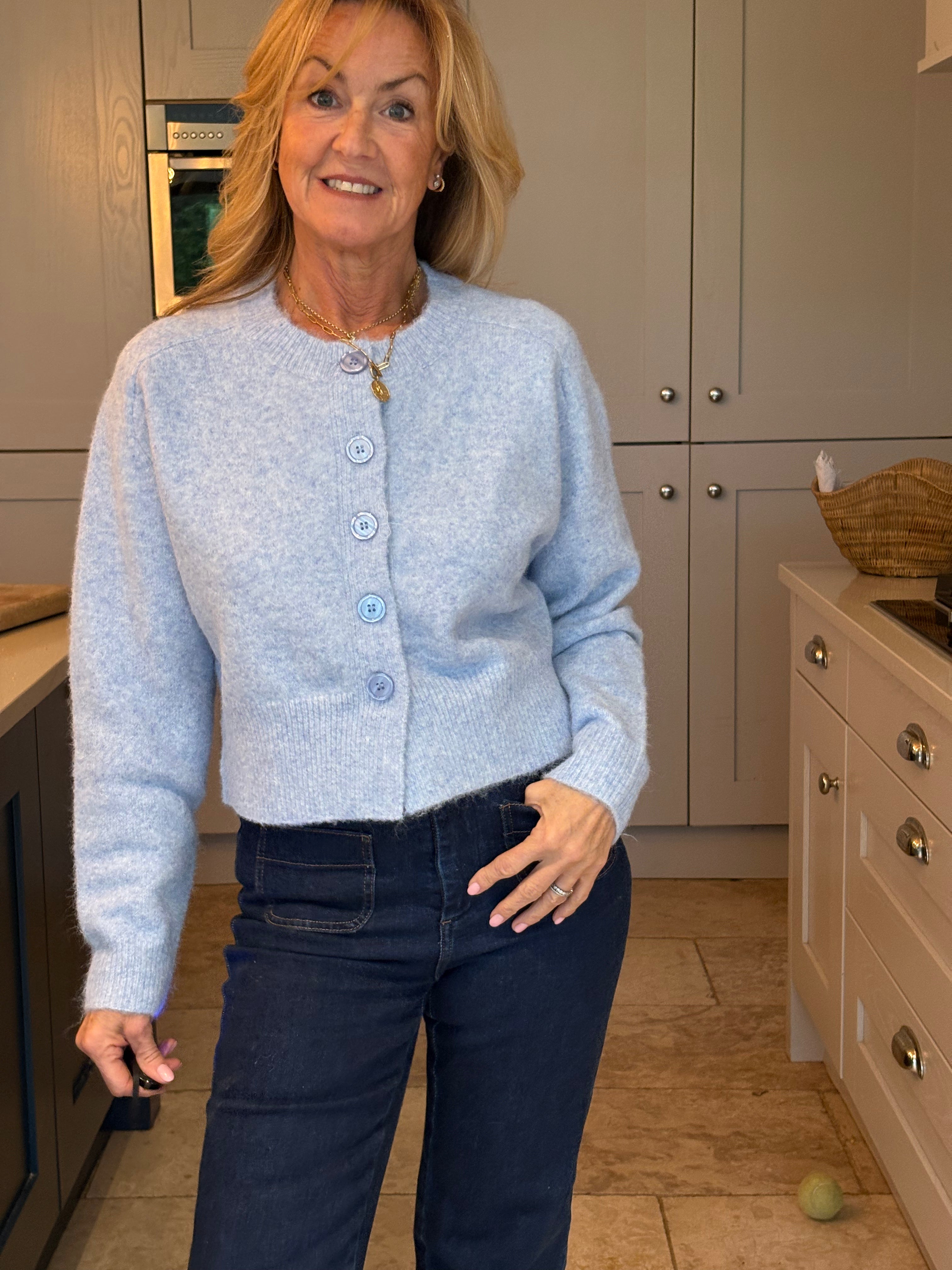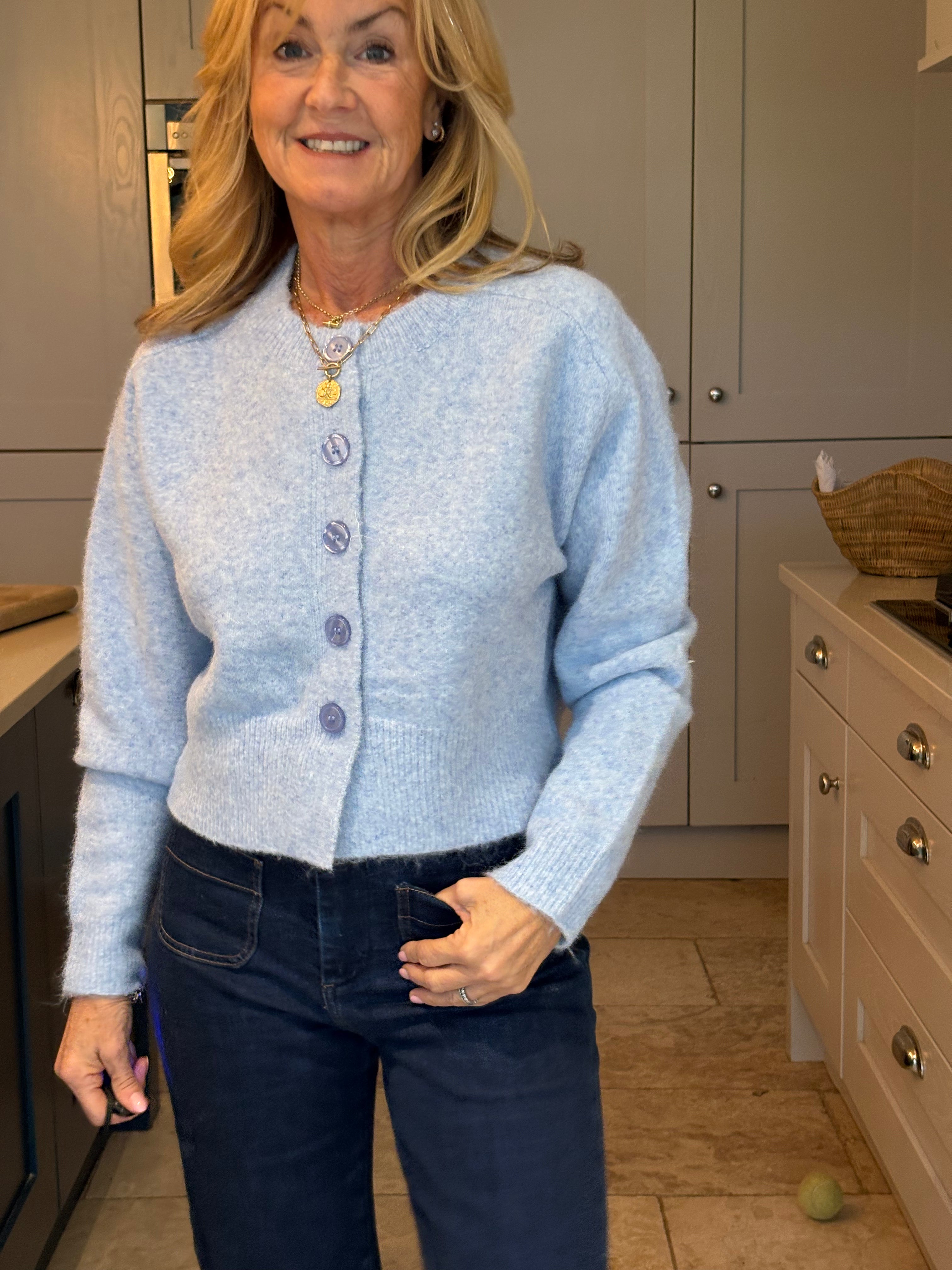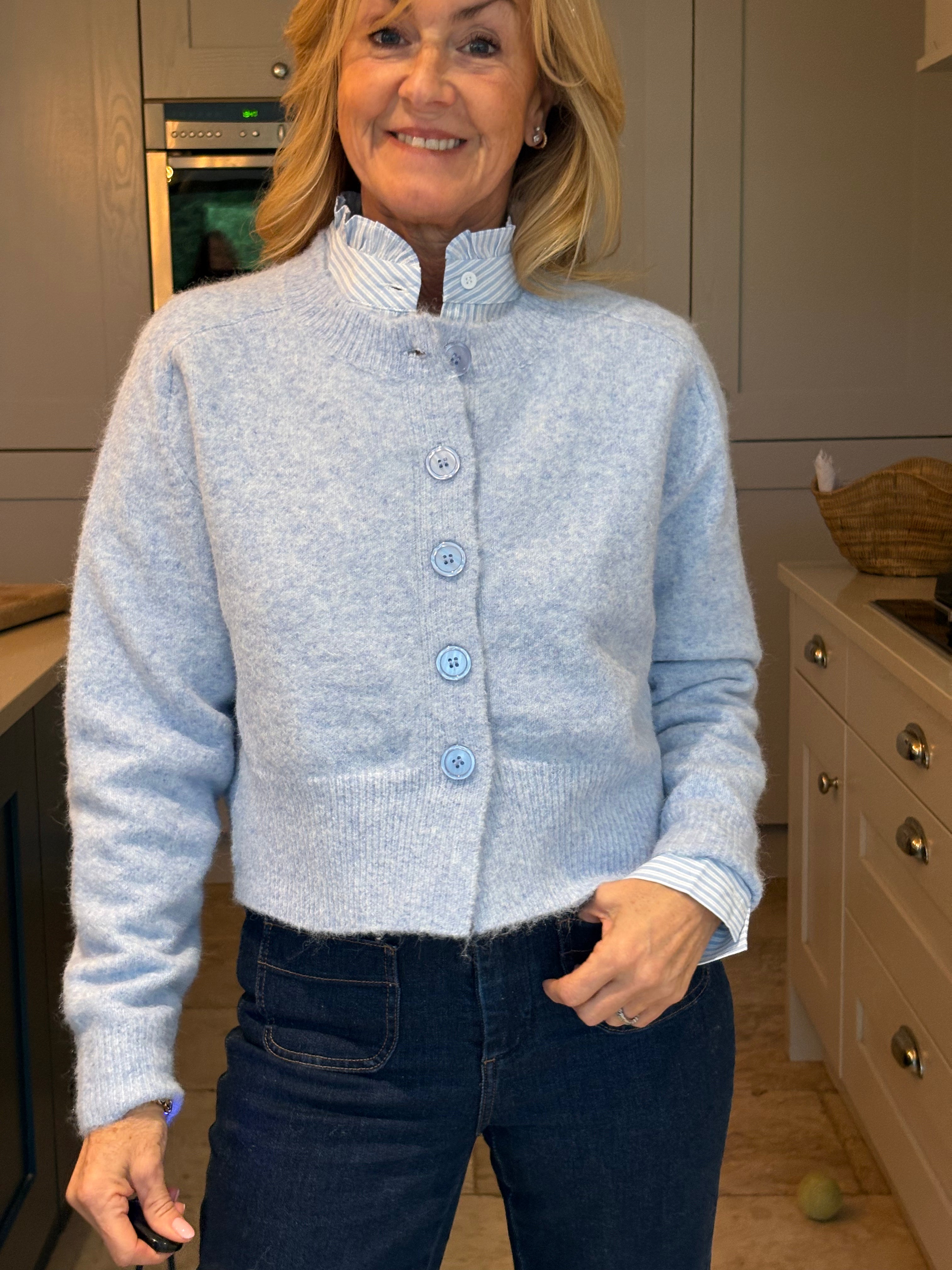 A stunning cropped yet classic cardigan in pale blue and off white. A ribbed crew neckline and a large ribbed hemline and cuffs. Five large pearlised buttons. Subtly boxy. This cardigan, although one size, is not big. It would fit a size 6-12.