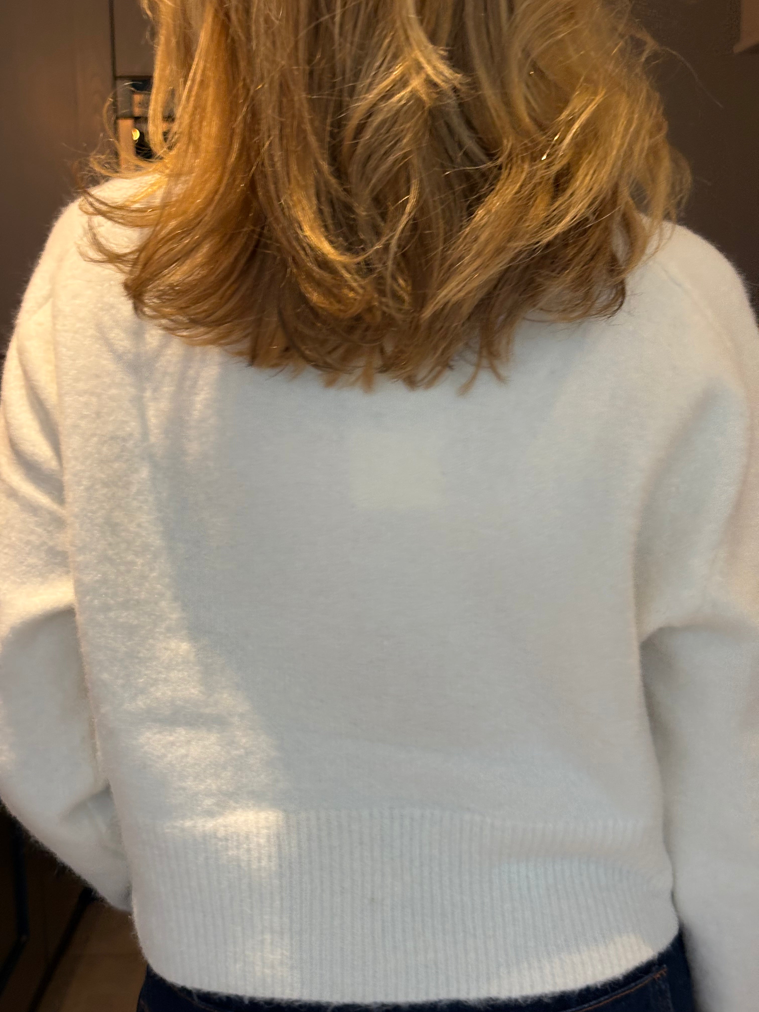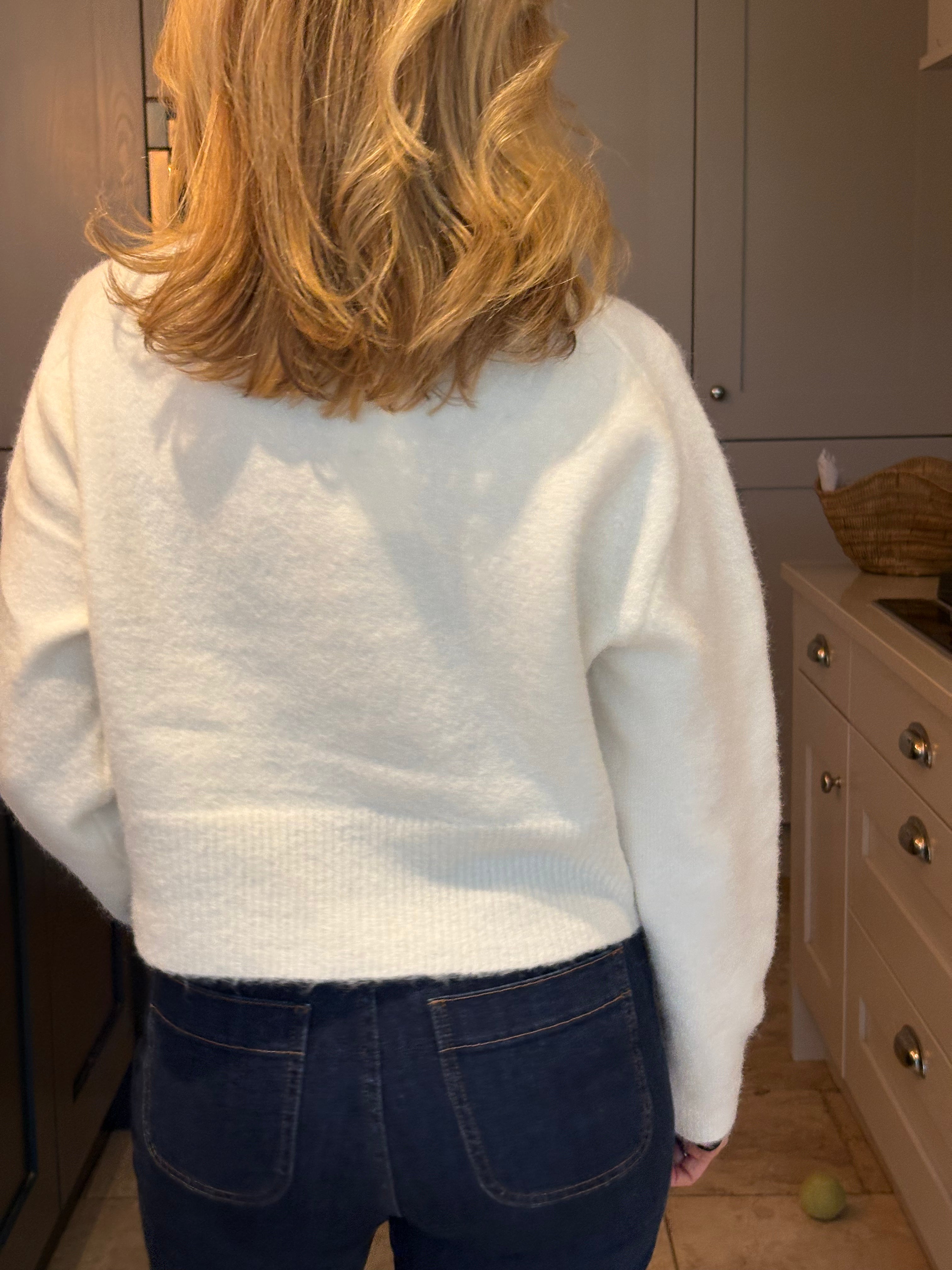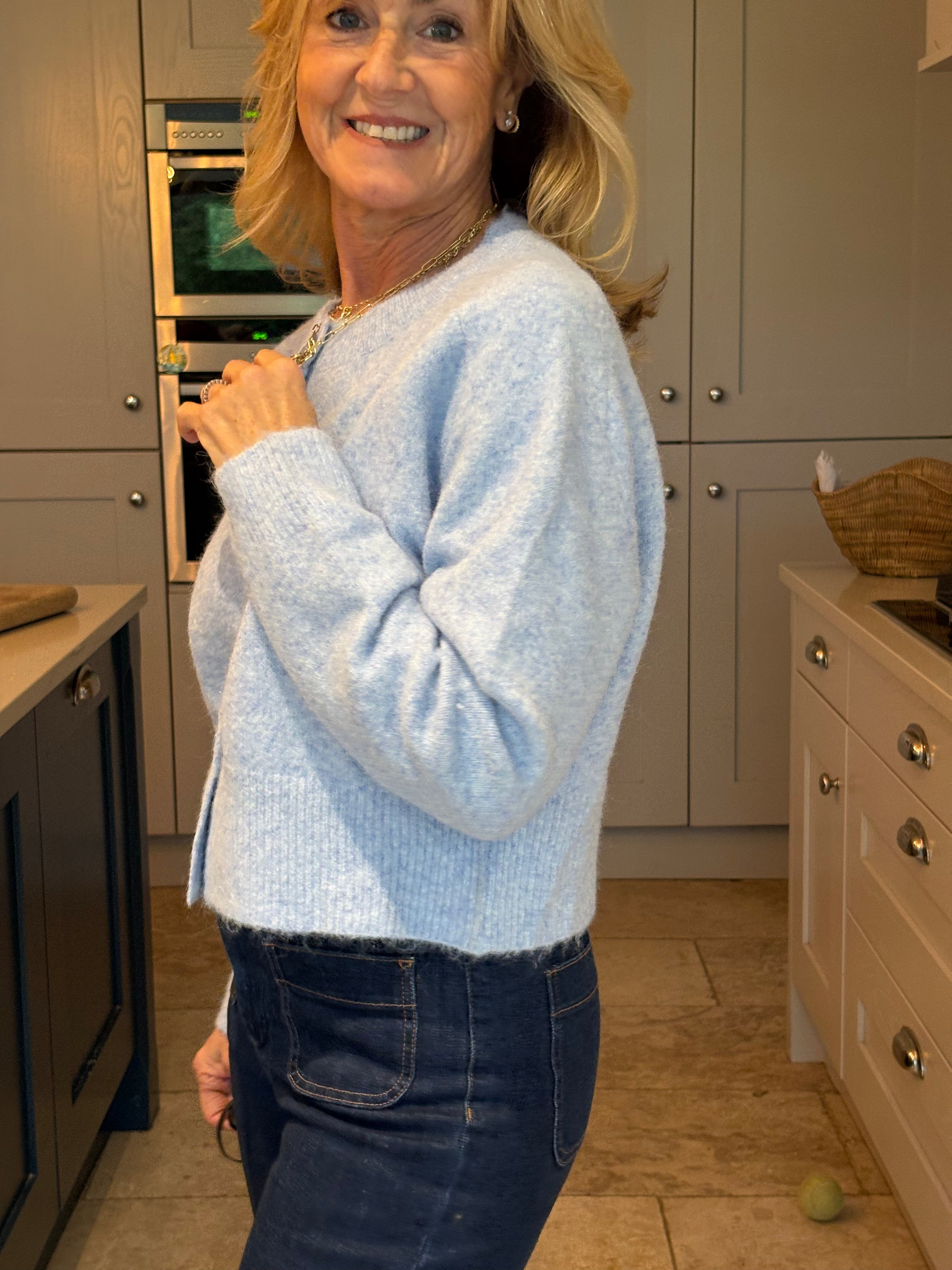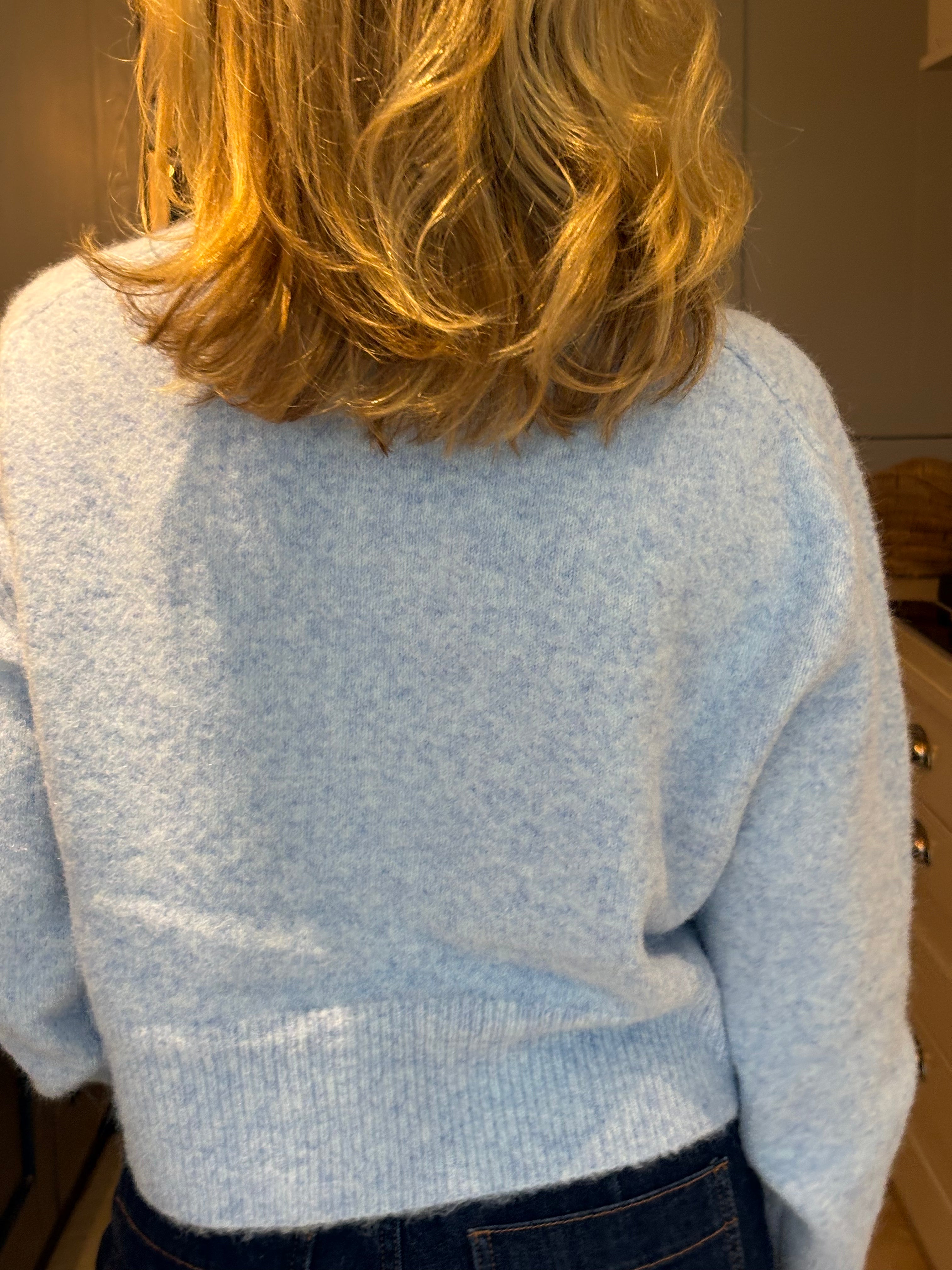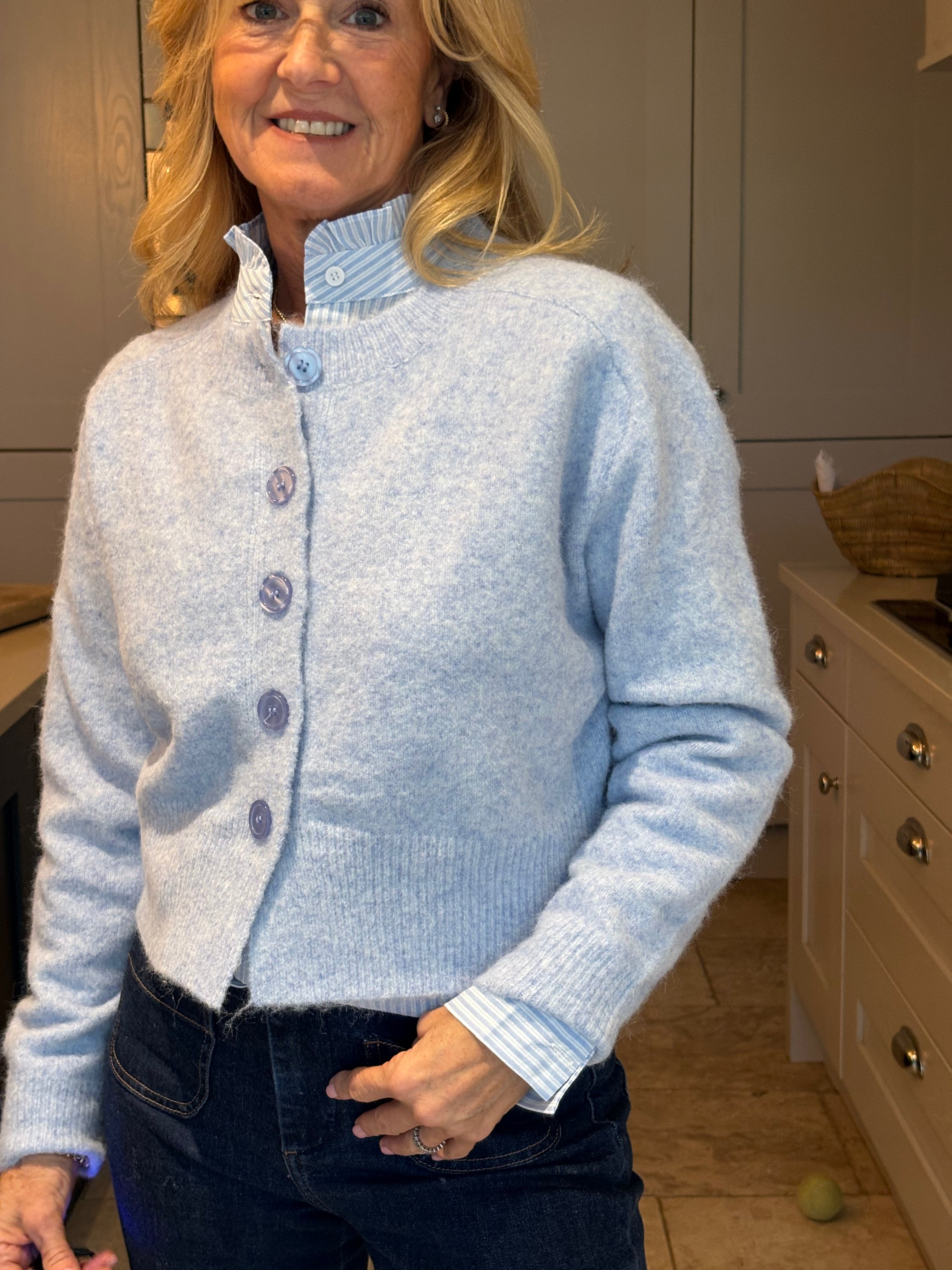A stunning cropped yet classic cardigan in pale blue and off white. A ribbed crew neckline and a large ribbed hemline and cuffs. Five large pearlised buttons. Subtly boxy. This cardigan, although one size, is not big. It would fit a size 6-12.