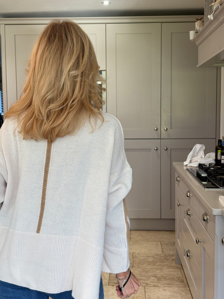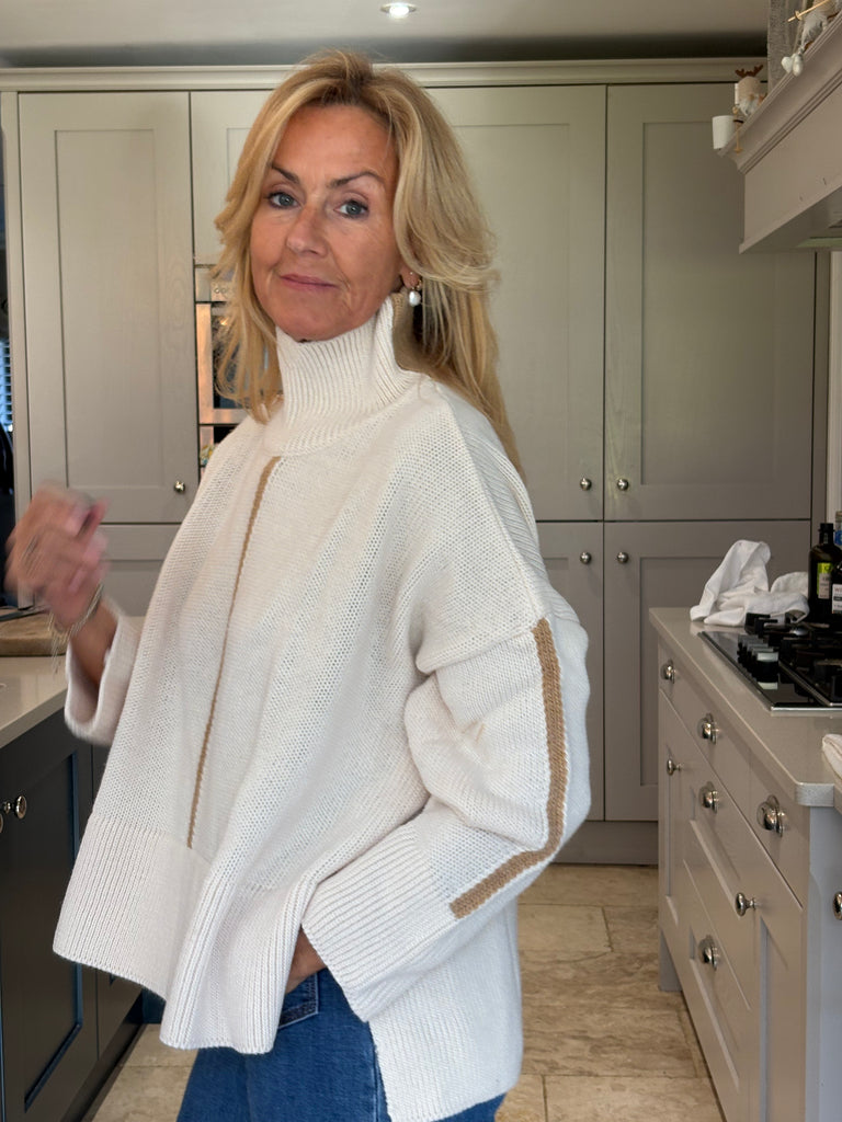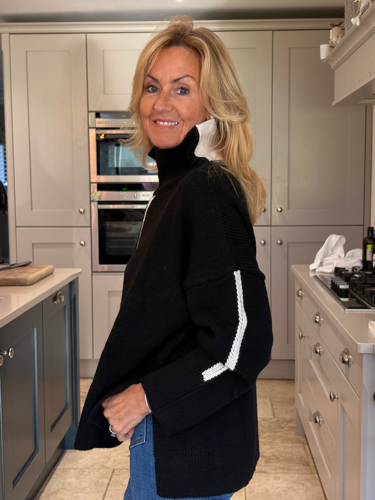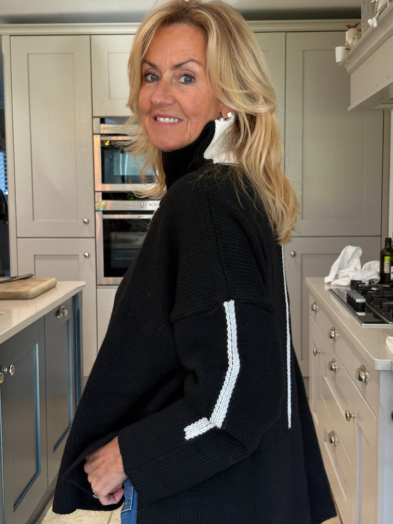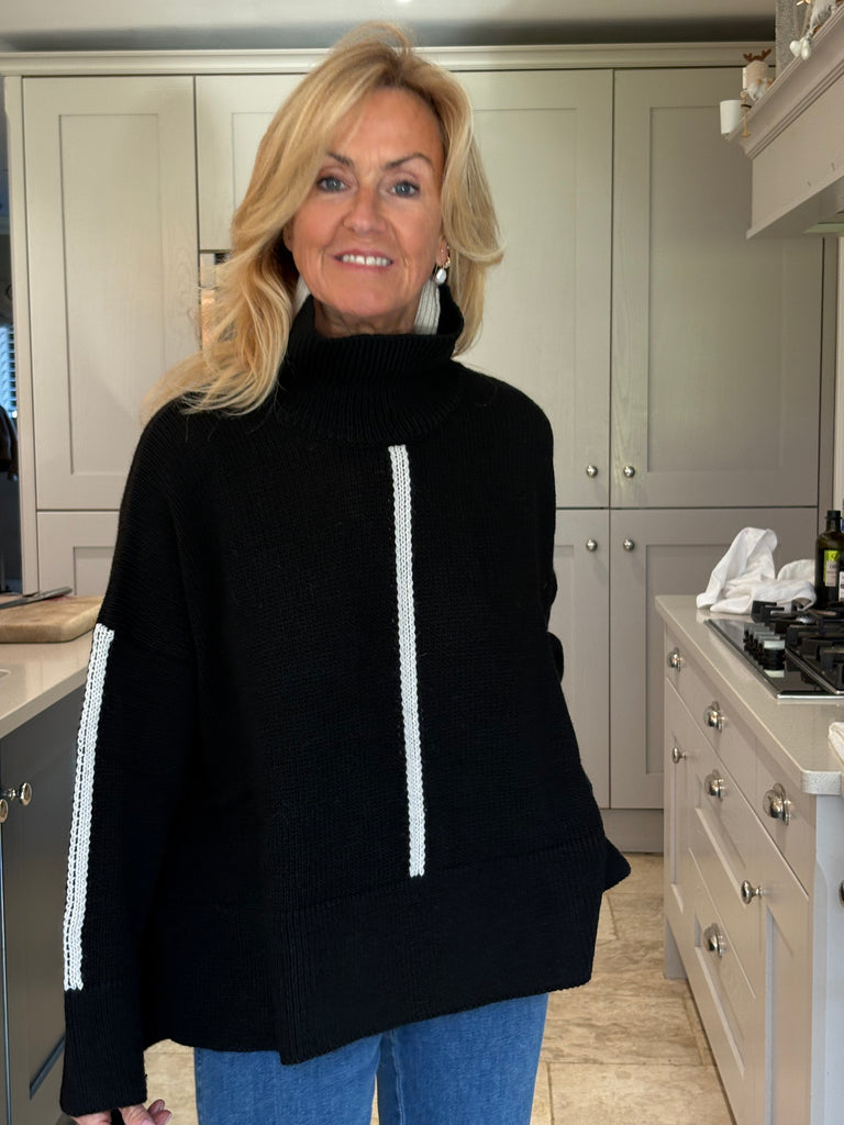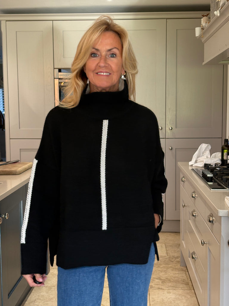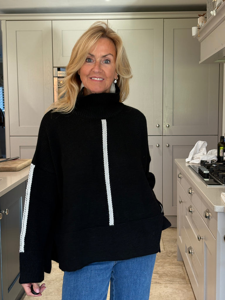 A gorgeous soft and fluid, thick polo neck jumper with a two tone polo neck feature, a contrast stripe down the back, front and sleeves. Long, unfitted, ribbed cuffs and hemline. Drop shoulders and wide sleeves. The jumper is longer at the back than the front with a side split. It is boxy and loose making it really easy to wear. Gorgeous, elegant and a really special piece.