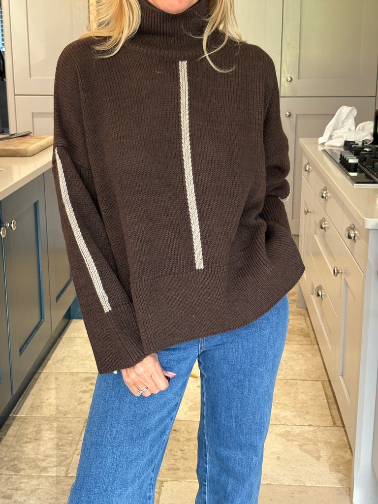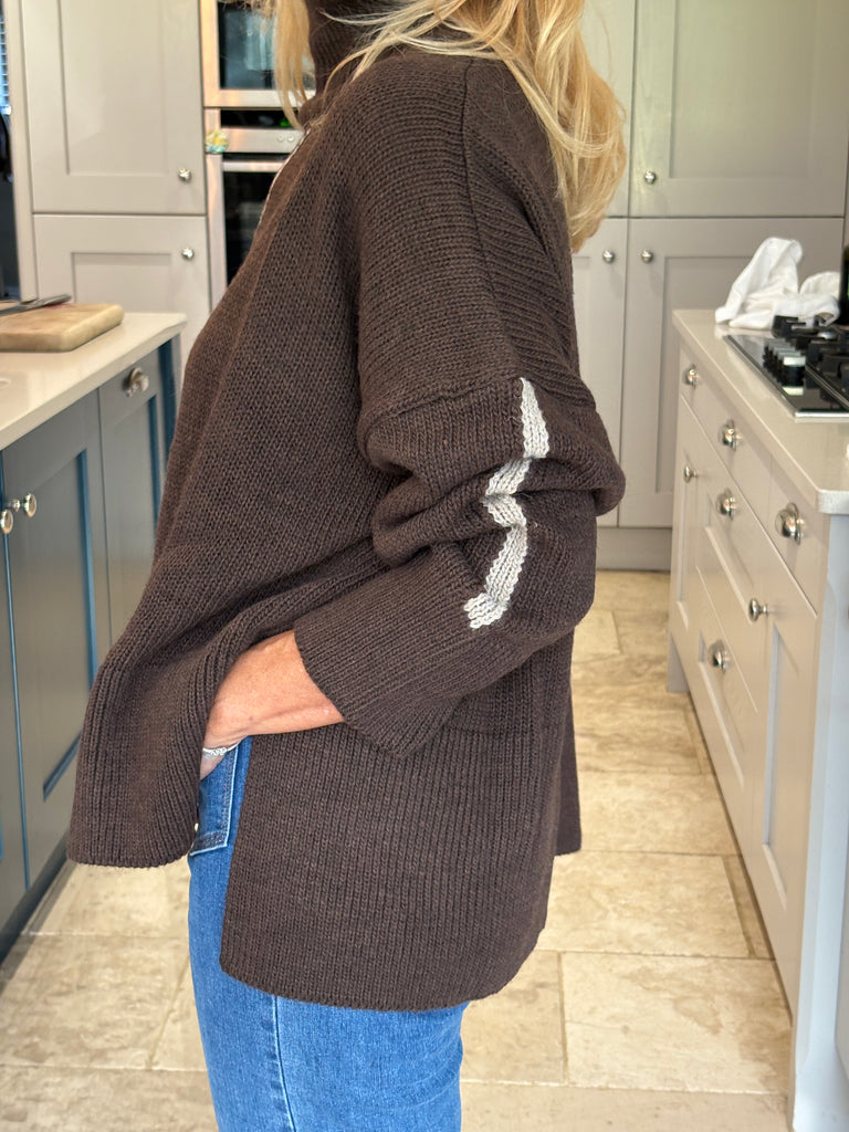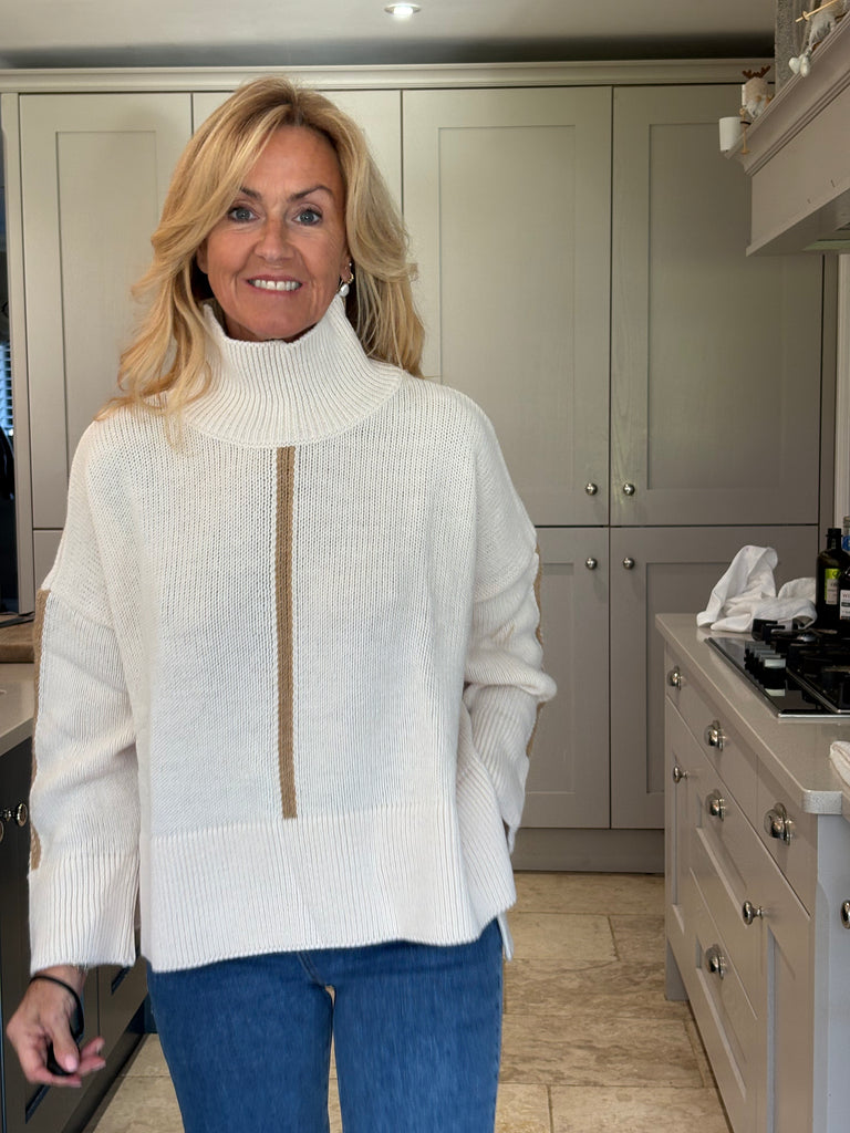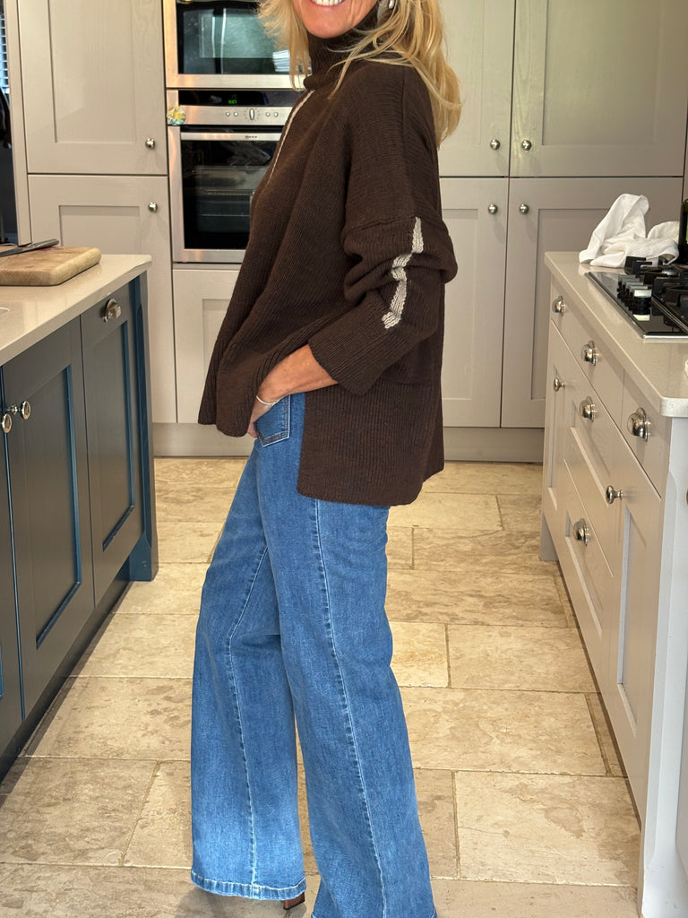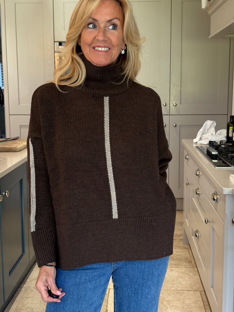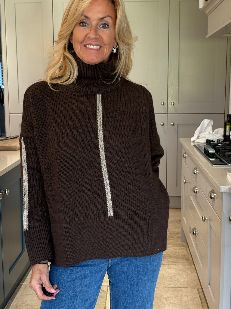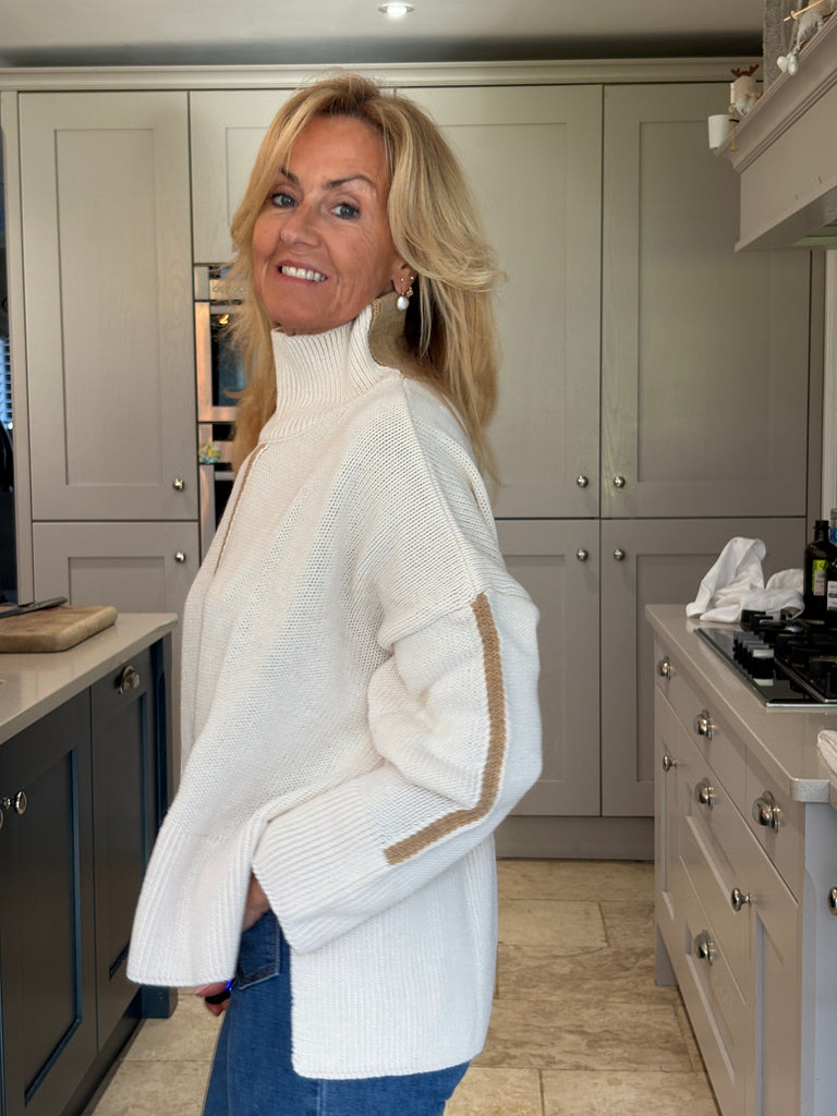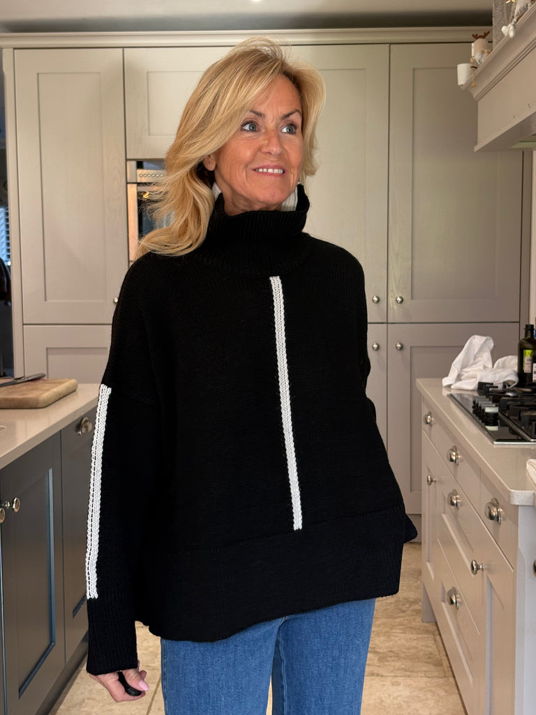 A gorgeous soft and fluid, thick polo neck jumper with a two tone polo neck feature, a contrast stripe down the back, front and sleeves. Long, unfitted, ribbed cuffs and hemline. Drop shoulders and wide sleeves. The jumper is longer at the back than the front with a side split. It is boxy and loose making it really easy to wear. Gorgeous, elegant and a really special piece.