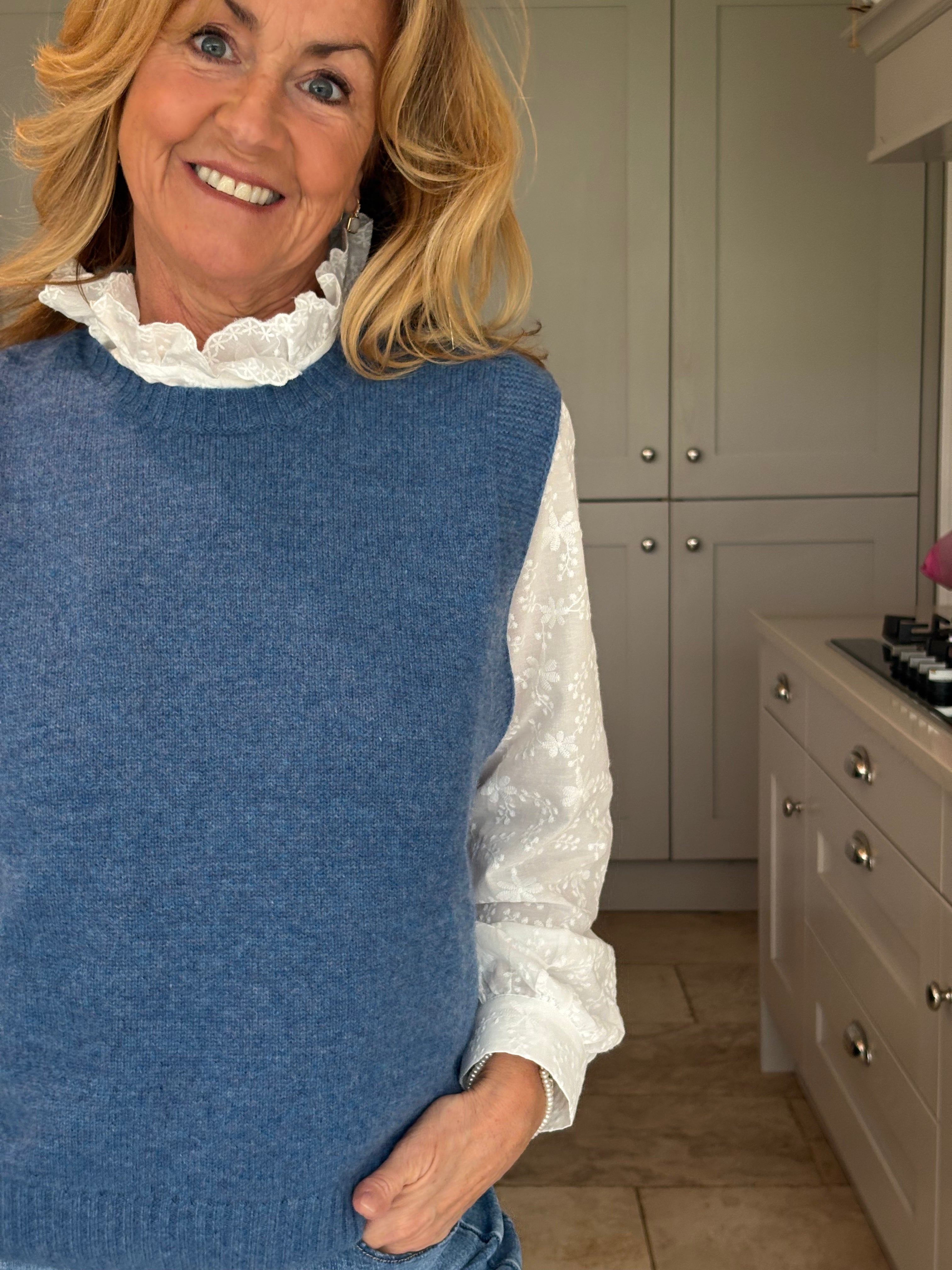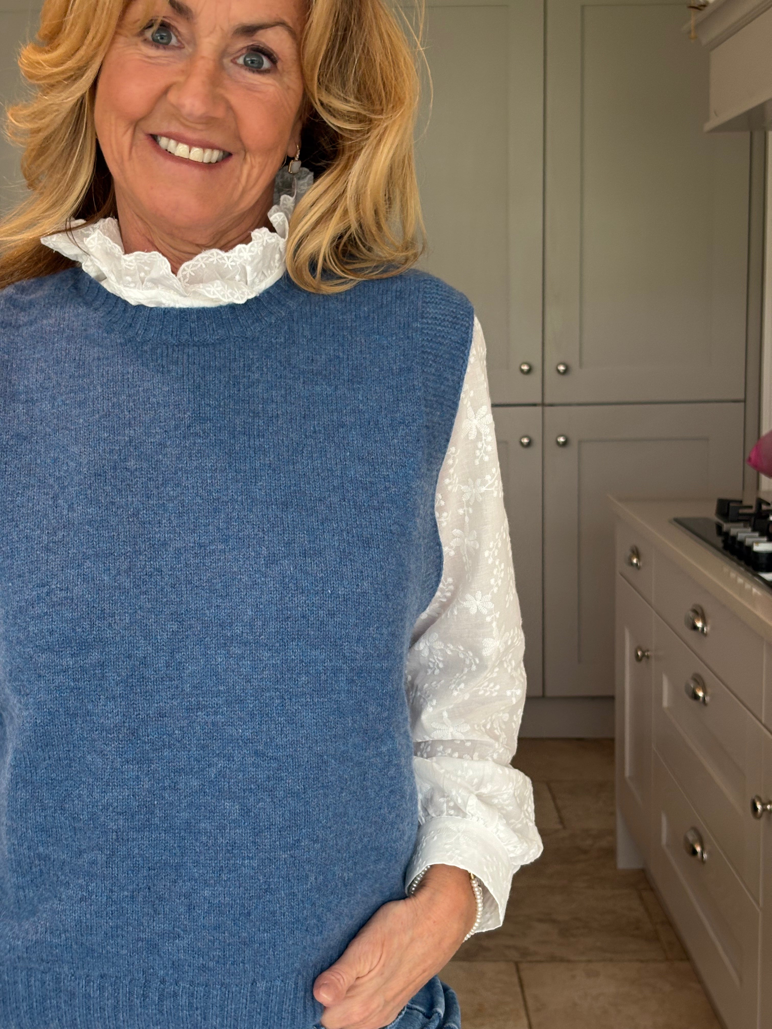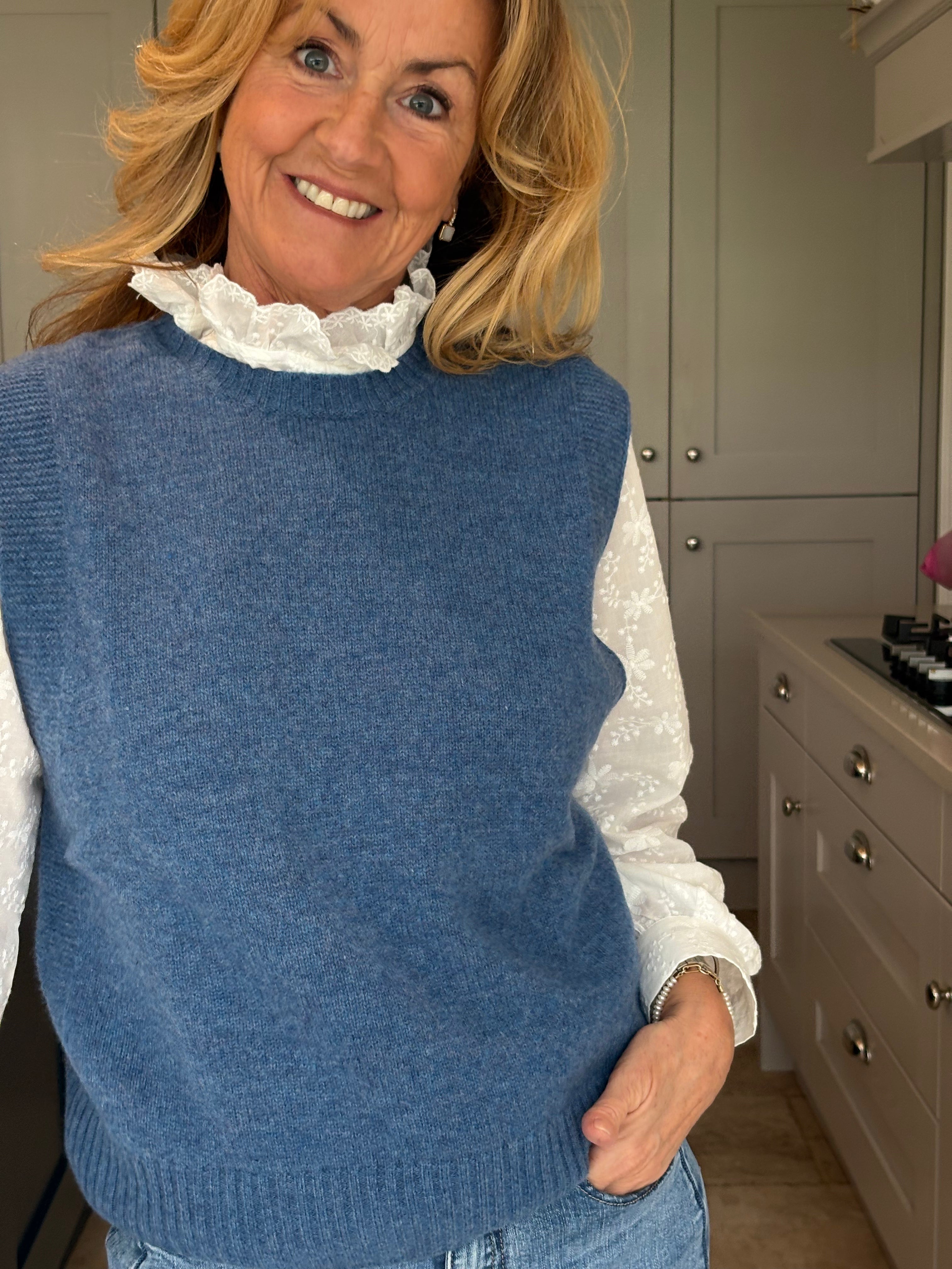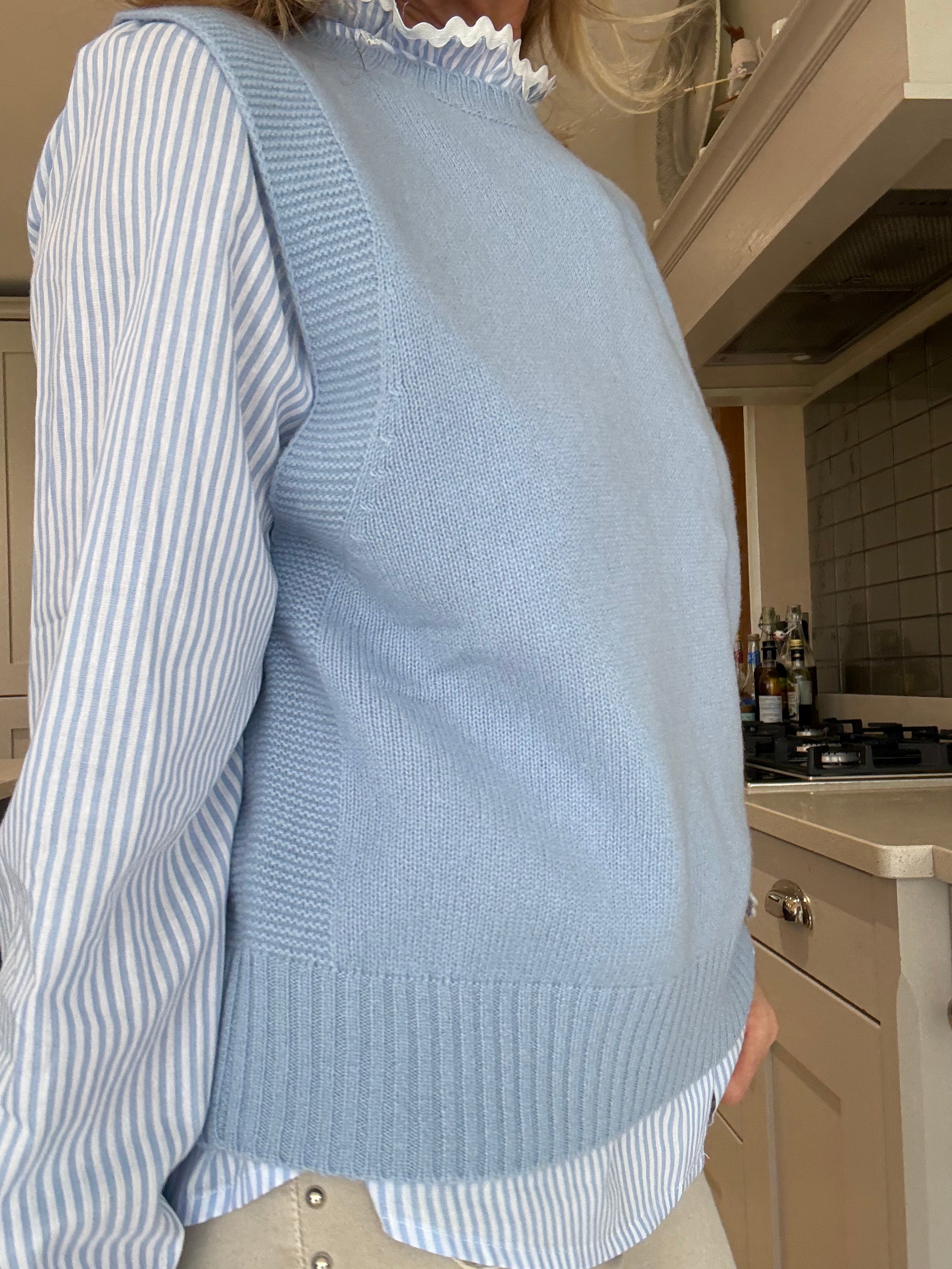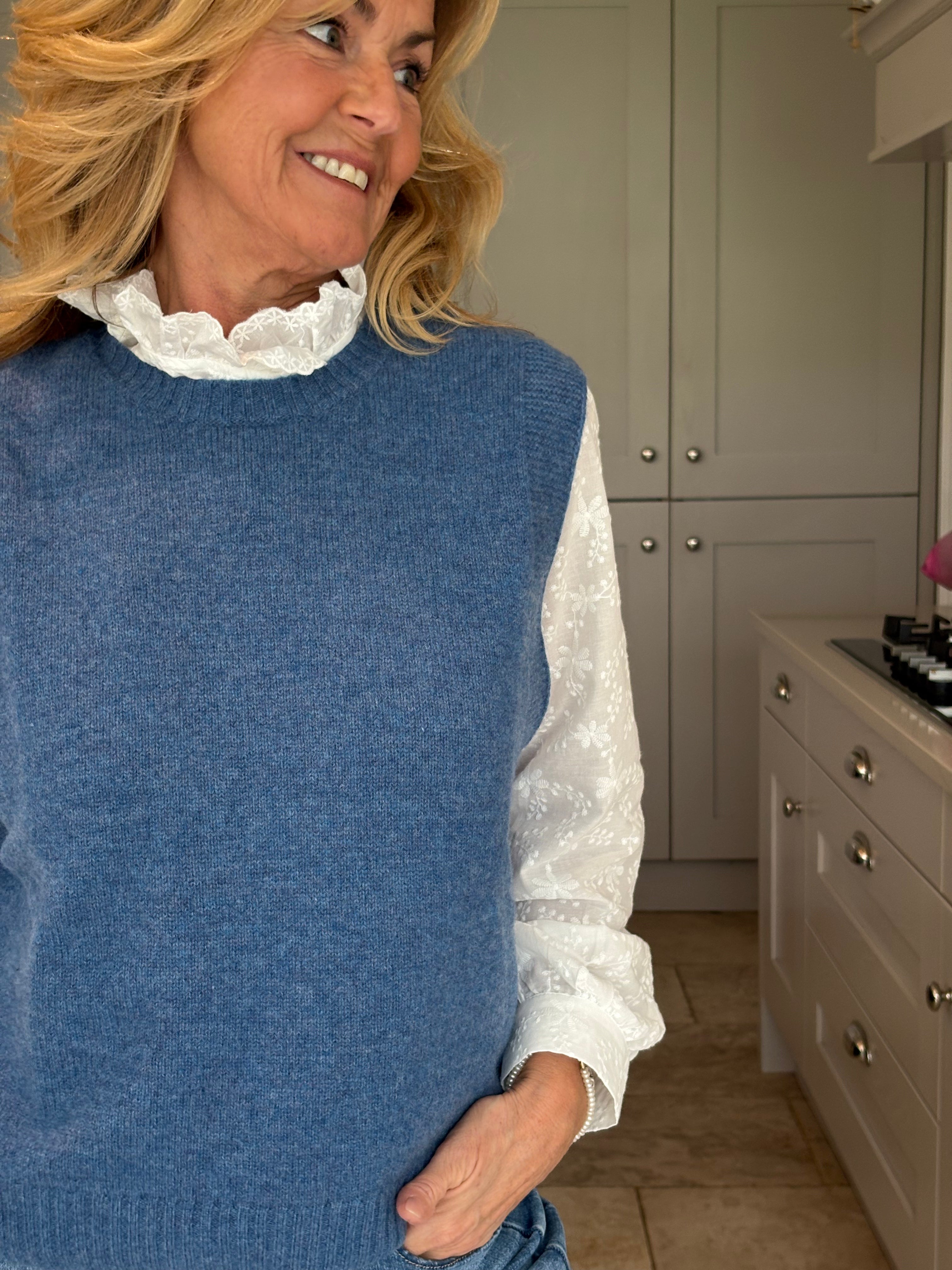 A gorgeous classic pure wool tank top beautifully crafted to combine warmth with effortless sophistication. The premium wool is soft and gentle on the skin. Subtle contrasting knitting patterns add depth and texture, creating visual interest without overpowering its timeless design. The clean lines are complemented by a classic crew neckline, giving it a polished, versatile finish. Generously cut armholes enhance its relaxed elegance, making it perfect for layering over a crisp shirt or flowing dress. Designed for effortless styling, this piece transitions seamlessly between seasons.