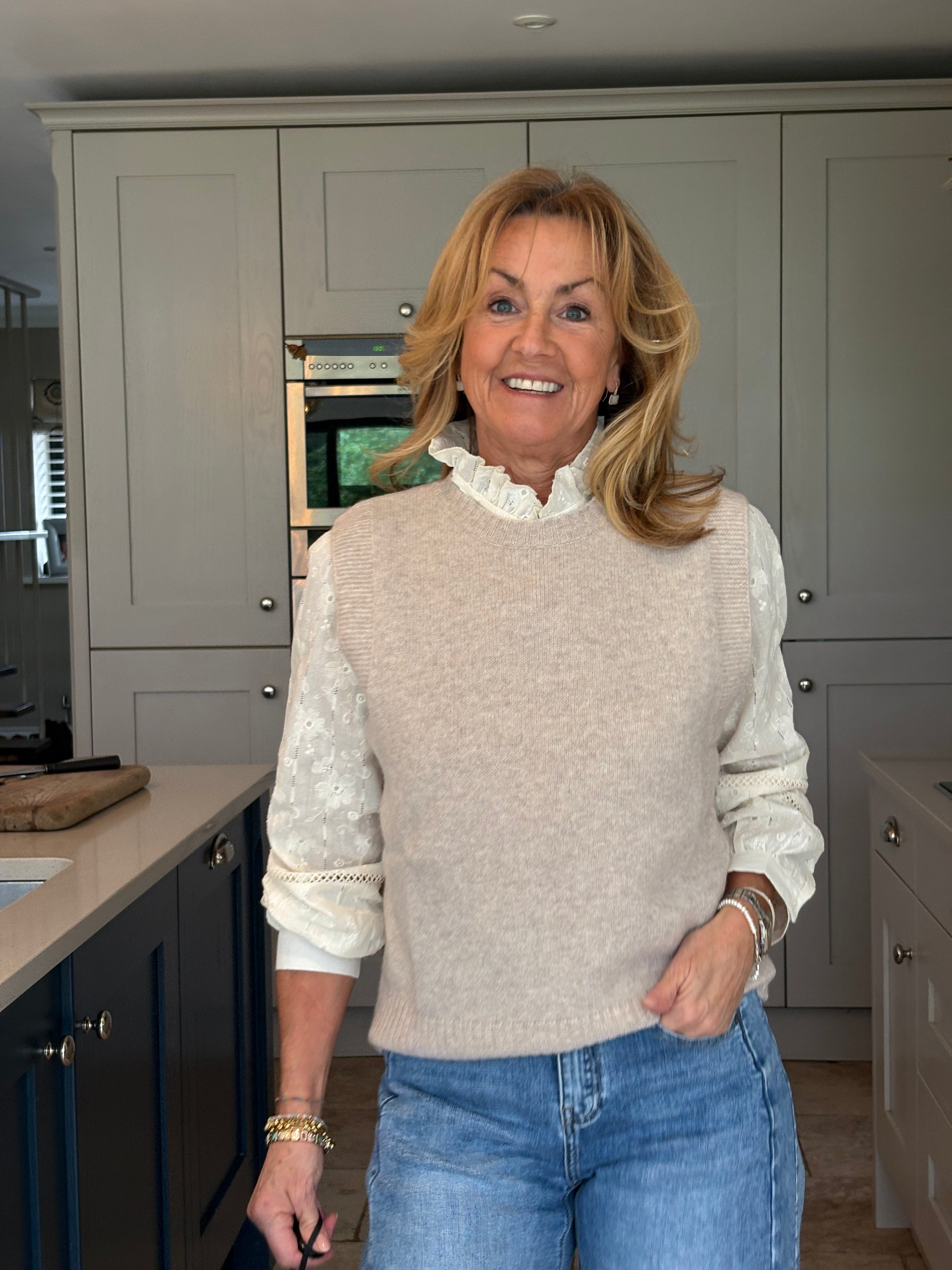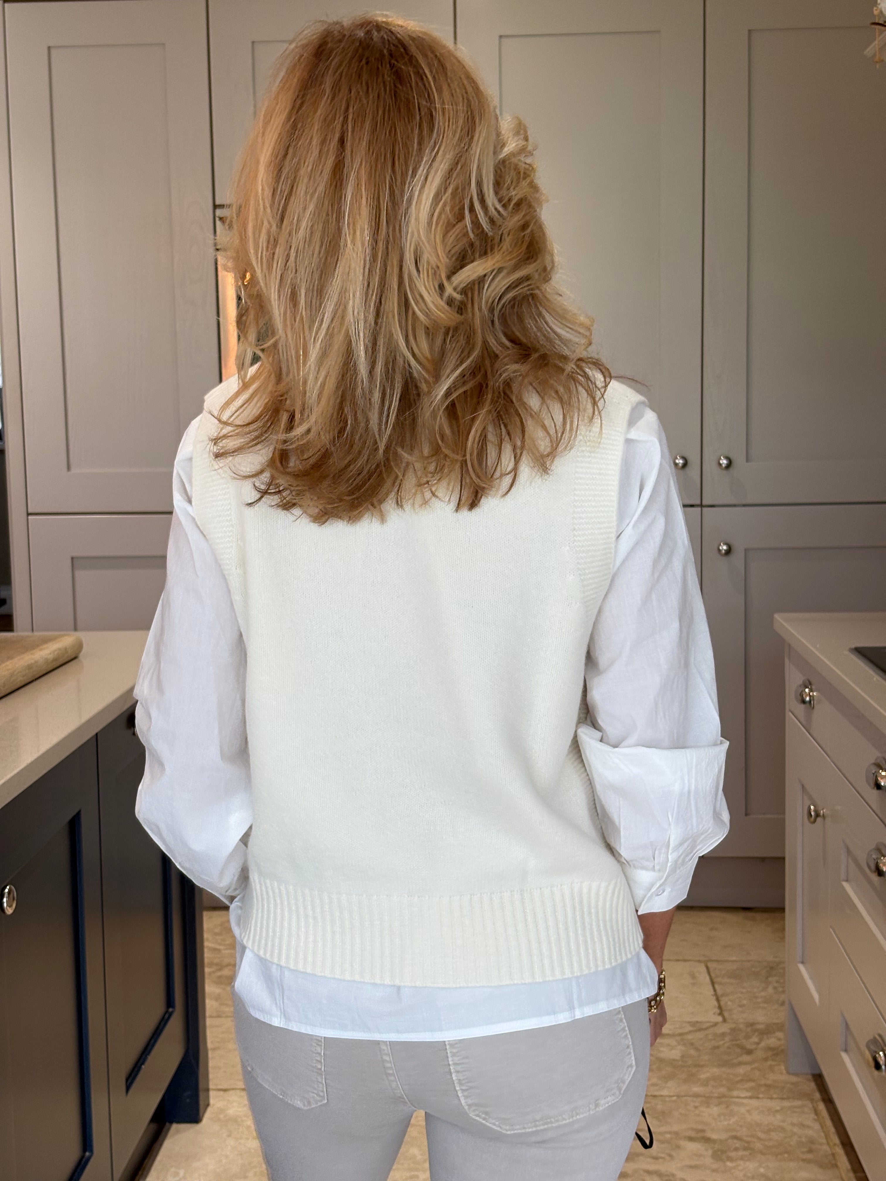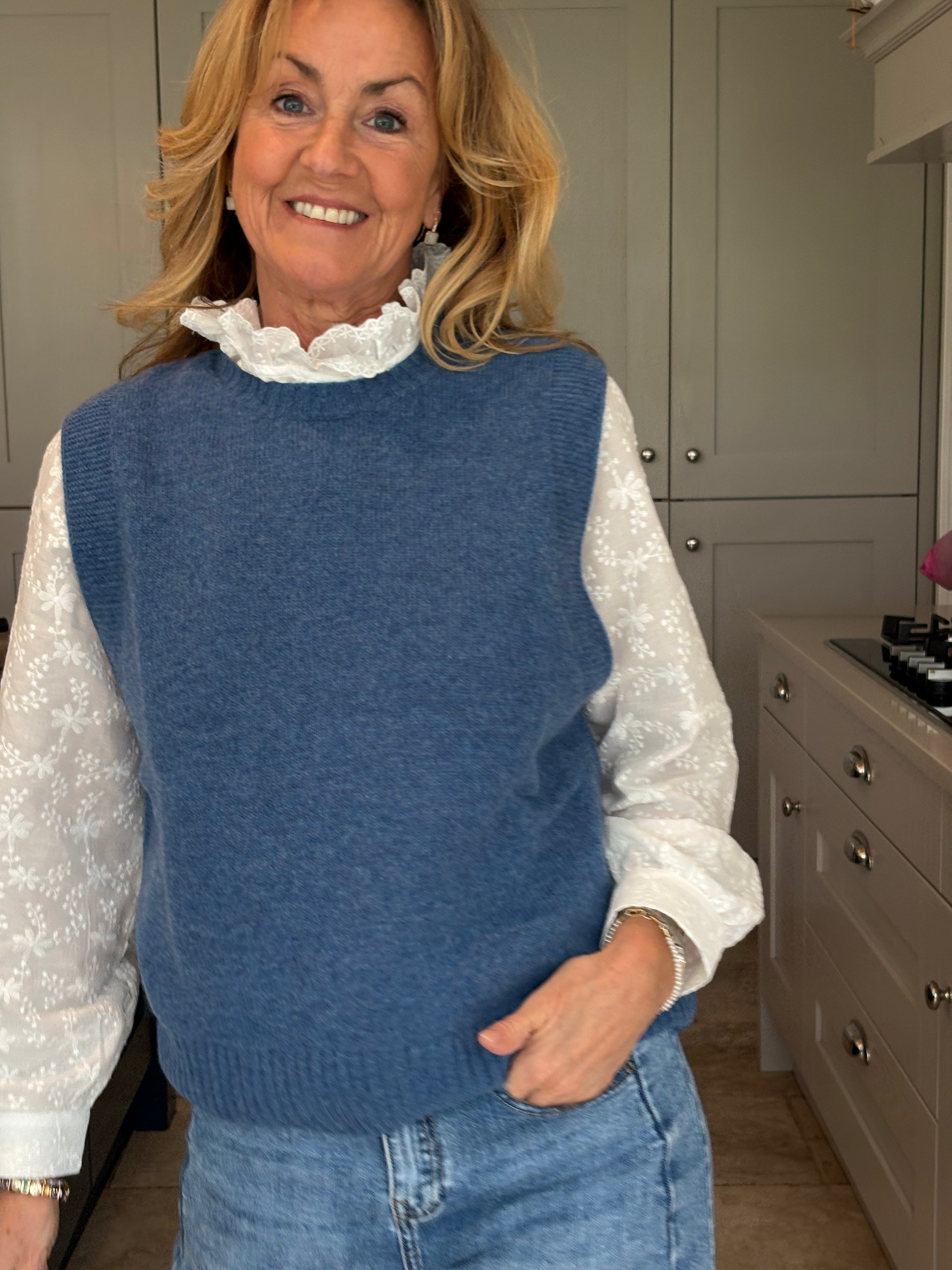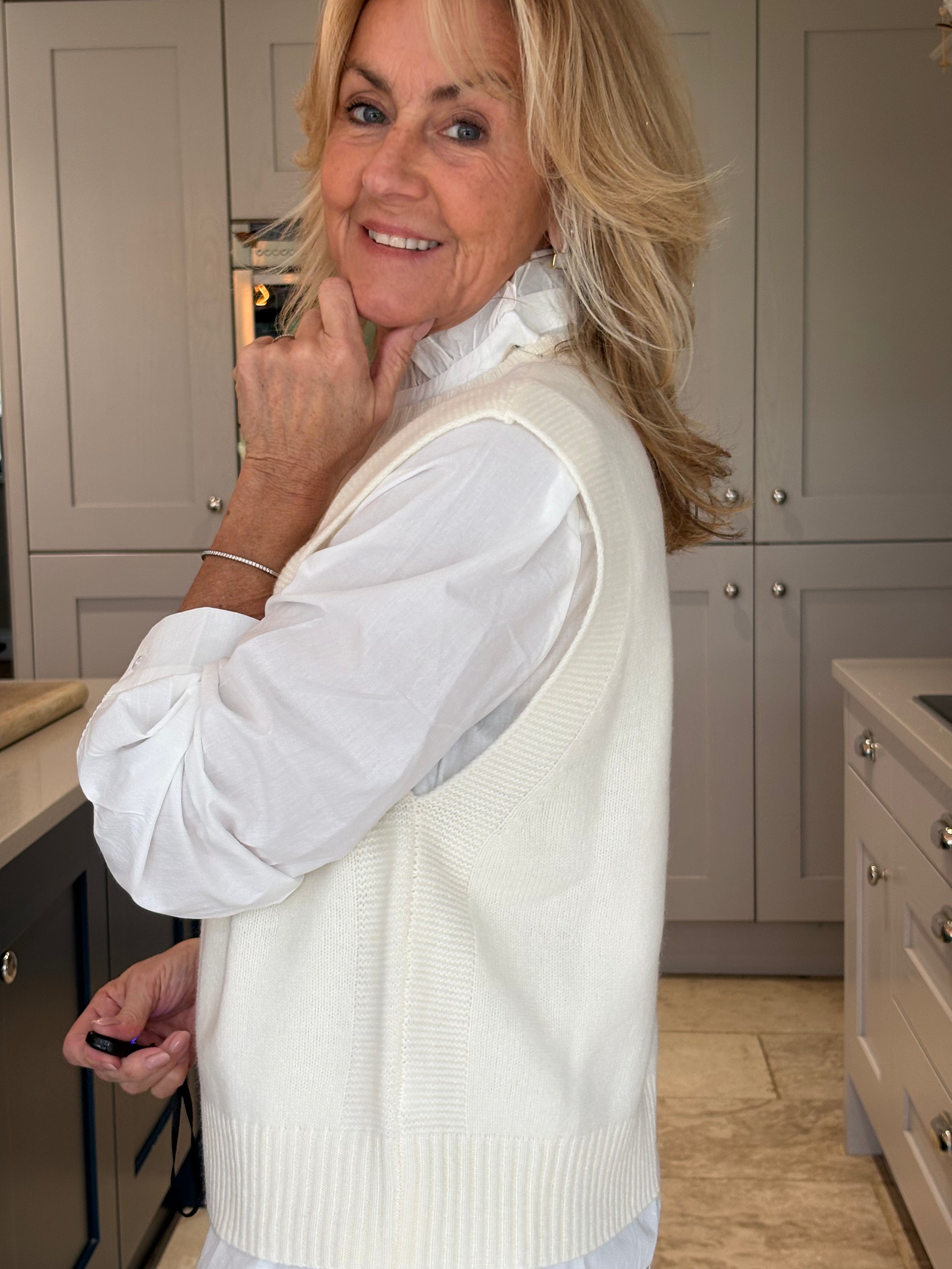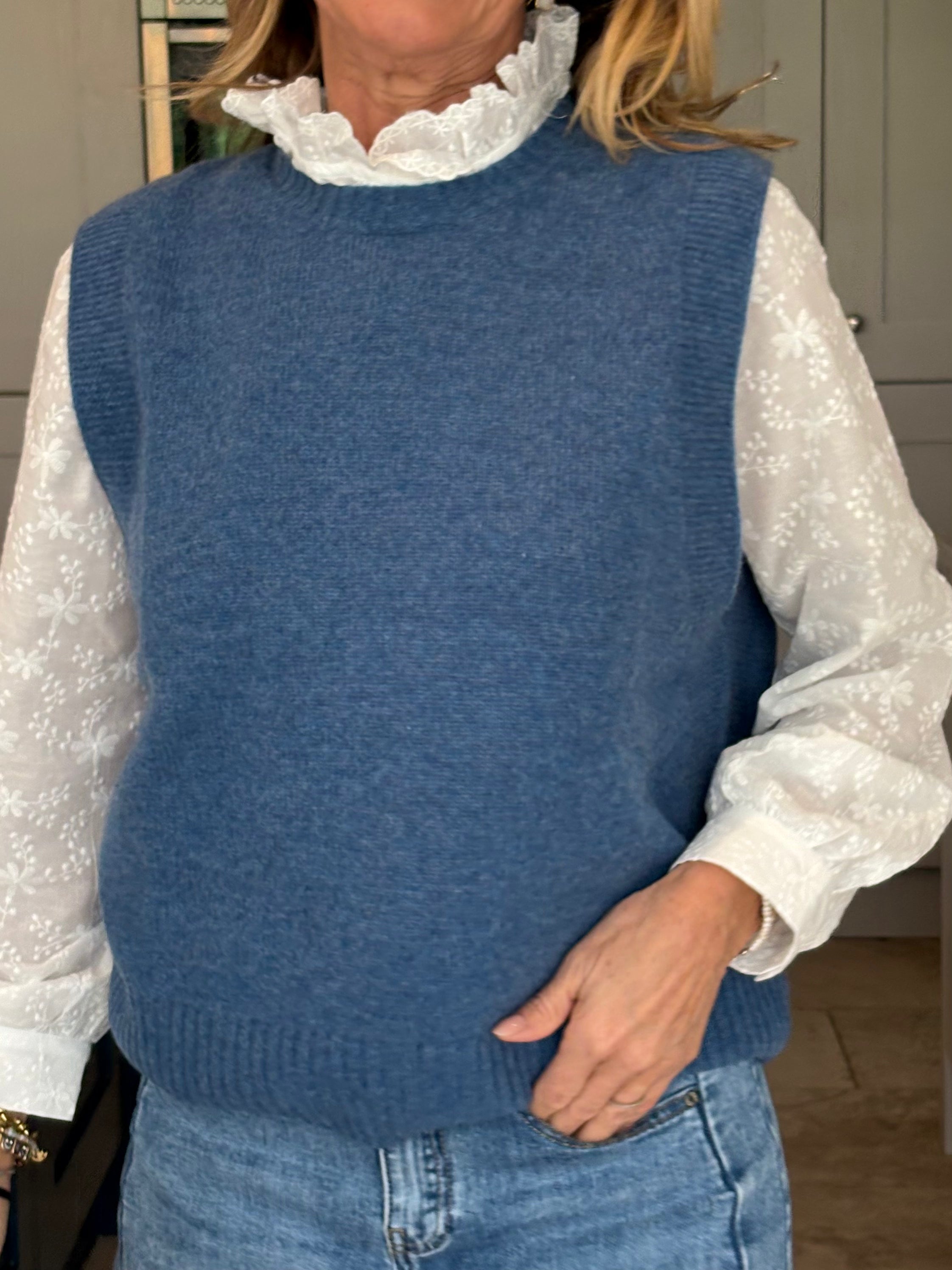 A gorgeous classic pure wool tank top beautifully crafted to combine warmth with effortless sophistication. The premium wool is soft and gentle on the skin. Subtle contrasting knitting patterns add depth and texture, creating visual interest without overpowering its timeless design. The clean lines are complemented by a classic crew neckline, giving it a polished, versatile finish. Generously cut armholes enhance its relaxed elegance, making it perfect for layering over a crisp shirt or flowing dress. Designed for effortless styling, this piece transitions seamlessly between seasons.