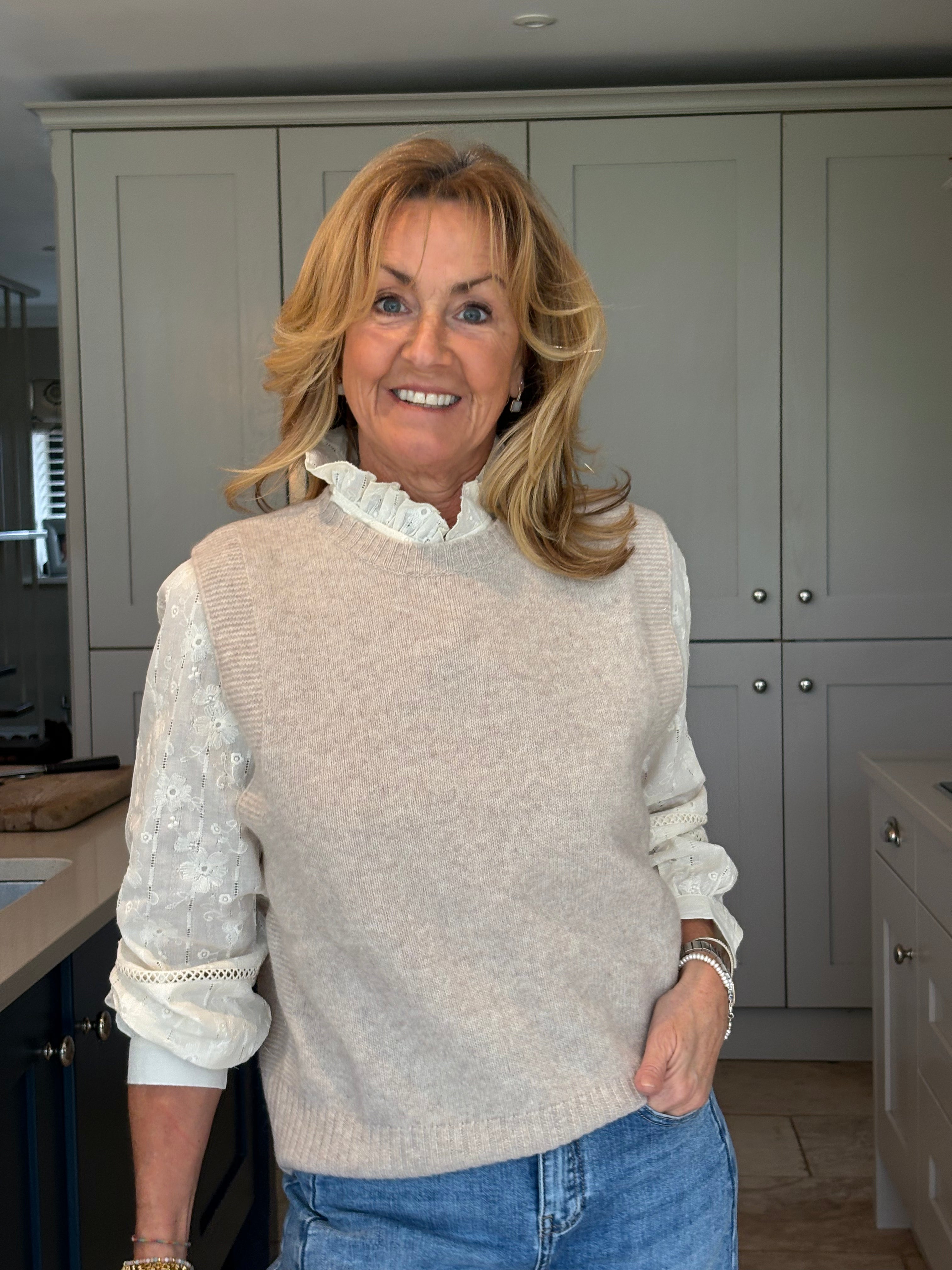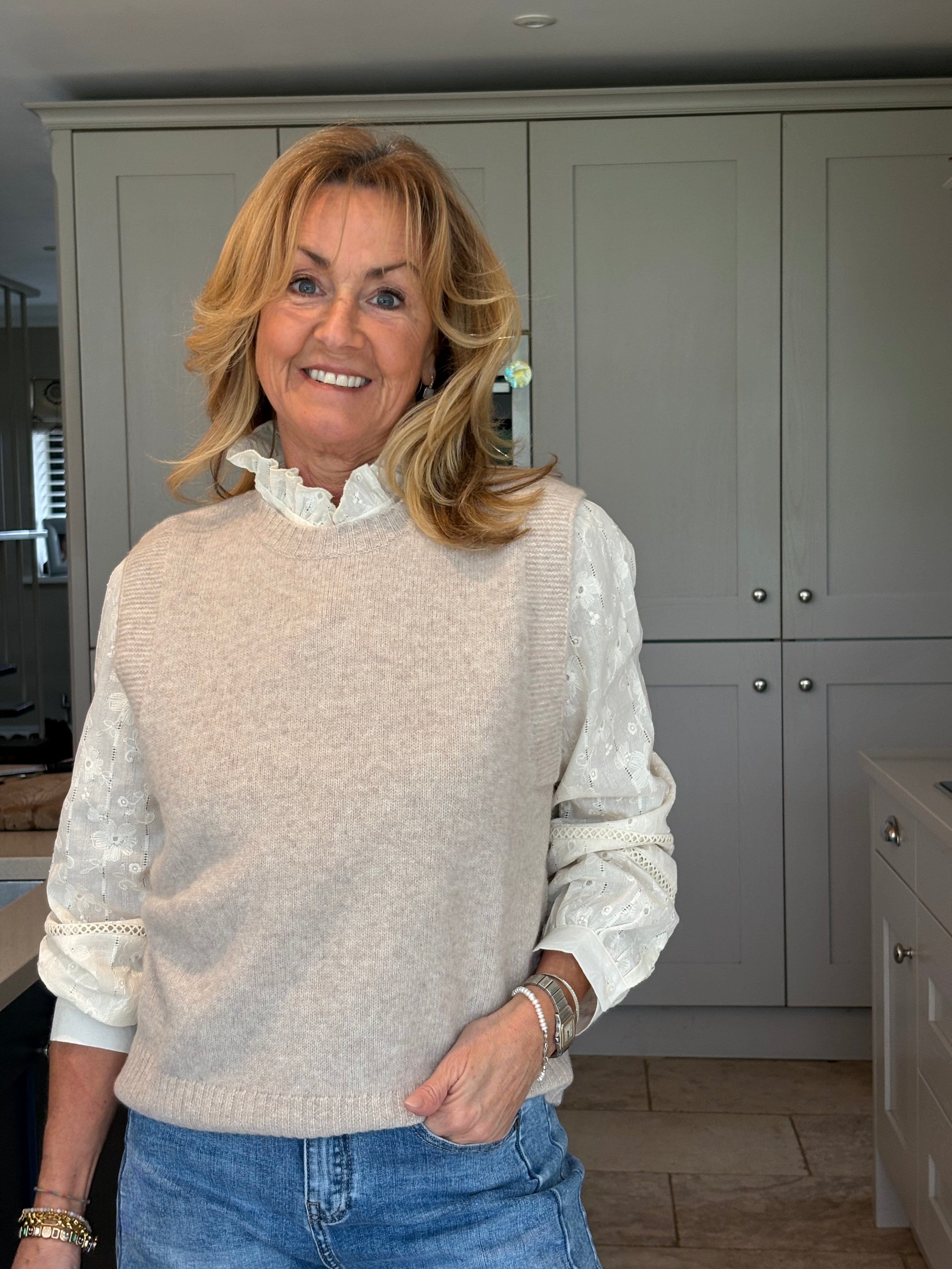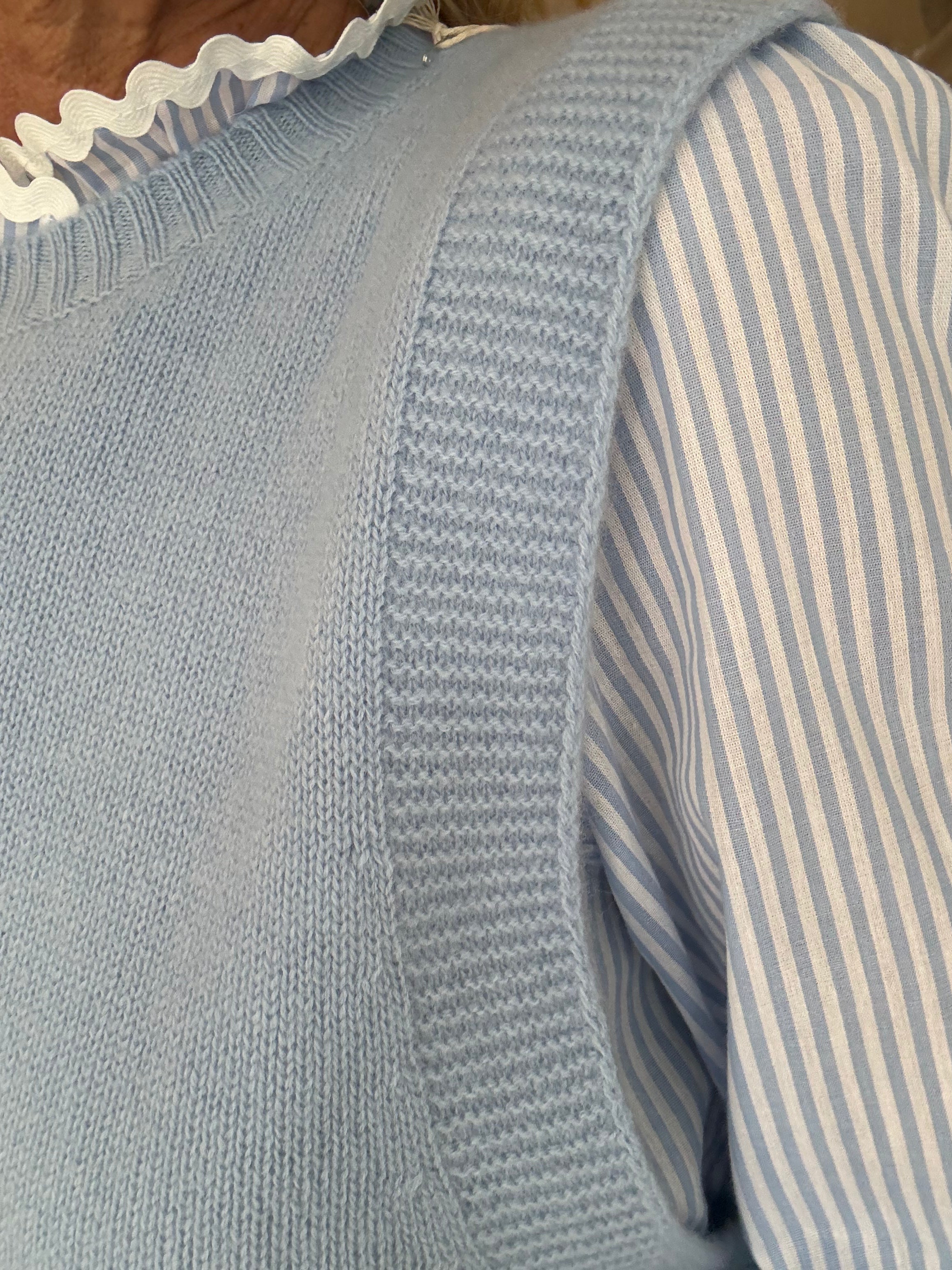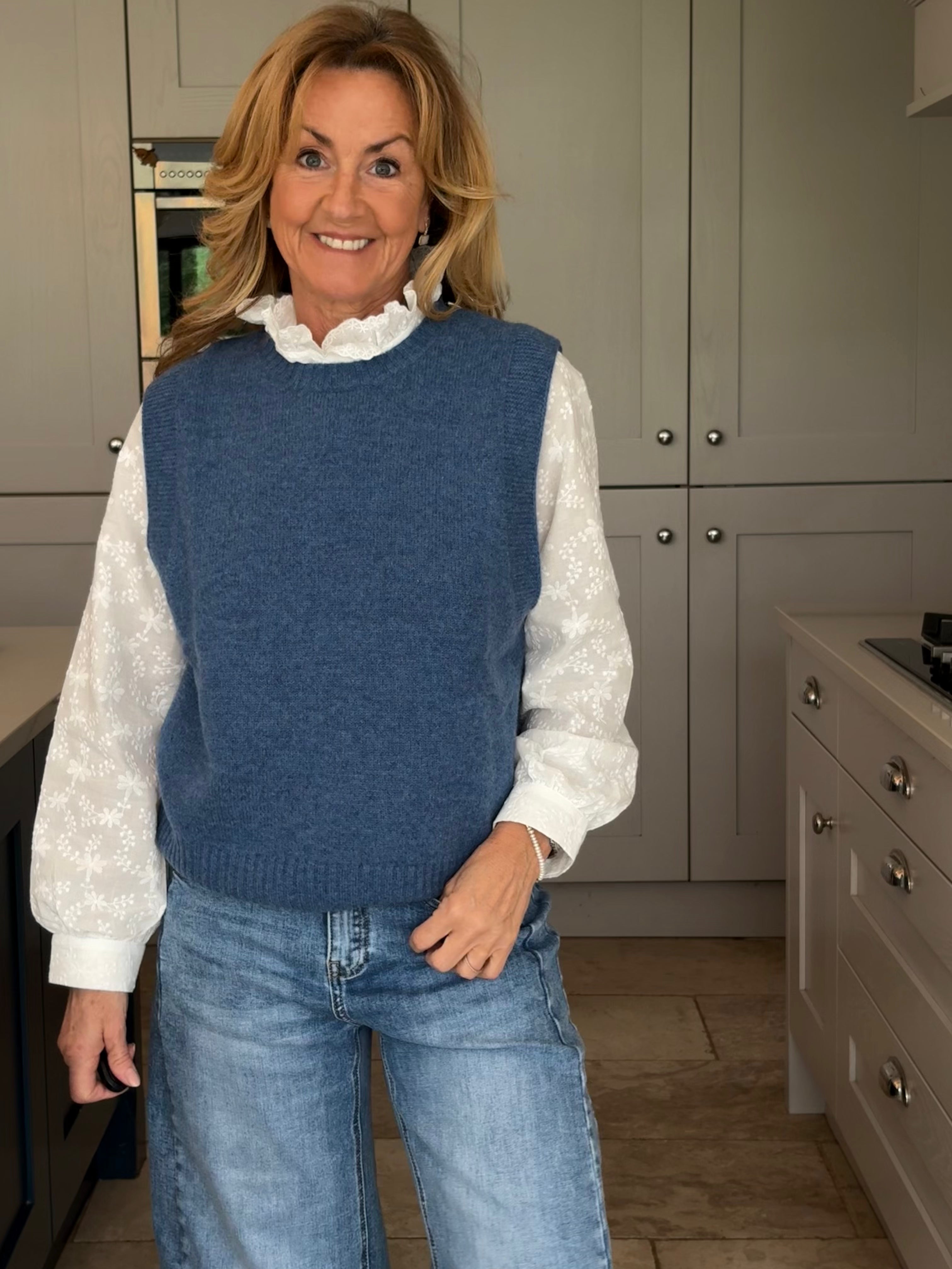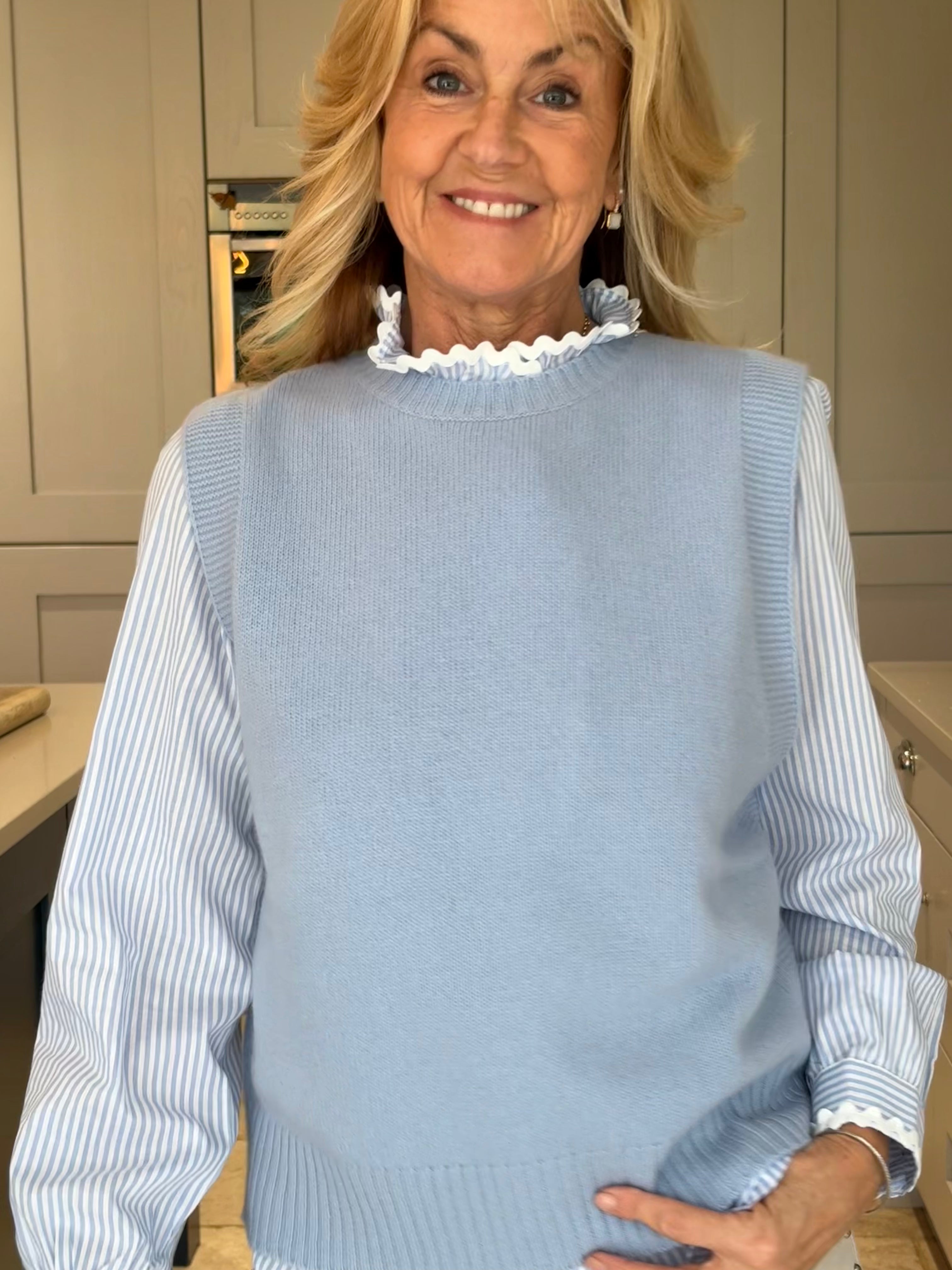 A gorgeous classic pure wool tank top beautifully crafted to combine warmth with effortless sophistication. The premium wool is soft and gentle on the skin. Subtle contrasting knitting patterns add depth and texture, creating visual interest without overpowering its timeless design. The clean lines are complemented by a classic crew neckline, giving it a polished, versatile finish. Generously cut armholes enhance its relaxed elegance, making it perfect for layering over a crisp shirt or flowing dress. Designed for effortless styling, this piece transitions seamlessly between seasons.