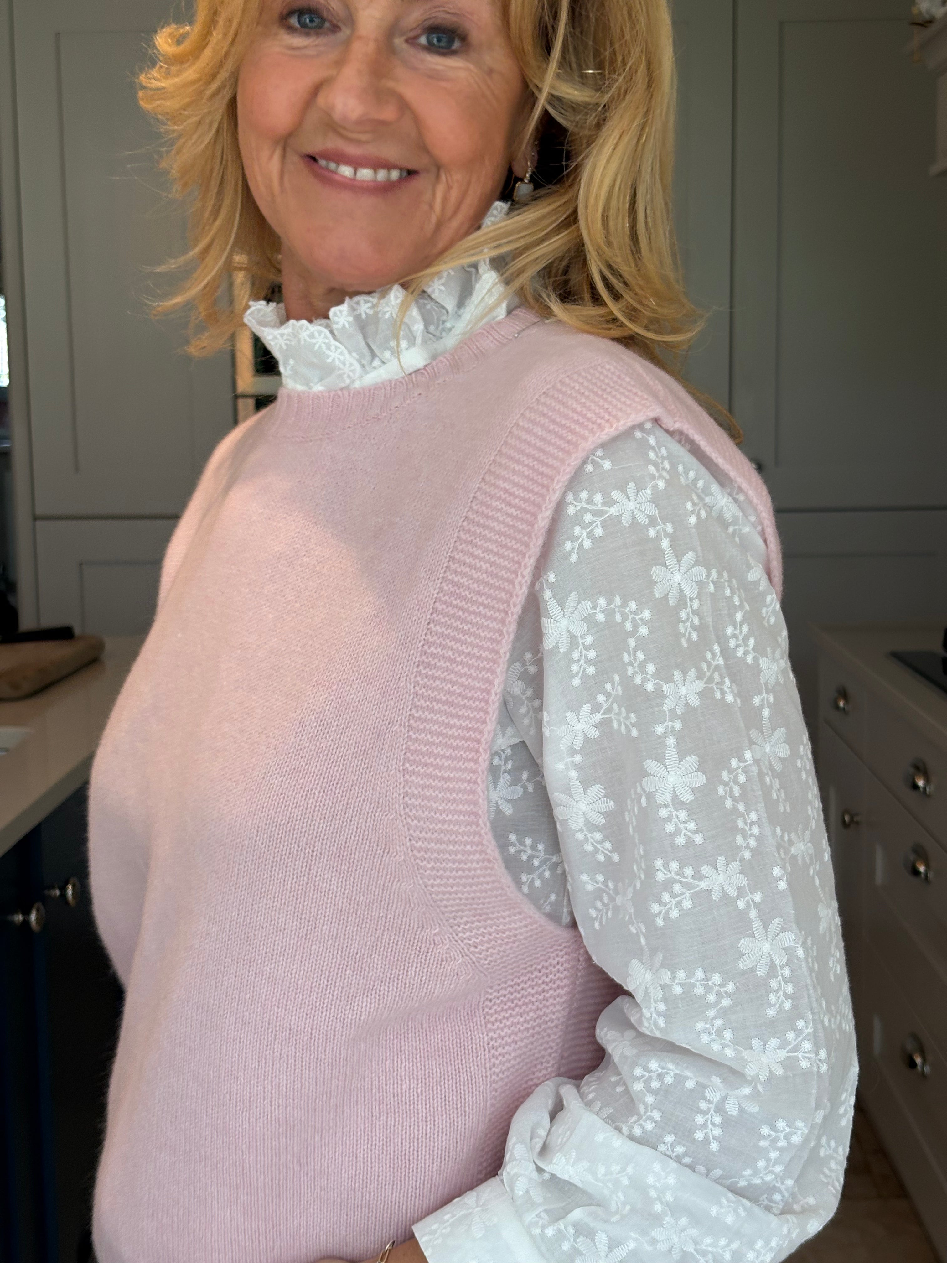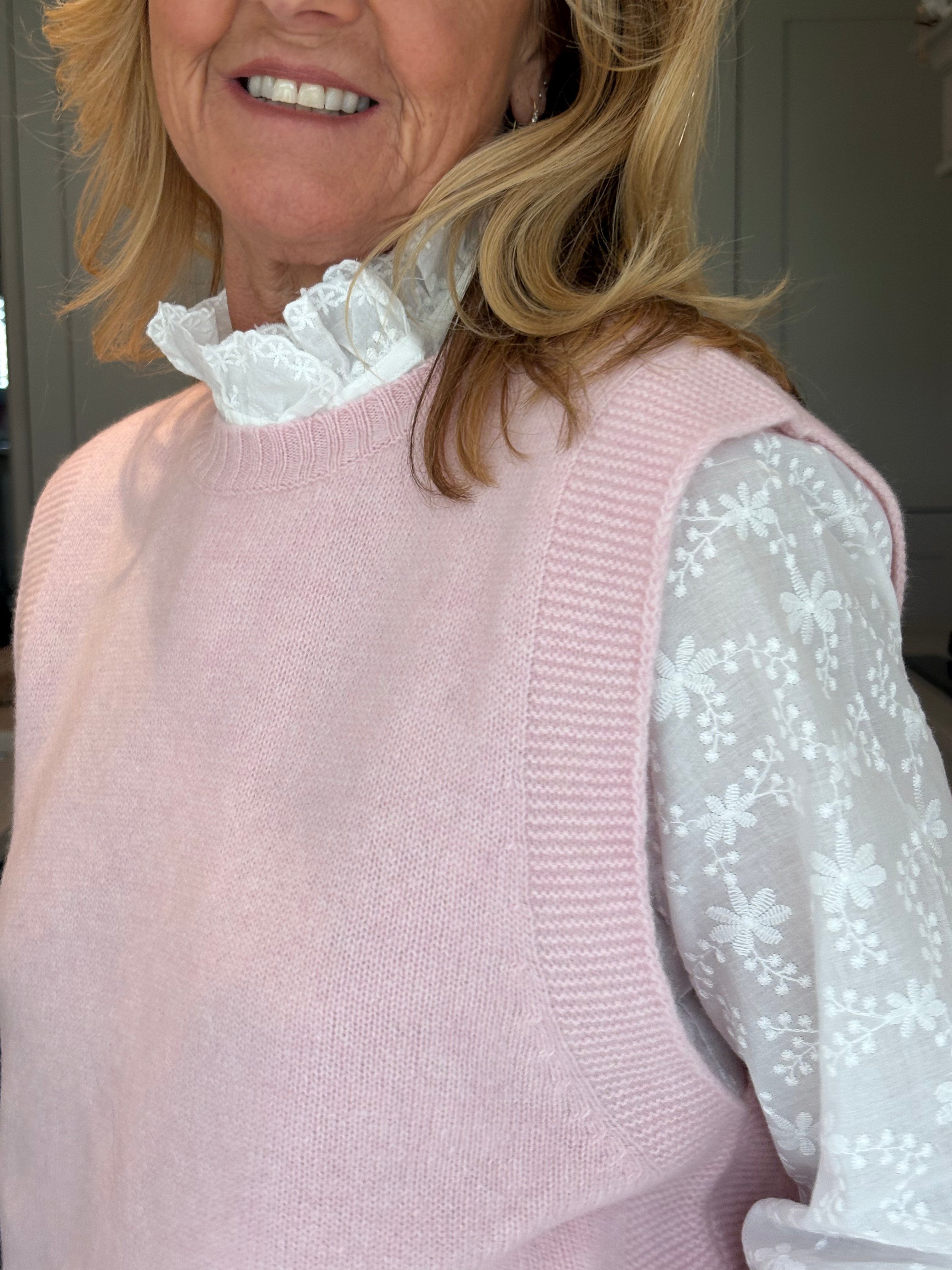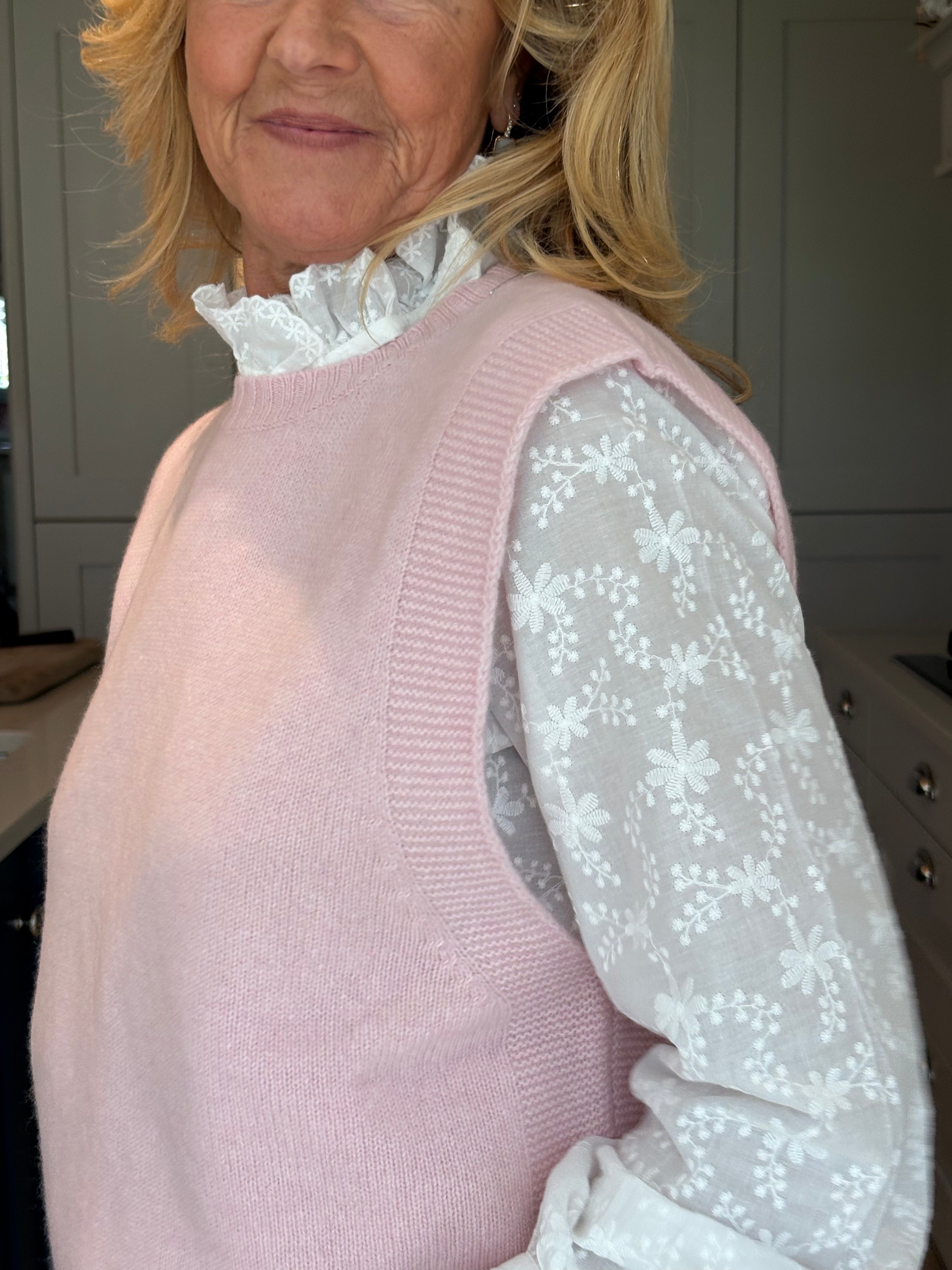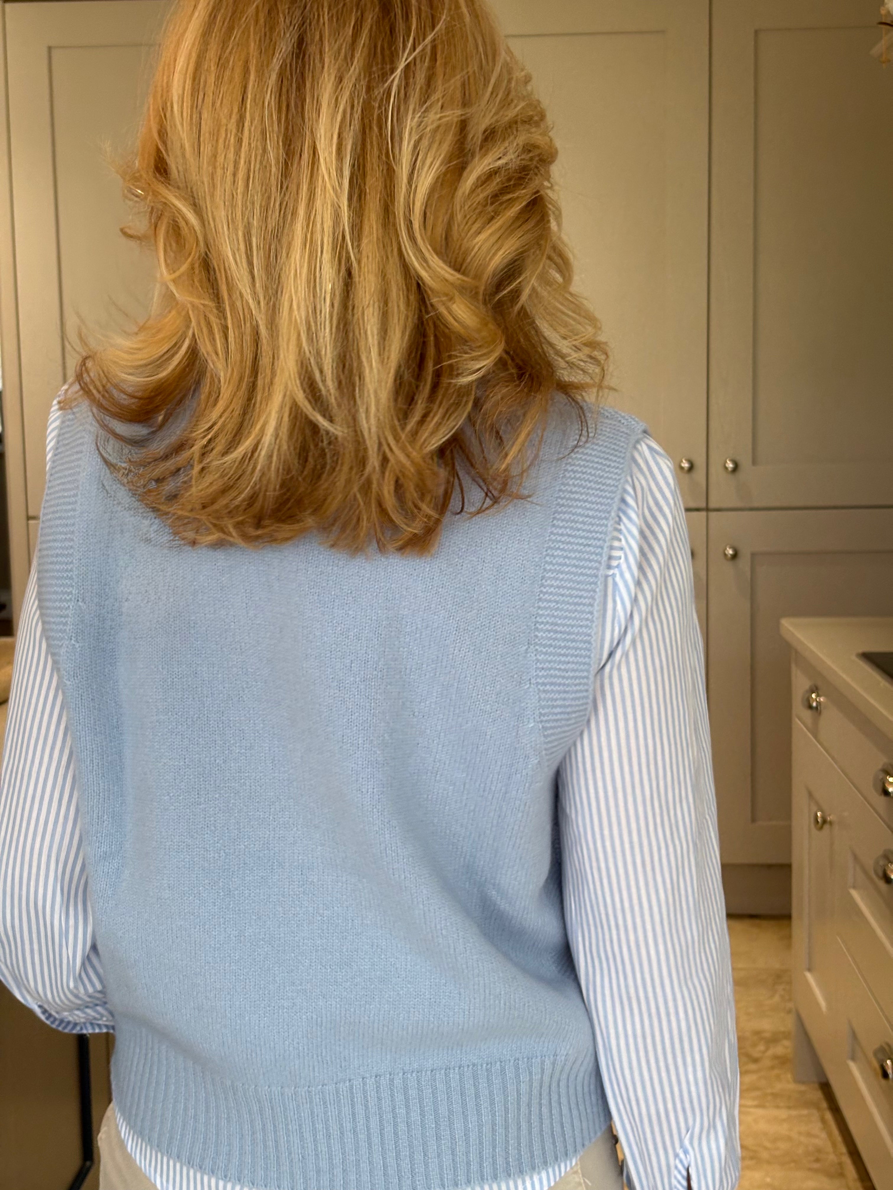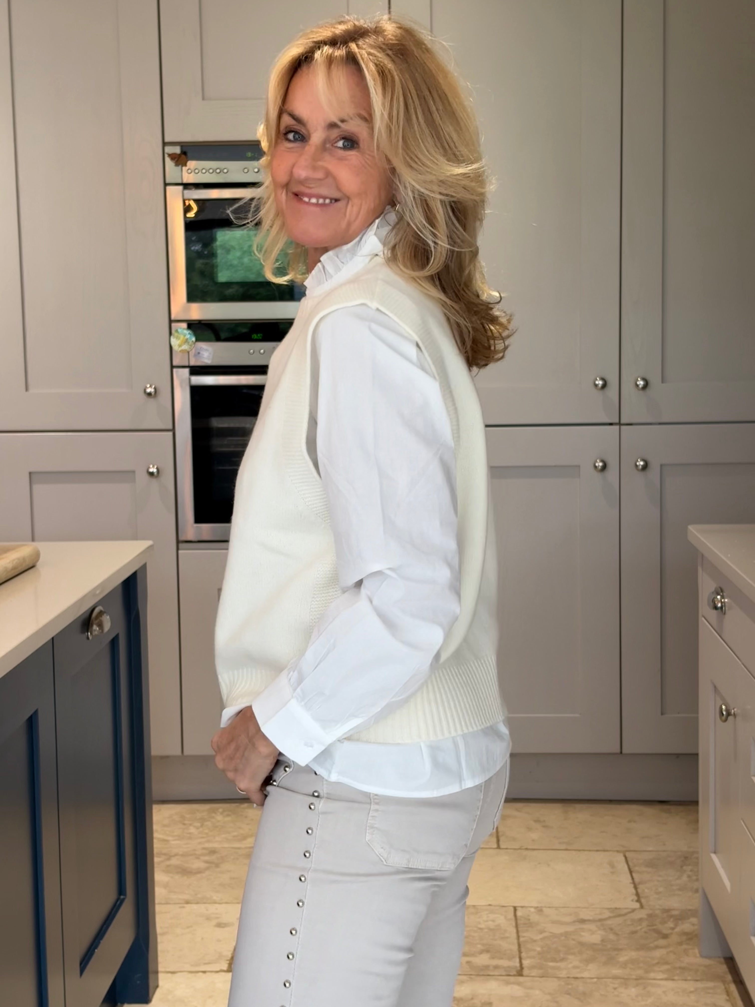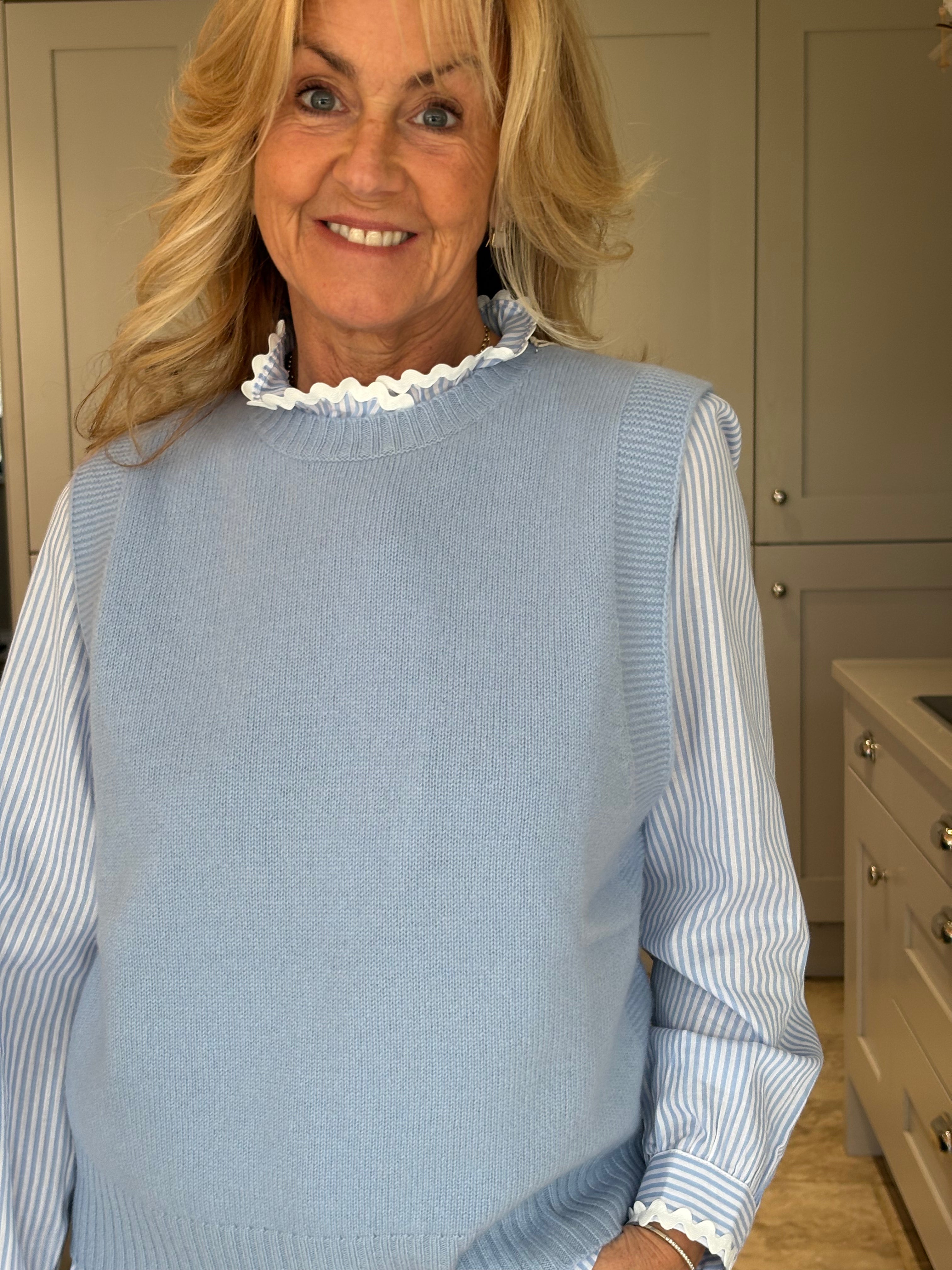 A gorgeous classic pure wool tank top beautifully crafted to combine warmth with effortless sophistication. The premium wool is soft and gentle on the skin. Subtle contrasting knitting patterns add depth and texture, creating visual interest without overpowering its timeless design. The clean lines are complemented by a classic crew neckline, giving it a polished, versatile finish. Generously cut armholes enhance its relaxed elegance, making it perfect for layering over a crisp shirt or flowing dress. Designed for effortless styling, this piece transitions seamlessly between seasons.