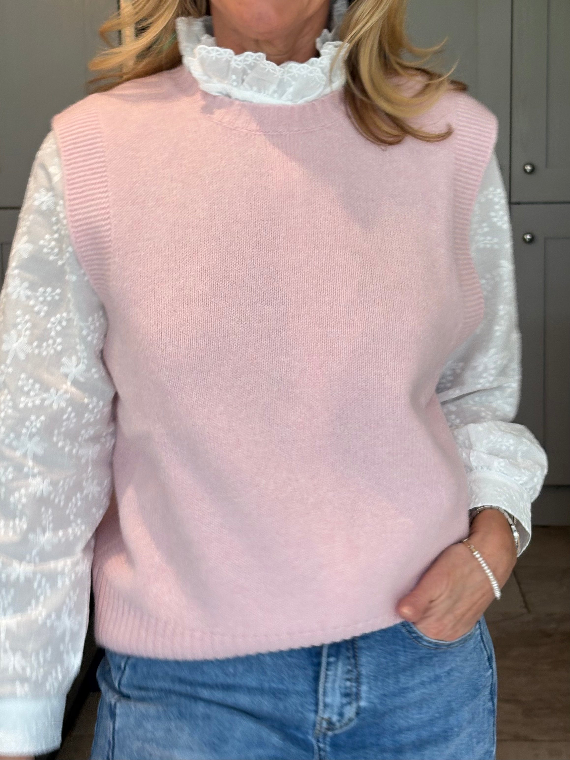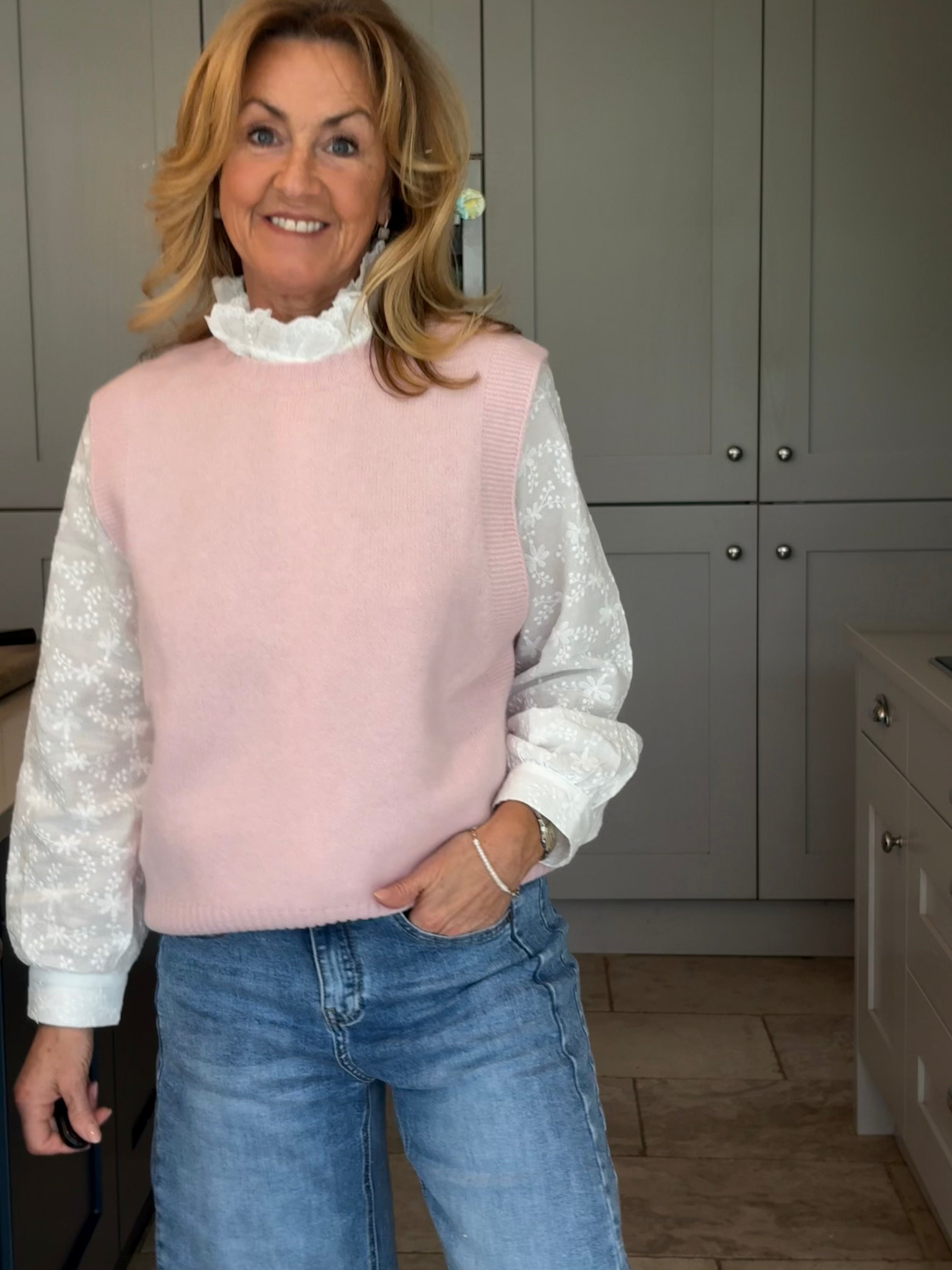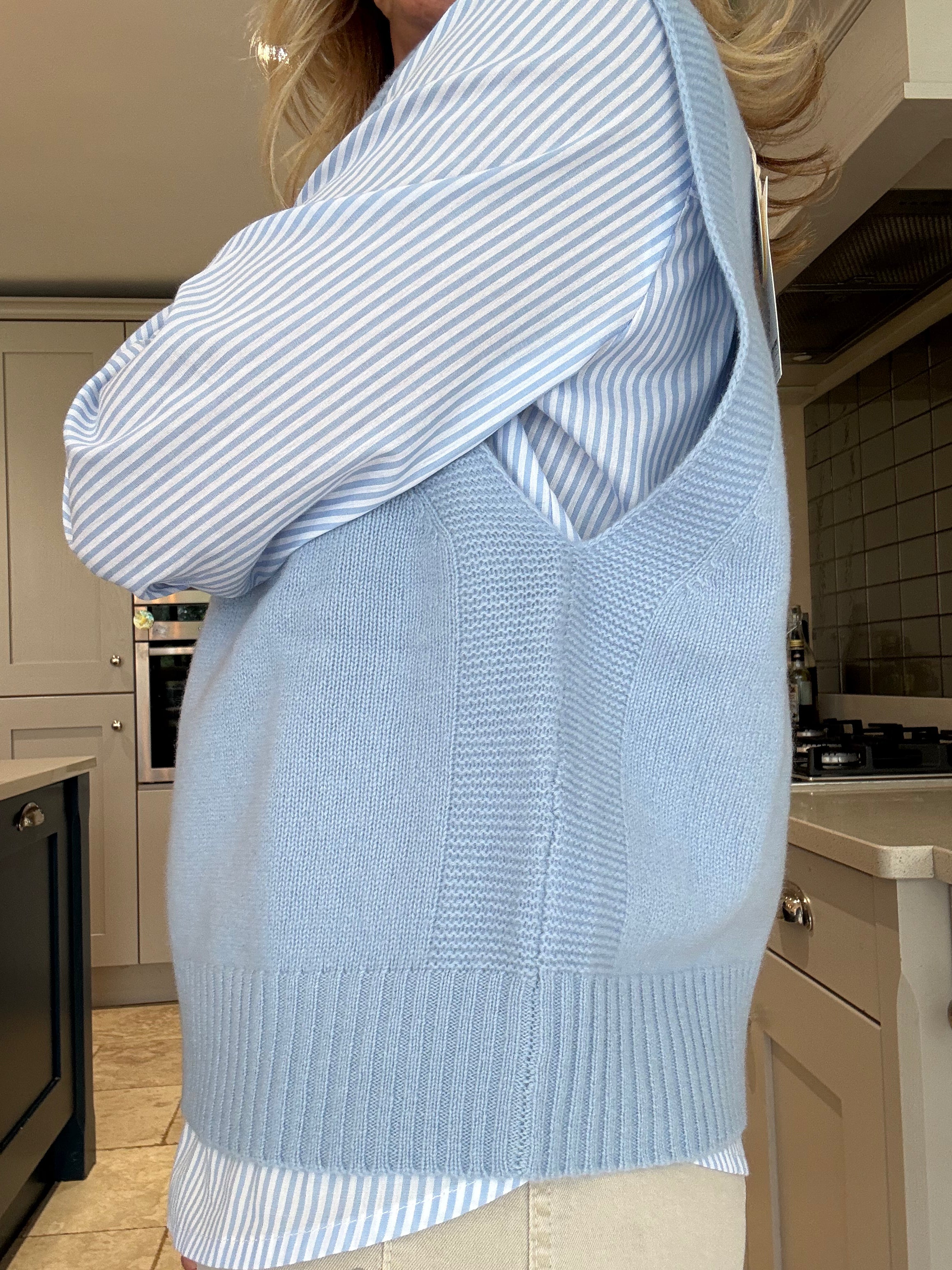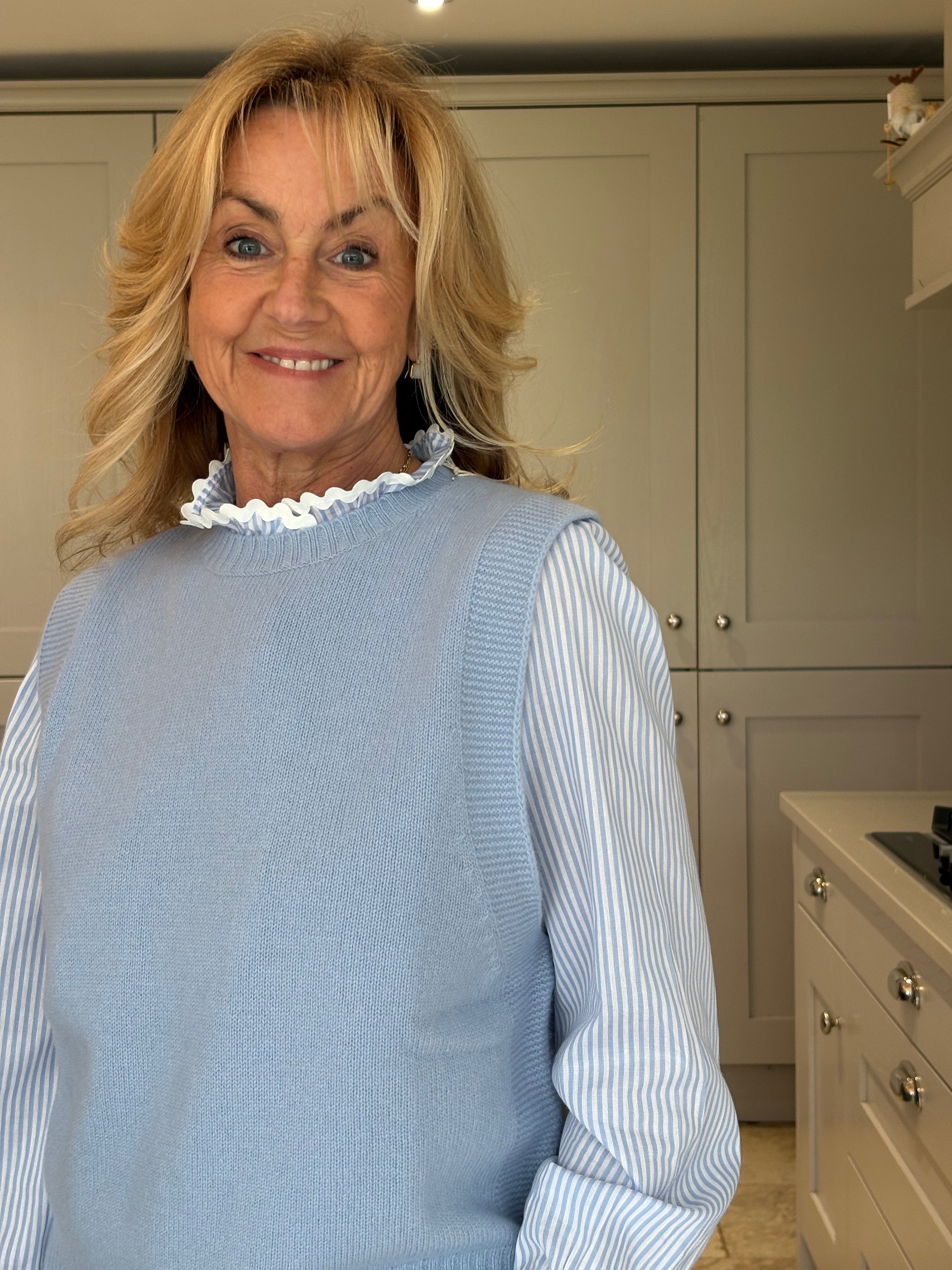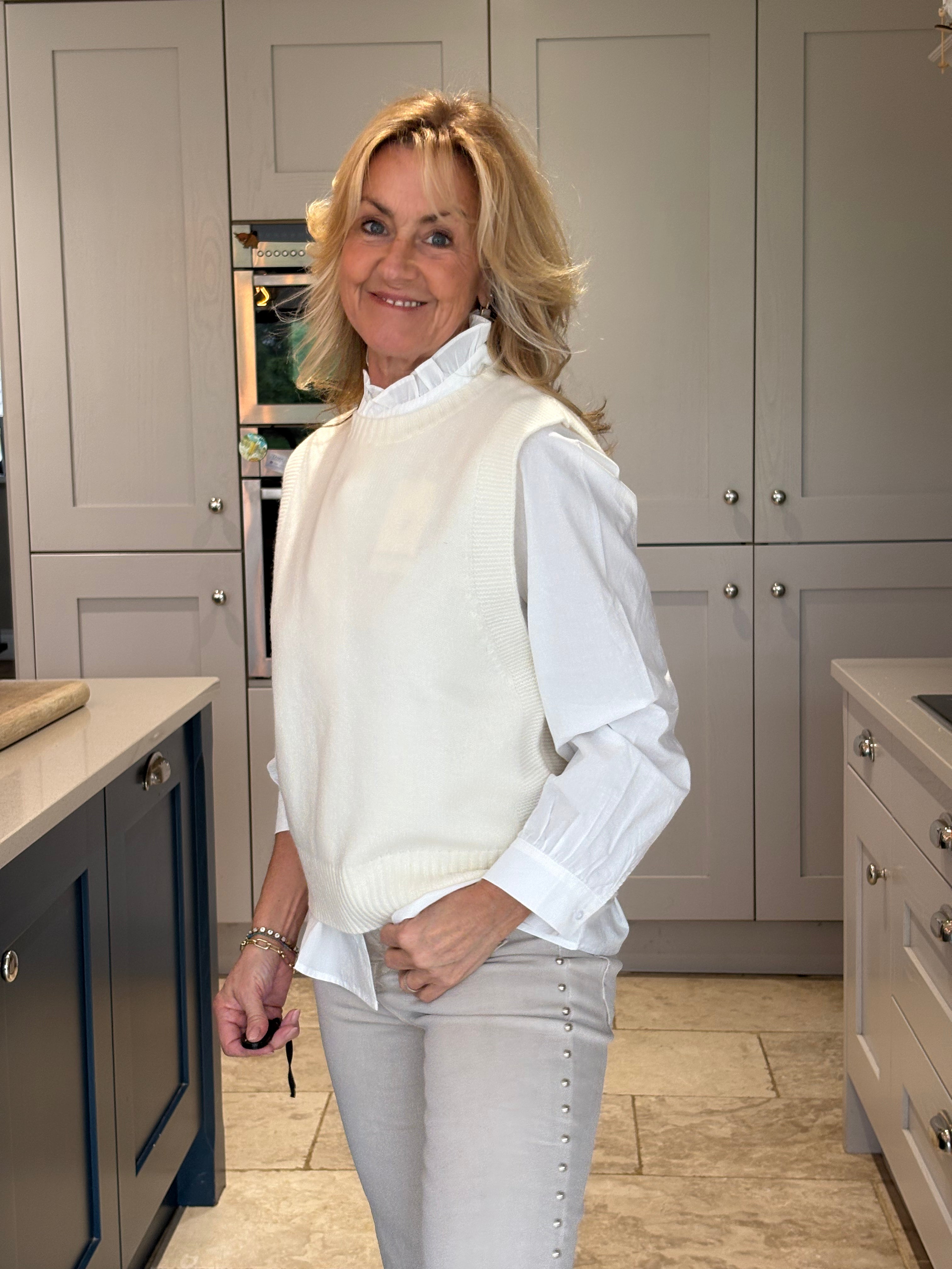 A gorgeous classic pure wool tank top beautifully crafted to combine warmth with effortless sophistication. The premium wool is soft and gentle on the skin. Subtle contrasting knitting patterns add depth and texture, creating visual interest without overpowering its timeless design. The clean lines are complemented by a classic crew neckline, giving it a polished, versatile finish. Generously cut armholes enhance its relaxed elegance, making it perfect for layering over a crisp shirt or flowing dress. Designed for effortless styling, this piece transitions seamlessly between seasons.
