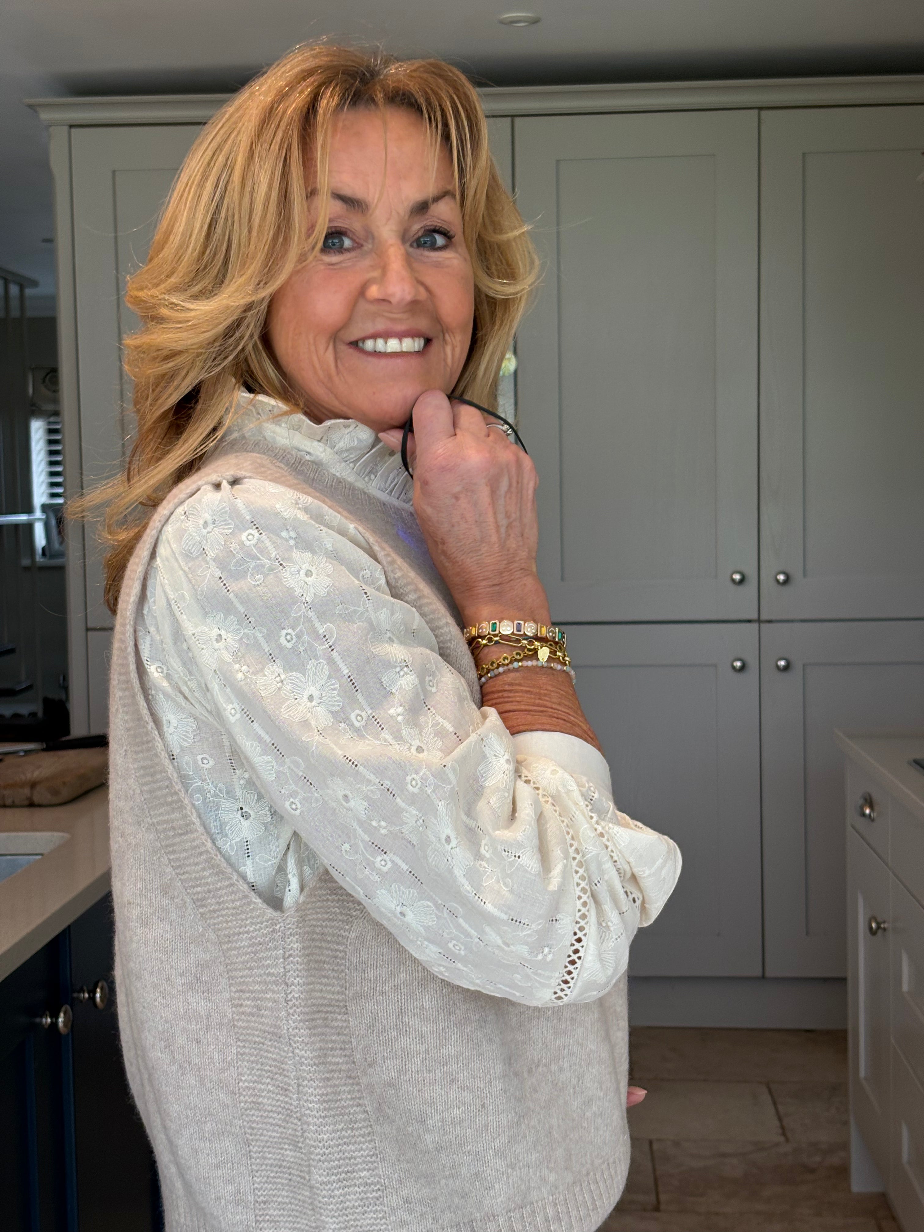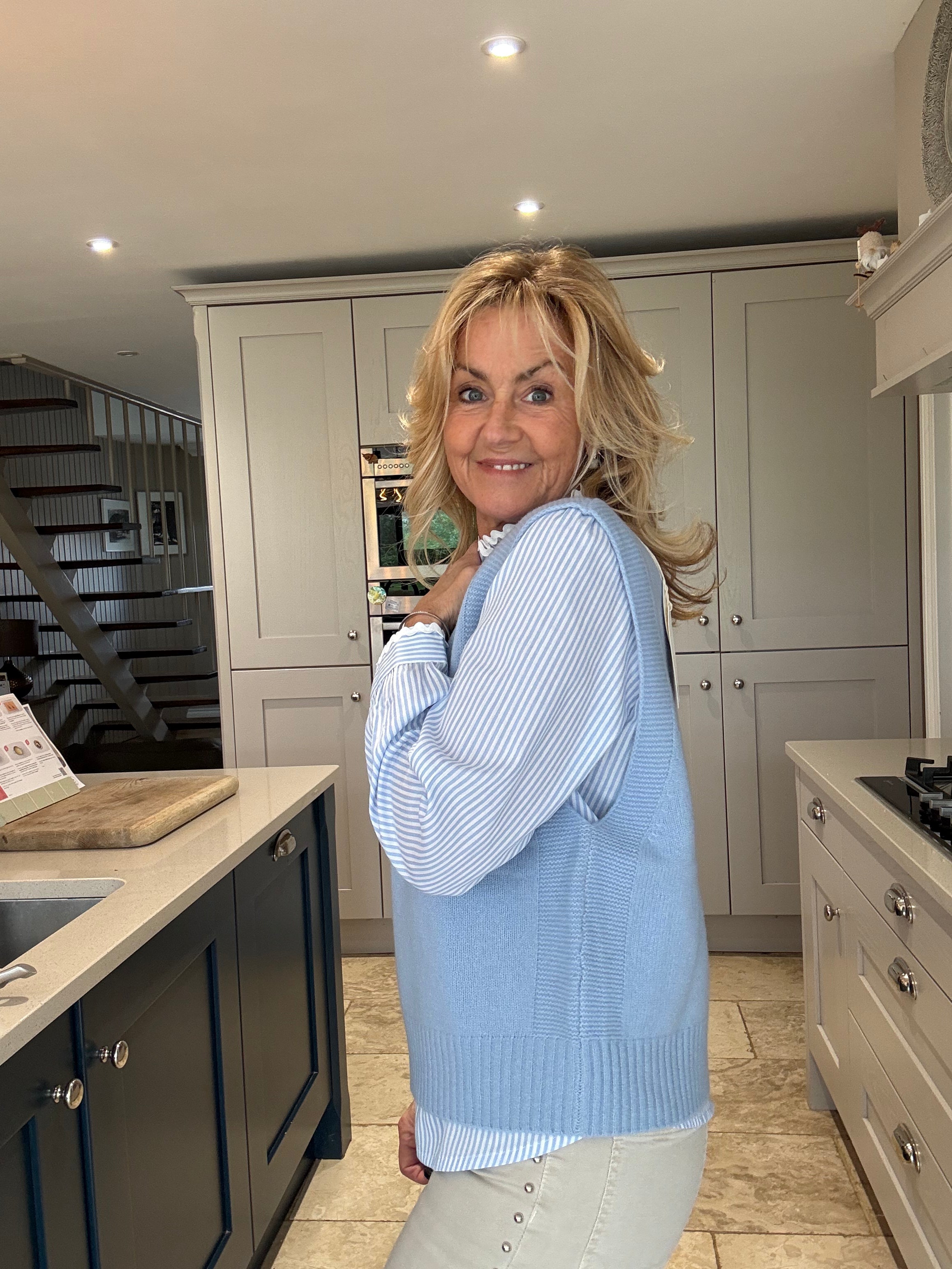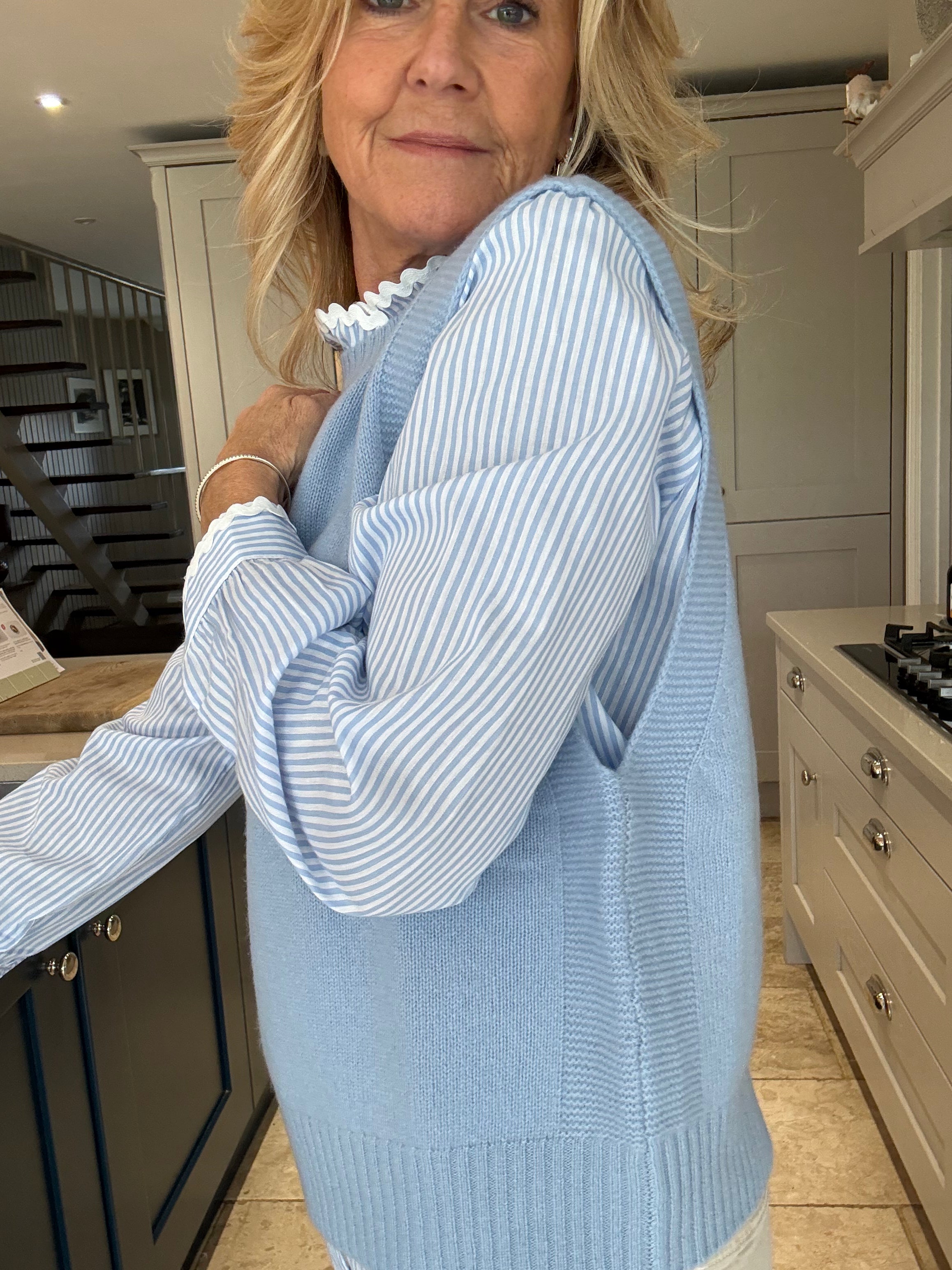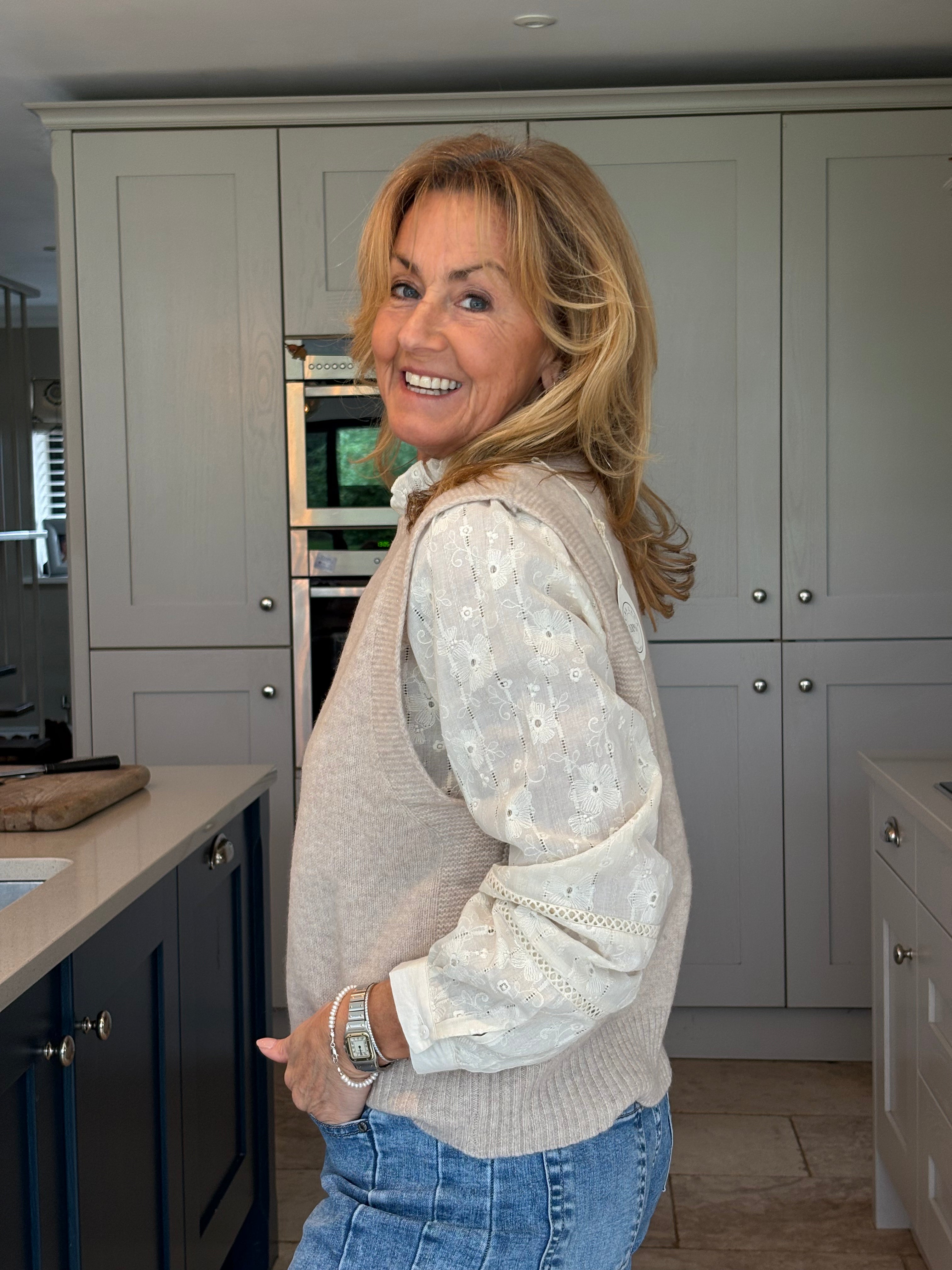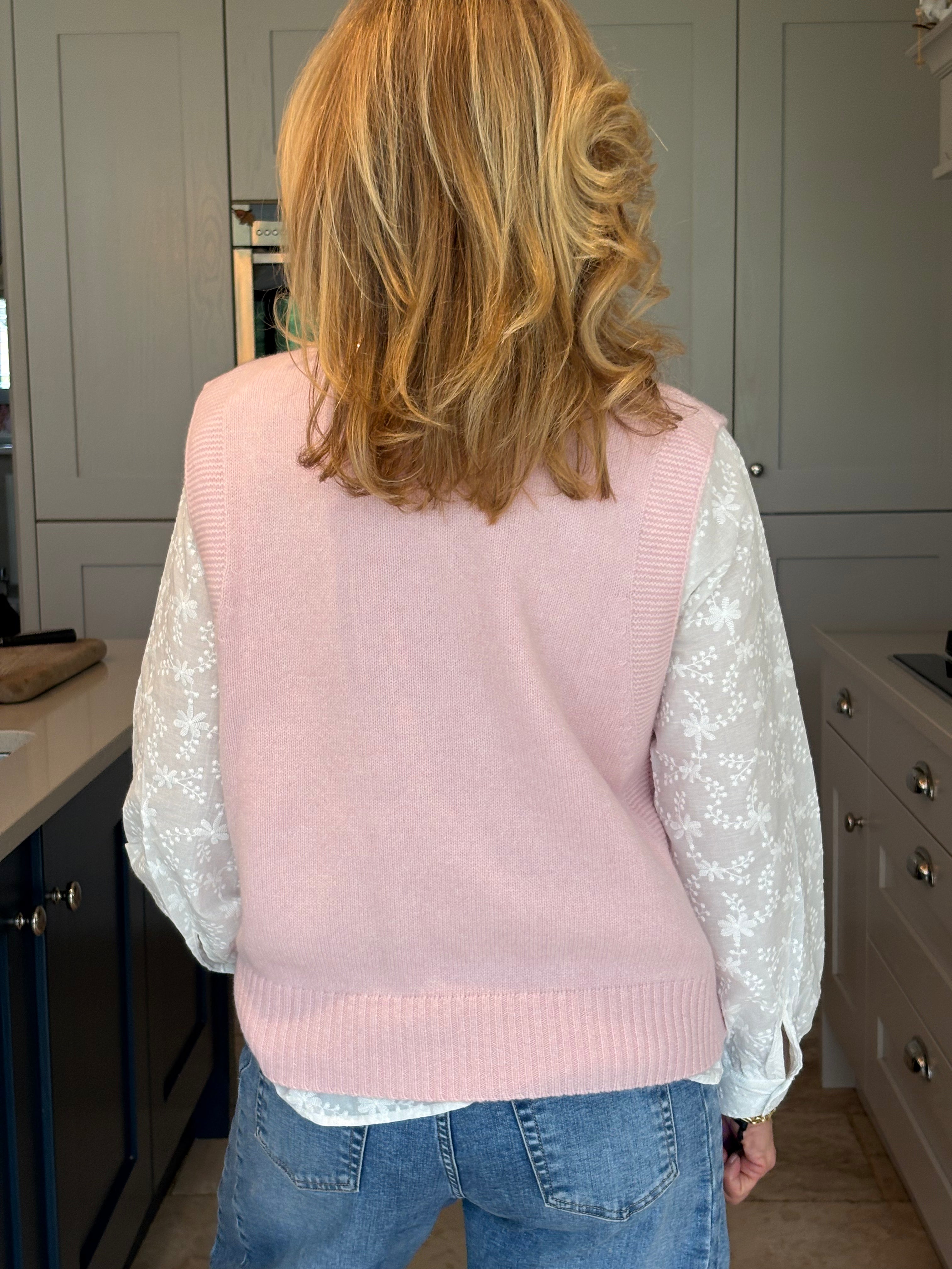 A gorgeous classic pure wool tank top beautifully crafted to combine warmth with effortless sophistication. The premium wool is soft and gentle on the skin. Subtle contrasting knitting patterns add depth and texture, creating visual interest without overpowering its timeless design. The clean lines are complemented by a classic crew neckline, giving it a polished, versatile finish. Generously cut armholes enhance its relaxed elegance, making it perfect for layering over a crisp shirt or flowing dress. Designed for effortless styling, this piece transitions seamlessly between seasons.