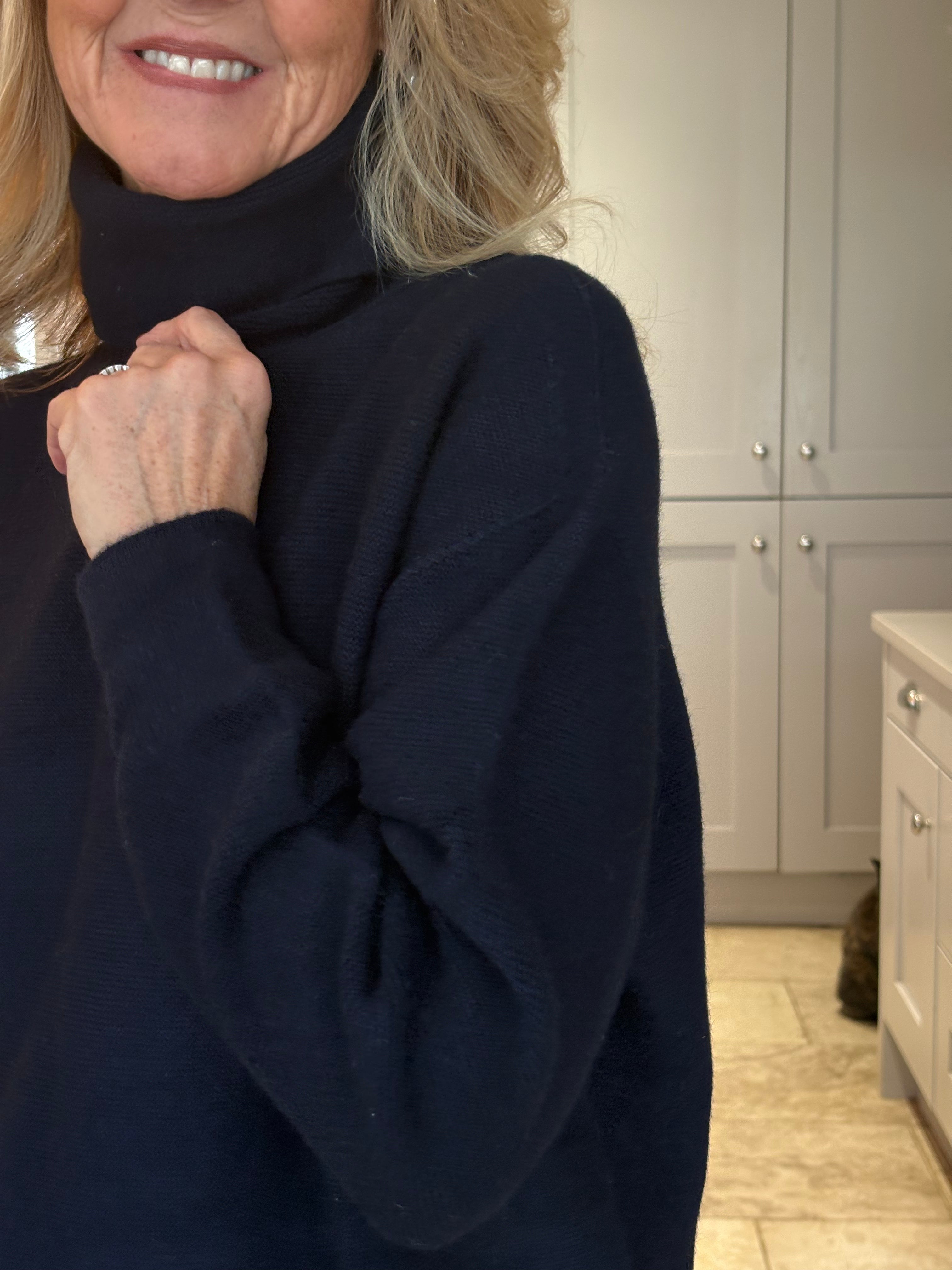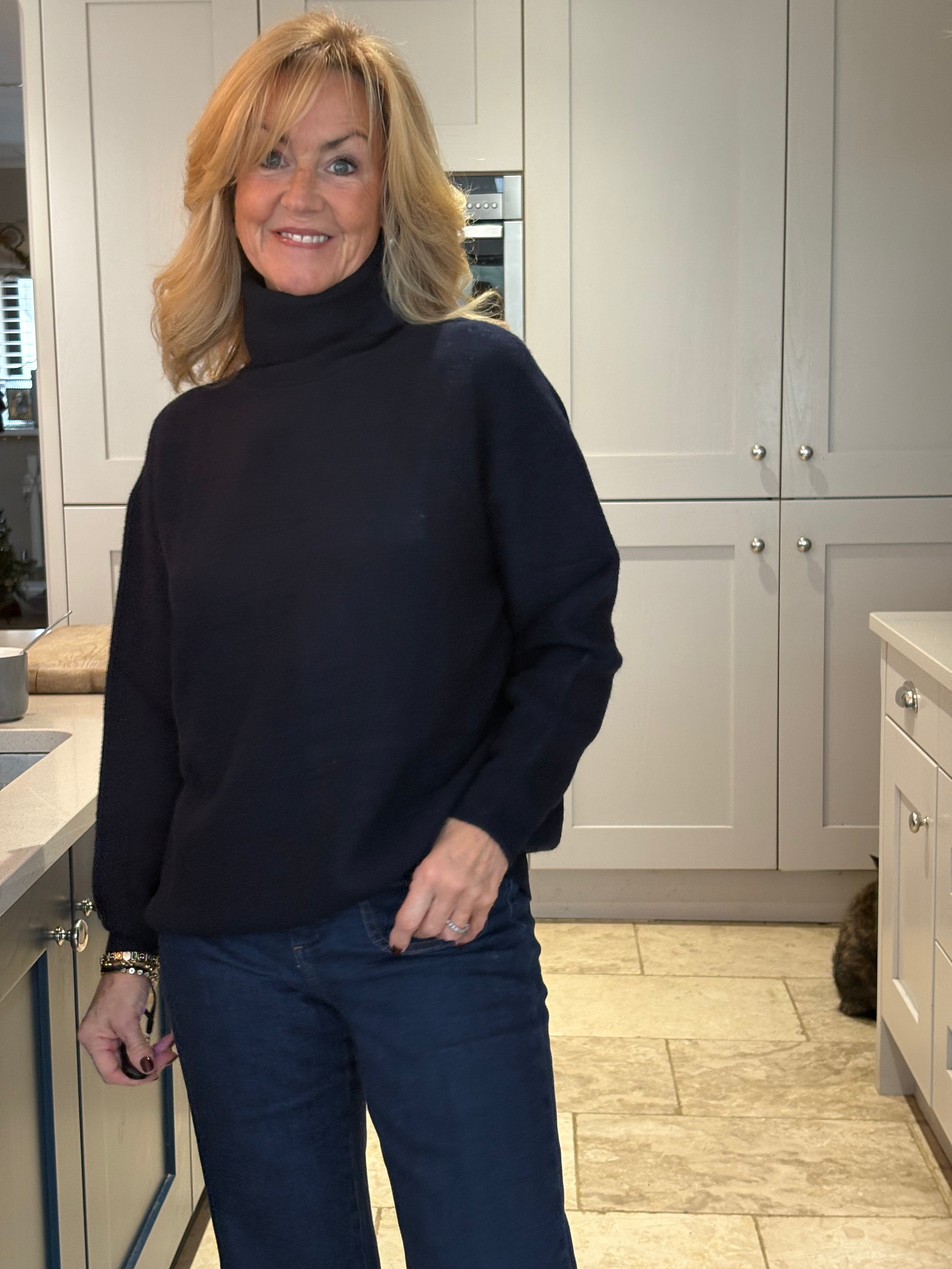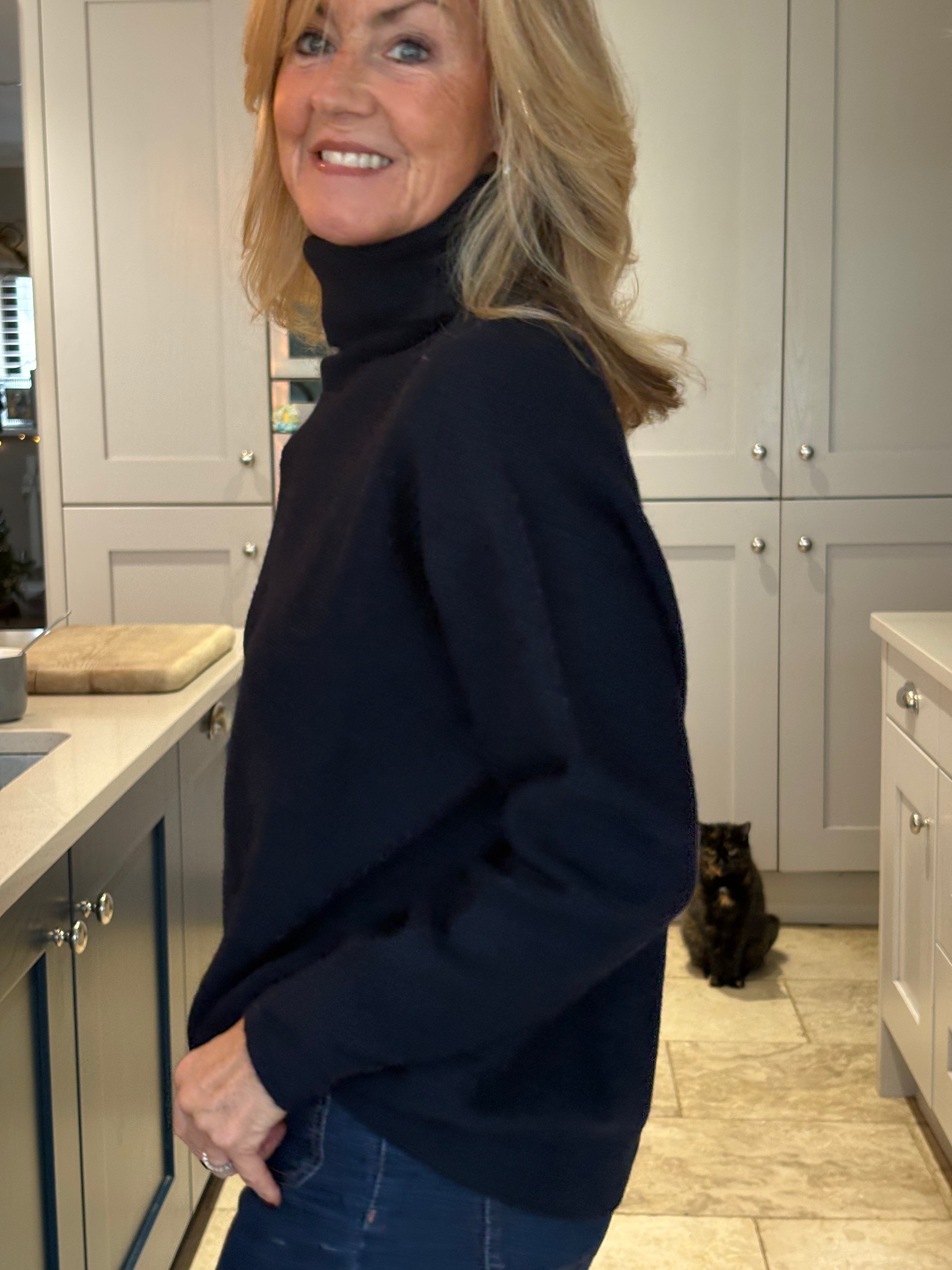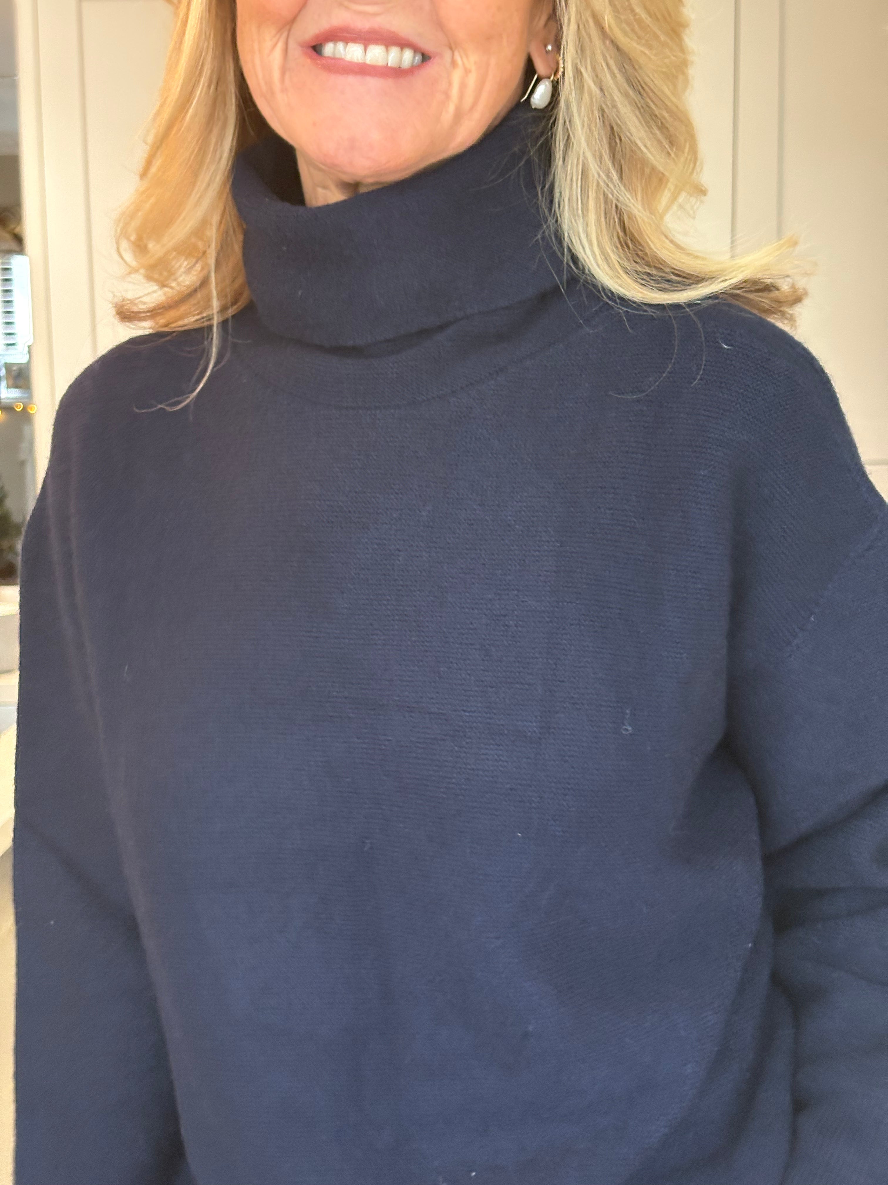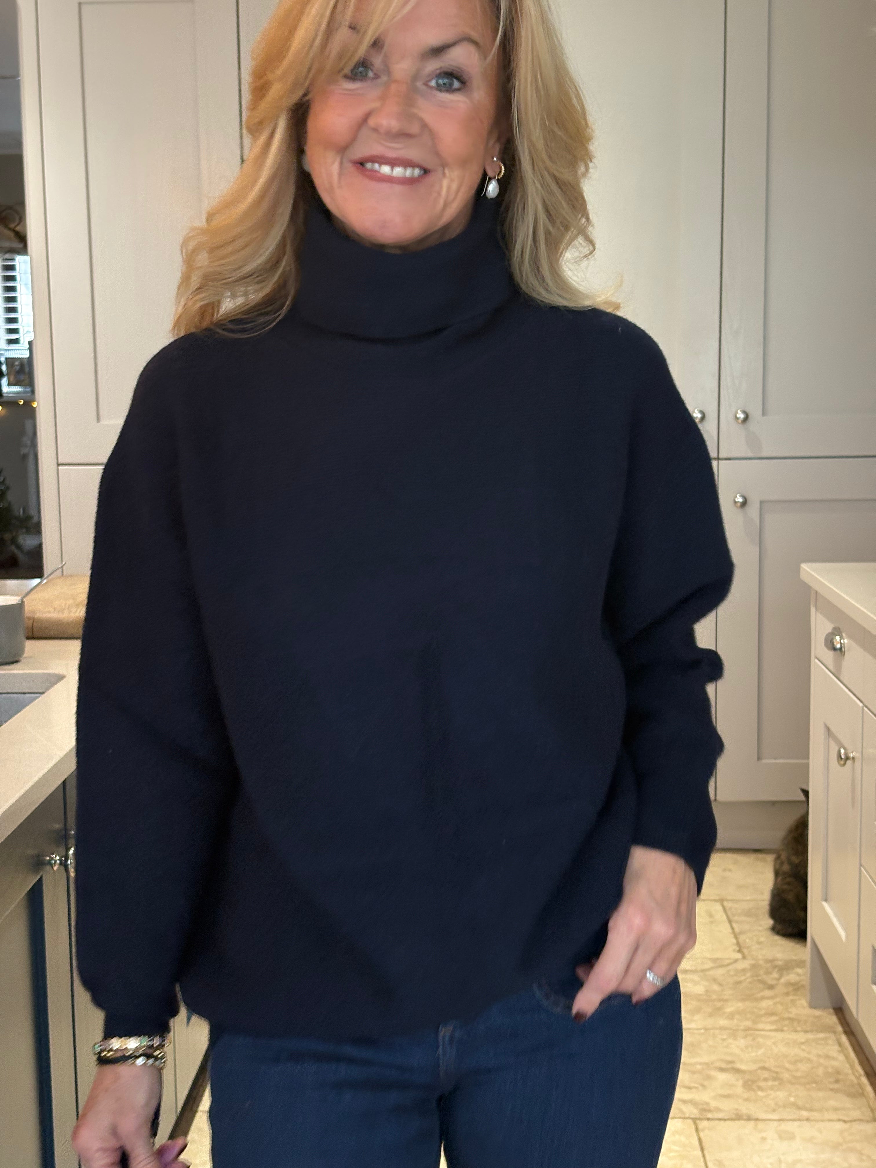 A beautidul, classic, weighty navy blue polo neck jumper.  Ribbed cuffs and hemlime and a fairly loose, high polo neck.  Loosely fitted body and falling to below hip length.