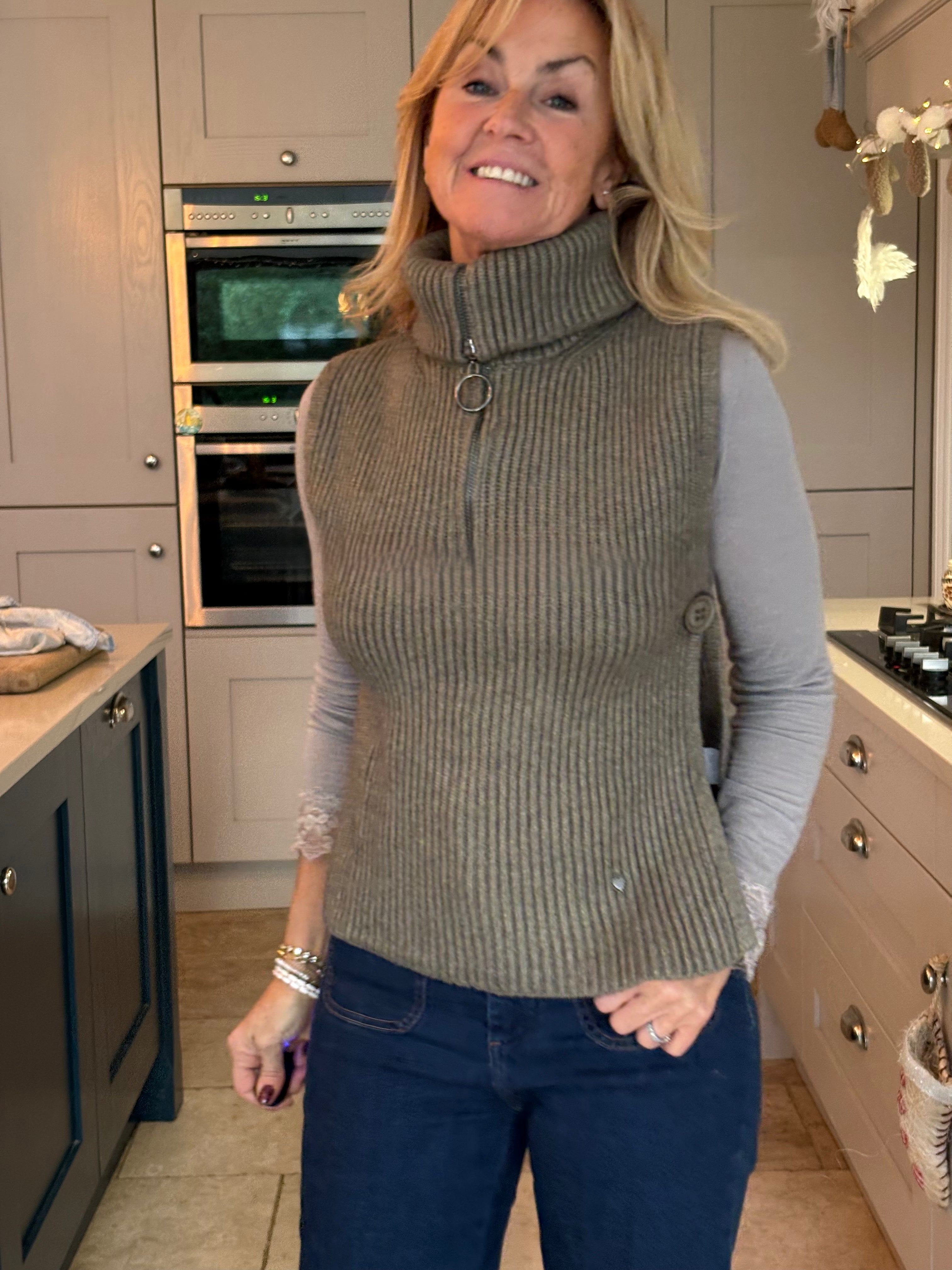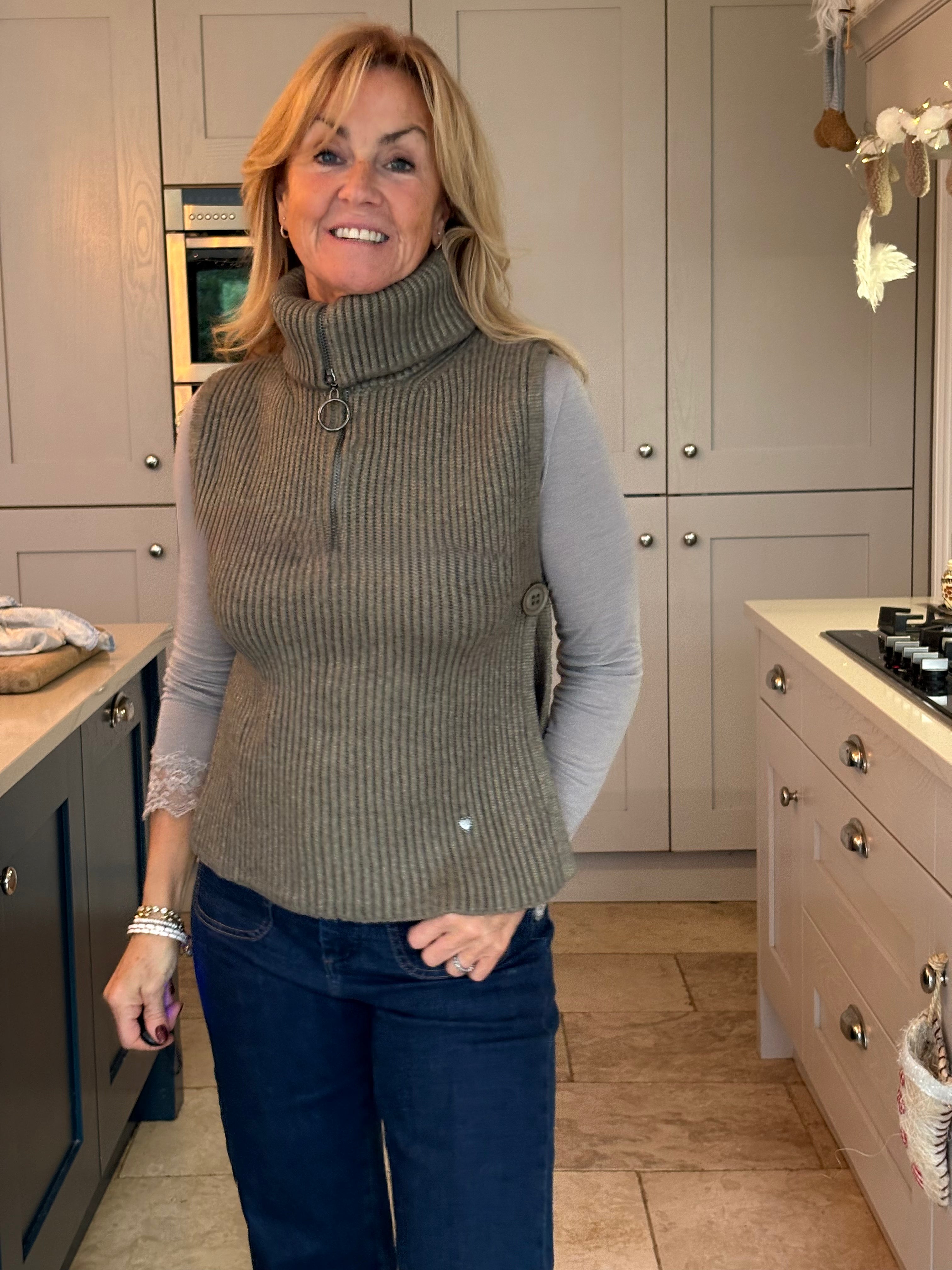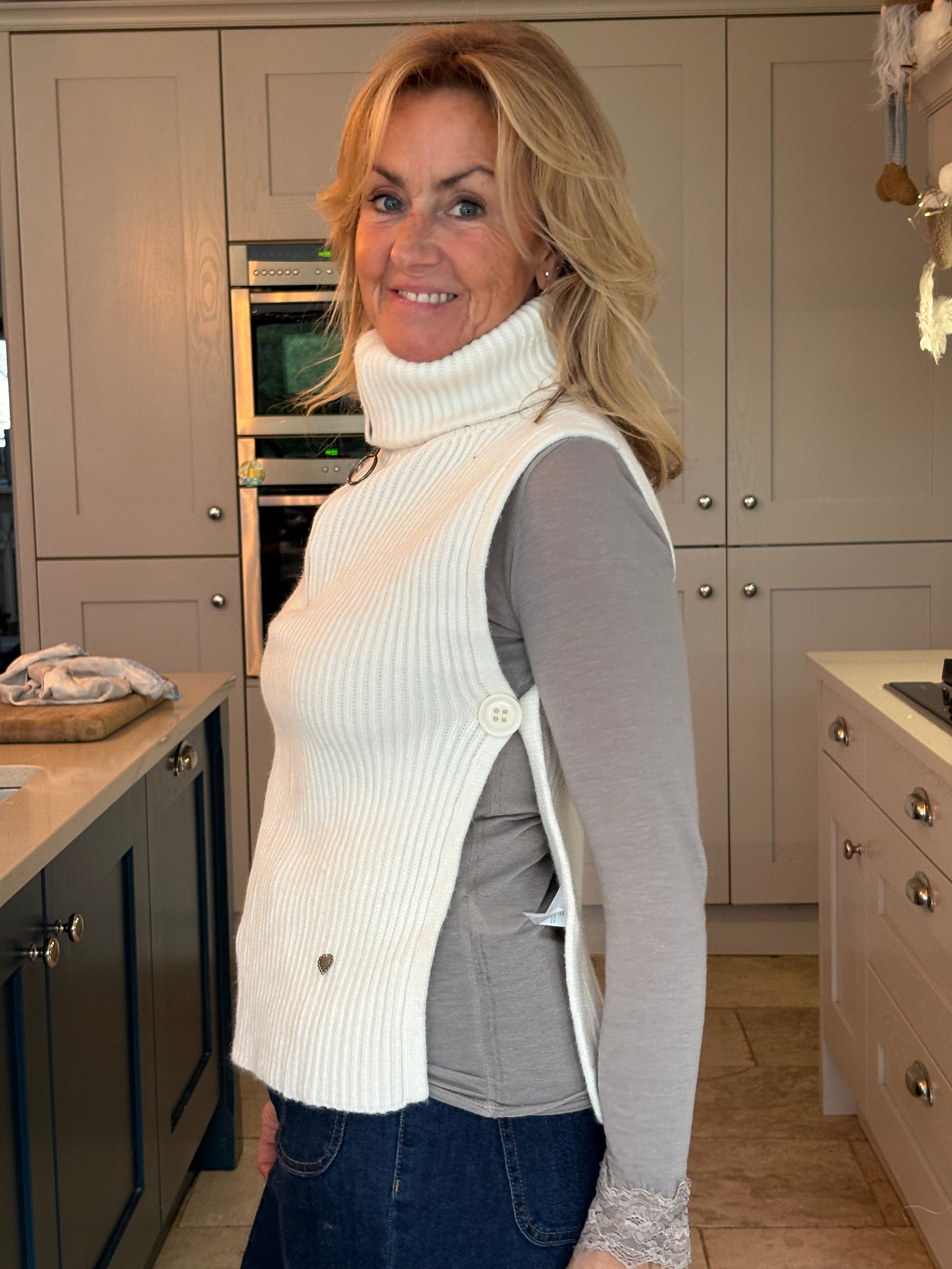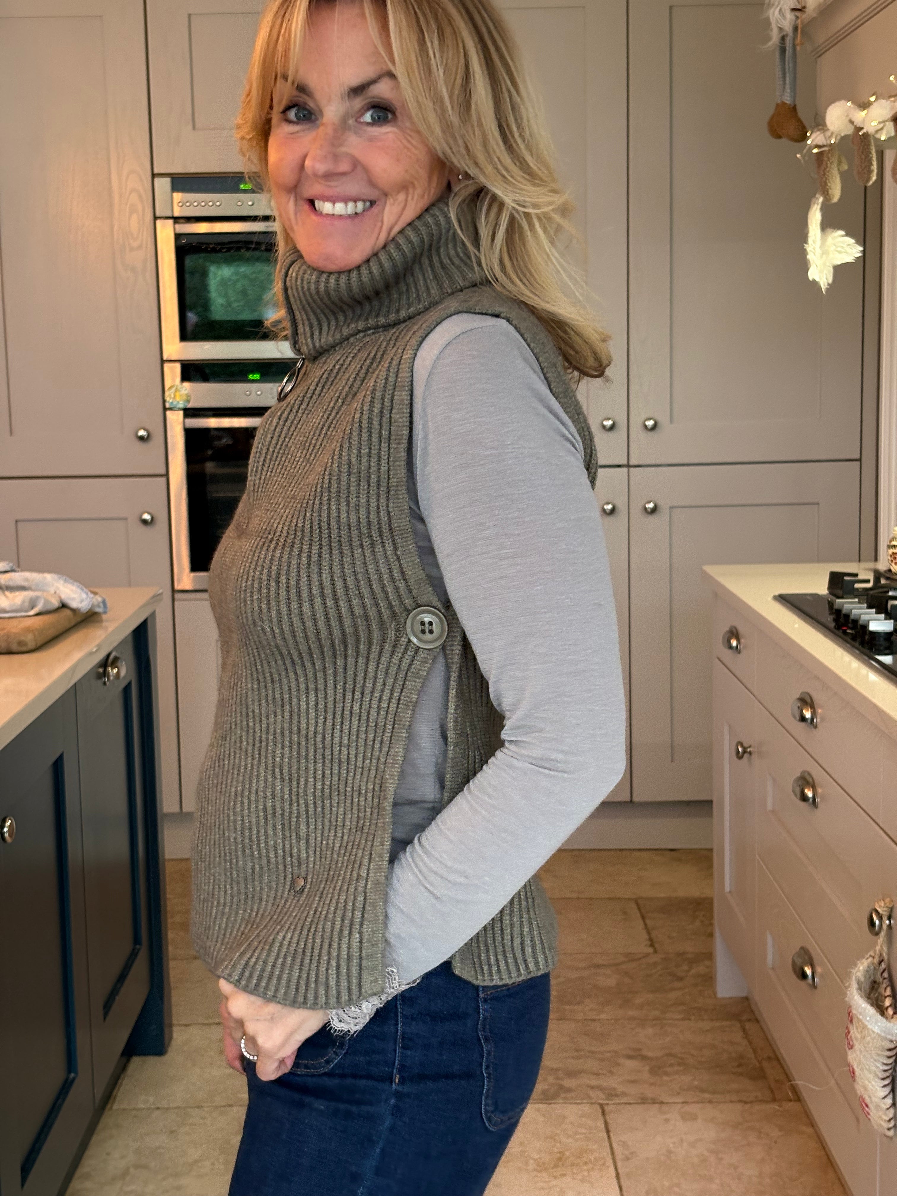 A fabulous ribbed tank top with open sides and a button fastening.  The Eddie falls to just below the waist and has a high ribbed neck with a quarter zip, making it easy to wear open like a collar or as a polo neck.  This is an excellent piece for layering under a coat or jacket when you want to keep your neck and front warm but don't need the bulk of a jumper.  In Khaki and Cream colours.  The Eddie is a one size piece made from viscose, polyester and nylon, giving it a good stretch and softness.