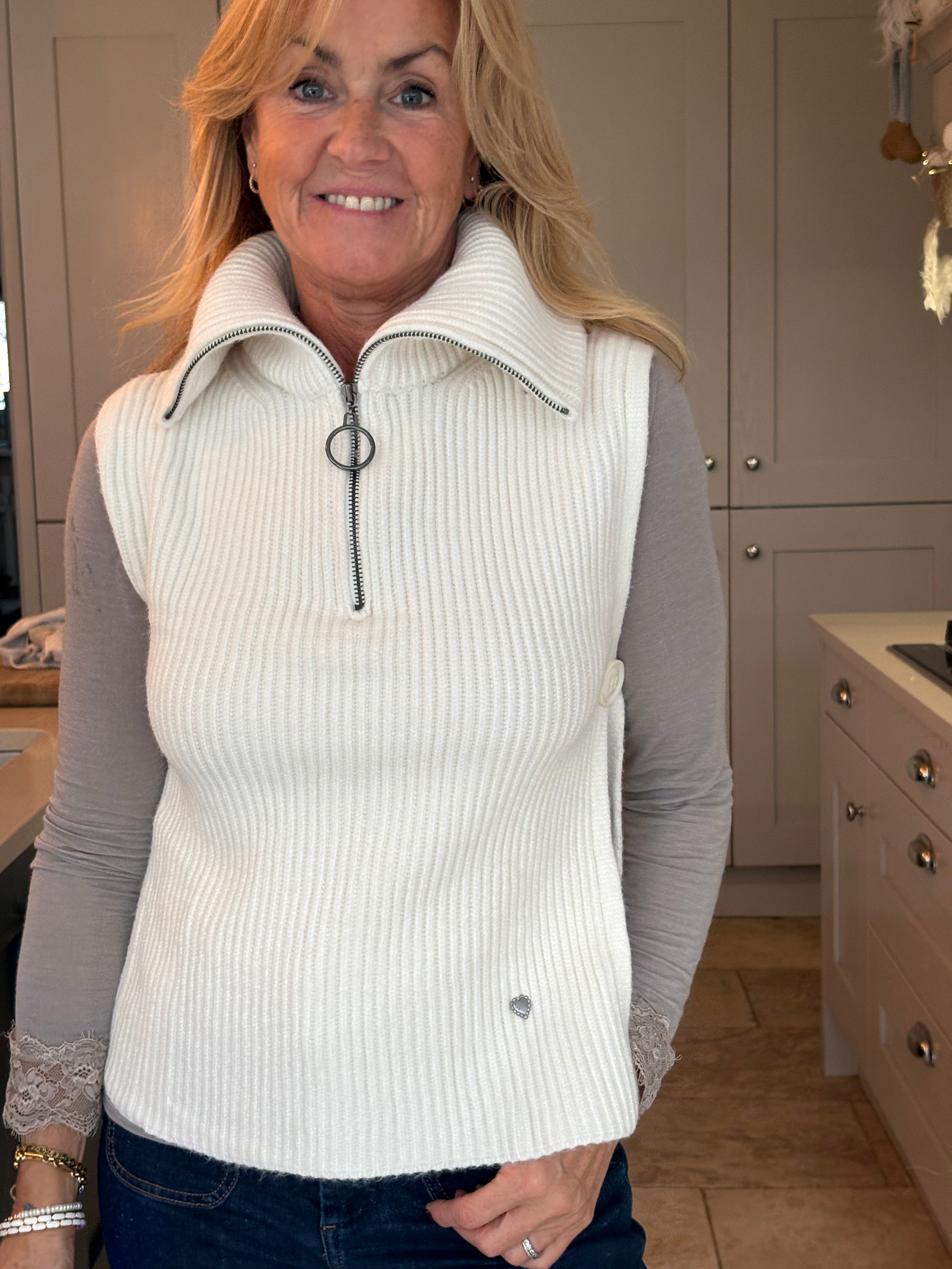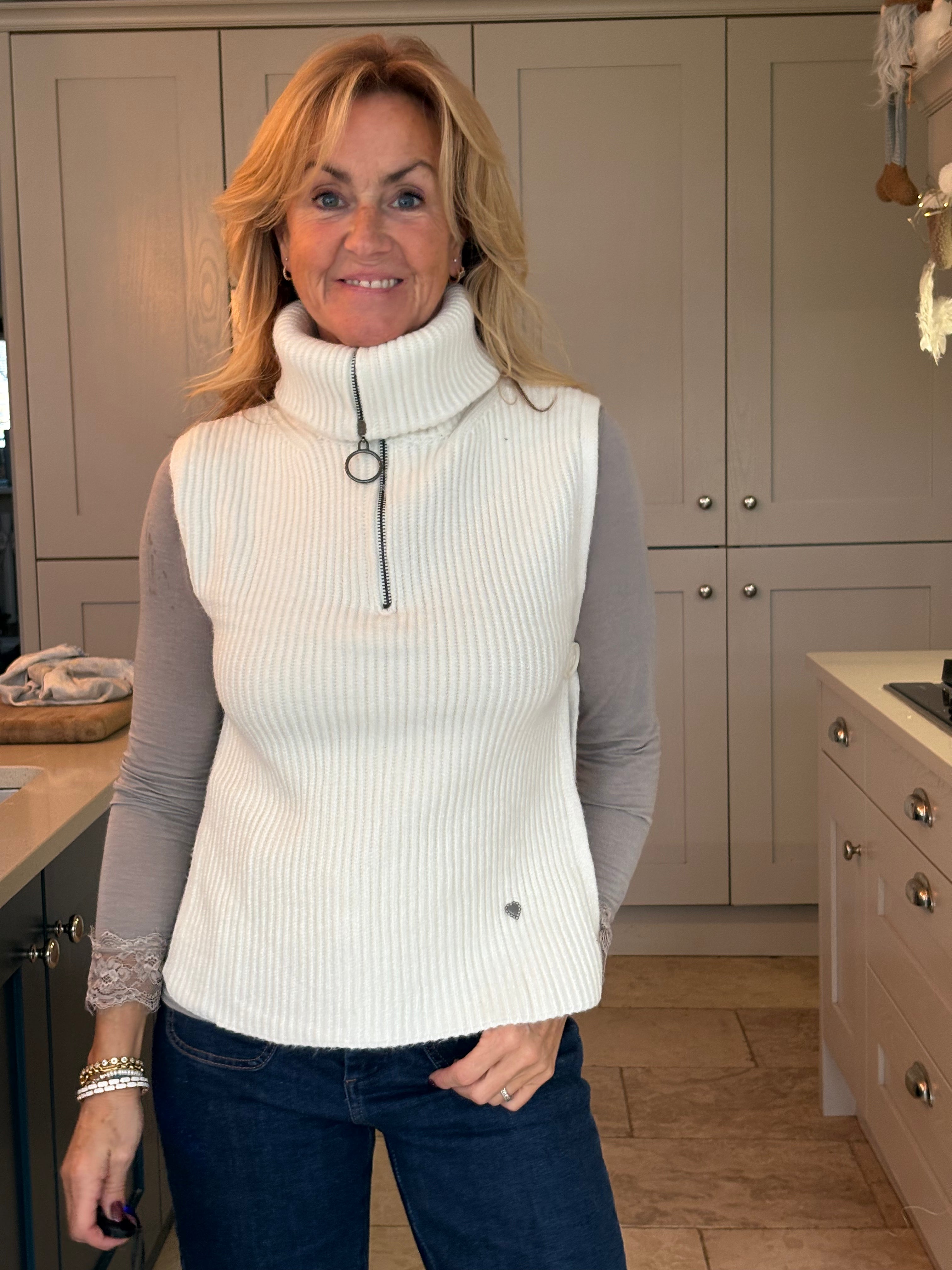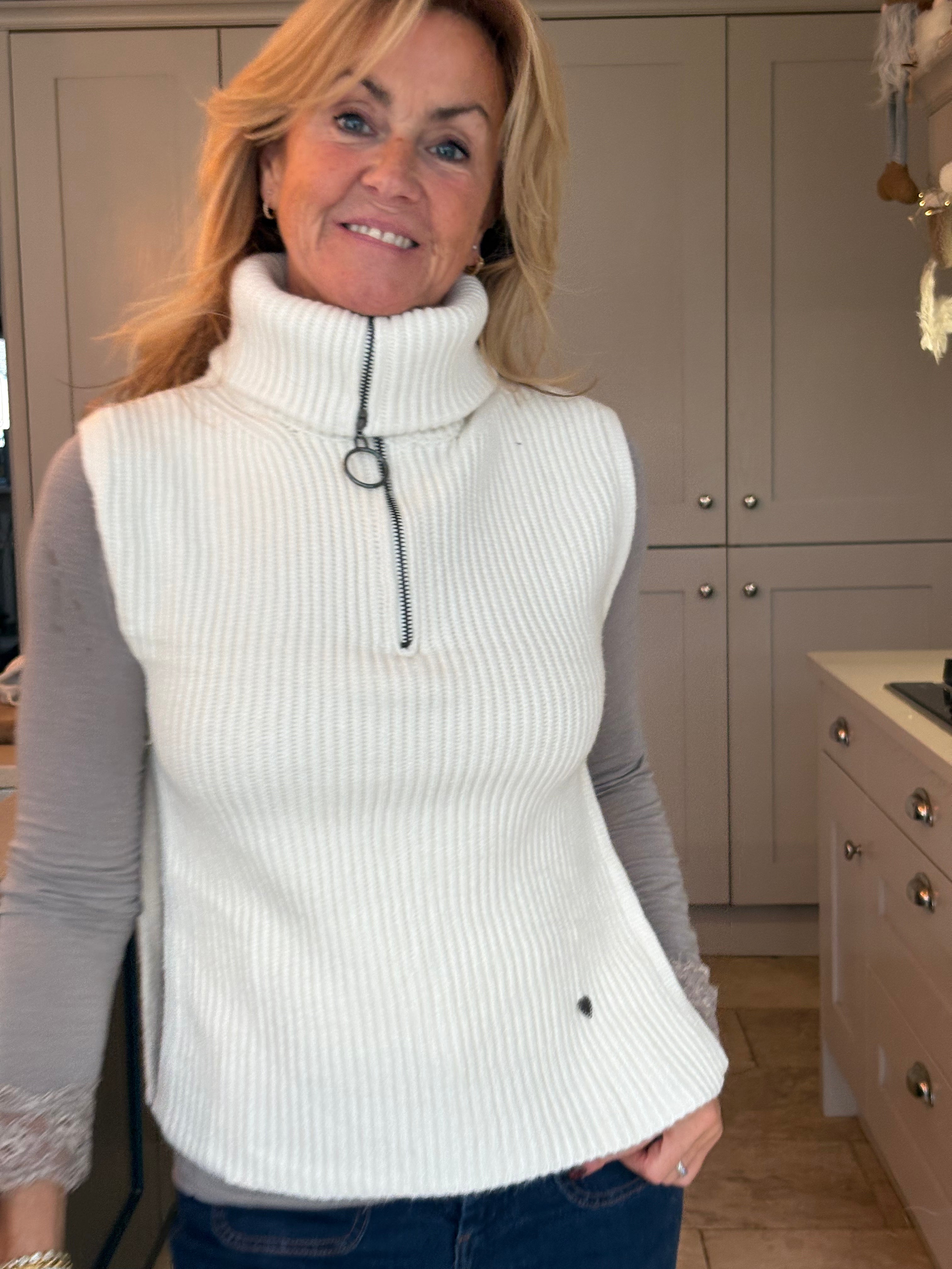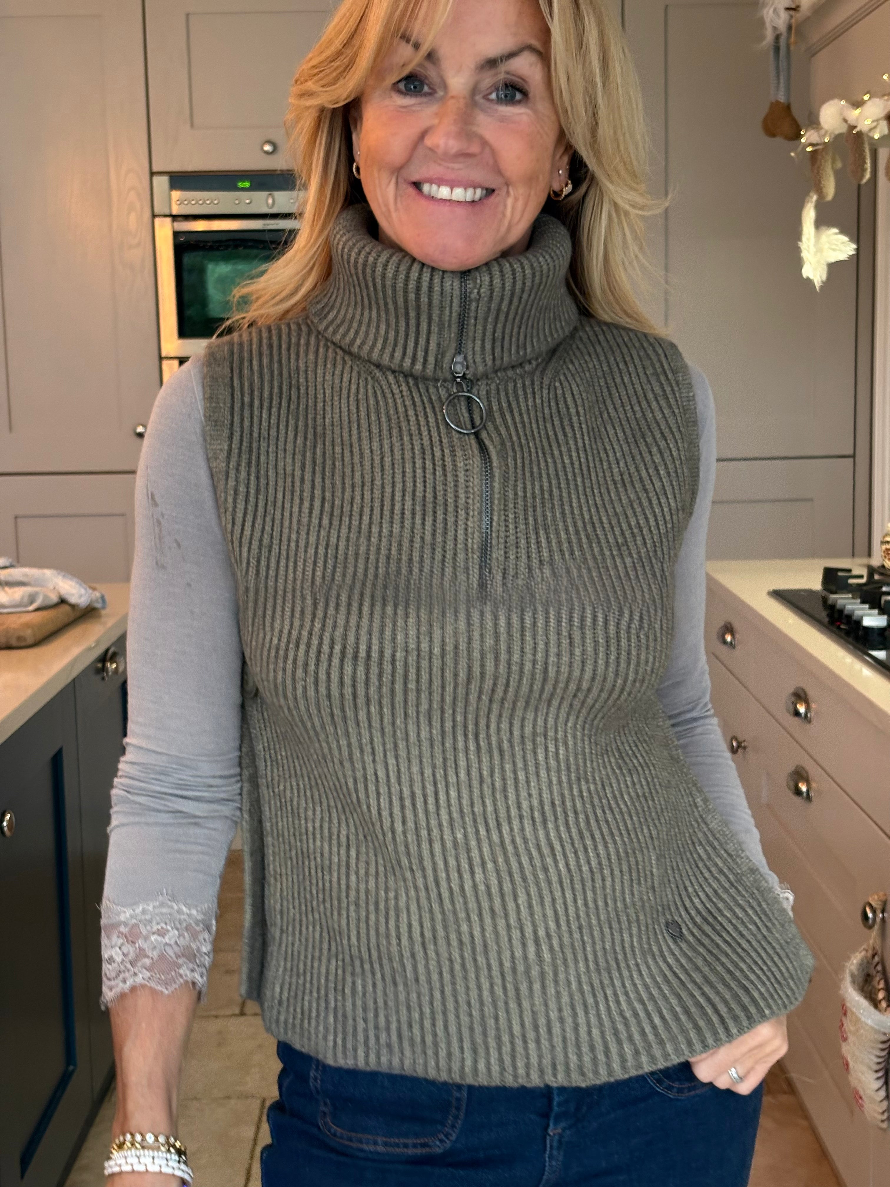 A fabulous ribbed tank top with open sides and a button fastening.  The Eddie falls to just below the waist and has a high ribbed neck with a quarter zip, making it easy to wear open like a collar or as a polo neck.  This is an excellent piece for layering under a coat or jacket when you want to keep your neck and front warm but don't need the bulk of a jumper.  In Khaki and Cream colours.  The Eddie is a one size piece made from viscose, polyester and nylon, giving it a good stretch and softness.
